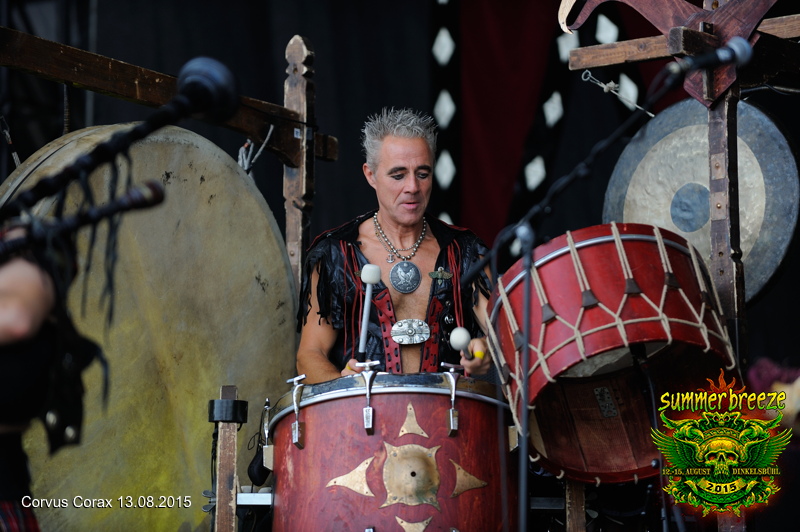 Mit den selbsternannten Königen der Spielleute CORVUS CORAX hielt dann echtes Mittelaltermarkt-Feeling auf dem Gelände Einzug. Auch ohne elektrische Verzerrung sorgte die Percussion-lastige Show für ausgelassene Stimmung unter den zahlreichen Fans anachronistischer Instrumentarien und sorgte für ein munteres Gymnastikprogramm bestehend aus rhythmischem Klatschen – pardon: Handgeklapper, Hüpfen und La-Ola-Wellen. Einige Todesmutige eröffneten in der prallen Mittagshitze sogar einen amtlichen Moshpit. Das passte gut zum martialischen Auftreten der Spielleute, das im Zusammenspiel mit den Kostümen, die aus historischen und historisierenden Kompositionen bestehende Show, um eine eindrucksvolle visuelle Komponente ergänzte. Mit „Twilight Of The Thunder God“ wagten sich CORVUS CORAX sogar an eine zeitgenössische Komposition der „kleinen schwedischen Band“ AMON AMARTH, die dem Vernehmen nach sehr angetan von der akustischen Neuinterpretation gewesen sein soll. An die Stimmgewalt eines Johan Hegg reichte Frontmann Castus mit seinem dumpfen Gebell zwar nicht ganz heran, darüber sahen die Fans jedoch gerne hinweg und feierten diesen Höhepunkt einer rundum gelungenen Mittelalter-Show mit besonders frenetischem Jubel.