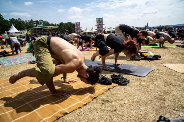 Und es geht auf direktem Wege weiter zum Metal Yoga. Ich muss euch was gestehen: Die ersten zwei Tage haben mit Sonne, Headbangen und vielleicht dem einen oder anderen Bierchen bei mir schon ihren Tribut gezollt. Latentes Unwohlsein macht sich ebenso bemerkbar wie eine kräftige Verspannung im Nackenbereich. Das muss dieses Alter sein, vor dem immer gewarnt wird. „Geh doch zum Yoga“, ist ein gutgemeinter Ratschlag aus meiner Zeltgruppe. Als ich gerade abwinken will wegen der säuseligen Musik, spüre ich ein fieses Ziehen am Rücken. Also gut, dann gehe ich halt zum Yoga. Um genauer zu sein: Zum „Metal-Yoga“ vor der Ficken Party Stage. Kaum dort angekommen, bin ich erst einmal überrascht wegen der Musik (SLAYER mit „South Of Heaven“) und darüber, wie voll es ist. Eigentlich findet sich kaum ein freier Platz mehr: Das müssen mehrere Hundert Metalheads sein, die dort ein Handtuch vor sich ausgebreitet haben, ihre Yogamatte oder direkt eine faltbare Sonnenliege. Also schleiche ich mich nach hinten und schaue erst einmal verschämt dem Treiben zu. Der Sonnengruß. Das sieht kompliziert aus. „Kannst du nicht mehr?“, raunt mich der Metaller an, der neben mir steht. „Wieso, du machst doch auch nicht mit“, gebe ich zurück. „Na ja, ich bin nicht so sportlich“, sagt er kleinlaut. Sportlich, so so. Mittlerweile ist die Musik zu DIMMU BORGIR gewechselt, und Yoganette gibt über das Mikrofon weitere Anweisungen. Etwas herrisch vielleicht, aber immerhin ist das auch eine Metal-Veranstaltung. Da braucht es schon mal klare Ansagen. „Jetzt den rechten Fuß anheben!“ Ich ertappe mich, wie ich selbst mitmache. Dabei sehen meine Bewegungen sicherlich nicht graziler aus wie bei dem Typen im Dinosaurier-Kostüm vor mir. Aber ich bin ja schließlich hier, damit ich hinterher wieder entspannter durch das Festival komme – egal, wie es aussieht. Trotzdem lasse ich den Blick kurz über das Infield schweifen. Ein Fan hat einen riesigen Teddybären auf seinen Schultern sitzen. Weitermachen. Der „Hund“. Ich erinnere mich noch daran, wie mir jemand auf den Weg gab, dass der „Kranich“ nichts, aber wirklich nichts mit Yoga zu tun hat. Ich muss grinsen. Inzwischen schallt „Down With The Sickness“ von der Bühne, und aus den Schweißperlen auf meiner Stirn ist ein ganzer Schweißbach geworden. Die Sonne ist wirklich gnadenlos, und es ist anstrengend. Trotzdem: Das hat schon Spaß gemacht, und irgendwie fühlt sich mein vom Festival geschundener Körper auch etwas geschmeidiger an. Dann kann es ja weitergehen. Namaste, liebe Metalheads. (Eckart Maronde)