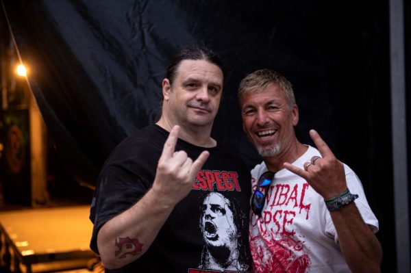 Metal ist Leidenschaft und das drückt sich dann schon auch mal in einer besonderen Beziehung zur jeweiligen Lieblingsband aus. Ihr kennt Eure Lieblingsband schon seit Ewigkeiten, als sie noch keinen Plattenvertrag hatten und in kleinen Clubs ihr Demo vertickt haben? Ihr besucht schon seit Jahren treu ihre Shows? Wie oft habt Ihr Eure Lieblingsband schon live gesehen? Fünf Mal? Über zehn Mal? Über 20 Mal? Der wie ein Honigkuchenpferd strahlende Kerl neben George „Corpsegrinder“ Fisher ist Gerd. Letzte Woche war Gerd auf dem PartySan um CANNIBAL CORPSE zu sehen, ein paar Wochen vorher war Gerd in New York um CANNIBAL CORPSE zu sehen und hier bei uns auf dem SUMMER BREEZE hat er die Band zum sage und schreibe 54. (in Worten: vierundfünfzigsten!) Mal live gesehen. Wir haben ihm also ermöglicht seine Helden vom Bühnenrand aus zu erleben und noch das ein oder andere Erinnerungsfoto zu schießen. Hammer Story, oder?