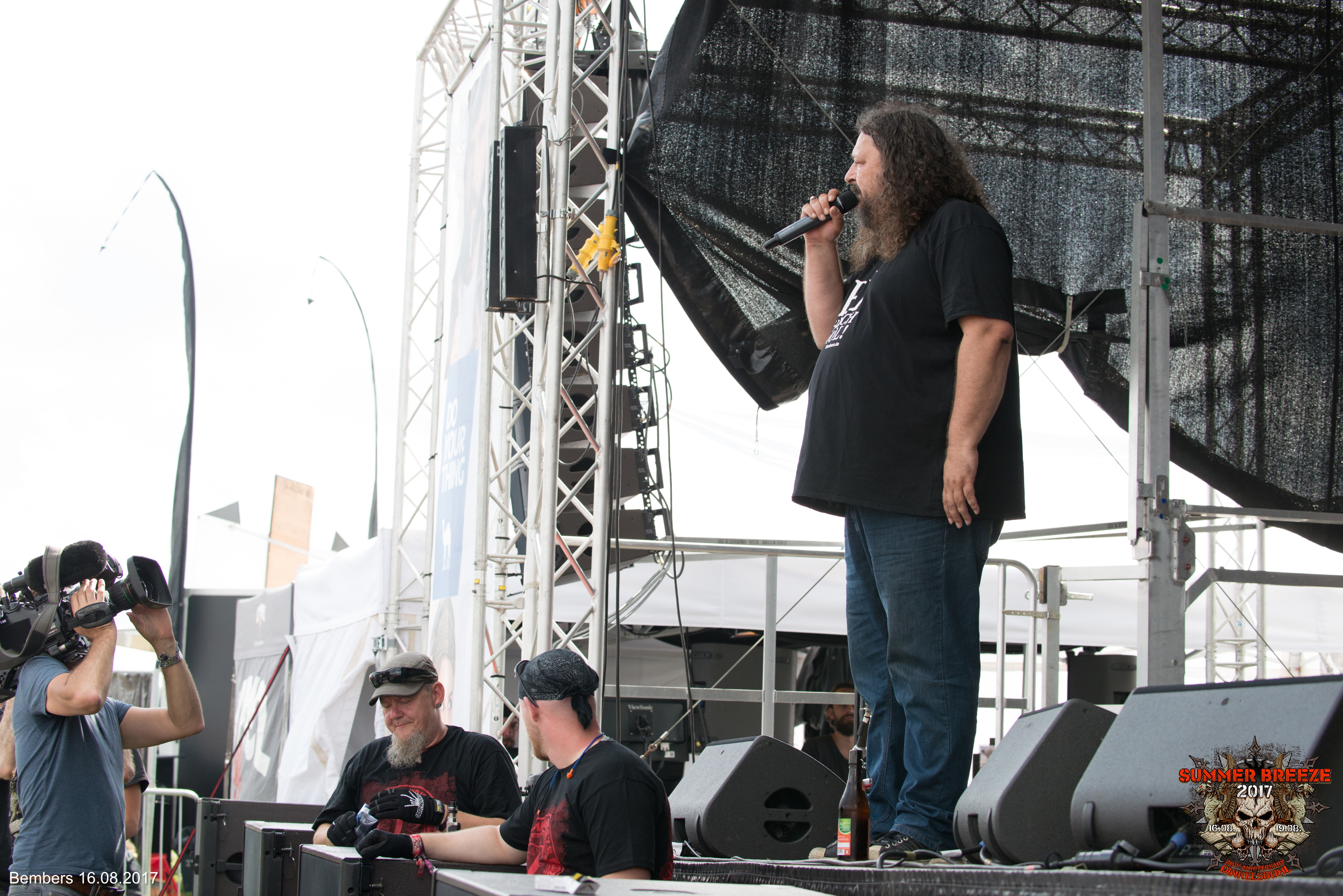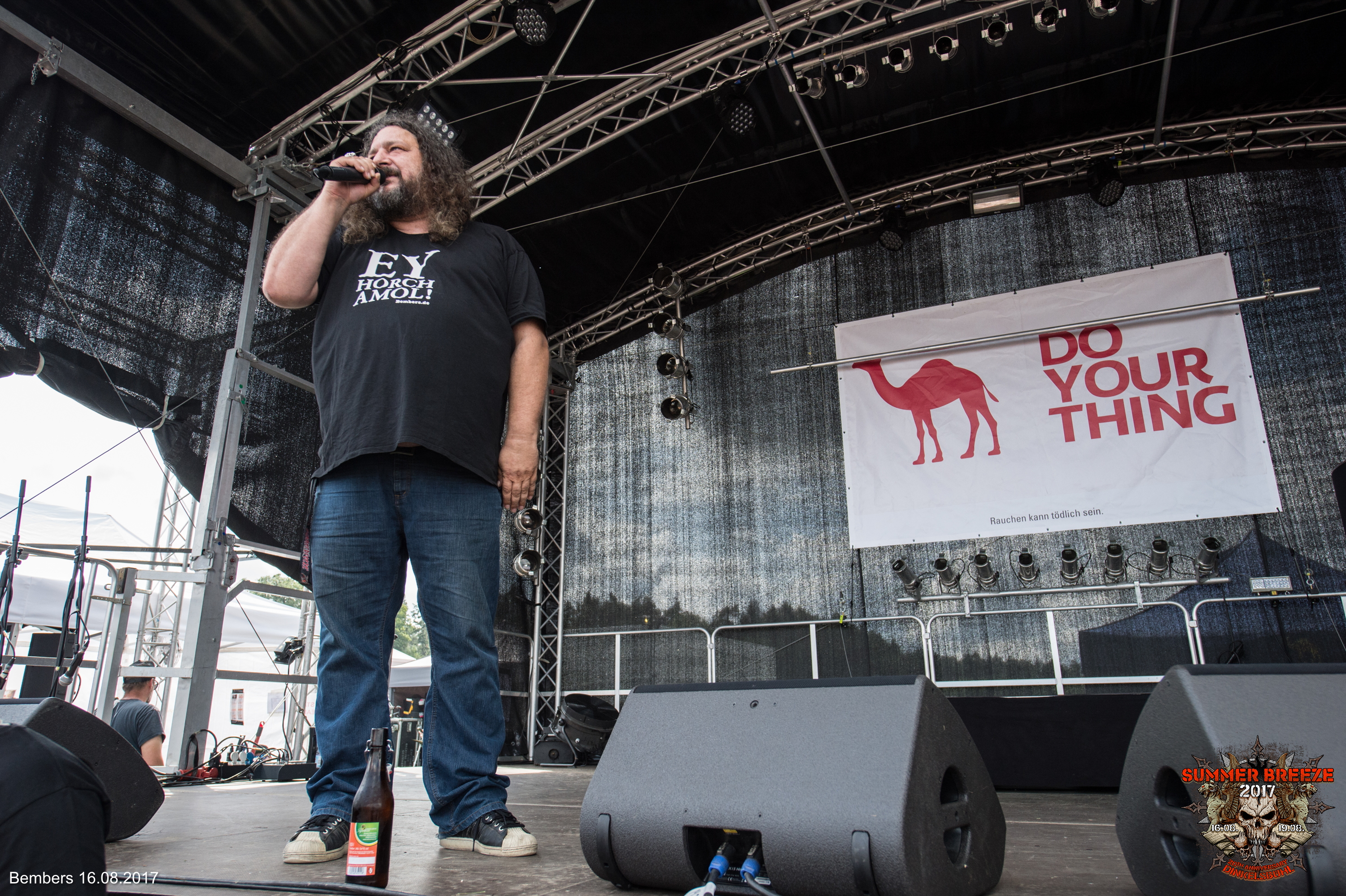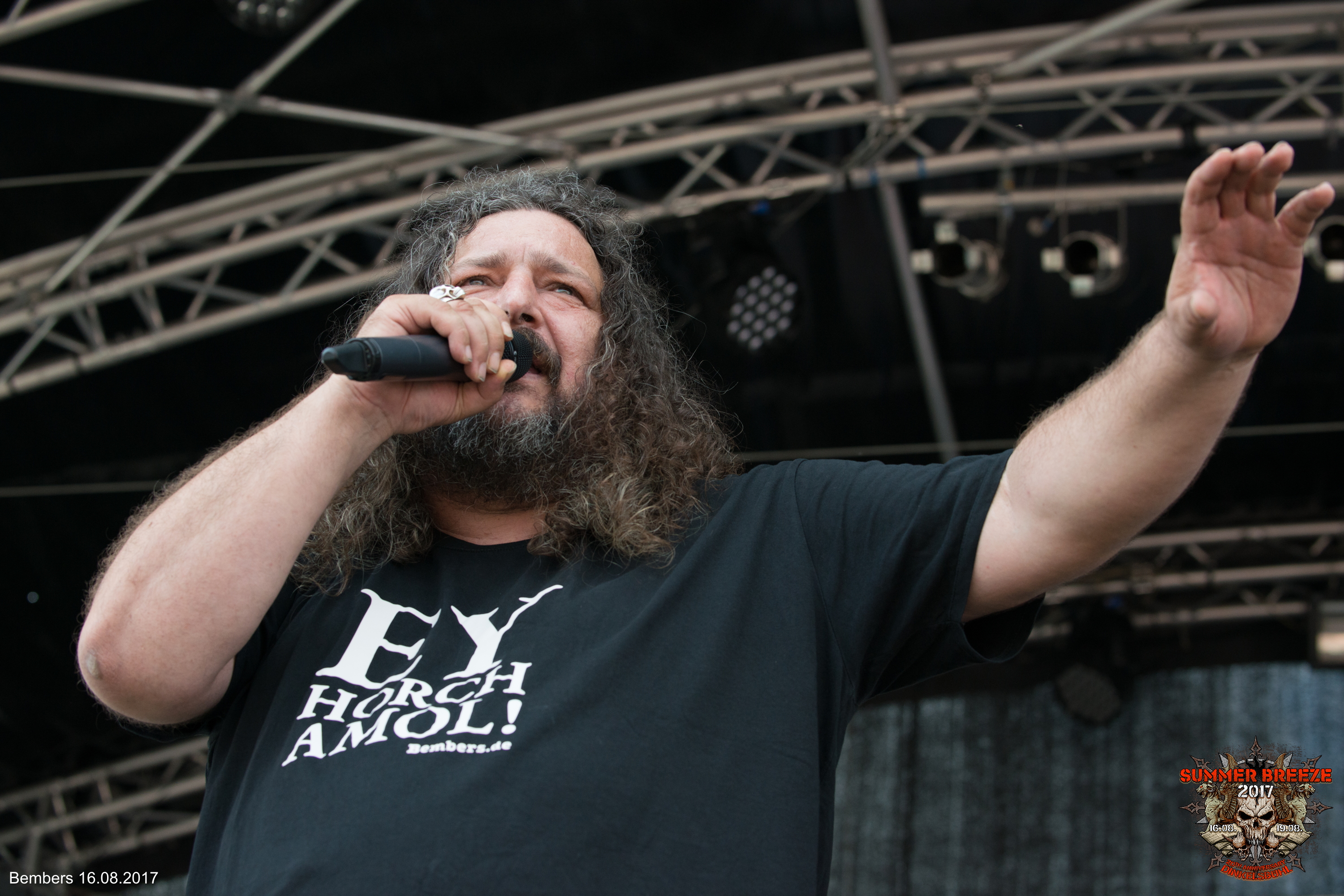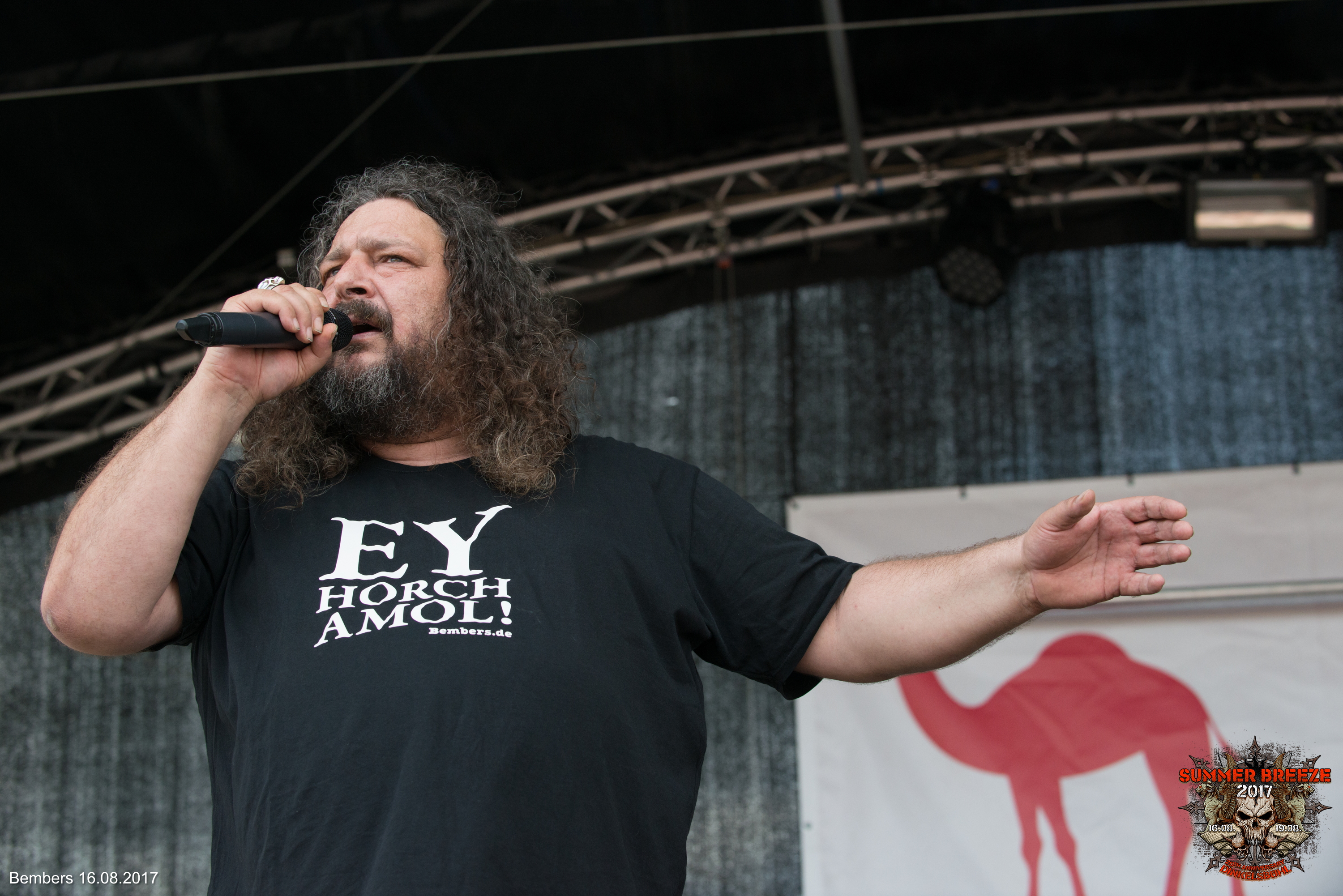 Was BEMBERS und Metal gemeinsam haben, war auf den ersten Blick klar. Der BEMBERS ist ein Freund klarer Worte und redet nicht lange um den heißen Brei. Nachdem der fränkische Comedian mit dem Motto „Ey hoch amol“ sich wegen eines Staus verspätet hatte, stürmte er die Bühne und legte sofort los. Er sprach zuerst die Hitze an, was beim schwitzenden Publikum gut ankam. Was ist überhaupt los in Deutschland und wer bestimmt eigentlich diese „gefühlte“ Temperatur? Das Metal-Publikum freute sich natürlich auch über HipHop-Hetzerei, die BEMBERS selbstverständlich auf Lager hatte. Witze über zu enge Caps und wild fuchtelnde Typen in Baggy Pants kamen natürlich gut an und BEMBERS erntete dafür angemessenen Applaus. Bei all dem Quatsch merkte der genaue Zuhörer aber auch schnell, dass BEMBERS zwar in erster Linie an guter Laune interessiert ist, aber ganz sicher auch Wert auf eine gewisse Botschaft legt. Deshalb fasste er auch passend zusammen: „Der BEMBERS kauft nur bei Deutschen, auch wenn sie schwarz sind“. Allerdings ließ sich der BEMBERS, wie er sich selbst traditionell immer wieder nannte, auch nicht ins Handwerk pfuschen. Rufe wie „Scheiß Weiber“ wurden gerne unterstützt, Zwischenrufe allerdings mit „Halt mal die Fresse da unten“ kommentiert. Das Publikum fand beides gut. Die Zeit drängte, weshalb BEMBERS seinen Klassiker darüber, als er „die Flachwichser in die Schranken wies“ etwas kürzen musste. Zum Lob gab es aber als Abpfiff ein Feuerwerk bei Tageslicht. Ein Feuerwerk, das eigentlich nichts mit BEMBERS zu tun hatte, seinen Auftritt aber geschmackvoll abrundete.