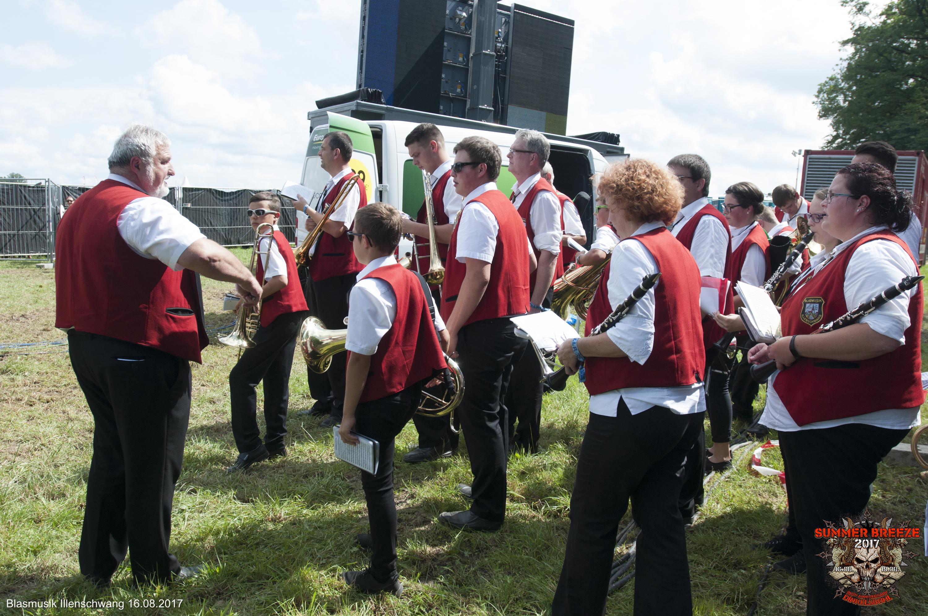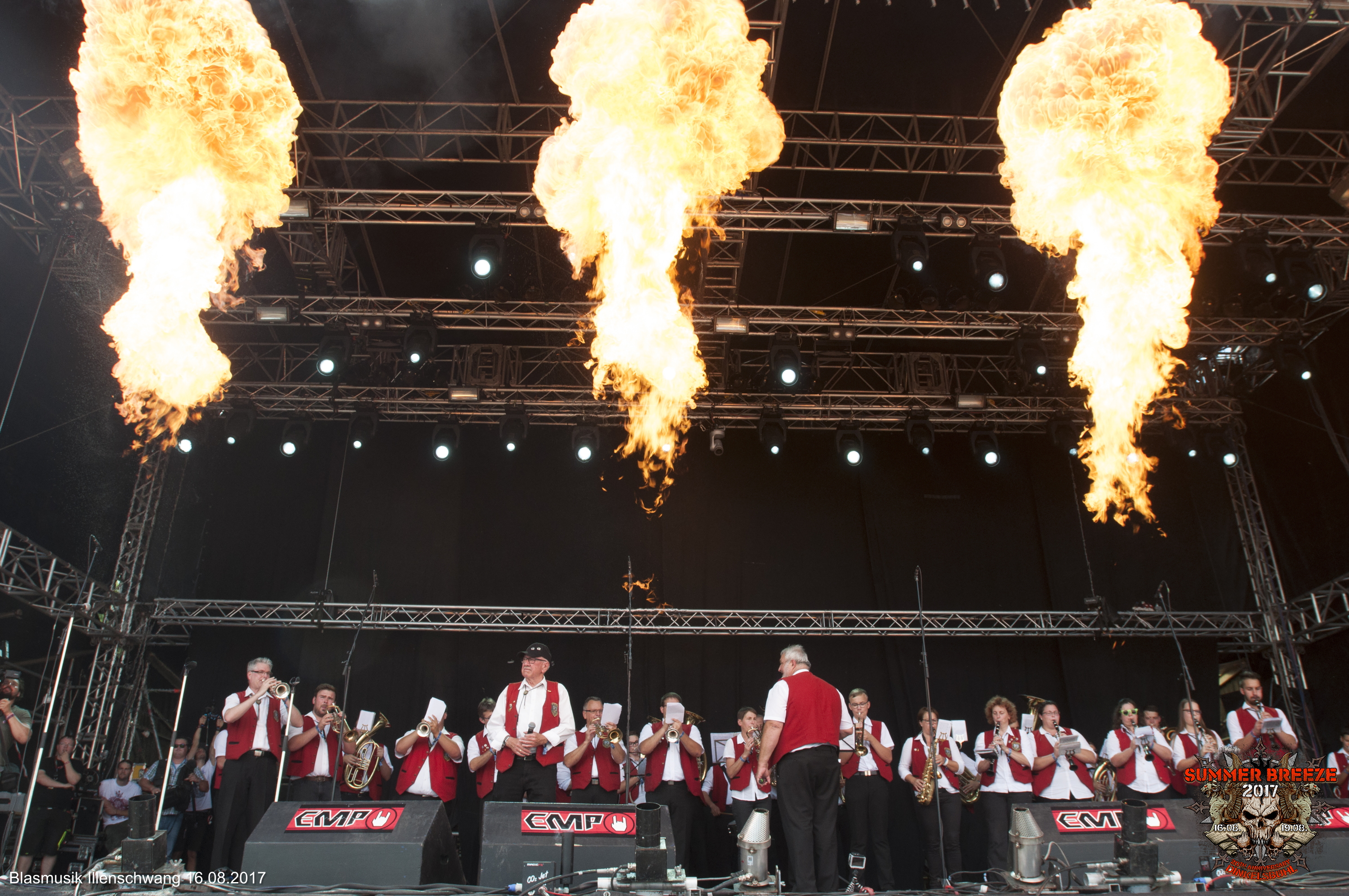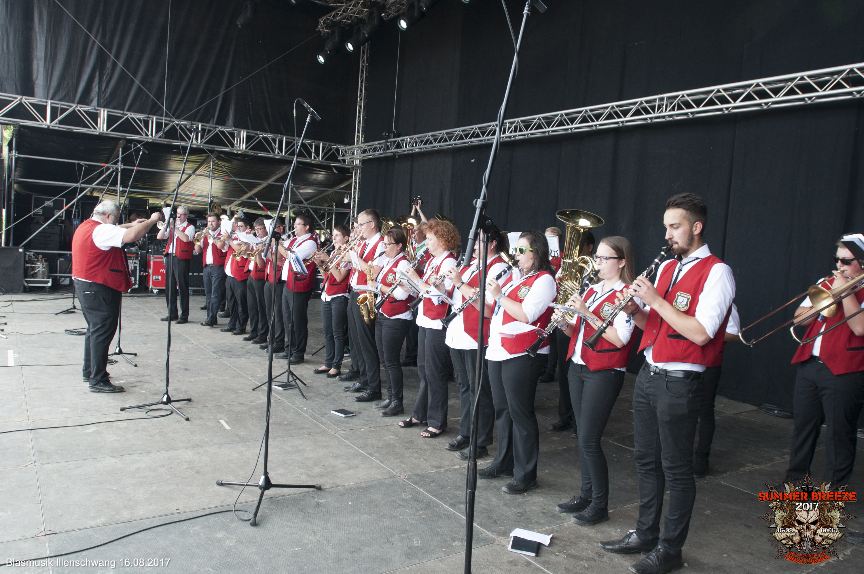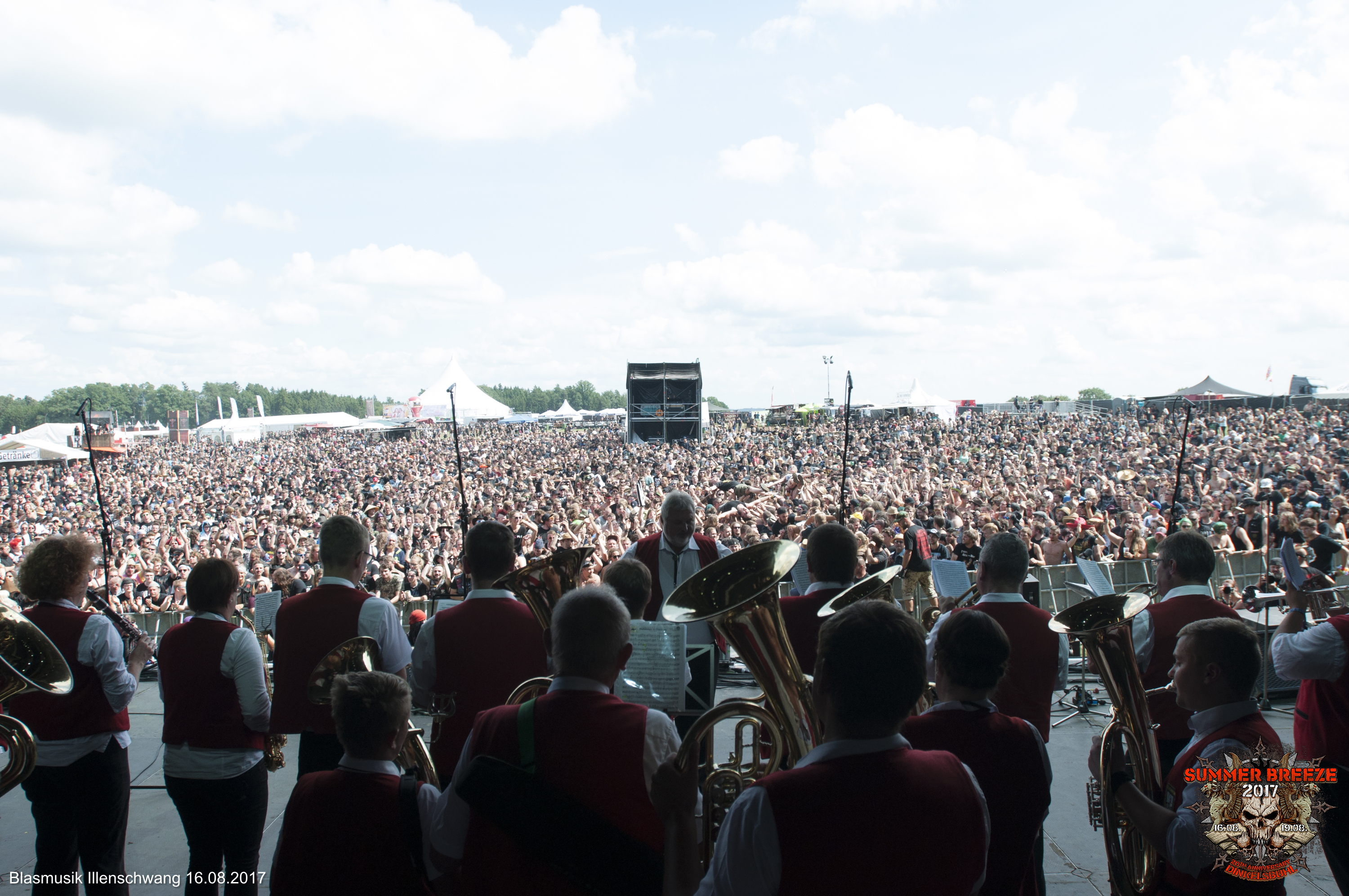 Mit leichter Verspätung marschierte der heimliche Tagesheadliner zur Eröffnung des 20. SUMMER BREEZE aus dem Backstage-Bereich den Rufen des Publikums entgegen: Die BLASMUSIK ILLENSCHWANG wurde für 2017 von der Camel Stage auf die T-Stage befördert und gäbe es noch das Zelt, wäre es gut gefüllt gewesen.