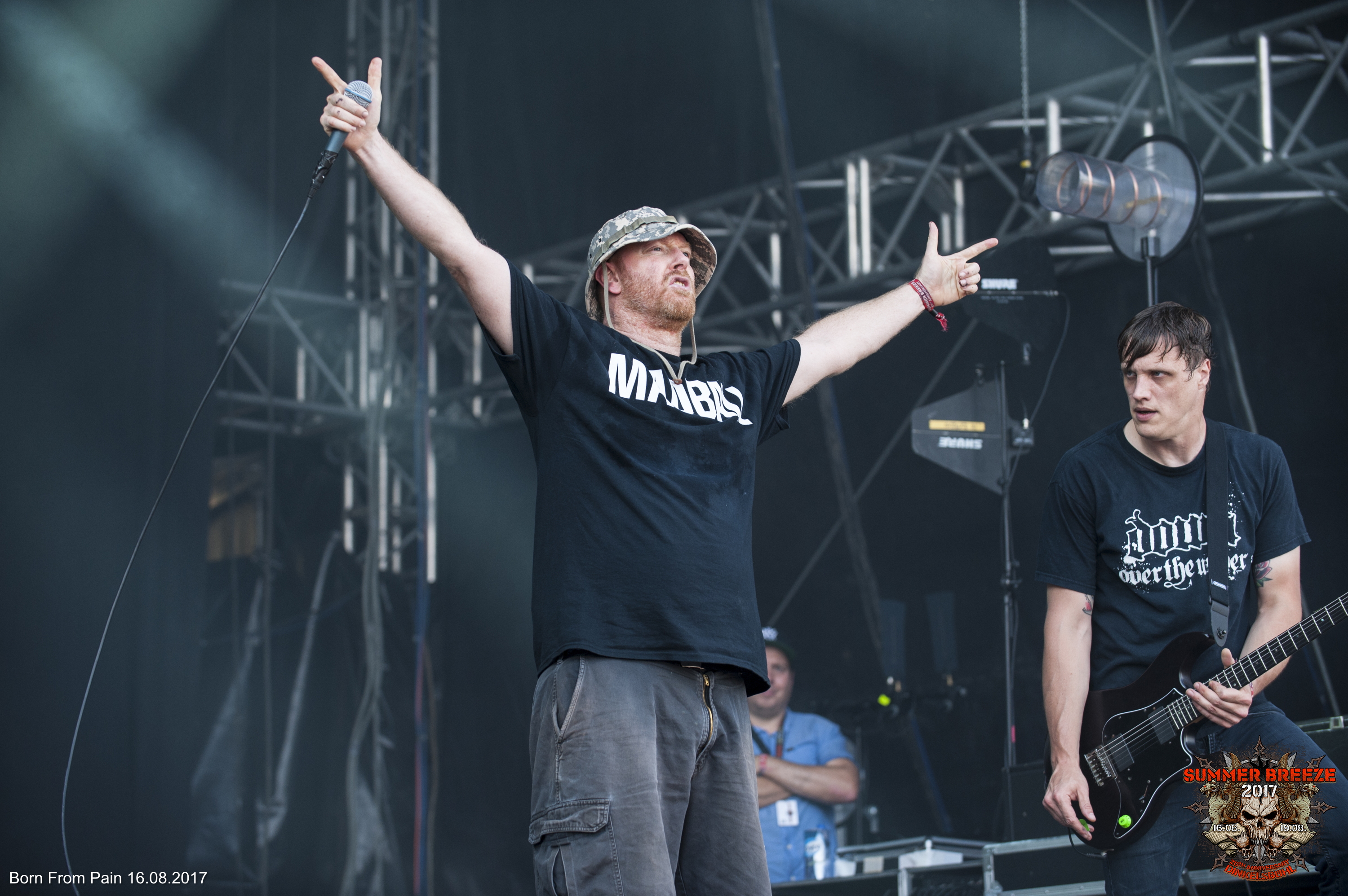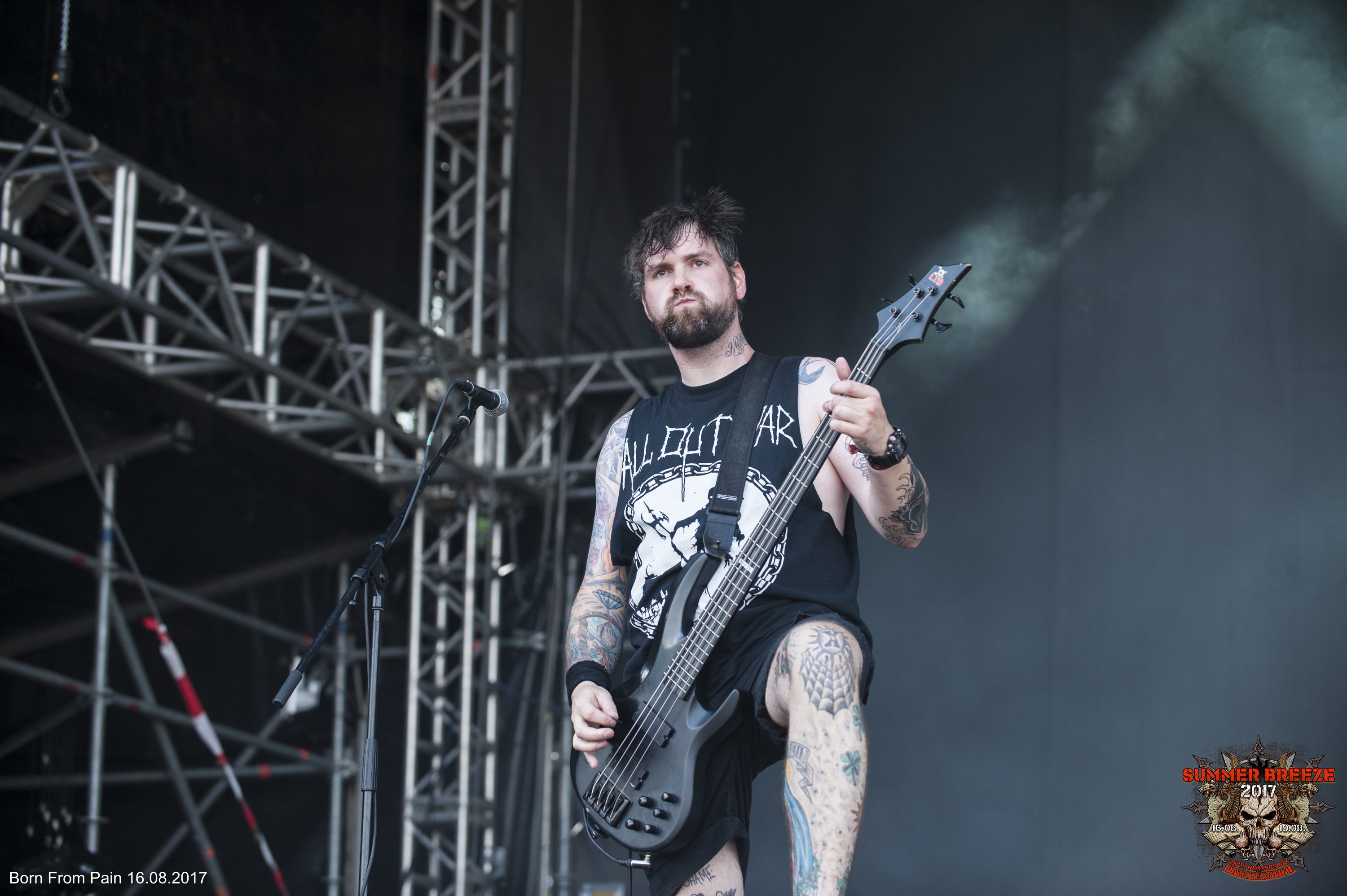 Der erste Surprise Act und damit gleichzeitig die erste „reguläre“ Band auf dem Infield, sollte gleich mal ordentlich Dampf machen – mit BORN FROM PAIN war nämlich metallischer Hardcore angesagt. Doch bevor die Holländer die T-Stage enterten, die im Gegensatz zum Vorjahr zu einer Outdoor Bühne umfunktioniert wurde, war es zunächst Zeit für einen emotionalen Start-Schuss. Nach einem rot-weißen Feuerwerk, traten vier Crew-Mitglieder auf die Bühne, entzündeten jeweils ein Bengalo und hielten ein Transparent hoch. Darauf stand in großen Lettern „Michael Trengert unvergessen“. Damit gedachte man dem 2013 verstorbenen SUMMER BREEZE-Mit-Veranstalter Michael Trengert. Sofort im Anschluss stürmten BORN FROM PAIN mit ihrem Intro „As Above, So Below“ die Bühne und gingen direkt in die Vollen. Ebenso wie die Crowd, die richtig Bock auf Bewegung hatte. Denn zu „Cause & Effect“ tobte bereits ein ansehnlicher Pit. Dass gerade BORN FROM PAIN als Opener der T-Stage ran durften, war kein Zufall. Denn Trengert, der auch Gründer des europäischen Ablegers von Metal Blade war, nahm die Holländer 2005 mit ihrem Album „In Love With The End“ auf seinem Label auf und führte sie so an eine größere Hörerschaft heran. Bevor dann mit „Rise Or Die“ der Eröffnungstrack genau dieses Albums angestimmt wurde, nahm sich Sänger Rob Fransen einige Minuten und sprach über die Verbindung der Band zu Trengert. Ein kurzer Moment der Andacht, der dann in den fiesen Moshpart des Tracks überging. „Too Cold“ und „The New Hate“ hielten das Powerlevel im Anschluss hoch und ein Circle Pit jagte den nächsten. Der gewaltig planierende BFP-Klassiker „Final Nail“ und die Midtempo-Walze „Behind Enemy Lines“ brachten den Pit noch mal ordentlich zum Kochen, bevor „Stop At Nothing“ einem schweißtreibenden Set die Krone aufsetzte. Ein enorm starker Auftakt für das Jubiläums-BREEZE.