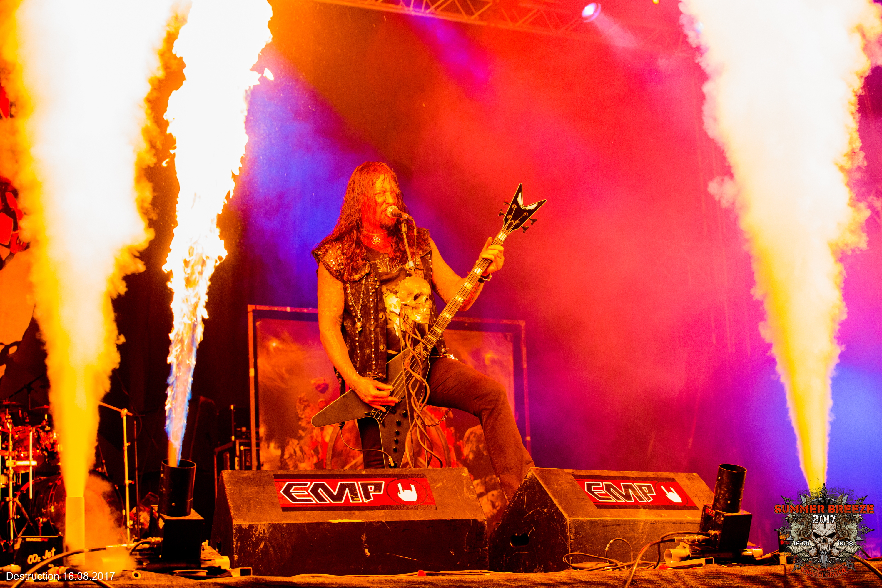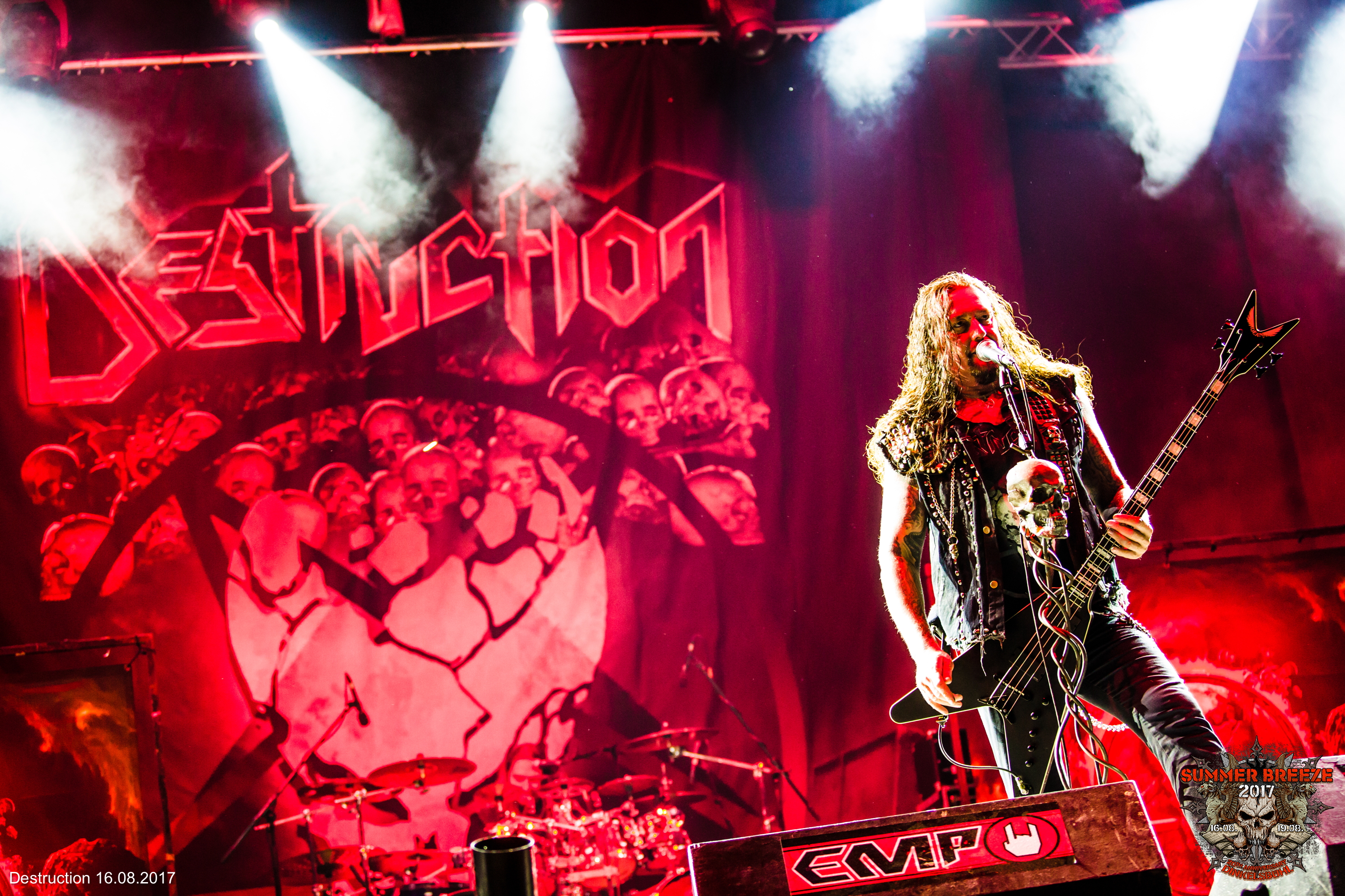 Pech für Schlafmützen: Bettruhe ist definitiv nicht drin, wenn DESTRUCTION antreten. Der gleichen Meinung waren auch die Fans, die sich in großer Zahl um halb ein Uhr – also quasi mitten in der Nacht – vor der T-Stage versammelten. Es brodelte schon ordentlich in den vorderen Reihen, bevor die Band auch nur die Bühne enterte. Nach verheißungsvollem Intro begannen Schmier und Co., die T-Stage gepflegt und nach guter, alter DESTRUCTION-Art auseinander zu nehmen und ihrem Bandnamen so alle Ehre zu machen. Nebelkanonen hüllten die Bühne kräftig ein und lieferten die lichtbrechende Grundlage für ein Effektgewitter, das der Musik mehr als gerecht wurde. Der letzte Surprise Act des Tages lieferte die volle Dröhnung Teutonen-Thrash. Fronter Schmier genoss seinen Auftritt sichtlich und redete munter auf das Publikum ein. So wünschte er sich einen Moshpit zu „Nailed To The Cross“, den ihm das Publikum natürlich nur zu gerne lieferte. Die Nebelkanonen liefen auf Vollast und sorgten dafür, dass der Schlagzeuger bei „Mad Butcher“ streckenweise kaum noch zu sehen war. Die imposanten Feuerfontänen verliehen der Band noch zusätzliche Brachialität, und selbst die leichten technischen Probleme konnten den Siegeszug der Band nicht aufhalten. So viel also zum Thema Bettruhe.