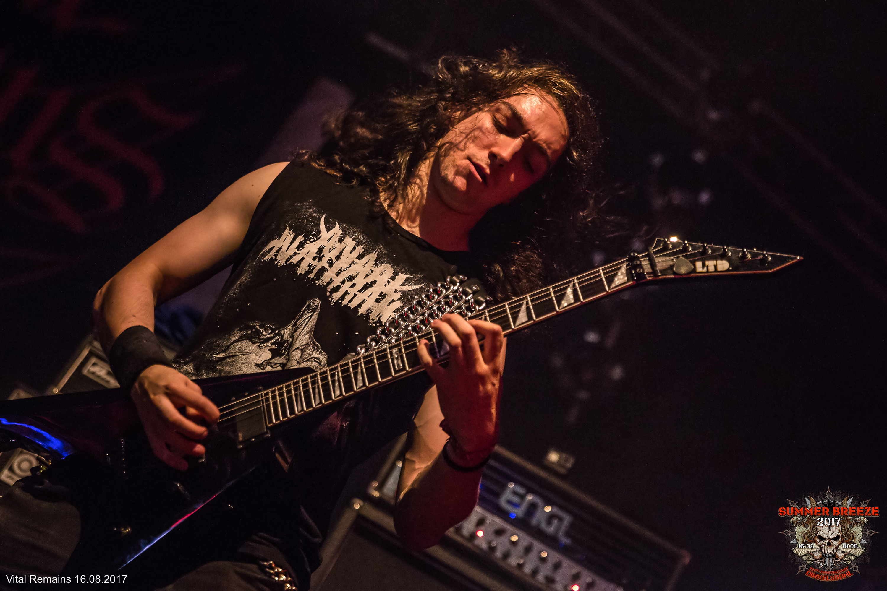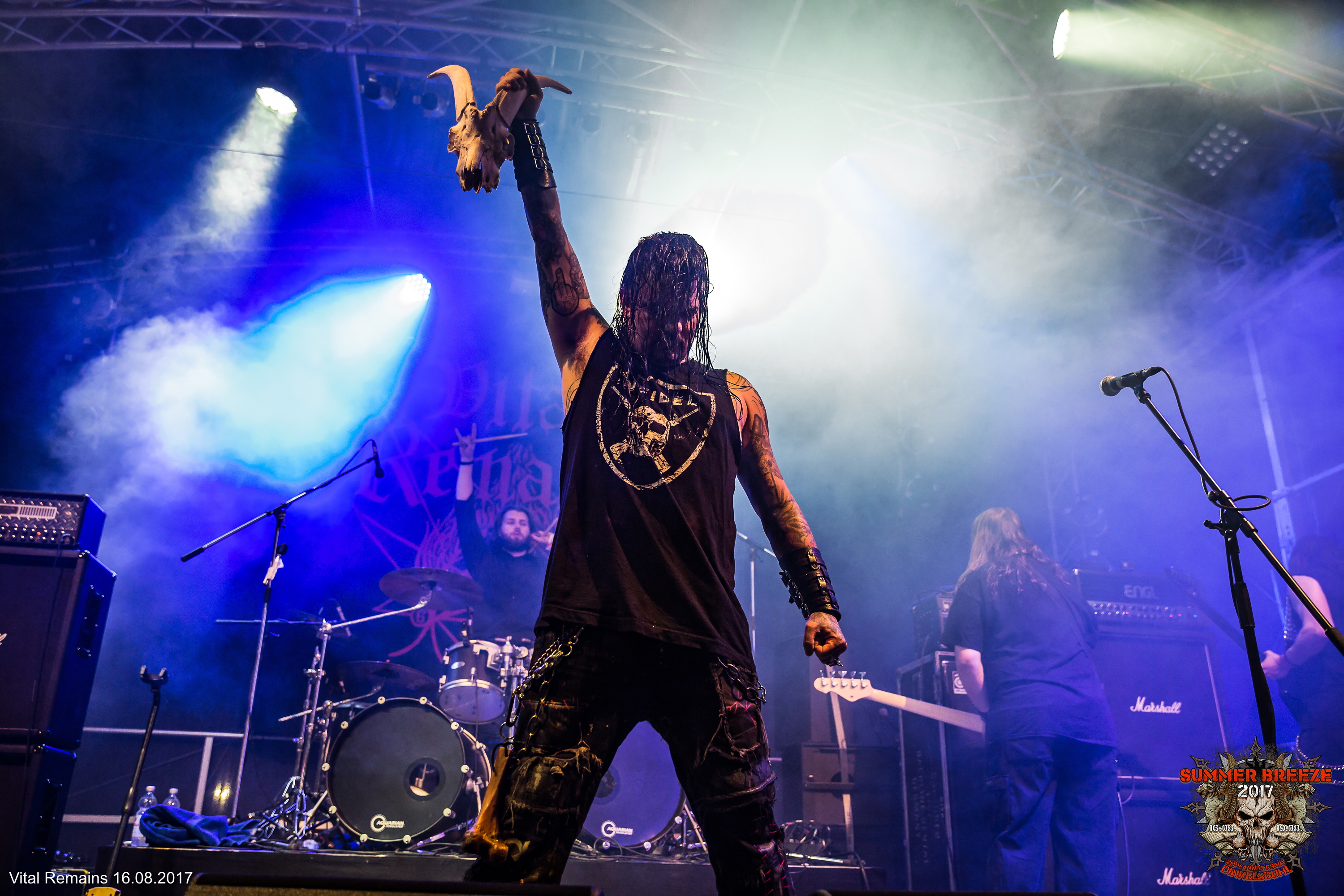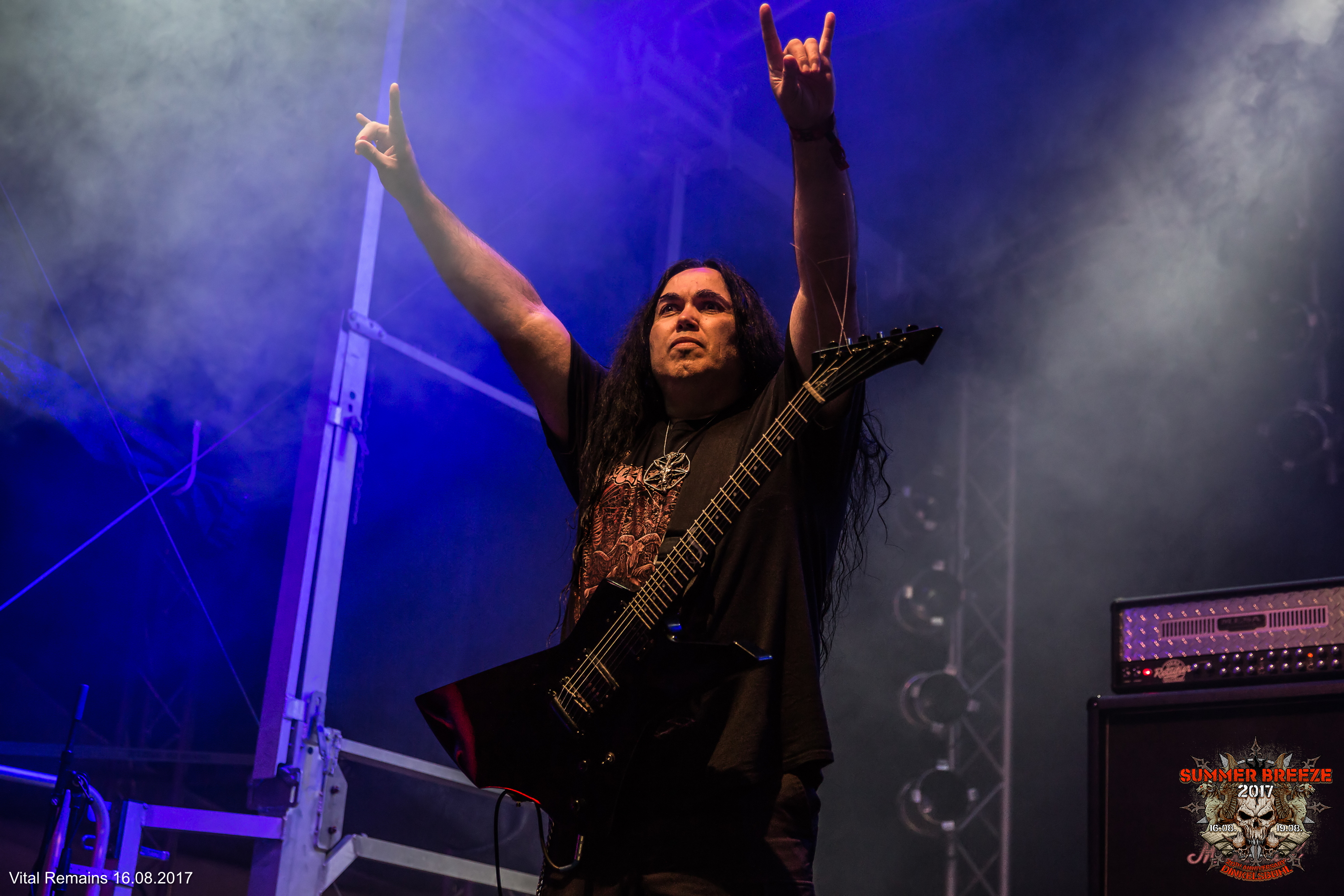 „Are you ready for some old school Death Metal?“ hieß es um halb zehn auf der Camel Stage – denn die amerikanischen Death Metal-Heroen VITAL REMAINS luden zum gepflegten Kopf-Abschrauben. Und das mit Klassikern gespickte Set der US-Amerikaner hatte es in sich. Nach einem stimmungsvollen Intro ging es ohne Umschweife mit „Where Is Your God Now“ wuchtig los. Den rund 1000 Augenpaaren vor der Camel-Stage wurde damit direkt der erste Klassiker präsentiert, gefolgt von „Icons Of Evil“ vom gleichnamigen Album aus dem Jahr 2007. Quittiert wurde dieser brutale Einstieg mit reichlich Pommes-Gabeln und viel Bewegung. Nach diesem starken Auftakt folgten mit „Scorned“ und „Hammer Down The Nails“ zwei weitere Songs des 2007er Albums. Und auch wenn die Band um Sänger Brian Werner auf der Bühne alles gab, und er mit einem Stage-Dive den Kontakt zum Publikum suchte, ließ die anfängliche Euphorie mit der Zeit ein wenig nach. Doch als es hieß „This is a new Song“ und der neue Kracher „A World Without God“ angestimmt wurde, war die Crowd wieder voll da. Das „Finale grande“ bildeten „Let The Killing Begin“ und „Dechristianize“ – den Song vom ikonischen 2003er Album, bei dem einst Glen Benton, Sänger und Bassist von DEICIDE, den Platz am Mikro übernahm. Natürlich mussten solche wegweisenden Songs dementsprechend zelebriert werden. So kam Werner, mit einer durch eine Rauchbombe umrahmten Pentagram-Fahne auf die Bühne und leitete übertrieben theatralisch das Ende des Sets ein – ein ausgiebiges Bad in der Menge inklusive. Nach 45 Minuten auf technisch und energetisch hohem Niveau war der Spuk schließlich vorbei.
