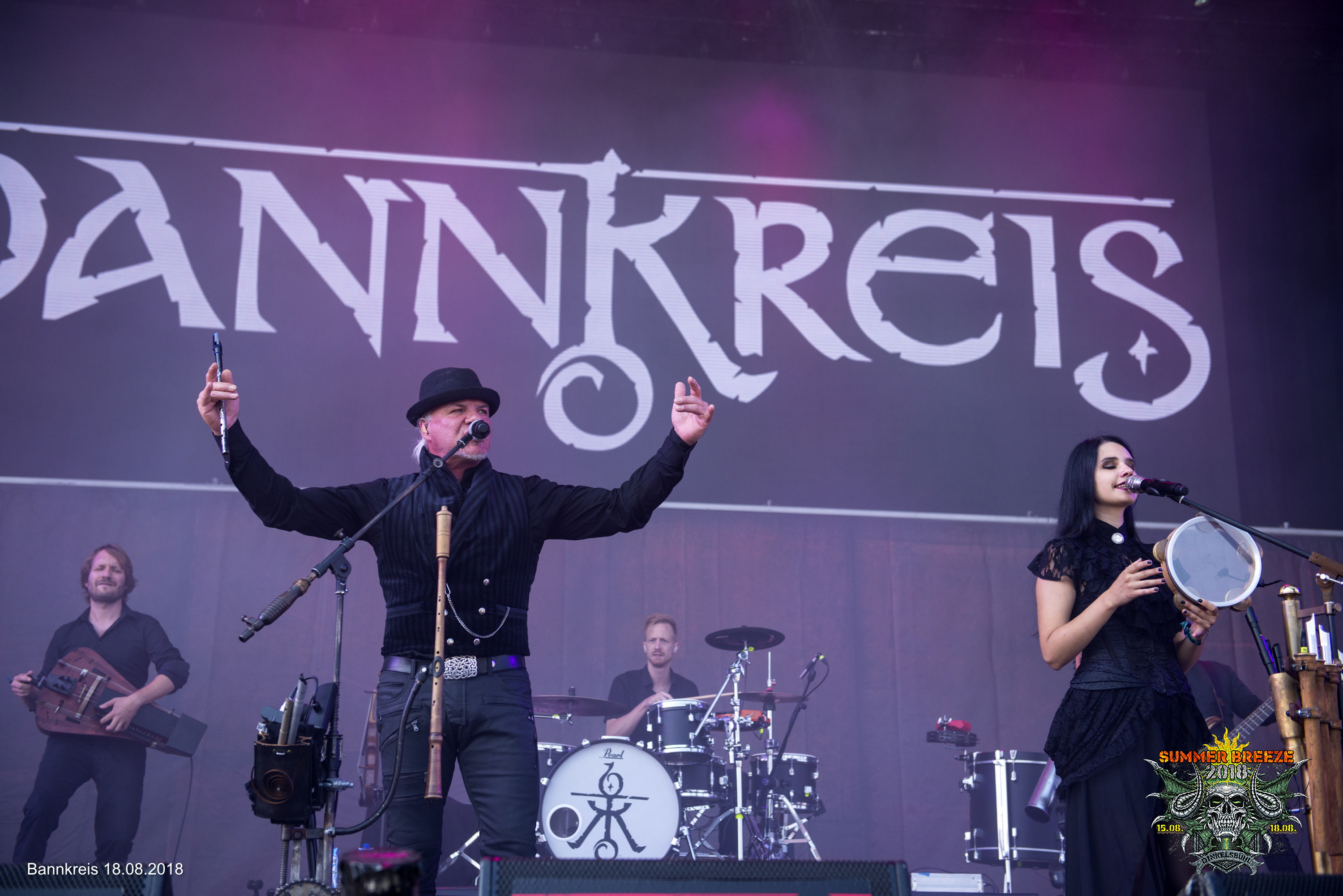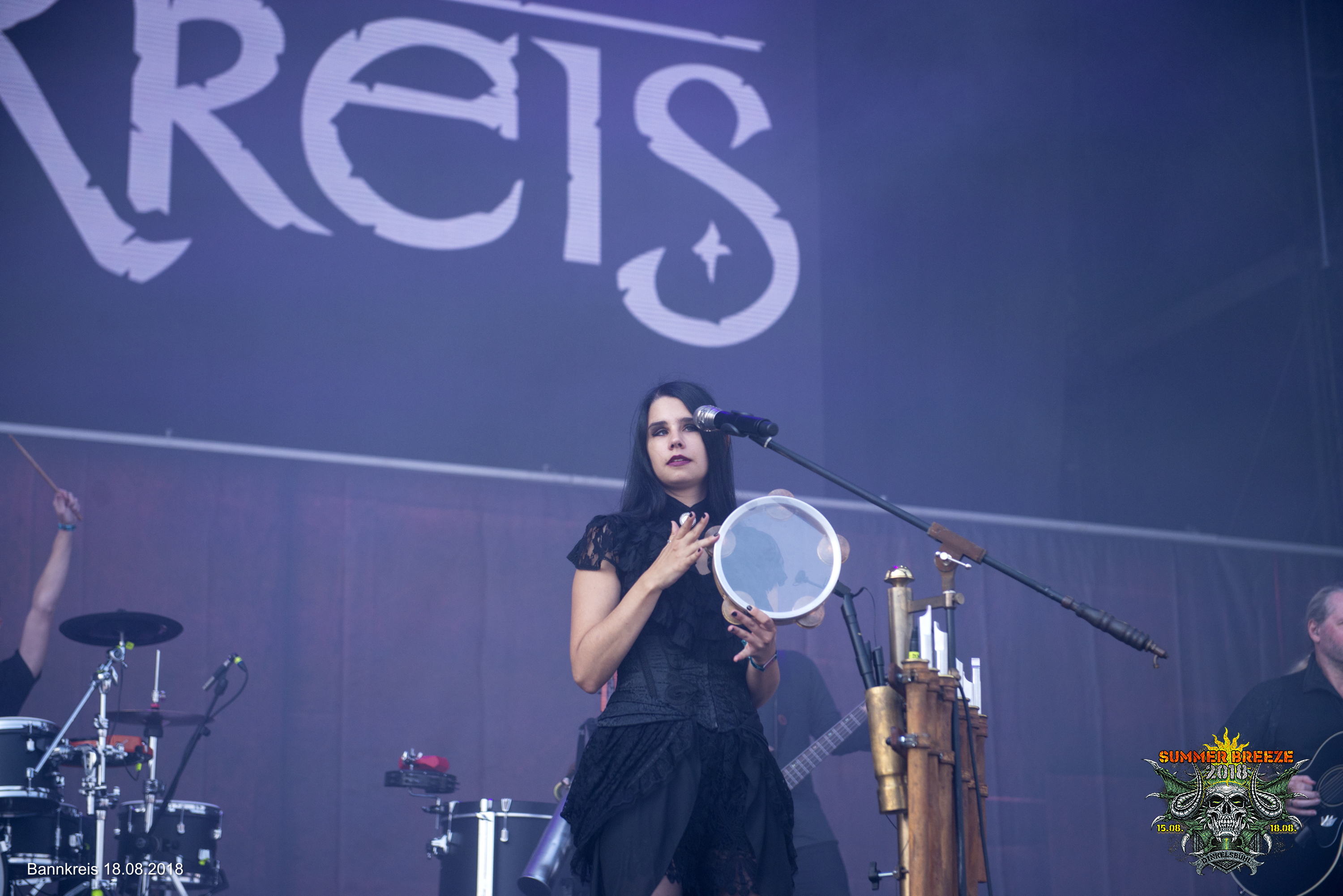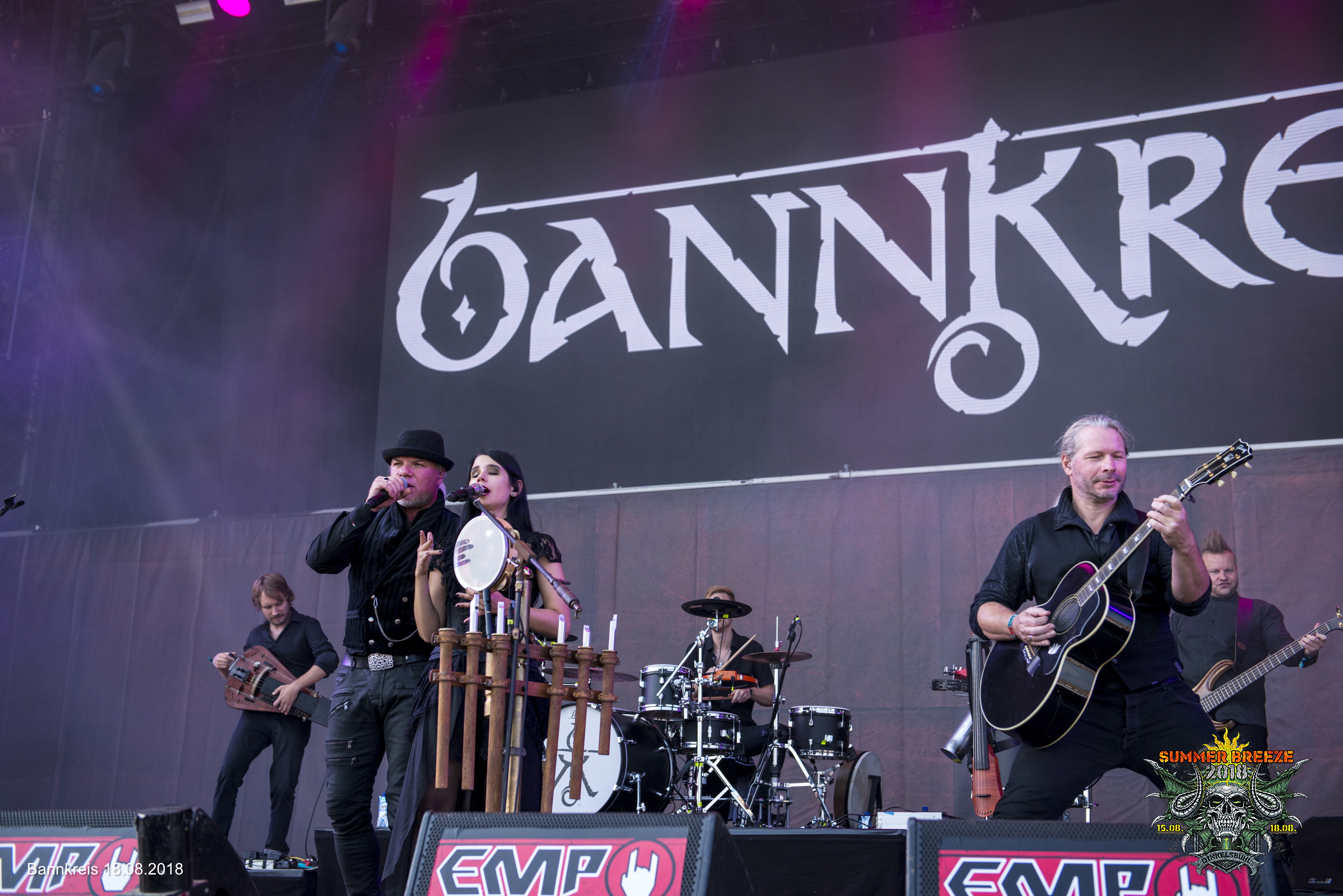 Dass sich ein Großteil der BANNKREIS-Belegschaft aus Musikern von Subway To Sally rekrutierte, war dem Sound des Septetts überdeutlich anzuhören. Die Band klang stark nach den Alben der Potsdamer gegen Ende der Neunziger (wie eben dem namensgebenden „Bannkreis“), wobei insbesondere der Gesang von Frontlady Johanna Krins dem gutlaunigen Folk Rock eine frische Prise Poppigkeit verlieh. Da die selbstbewusste junge Frau aufgrund einer angeborenen Netzhauterkrankung nahezu blind ist, konnte sie zwar die vielen begeisterten Gesichter im Publikum nicht sehen, der laute Jubel aus tausenden von Kehlen zauberte aber auch ihr ein ums andere Mal ein Lächeln aufs Gesicht. Da sage noch einer, der gemeine Metal-Fan würde nicht über eine romantische Ader verfügen oder sich dieser gar schämen! Mit dem „Totenbaum“ (einer famos eingedeutschten Version des von Jennifer Lawrence in der „Tribute von Panem“-Filmreihe gesungenen „The Hanging Tree“) und „Sweet Dreams“ umfasste die Setlist auch zwei Cover-Versionen, während „Doch ich weiß es“ ursprünglich als Kollaboration mit den schunkeligen Seebären Santiano entstand. Und weil sich BANNKREIS so zügig durch ihr Set gespielt hatten, blieb nach dem „Lebewohl“ und einer gemeinschaftlichen Verbeugung vor den Zuschauern noch Zeit für eine quasi-Zugabe in Form des Titelstücks ihres Debütalbums „Sakrament“.