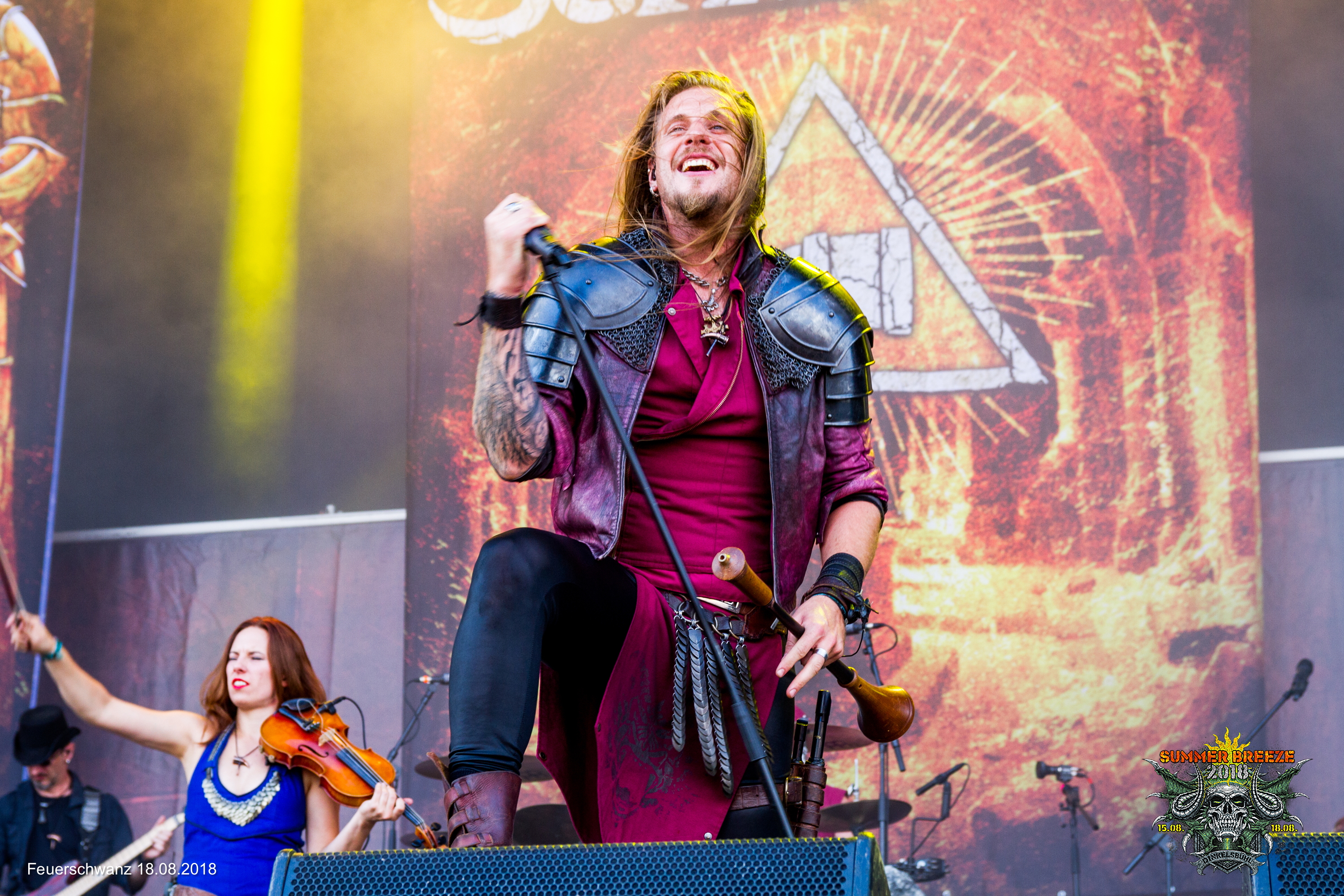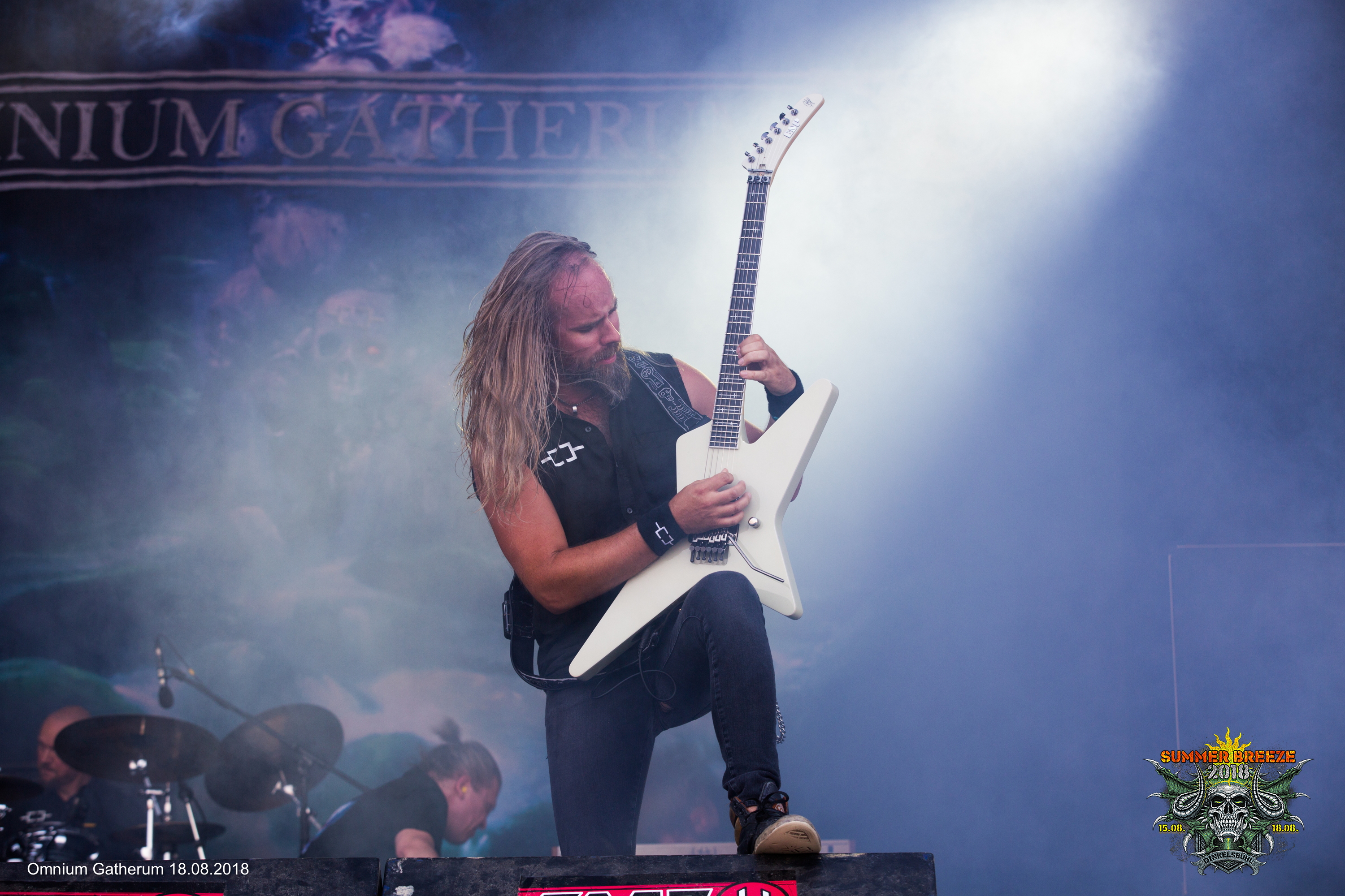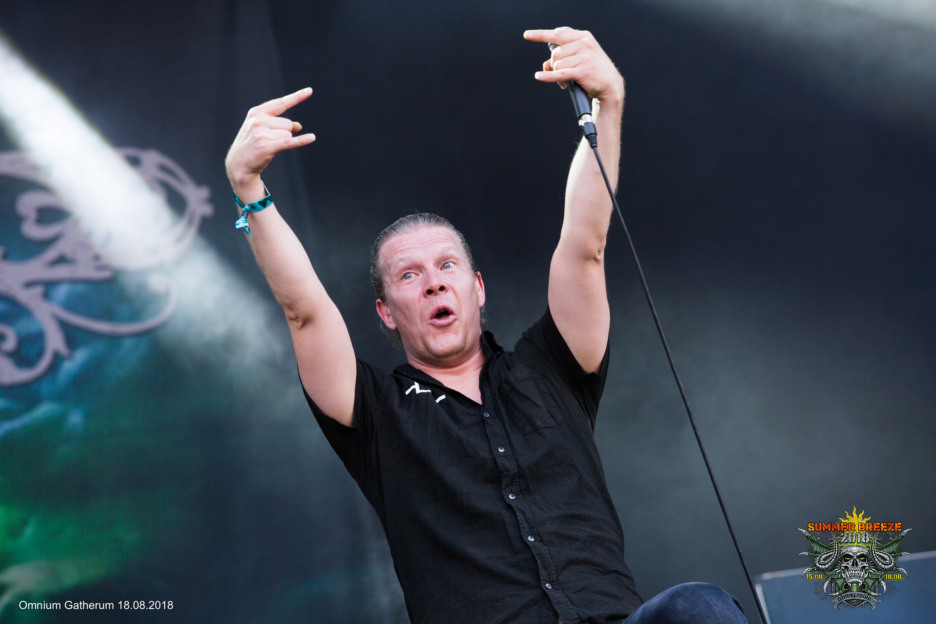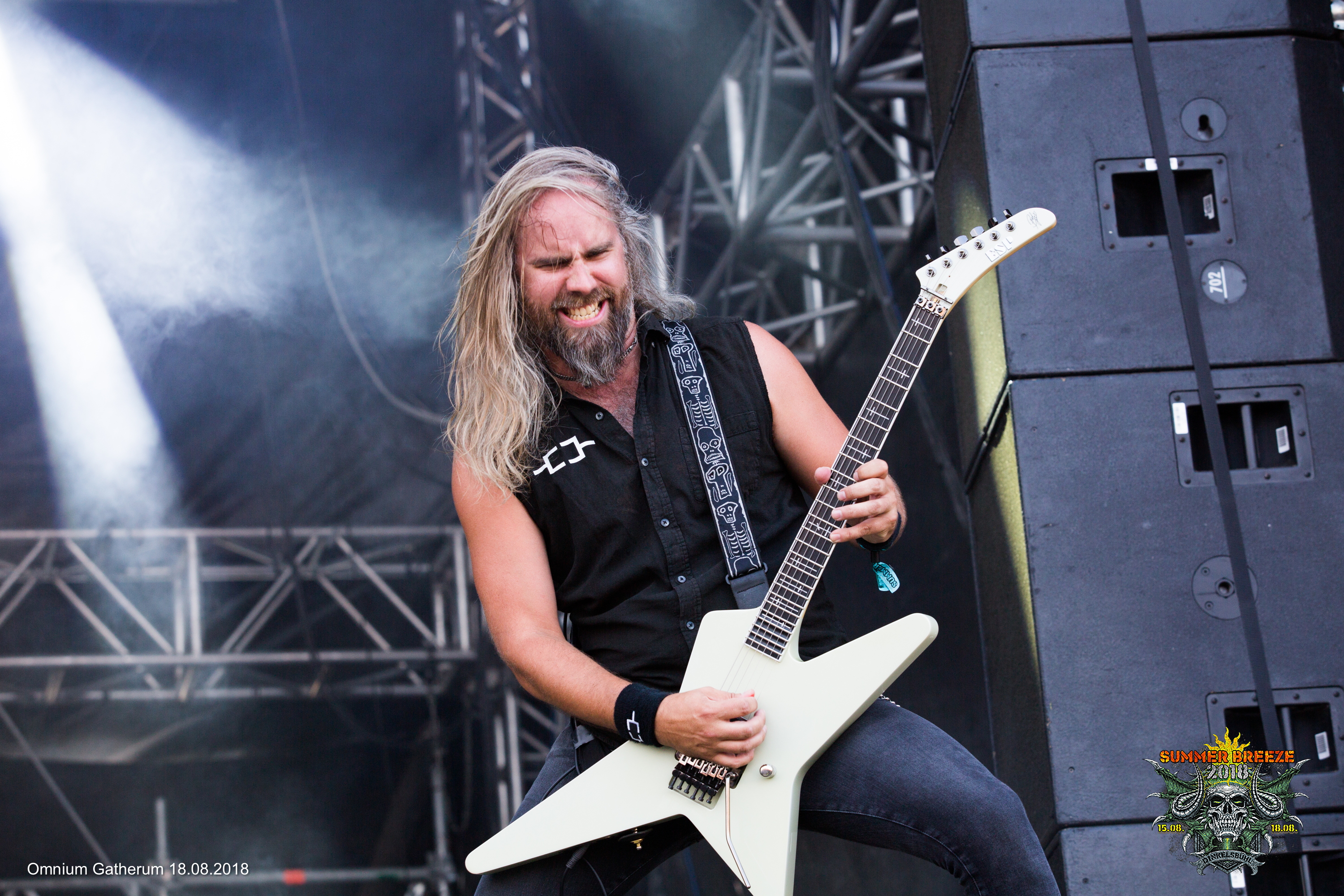 Direkt im Anschluss an WOLFHEART ging es auf der T-Stage mit den nächsten Finnen weiter. OMNIUM GATHERUM hatten auf dem SUMMER BREEZE ihren einzigen Festivalauftritt des Sommers. Da die gemeinsame Tour mit WOLFHEART erst im Herbst folgt, war dies die einzige Chance, sie davor noch live zu erleben. Als Intro verwendeten sie den Opening Track ihres Albums „The Burning Cold“, das erst Ende August erscheint. Es gab noch zwei weitere neue Songs auf die Ohren: „Refining Fire“ und „Gods Go First“ waren bereits von den entsprechenden Videos bekannt. So konnten die Fans auch schon im Vorfeld die Texte lernen und sie OMNIUM GATHERUM aus den ersten Reihen entgegensingen. Auch das Omni-Sign, zwei einander zugewandte Pommesgabeln, die das Bandlogo imitieren, saß schon bei einem Teil des Publikums. Der Rest wurde von Sänger Jukka Pelkonen informiert. Obwohl alle Bandmitglieder äußerst aktiv auf der Bühne sind, war er es, der den meisten Körpereinsatz zeigte. Er fegte permanent über die Bretter, kletterte gerne mal über einen Monitor oder ging am Bühnenrand auf die Knie. Den Rampensau-Award muss er sich aber mit Leadgitarrist Markus Vanhala teilen. Dieser zog mit seinen filigran gespielten, mitreißenden Soli immer wieder die Aufmerksamkeit aller auf sich.