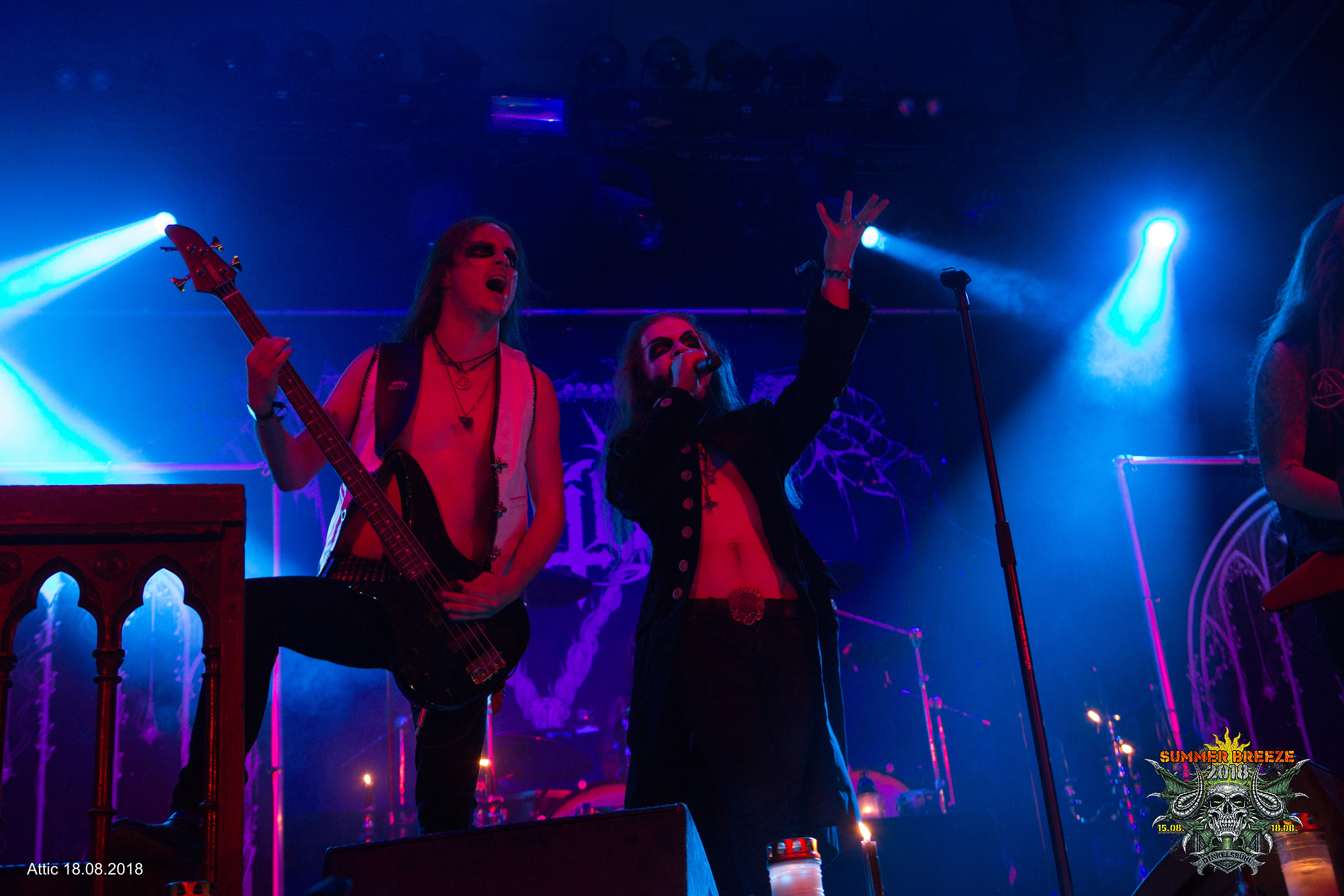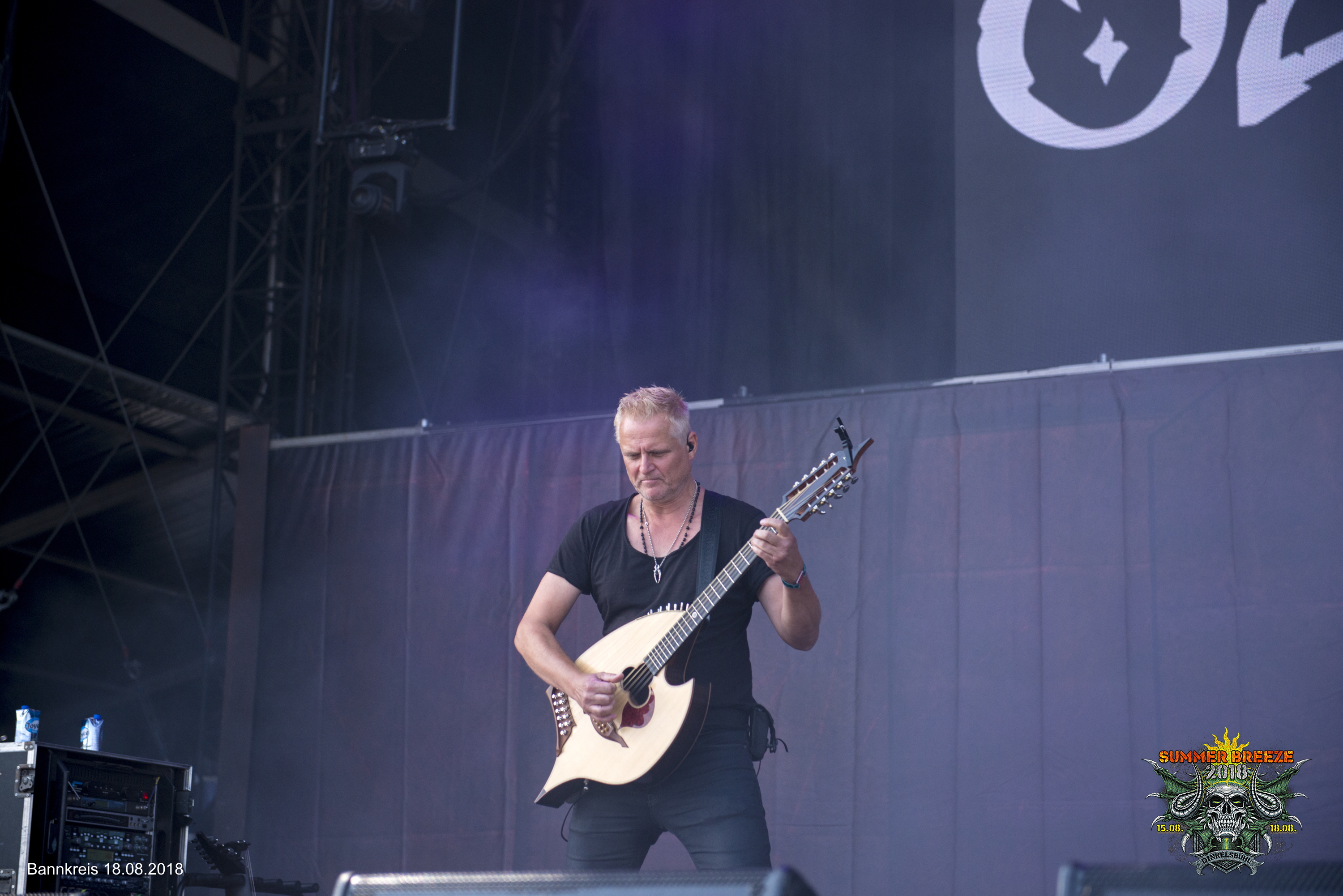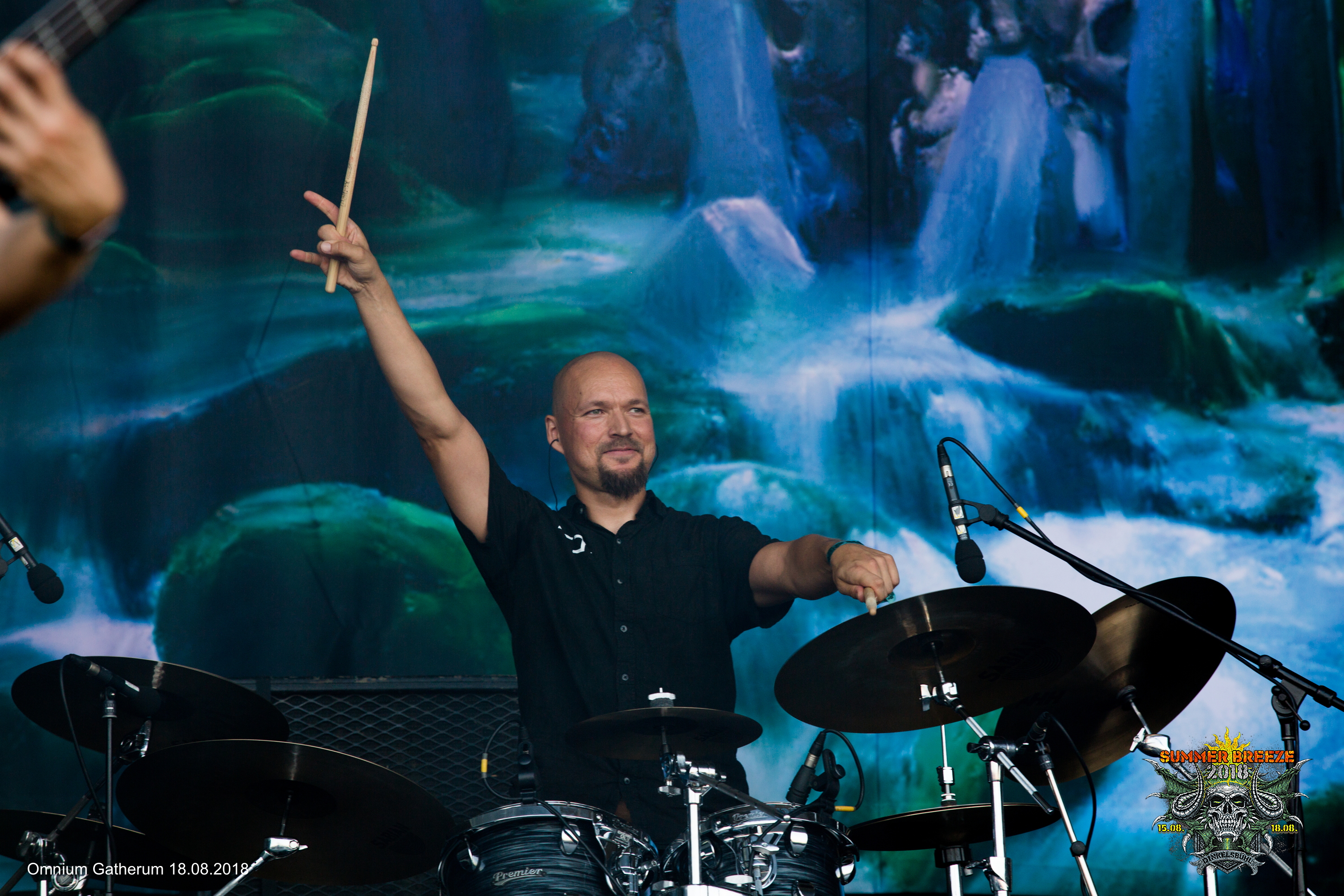 Direkt im Anschluss an WOLFHEART ging es auf der T-Stage mit den nächsten Finnen weiter. OMNIUM GATHERUM hatten auf dem SUMMER BREEZE ihren einzigen Festivalauftritt des Sommers. Da die gemeinsame Tour mit WOLFHEART erst im Herbst folgt, war dies die einzige Chance, sie davor noch live zu erleben. Als Intro verwendeten sie den Opening Track ihres Albums „The Burning Cold“, das erst Ende August erscheint. Es gab noch zwei weitere neue Songs auf die Ohren: „Refining Fire“ und „Gods Go First“ waren bereits von den entsprechenden Videos bekannt. So konnten die Fans auch schon im Vorfeld die Texte lernen und sie OMNIUM GATHERUM aus den ersten Reihen entgegensingen. Auch das Omni-Sign, zwei einander zugewandte Pommesgabeln, die das Bandlogo imitieren, saß schon bei einem Teil des Publikums. Der Rest wurde von Sänger Jukka Pelkonen informiert. Obwohl alle Bandmitglieder äußerst aktiv auf der Bühne sind, war er es, der den meisten Körpereinsatz zeigte. Er fegte permanent über die Bretter, kletterte gerne mal über einen Monitor oder ging am Bühnenrand auf die Knie. Den Rampensau-Award muss er sich aber mit Leadgitarrist Markus Vanhala teilen. Dieser zog mit seinen filigran gespielten, mitreißenden Soli immer wieder die Aufmerksamkeit aller auf sich.