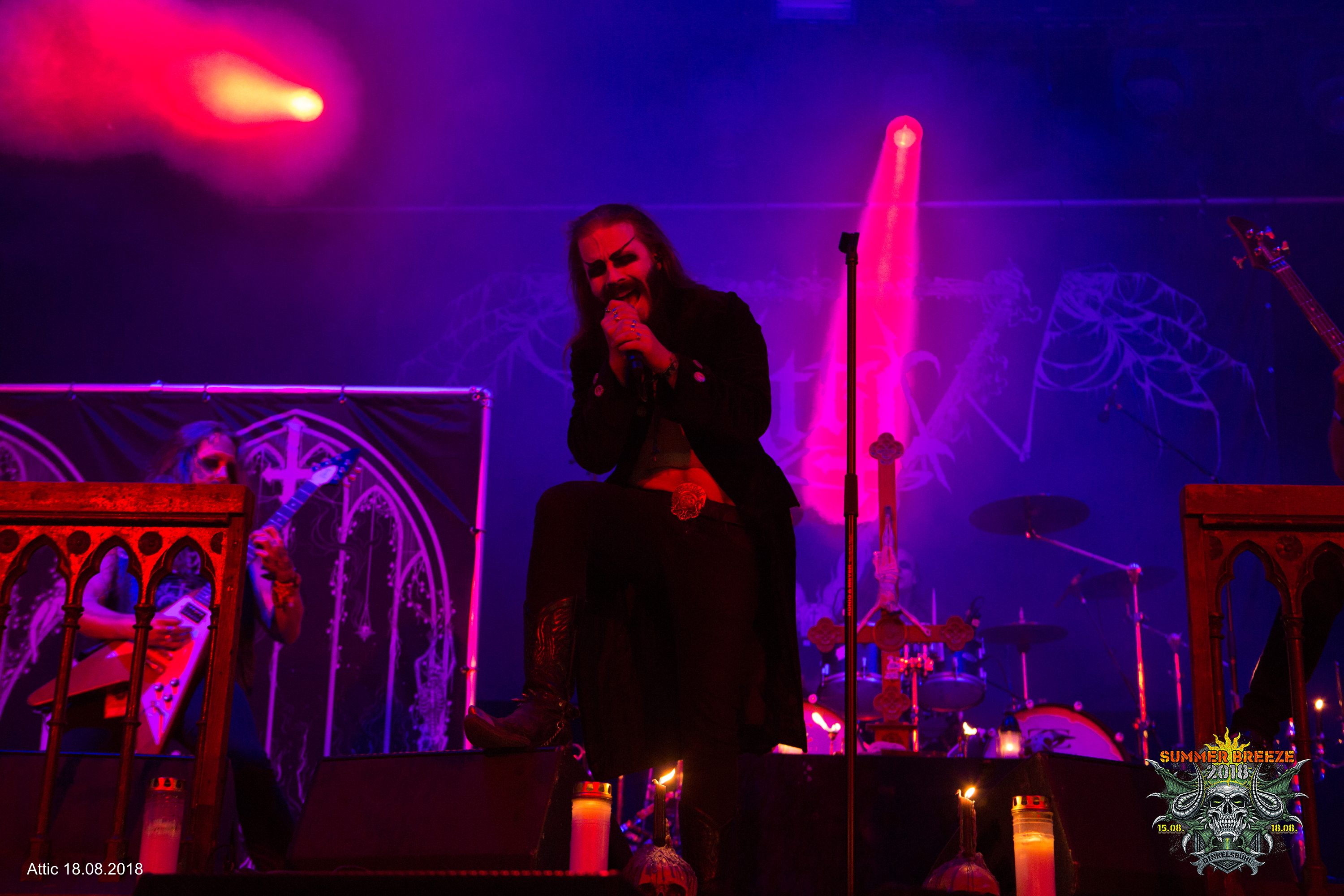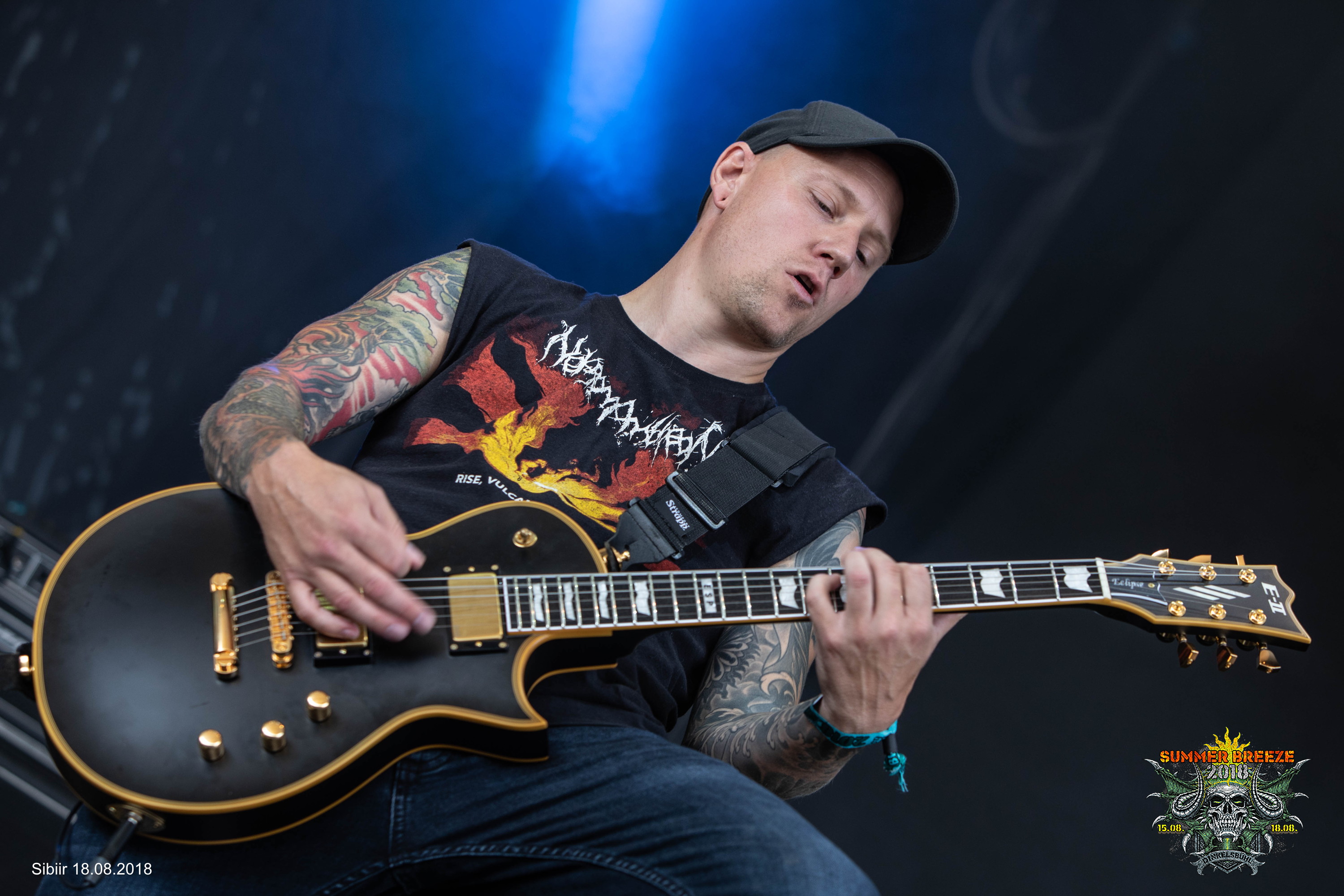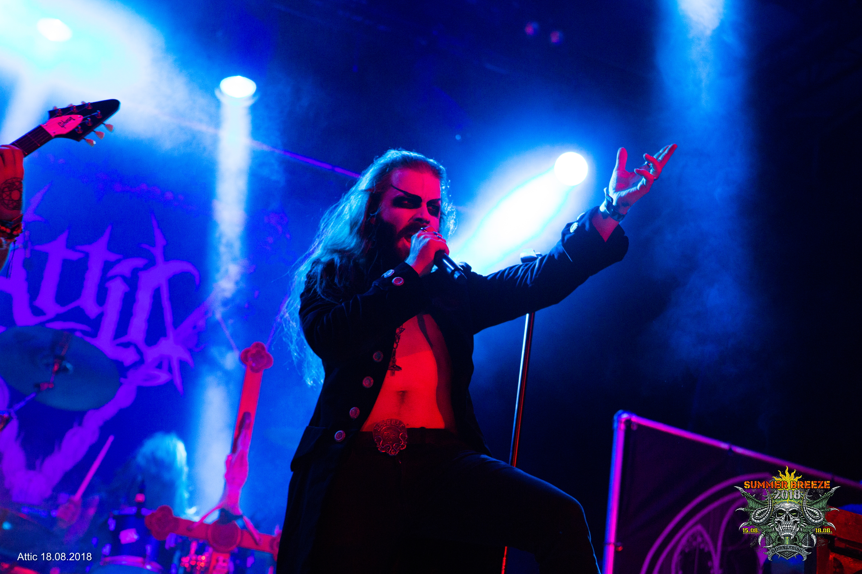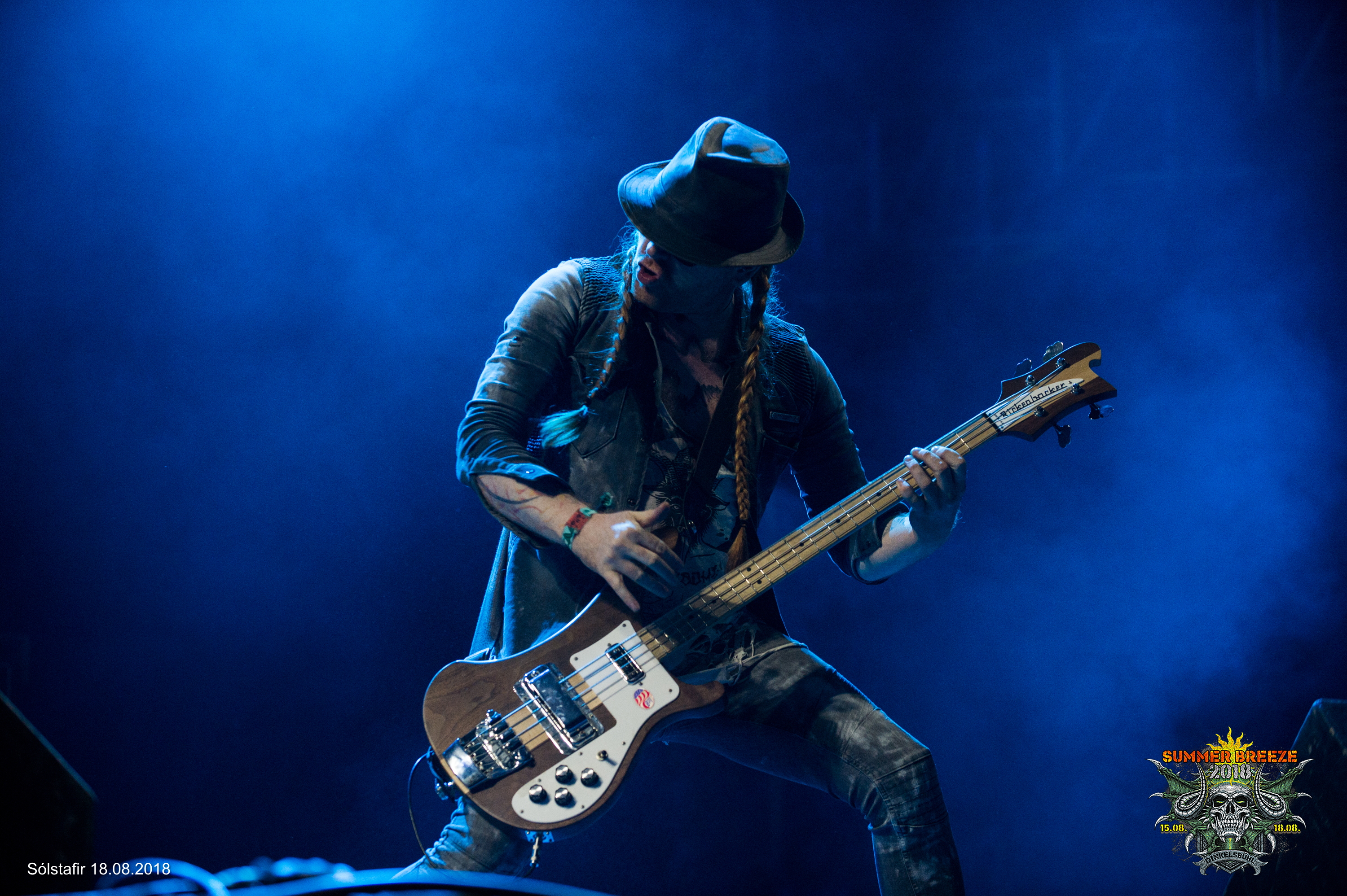 Direkt im Anschluss an WOLFHEART ging es auf der T-Stage mit den nächsten Finnen weiter. OMNIUM GATHERUM hatten auf dem SUMMER BREEZE ihren einzigen Festivalauftritt des Sommers. Da die gemeinsame Tour mit WOLFHEART erst im Herbst folgt, war dies die einzige Chance, sie davor noch live zu erleben. Als Intro verwendeten sie den Opening Track ihres Albums „The Burning Cold“, das erst Ende August erscheint. Es gab noch zwei weitere neue Songs auf die Ohren: „Refining Fire“ und „Gods Go First“ waren bereits von den entsprechenden Videos bekannt. So konnten die Fans auch schon im Vorfeld die Texte lernen und sie OMNIUM GATHERUM aus den ersten Reihen entgegensingen. Auch das Omni-Sign, zwei einander zugewandte Pommesgabeln, die das Bandlogo imitieren, saß schon bei einem Teil des Publikums. Der Rest wurde von Sänger Jukka Pelkonen informiert. Obwohl alle Bandmitglieder äußerst aktiv auf der Bühne sind, war er es, der den meisten Körpereinsatz zeigte. Er fegte permanent über die Bretter, kletterte gerne mal über einen Monitor oder ging am Bühnenrand auf die Knie. Den Rampensau-Award muss er sich aber mit Leadgitarrist Markus Vanhala teilen. Dieser zog mit seinen filigran gespielten, mitreißenden Soli immer wieder die Aufmerksamkeit aller auf sich.