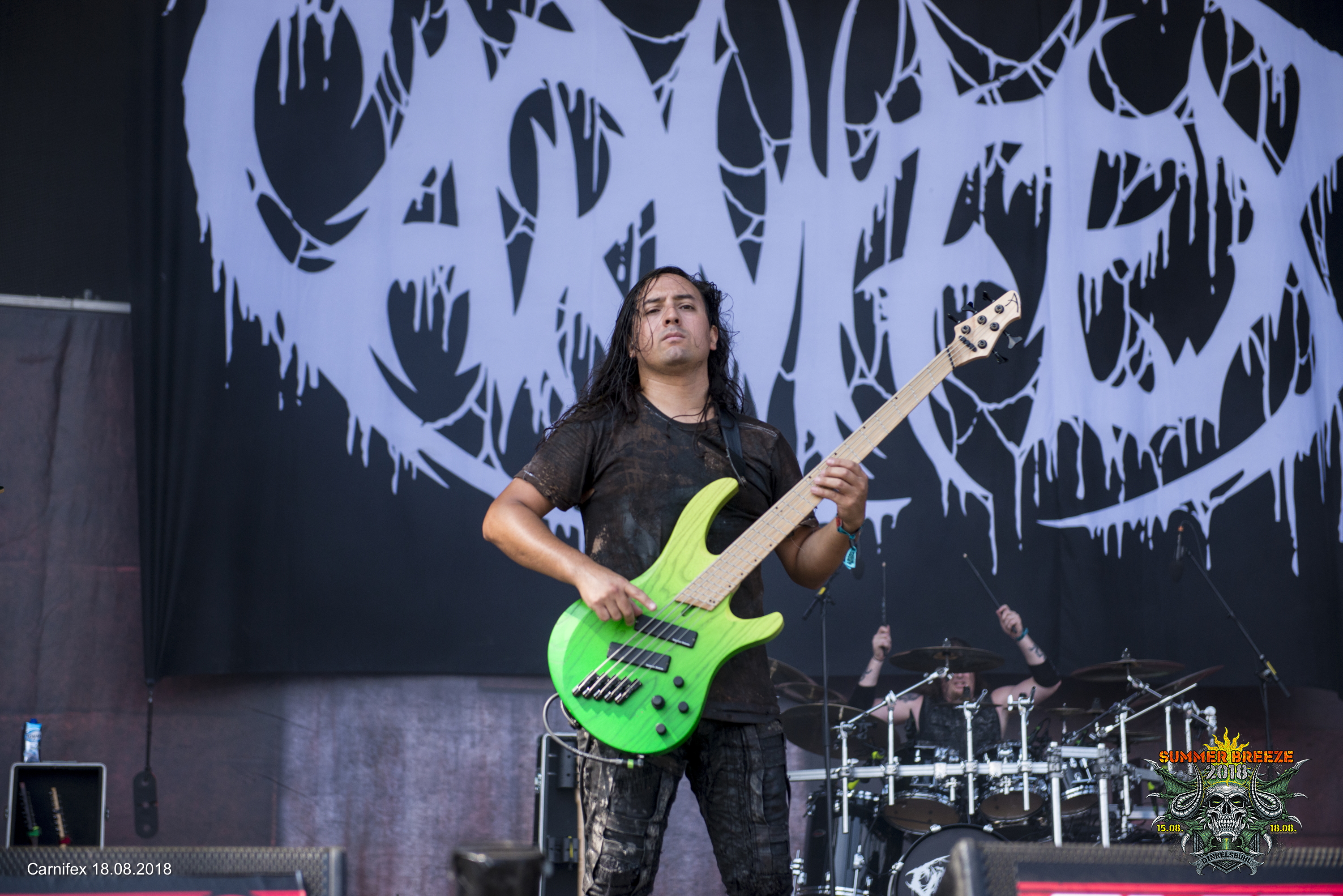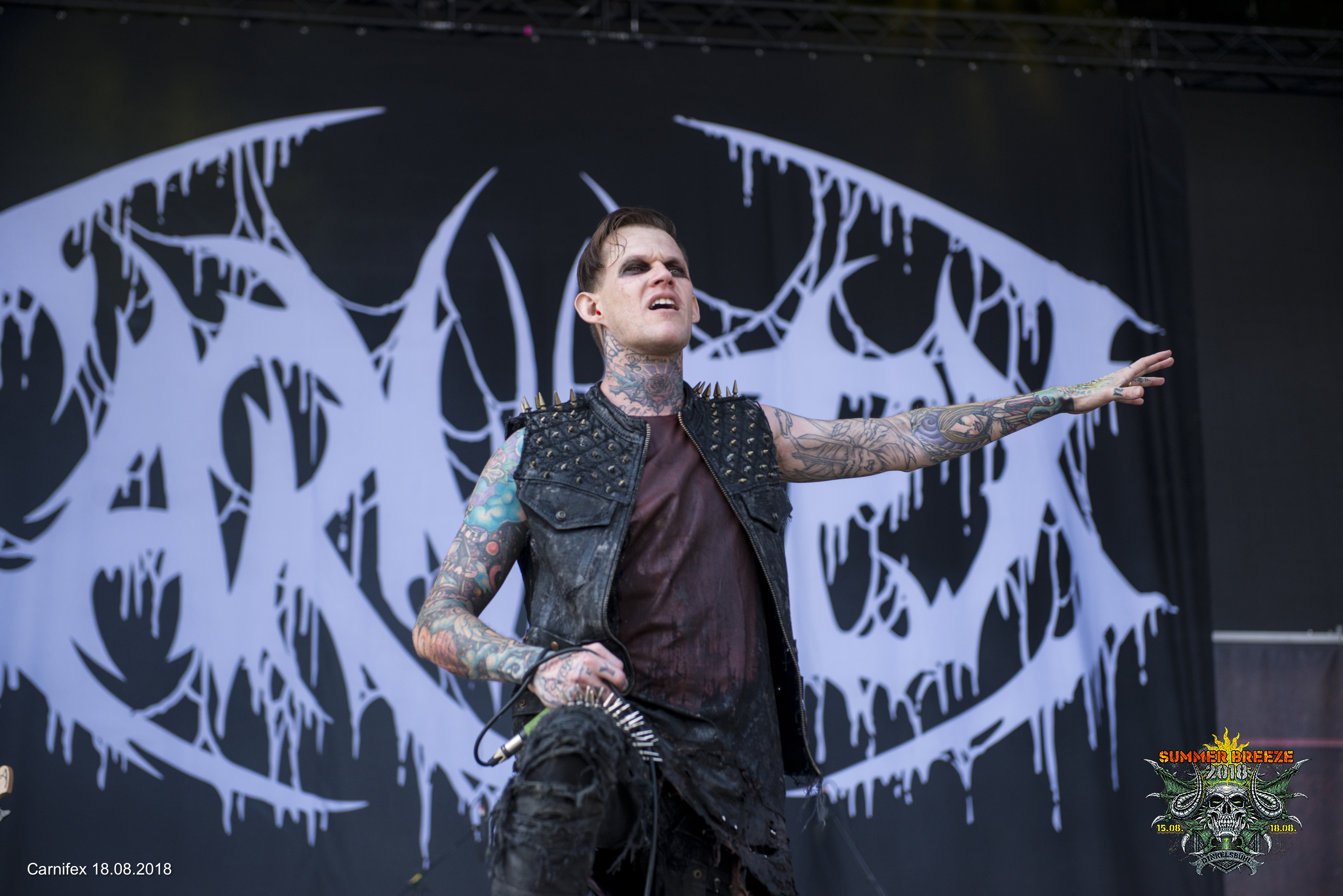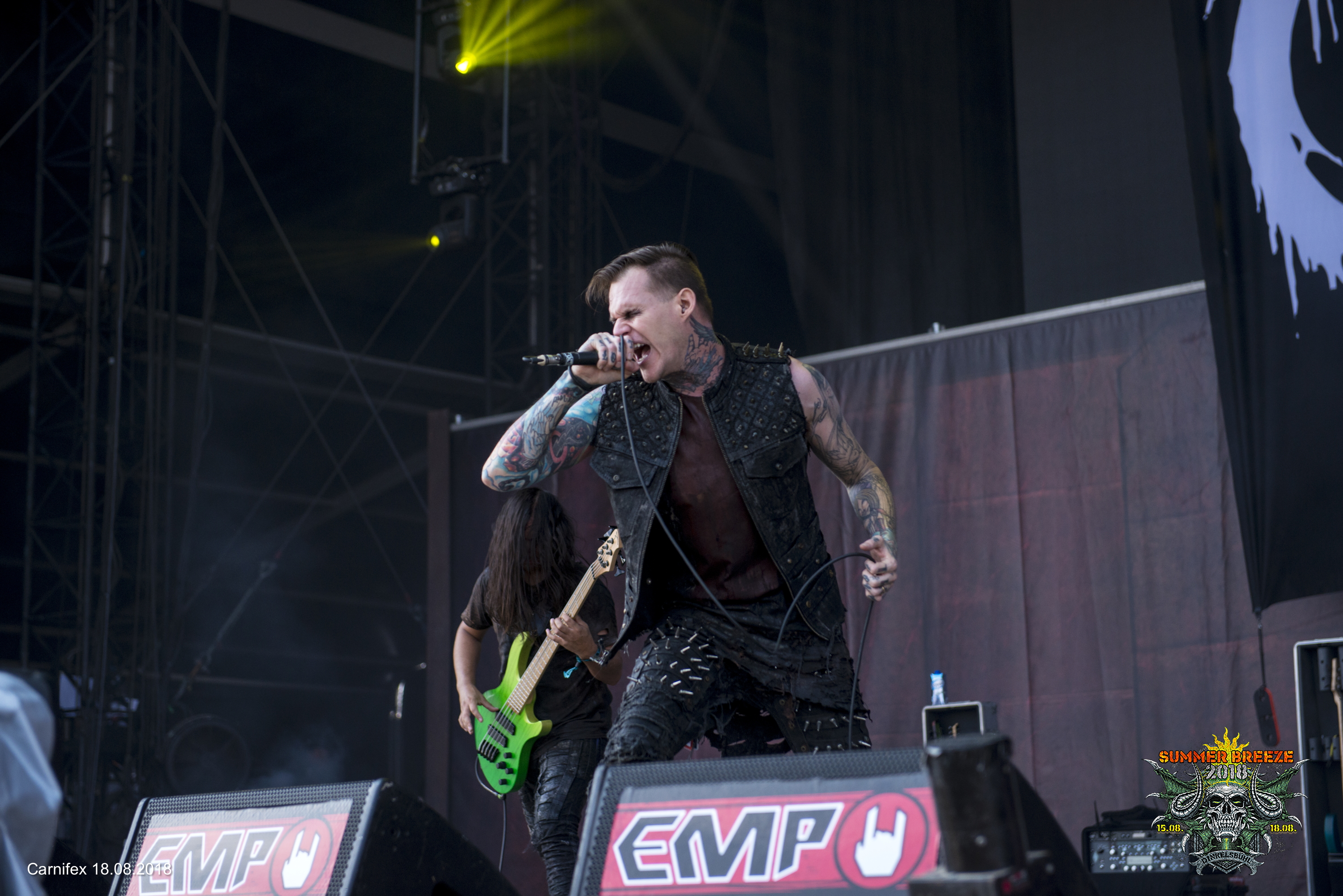Nachdem die ähnlich gelagerten BETRAYING THE MARTYRS den Deathcore-Reigen auf der Main Stage eröffnet hatten, lag es nun an den deutlich härter ausgerichteten CARNIFEX, die während des Change Overs in freudiger Erwartung einfach stehen gebliebenen Fans endgültig zu plätten. Zunächst stand diesem Vorhaben ein viel zu leiser Sound im Weg, dem aber schnell Abhilfe und somit der richtige Rahmen für die brutal wuchtigen Songs geschaffen wurde. Zumindest fast, denn leider blieben die filigranen Leads von Klampfer Jordan Lockrey über die gesamte Zeit ihres Gigs kaum hörbar. Ob der blonde Hüne wohl deshalb merklich skeptisch ins Rund schaute? Musste er eigentlich gar nicht, die Fans fraßen CARNIFEX nämlich aus der Hand. Jeder Song entfachte einen Circle Pit, der sich gewaschen hatte und auch sonst schnellten die Hörner nach den Songs zu tausenden in die Höhe. Einen guten Anteil daran hatte neben der Leistung der Band aber auch Fronter Scott Lewis, der die Menge fortwährend zu mehr Action im Pit anstachelte. Zum Abschluss gab es mit „Lie To My Face“ noch einen absoluten Brecher aus den Anfangstagen der Band, der bewies, dass CARNIFEX nicht ohne Grund als Speerspitze ihres Genres gelten.