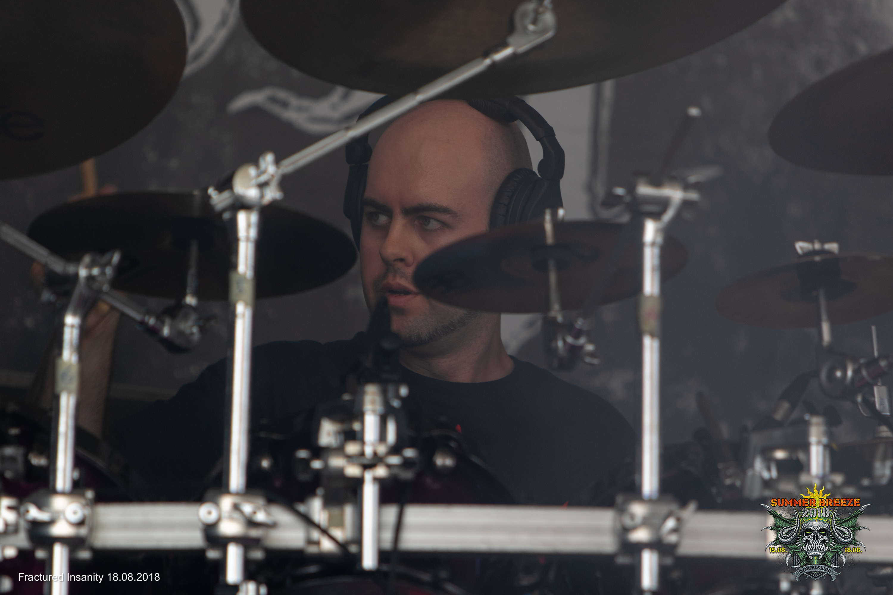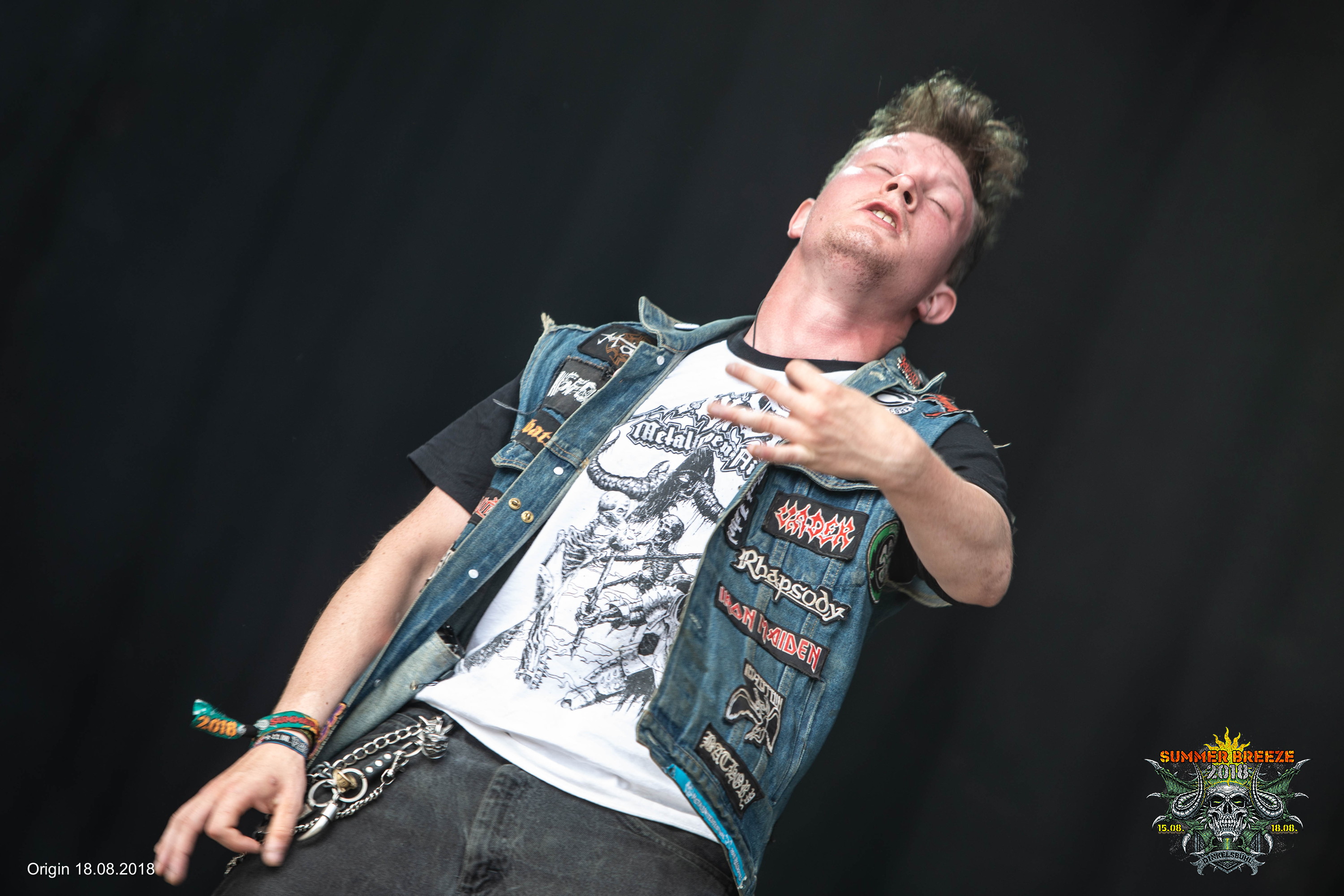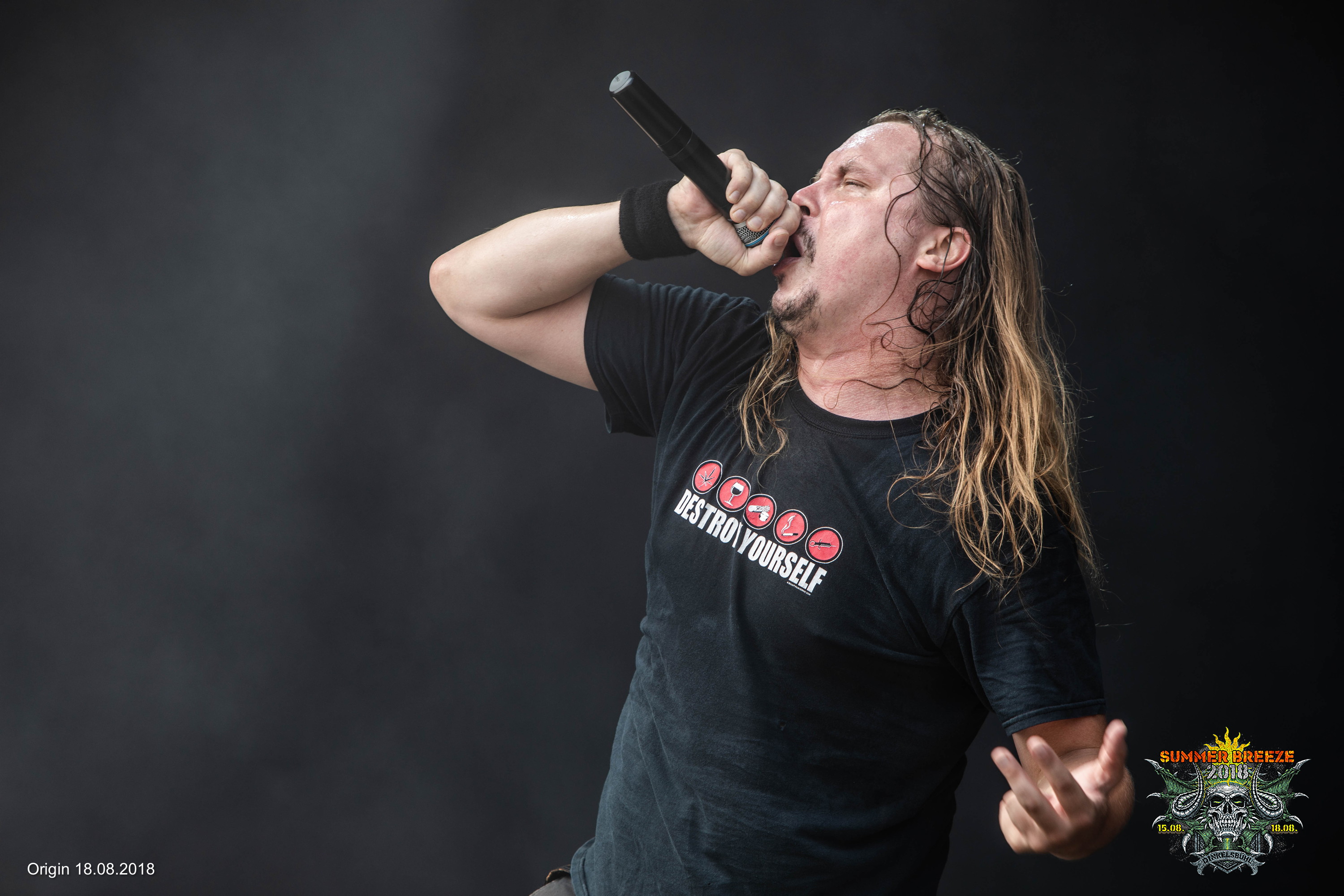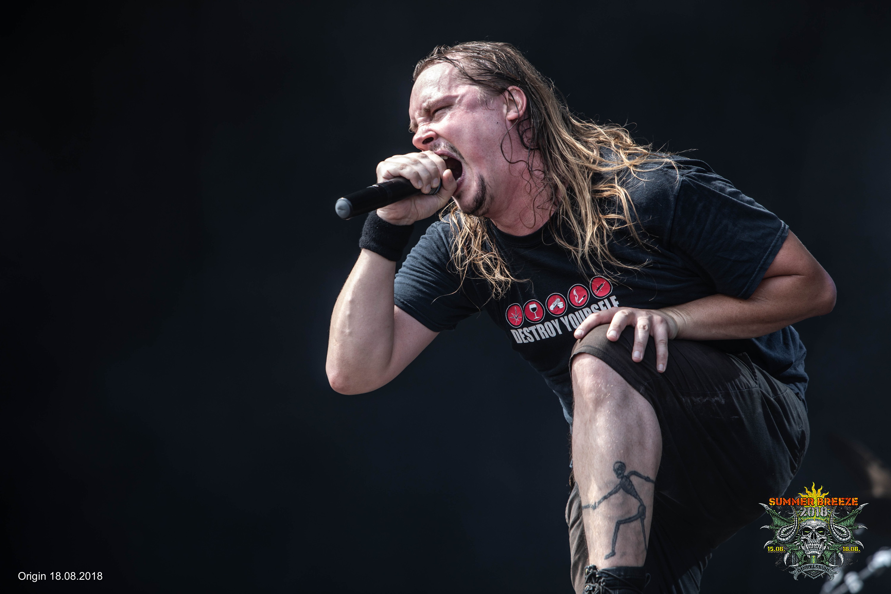 High Noon, die Sonne knallte erbarmungsls auf die T-Stage und ebenso erbarmungslos starteten die drei US-Amerikaner ORIGIN in ihr Set. Als sie 2010 zum letzten Mal auf dem SUMMER BREEZE auftraten, war der heutige Fronter Jason Keyser noch gar nicht an Bord. Der Mann ist aber ein absoluter Entertainer und vor allem mit einem mächtigen Brüllorgan gesegnet; jedenfalls war nach seinem einleitenden „Are You Awake?“ wohl auch der letzte Rest Müdigkeit bei den Anwesenden wie weggeblasen. Für reihenweise am Boden zerschellende Kinnladen war Schlagzeuger John Longstreth verantwortlich. Die menschgewordene Nähmaschine saß tiefenentspannt hinter seinem Drumkit und spielte äußerlich fast gelangweilt wirkend und ohne mit der Wimper zu zucken übermenschliche Passagen – wow! Fans der Band wird es direkt mit dem Beginn aufgefallen sein, aber Jason Keyser informierte das versammelte Volk nach ein paar Songs „Links von mir ist es etwas leer… Wir sind vor einer Woche nach Europa geflogen und die Airline hat dabei nicht nur unser Gepäck, sondern auch unseren Bassisten verloren!“ Nur mit einem Gitarristen und dem Überdrummer killte der technische Death Metal aber auch in der Triobesetzung mächtig – und für ein paar Songs holten sie sogar einen sehr engagierten Fan auf die Bühne, der sich hingebungsvoll um seinen „Luftbass“ kümmerte.