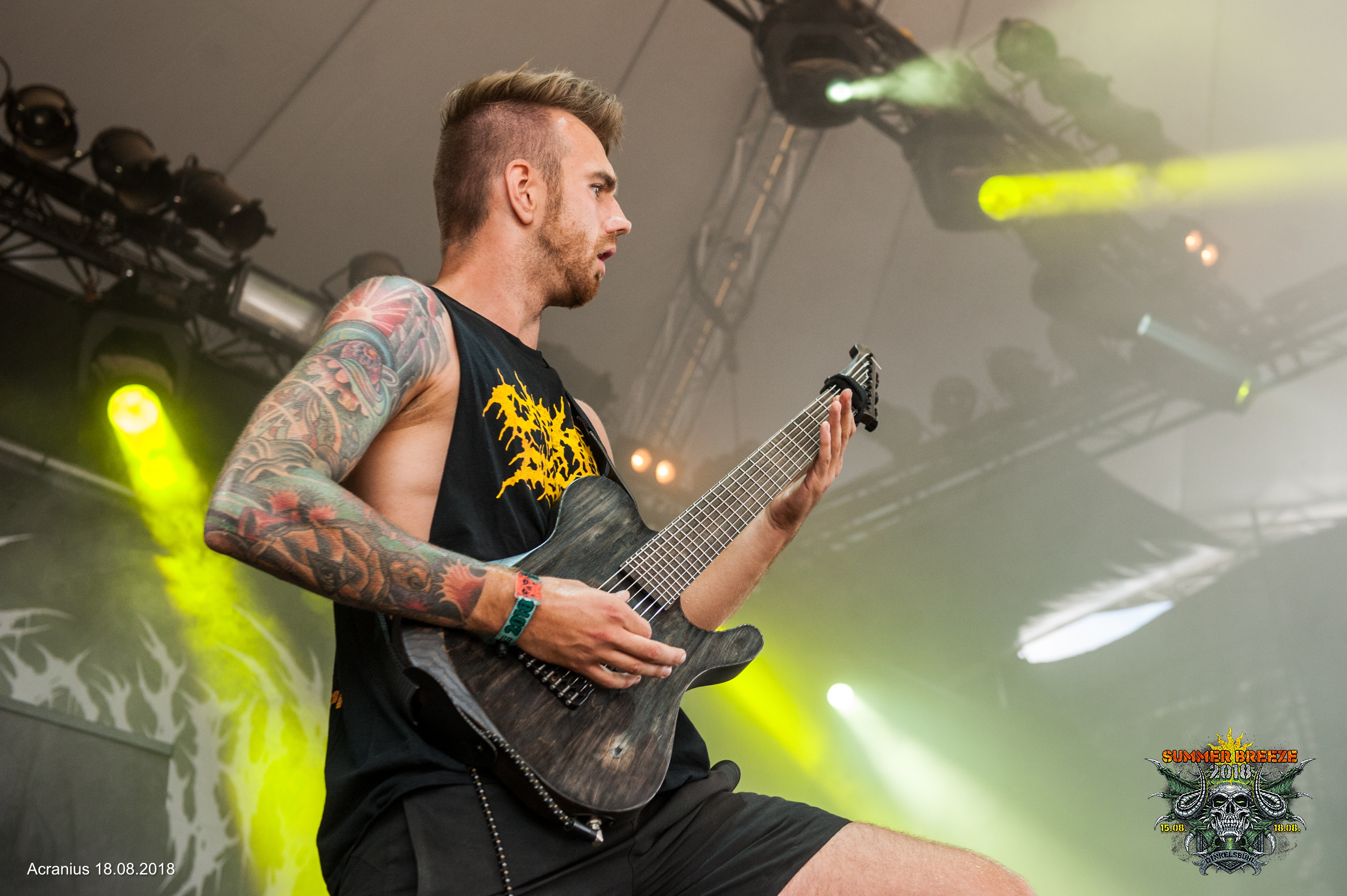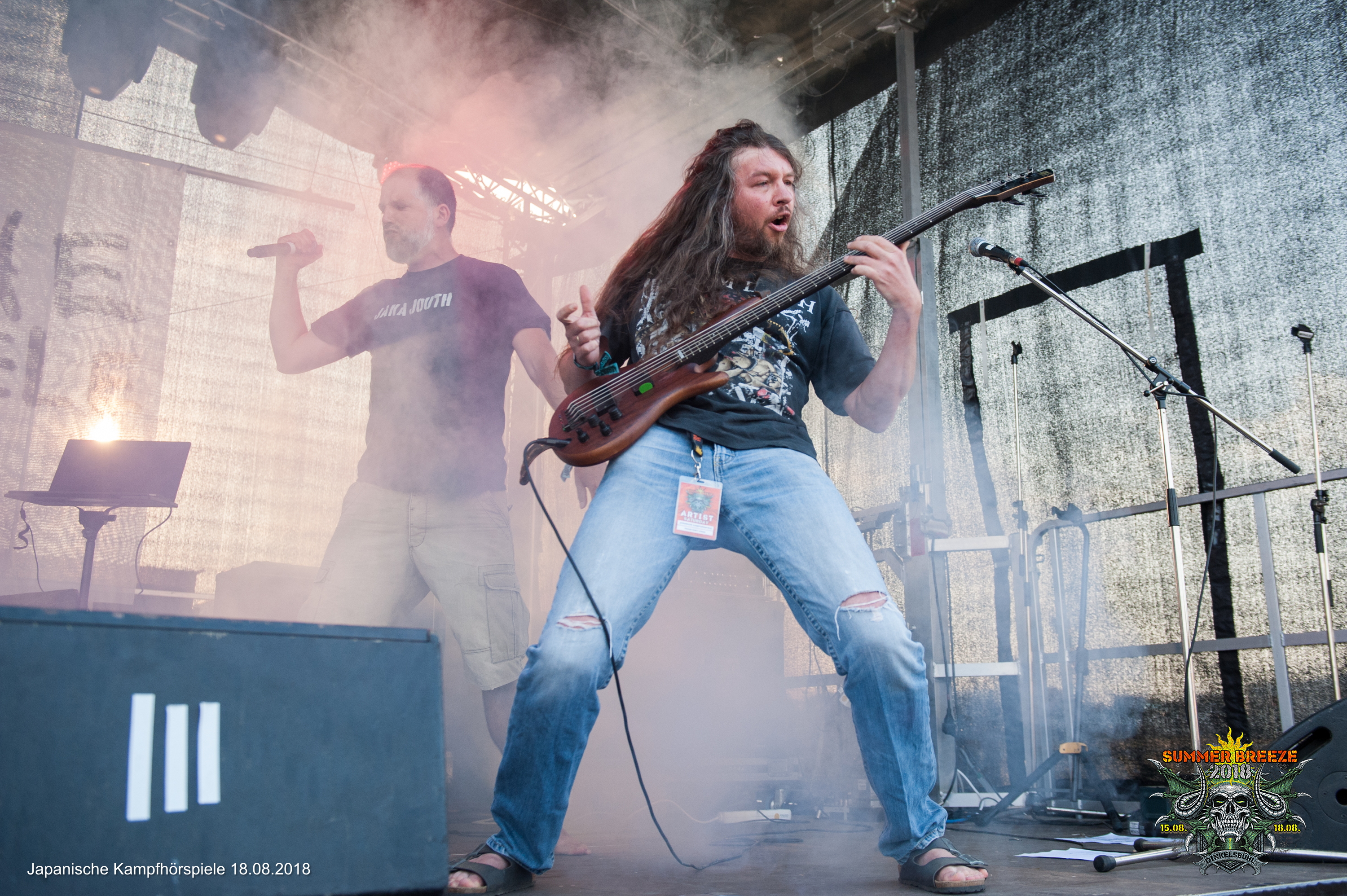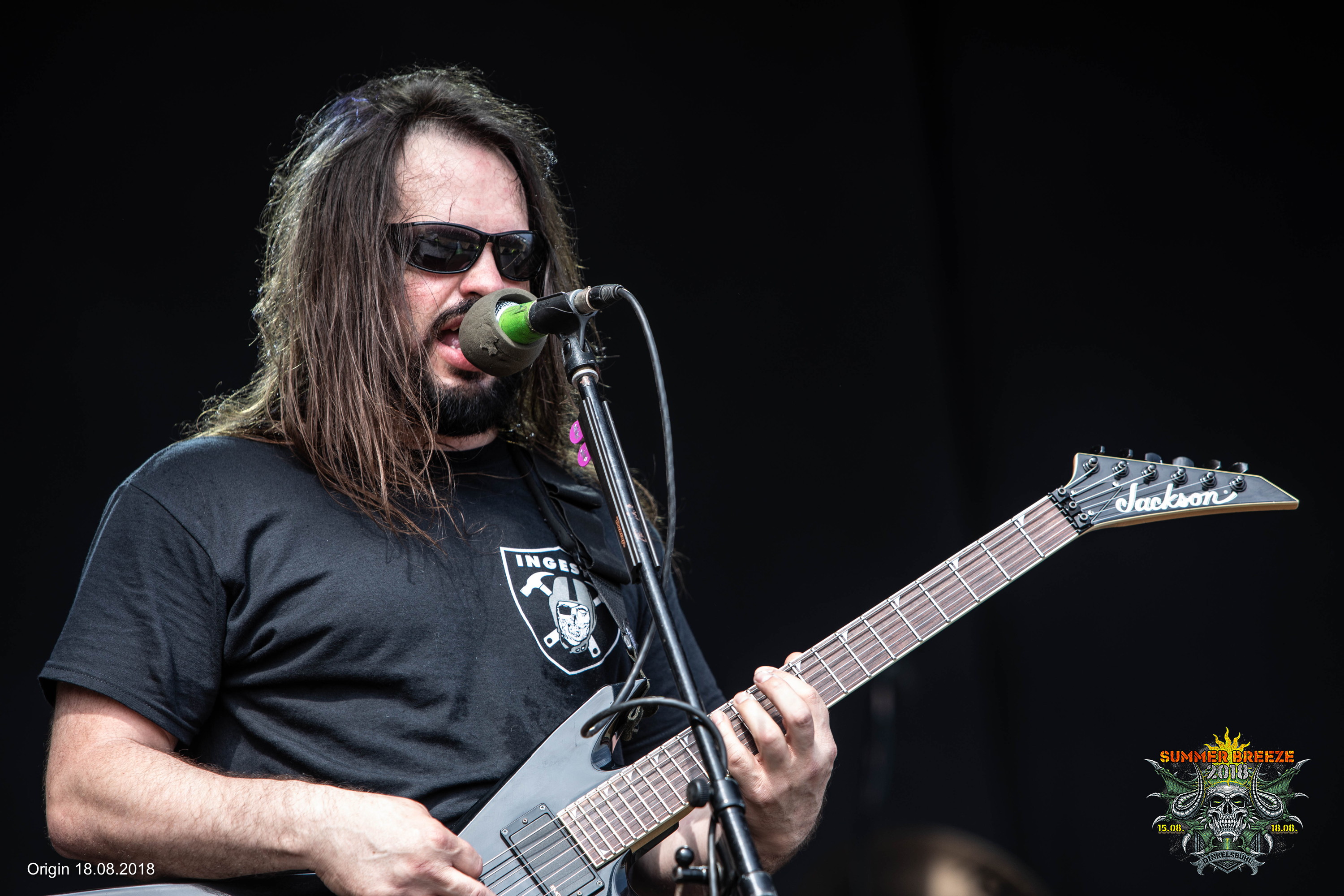 High Noon, die Sonne knallte erbarmungsls auf die T-Stage und ebenso erbarmungslos starteten die drei US-Amerikaner ORIGIN in ihr Set. Als sie 2010 zum letzten Mal auf dem SUMMER BREEZE auftraten, war der heutige Fronter Jason Keyser noch gar nicht an Bord. Der Mann ist aber ein absoluter Entertainer und vor allem mit einem mächtigen Brüllorgan gesegnet; jedenfalls war nach seinem einleitenden „Are You Awake?“ wohl auch der letzte Rest Müdigkeit bei den Anwesenden wie weggeblasen. Für reihenweise am Boden zerschellende Kinnladen war Schlagzeuger John Longstreth verantwortlich. Die menschgewordene Nähmaschine saß tiefenentspannt hinter seinem Drumkit und spielte äußerlich fast gelangweilt wirkend und ohne mit der Wimper zu zucken übermenschliche Passagen – wow! Fans der Band wird es direkt mit dem Beginn aufgefallen sein, aber Jason Keyser informierte das versammelte Volk nach ein paar Songs „Links von mir ist es etwas leer… Wir sind vor einer Woche nach Europa geflogen und die Airline hat dabei nicht nur unser Gepäck, sondern auch unseren Bassisten verloren!“ Nur mit einem Gitarristen und dem Überdrummer killte der technische Death Metal aber auch in der Triobesetzung mächtig – und für ein paar Songs holten sie sogar einen sehr engagierten Fan auf die Bühne, der sich hingebungsvoll um seinen „Luftbass“ kümmerte.
