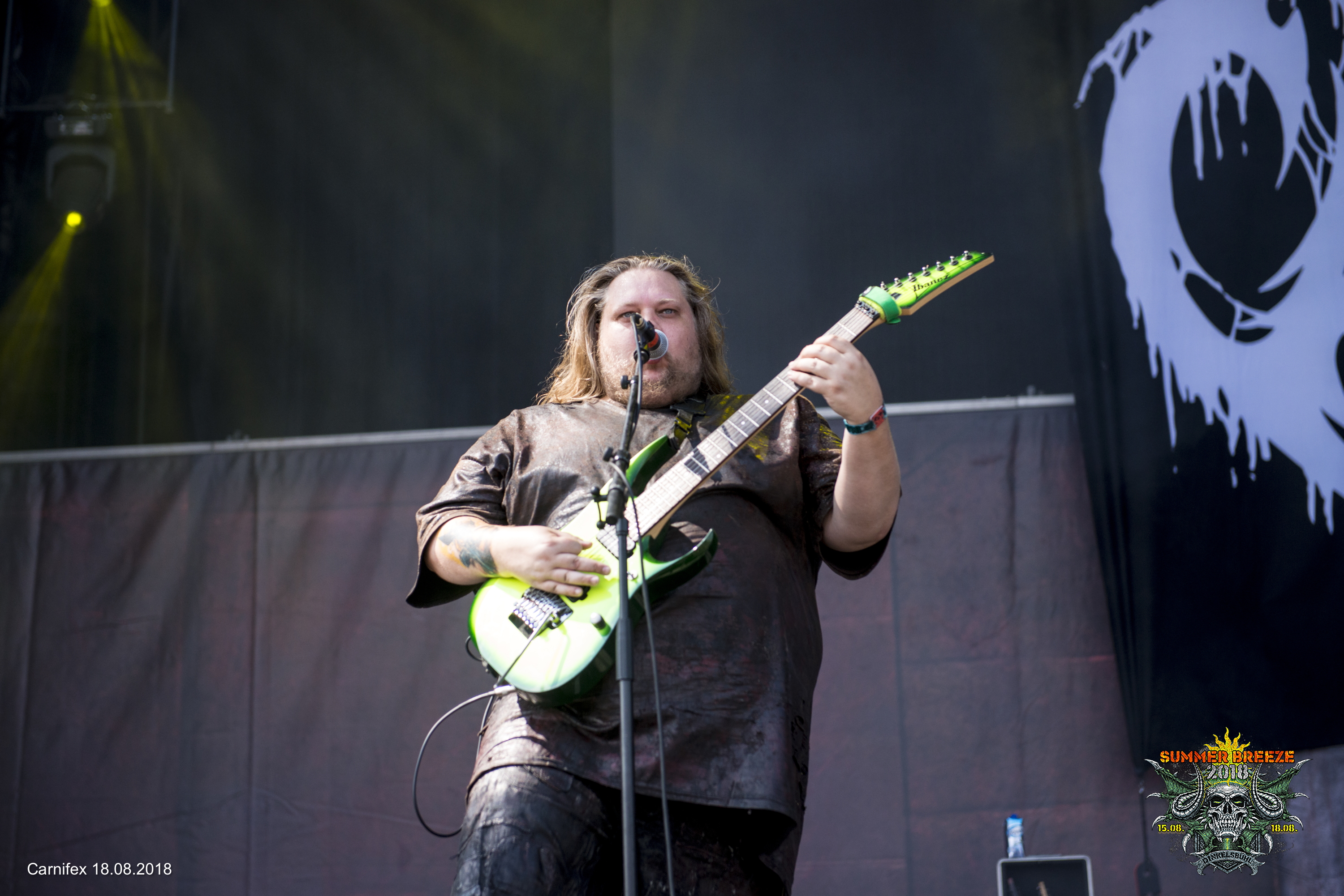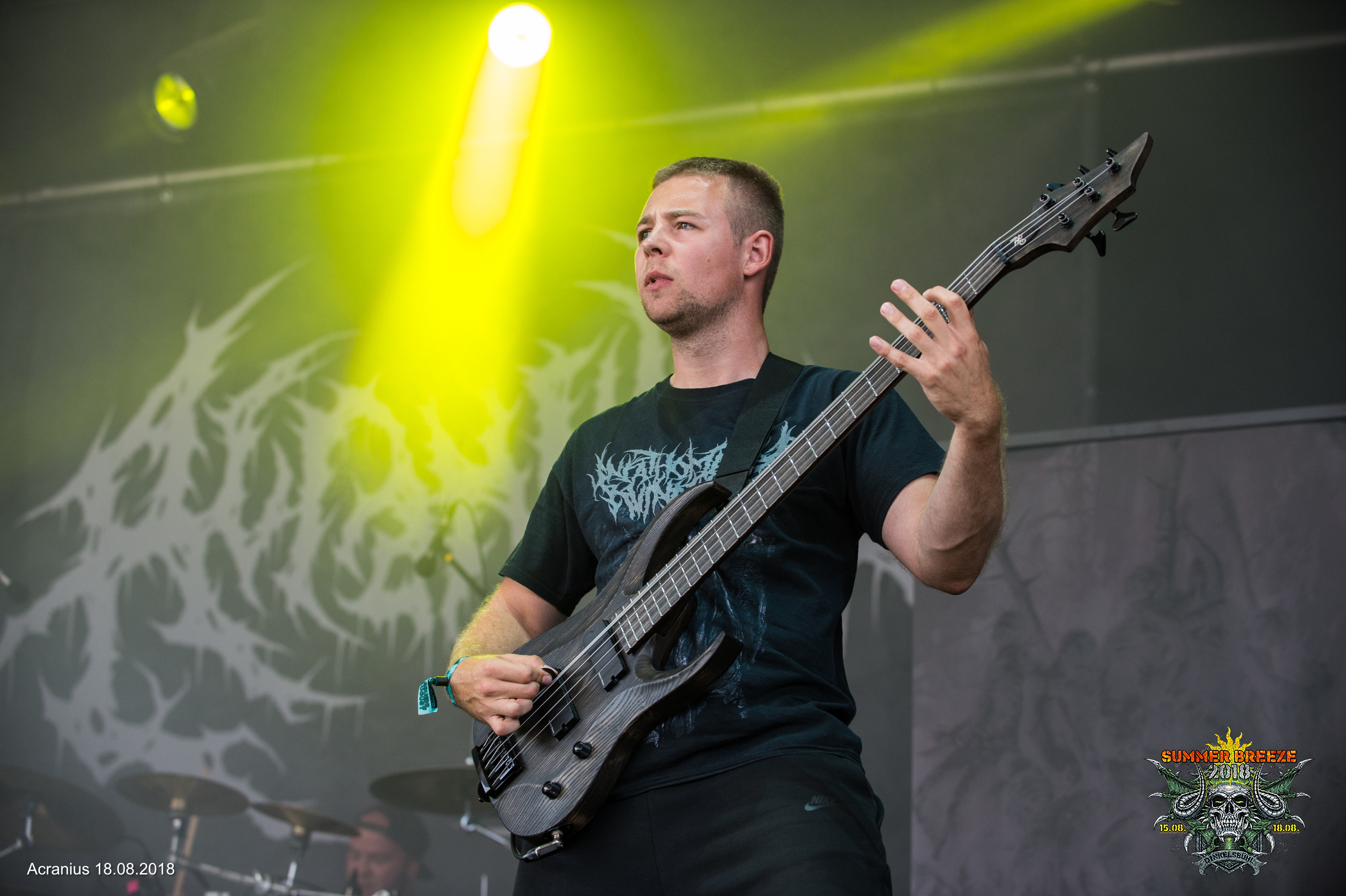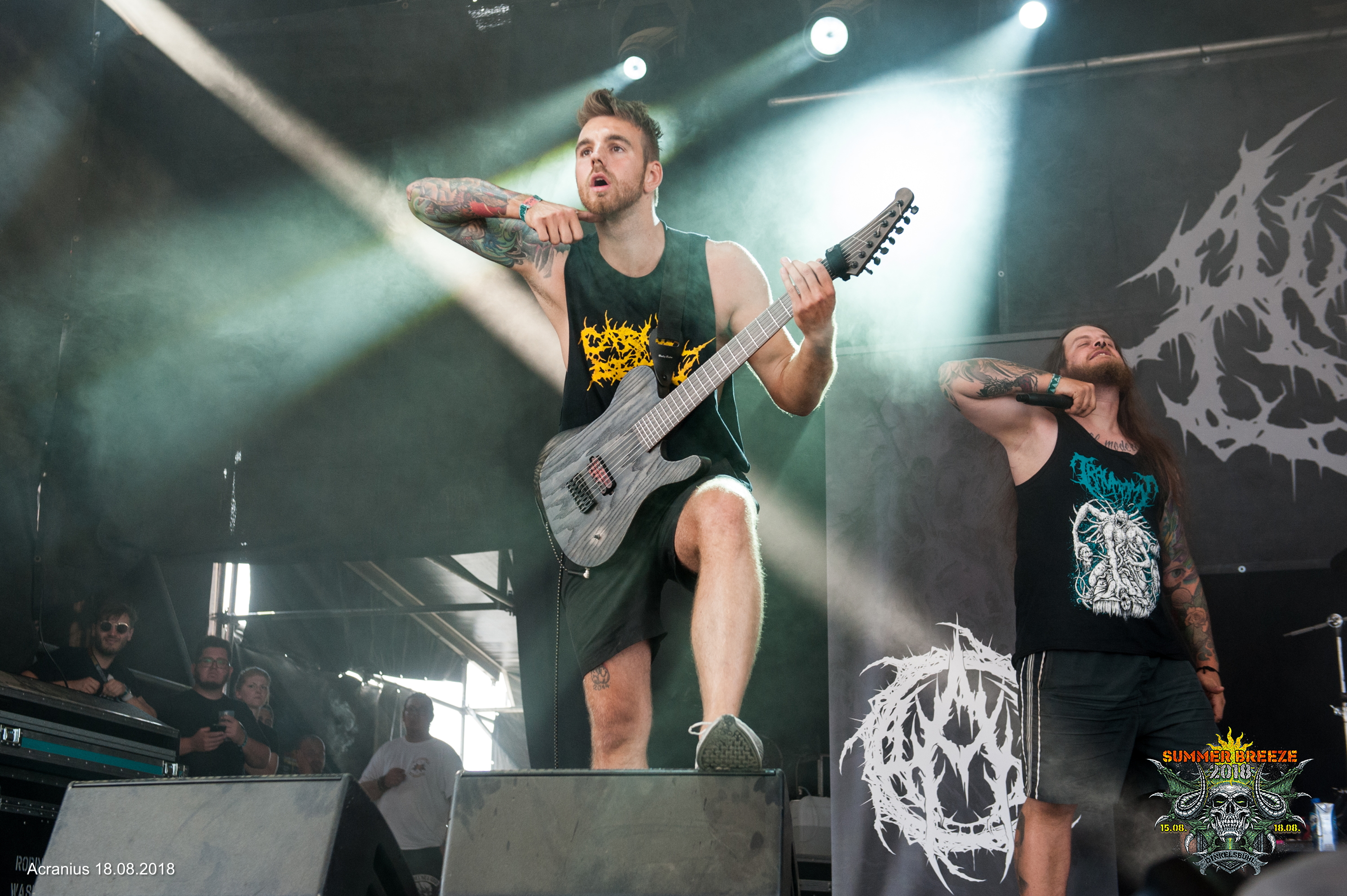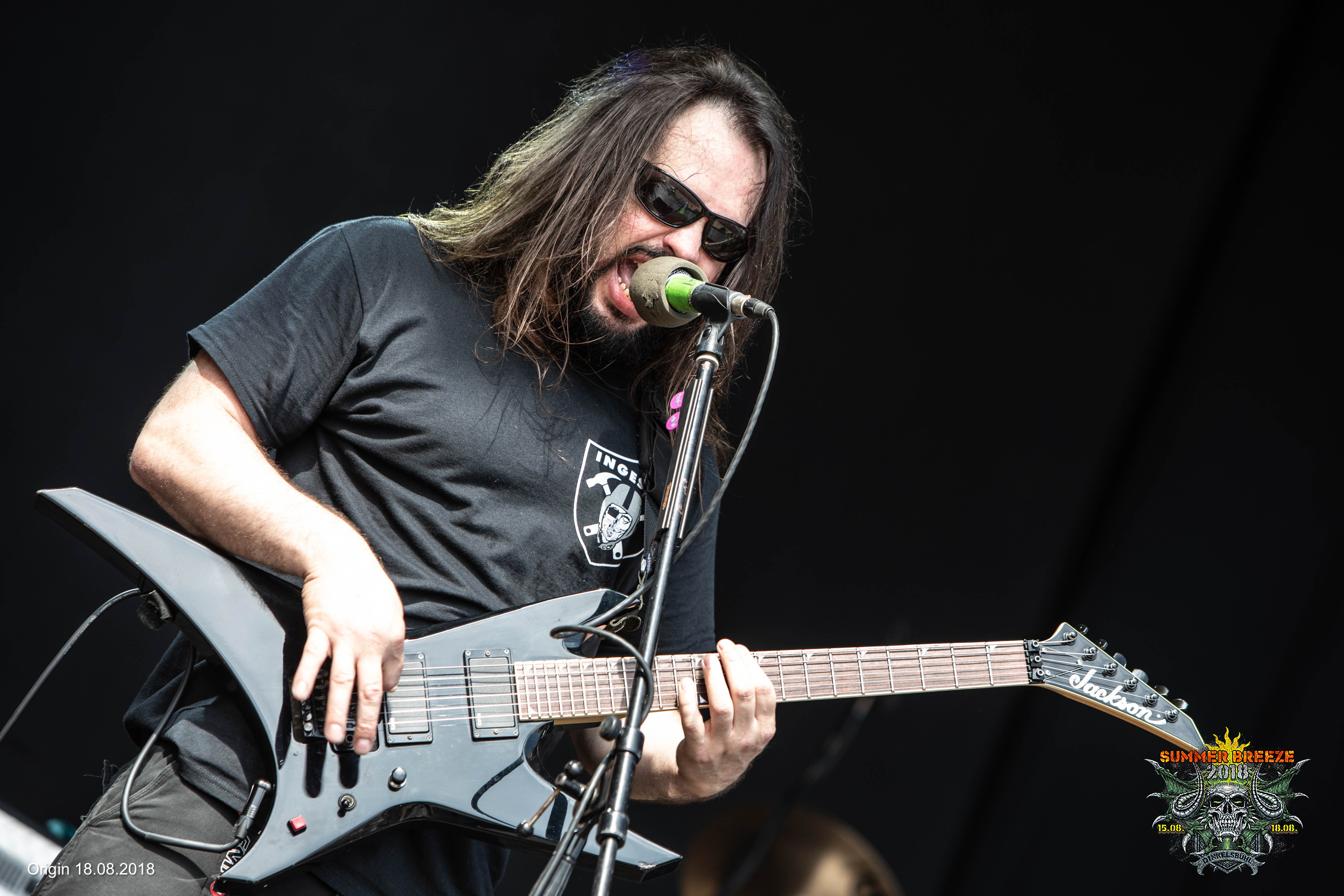 High Noon, die Sonne knallte erbarmungsls auf die T-Stage und ebenso erbarmungslos starteten die drei US-Amerikaner ORIGIN in ihr Set. Als sie 2010 zum letzten Mal auf dem SUMMER BREEZE auftraten, war der heutige Fronter Jason Keyser noch gar nicht an Bord. Der Mann ist aber ein absoluter Entertainer und vor allem mit einem mächtigen Brüllorgan gesegnet; jedenfalls war nach seinem einleitenden „Are You Awake?“ wohl auch der letzte Rest Müdigkeit bei den Anwesenden wie weggeblasen. Für reihenweise am Boden zerschellende Kinnladen war Schlagzeuger John Longstreth verantwortlich. Die menschgewordene Nähmaschine saß tiefenentspannt hinter seinem Drumkit und spielte äußerlich fast gelangweilt wirkend und ohne mit der Wimper zu zucken übermenschliche Passagen – wow! Fans der Band wird es direkt mit dem Beginn aufgefallen sein, aber Jason Keyser informierte das versammelte Volk nach ein paar Songs „Links von mir ist es etwas leer… Wir sind vor einer Woche nach Europa geflogen und die Airline hat dabei nicht nur unser Gepäck, sondern auch unseren Bassisten verloren!“ Nur mit einem Gitarristen und dem Überdrummer killte der technische Death Metal aber auch in der Triobesetzung mächtig – und für ein paar Songs holten sie sogar einen sehr engagierten Fan auf die Bühne, der sich hingebungsvoll um seinen „Luftbass“ kümmerte.