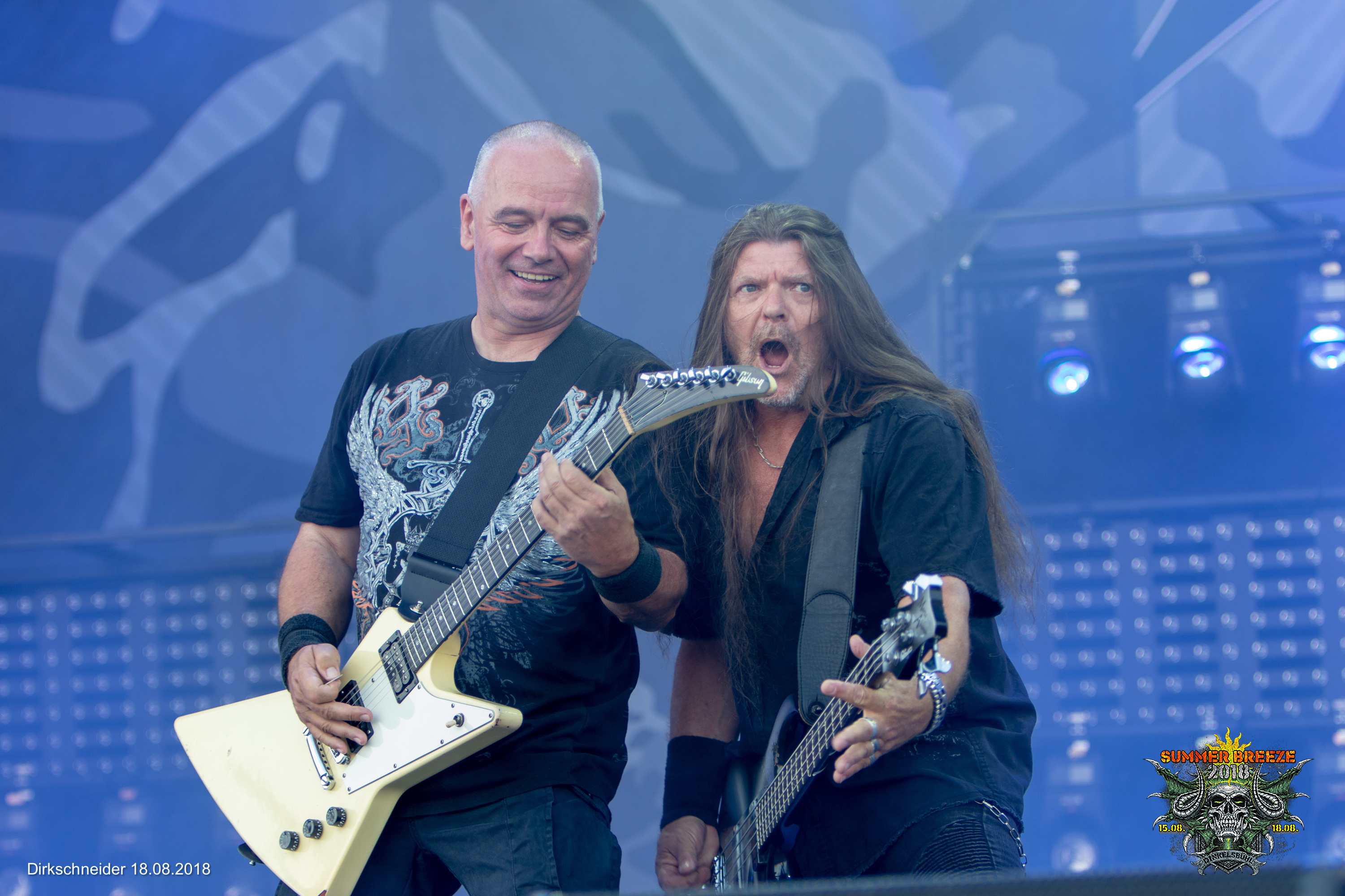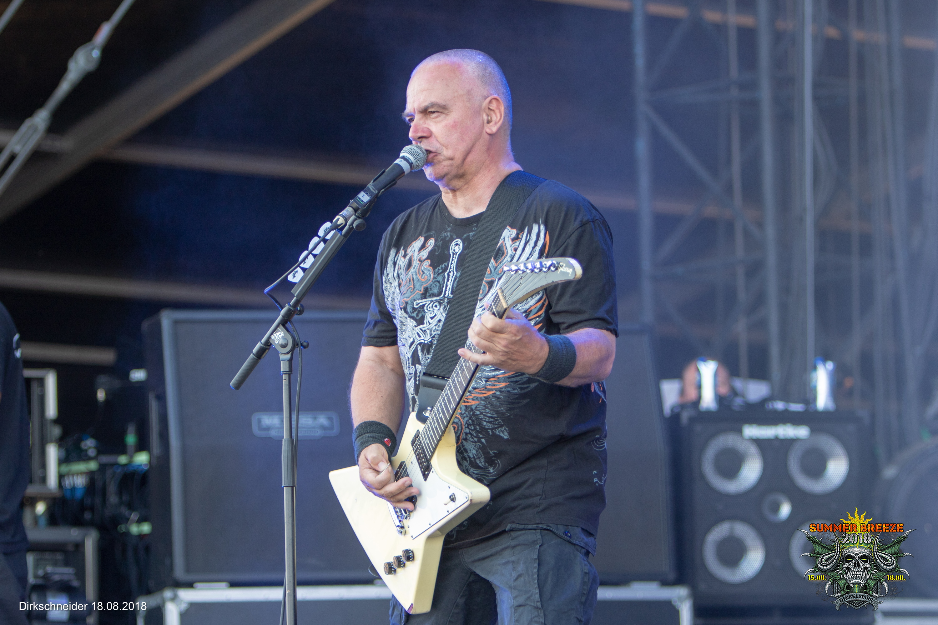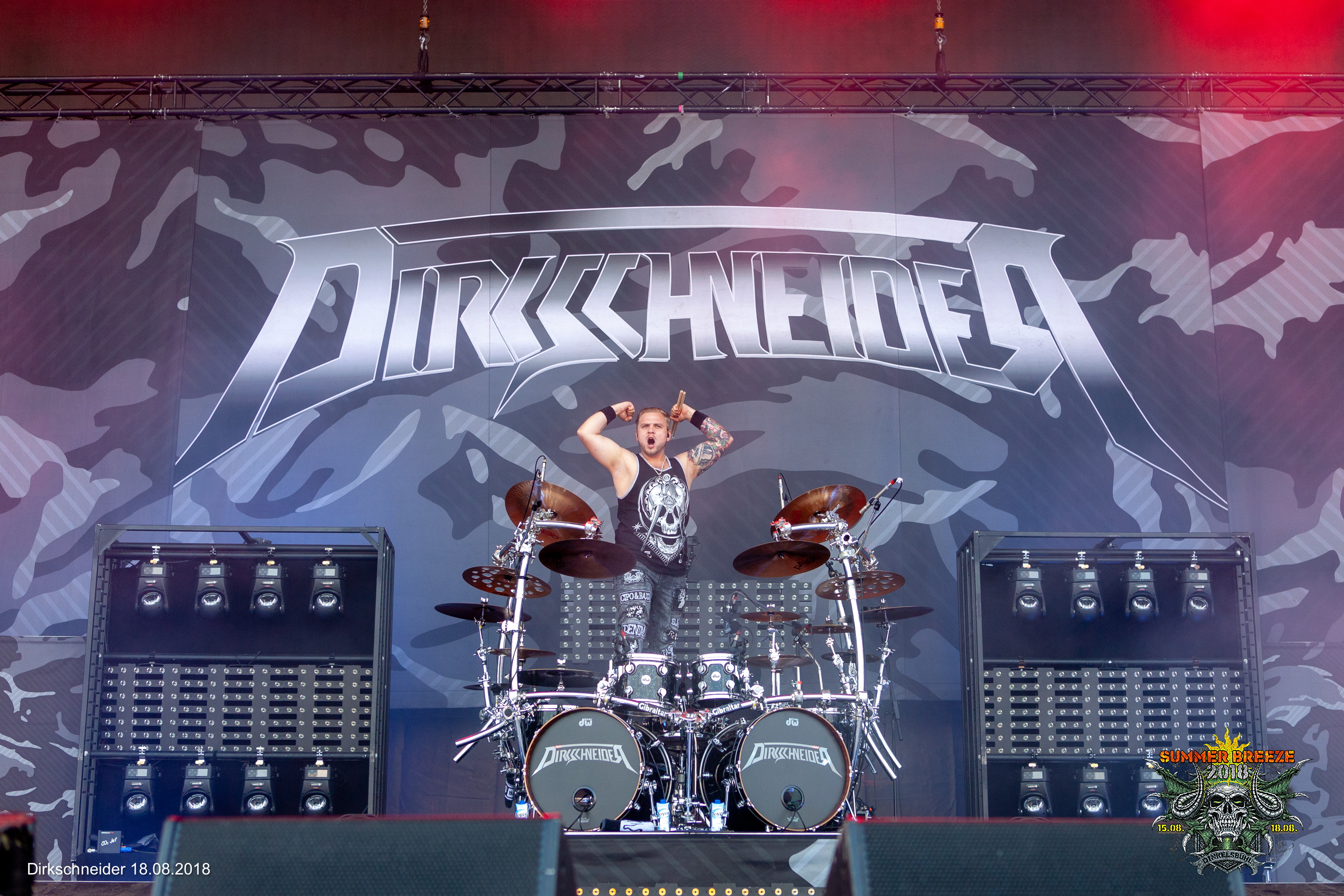 Auf der Hauptbühne gab sich als nächstes eine waschechte Metal-Legende die Ehre. Seit über zwei Jahren ist Udo jetzt schon unter dem DIRKSCHNEIDER-Banner auf Tour. Gespielt werden da ausschließlich Songs seiner ex-Band Accept. Nach dem Ende der „Back To The Roots“-Konzertreise wird er das nie wieder machen. Da war es Ehrensache, dass er mit diesem Programm beim SUMMER BREEZE vorbeischaute. „Metal Heart“ war dann auch gleich ein Einstand nach Maß. Sein Set mit einem solchen Klassiker zu eröffnen, zeugt von großem Selbstbewusstsein. Die hohen Schreie saßen bei Udo immer noch gut. Derweil gab Gitarrist Andrey Smirnov den Wolf-Hoffmann-Ersatz und schlug sich dabei richtig gut. Von klassisch angehauchten Licks bis hin zu virtuosen Läufen, rief er die gesamte Bandbreite des Acceptschen Gitarrenspiels ab. Im Mittelteil von „Princess Of The Dawn“ macht er allerdings Platz für das Publikum, welches die ikonische Melodie lauthals vorsang. Auf DIRKSCHNEIDERs „Seid ihr noch gut drauf?“ gab es eine klar positive Antwort und schon ging es mit „Screaming For A Love Bite“ weiter. Obwohl die großen Accept-Hits im Vordergrund standen, streuten DIRKSCHNEIDER immer wieder coole Songs aus der zweiten Reihe ein. Auch einen kleinen Spaß ließ sich der Meister nicht nehmen. „Für den nächsten Song gehen wir zurück ins Jahr 1979. Ich weiß, da waren die meisten von euch noch flüssig. Aber ich hoffe, ihr kennt den trotzdem.“ Eine eher rhetorische Frage. Schließlich war das folgende „I’m A Rebel“ der erste große Szene-Hit für Udo und Accept. Danach verließen DIRKSCHNEIDER die Bühne, kamen den „Zugabe“-Forderungen aber schnell nach. „Heidi, Heido, Heida“ ließ Udo das Festival singen. Natürlich konnte es jetzt nur mit „Fast As A Shark“ auf die Kauleiste geben. „Balls To The Wall“ setzte danach einen eindrucksvollen Schlusspunkt unter eine tolle Show.