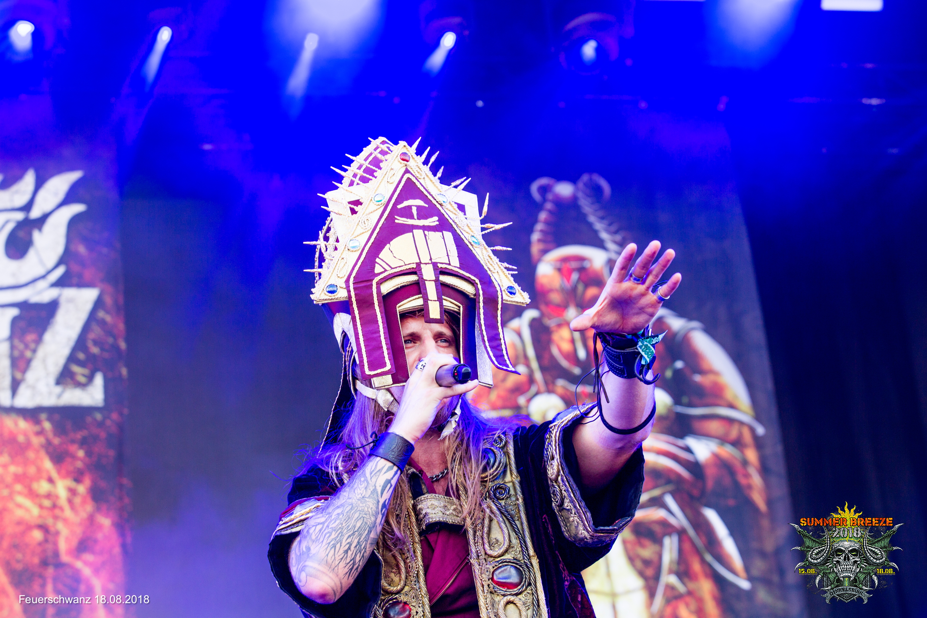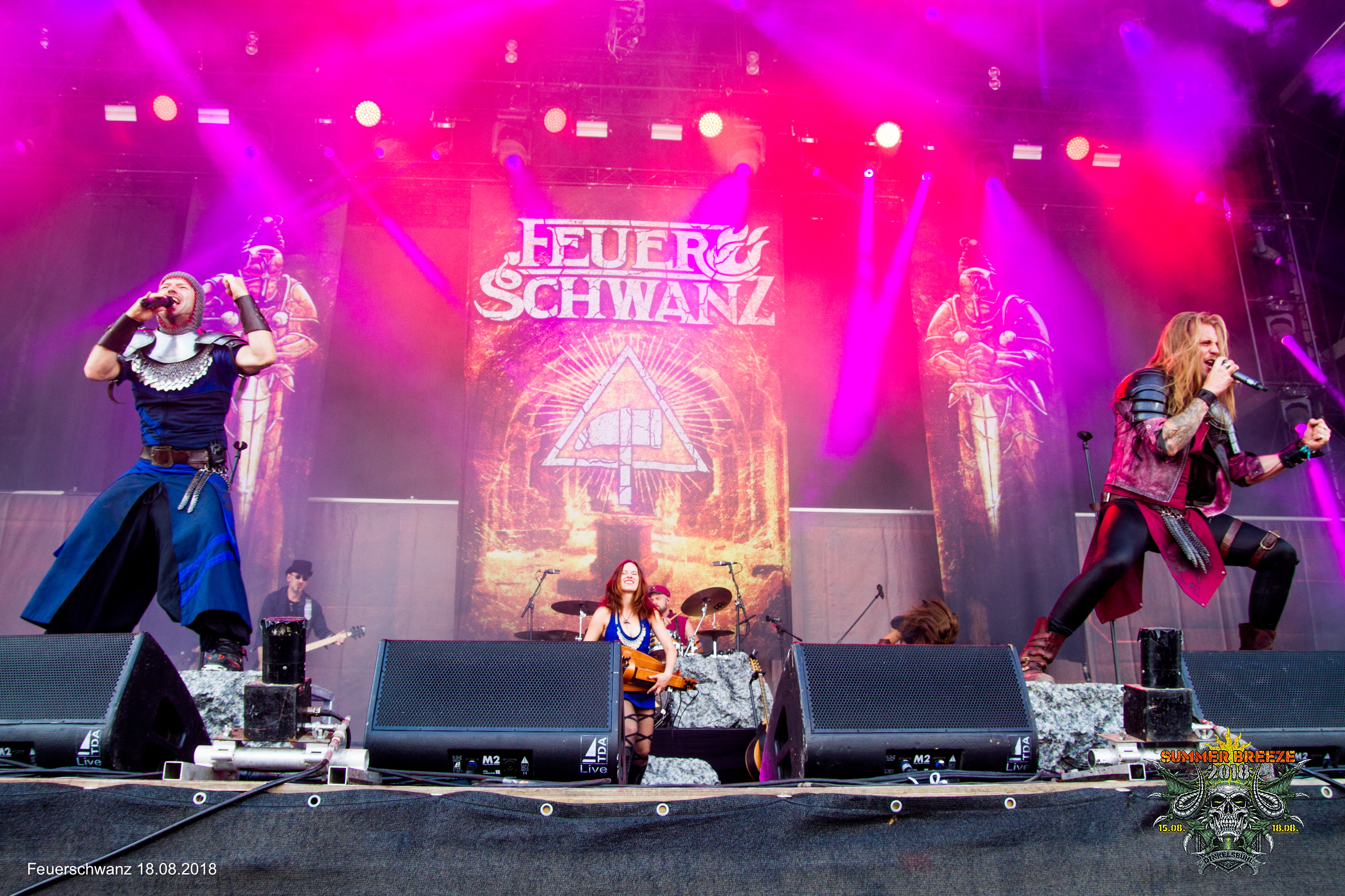 Vor den Bühnen versammelte sich nun ein bunter Haufen an Festivalbesuchern auf der Suche nach metgeschwängertem Spaß. Da konnten FEUERSCHWANZ mit ihren alkoholgetränkten Schunkelhymnen mühelos punkten und riefen nach dem „Ding Dong, die Hex‘ ist tot“-Intro zur „Hexenjagd“ auf. Obwohl ihre Texte immer hart an der Fremdscham-Grenze entlang manövrierten, boten die Songs doch allesamt mitsingtaugliches Hymnen-Potential und wurden dementsprechend gut vom Publikum aufgenommen. Dem Aufruf zum „Schubsetanz“ kamen die Fans bereitwillig nach, bevor im Titeltrack des aktuellen Albums ausgiebig dem „Methämmer“ gehuldigt wurde. Das neue Material wurde kaum weniger begeistert aufgenommen wie Klassiker vom Schlage eines „Metnotstand im Märchenland“. Das Grinsen blieb den Mannen und Miezen um Hauptmann Feuerschwanz, Johanna von der Vögelweide und Prinz Hodenherz daher auch über die gesamte einstündige Spielzeit hinweg in die Gesichter gemeißelt und verließ diese auch nicht, als sich ihnen auf die Aufforderung zum kollektiven T-Shirt-Propeller hin die entblößten Oberkörper ihrer Anhängerschaft neckisch entgegenreckten. Doch anstatt nun dem kollektiven Nudismus zu frönen, packten FEUERSCHWANZ am Ende ihres Gigs lieber die T-Shirt-Kanone aus und feuerten eine Handvoll neuer Kleidungsstücke in die Menge.