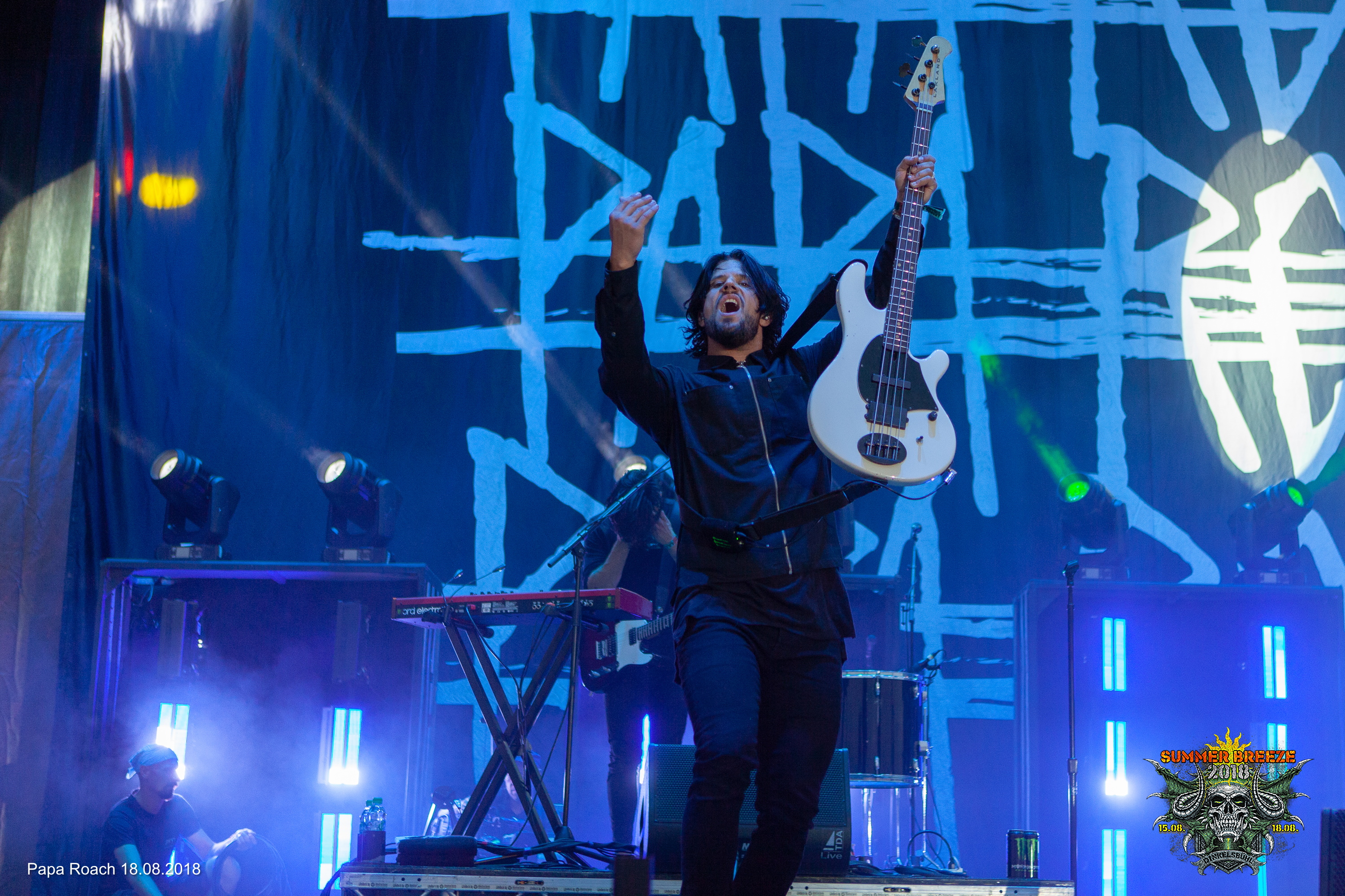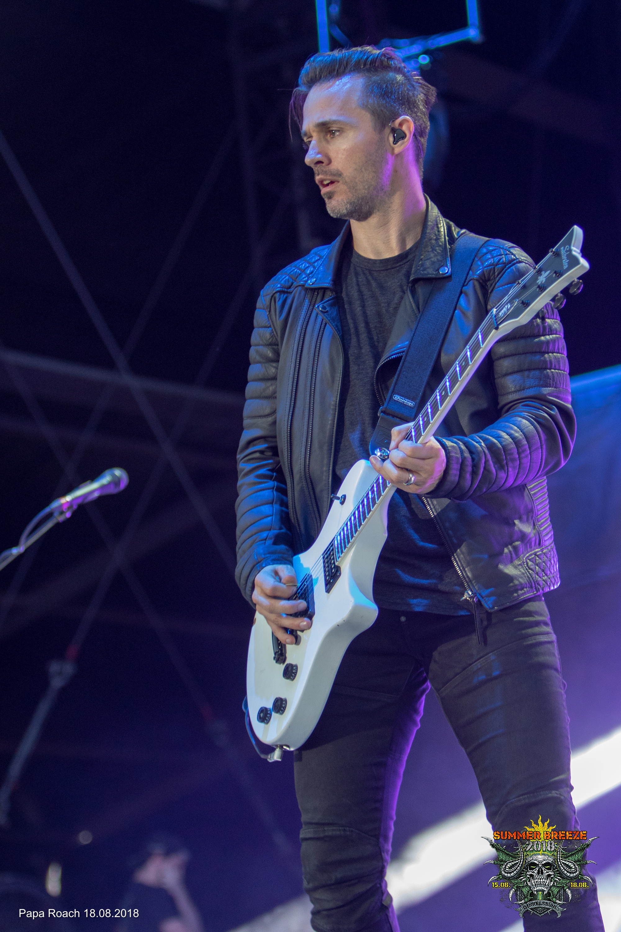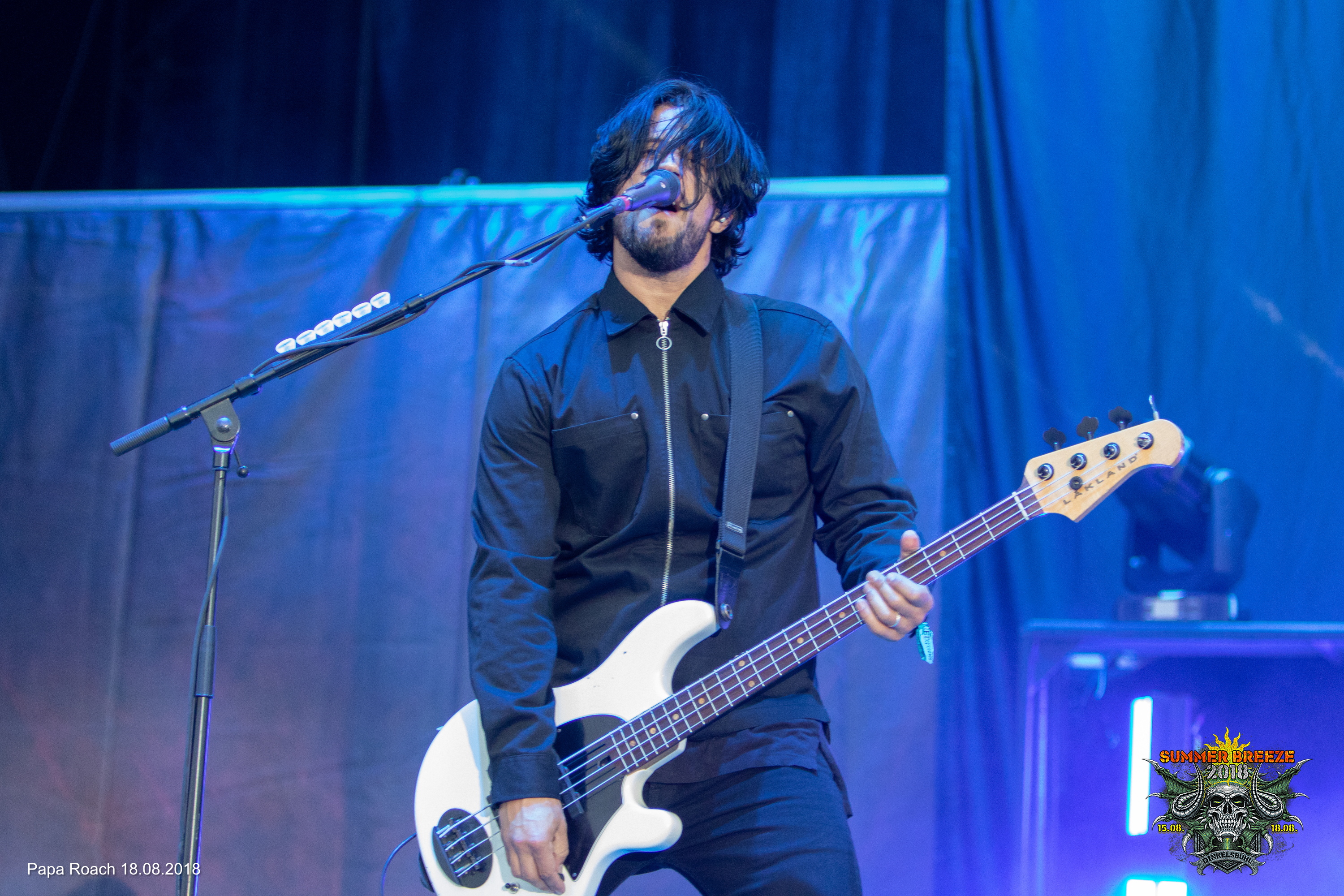 “Fuck PAPA ROACH!” – Eine elektronische Frauenstimme forderte alle Zuschauer diesen Slogan zu skandieren und dabei alle Mittelfinger zu heben. Als die Band wenig später die Bühne enterte sah sie also ein Meer von Mittelfingern und das Energielevel war vom Start weg ganz weit oben. Die bekannte vierköpfige Bandbesetzung wurde in der Livesituation noch durch einen weiteren Gitarristen ergänzt, der zudem bei vielen Songs Keyboard spielte und auch zwei Standtoms auf seinem Podest hatte, die er sehr effektiv einsetzte. PAPA ROACH hatten viel vor – für ihr SUMMER BREEZE-Debut hatten sie satte 18 Songs auf dem Zettel. Vereinzelt spickten sie ihr Set zusätzlich noch mit angespielten Covern wie “Lose Youself“ von Eminem oder Linkin Parks “In The End“. Apropos Linkin Park: Sänger Jacoby Shaddix aka. Coby Dick nutzte die Gunst der Stunde und erinnerte an den verstorbenen Linkin Park-Frontmann Chester Bennington. Seine ganz persönlichen Erfahrungen in Punkto Alkoholabhängigkeit und Depressionen machte er dabei ebenfalls publik. Die Menge zu seinen Füßen liebte ihn dafür nur umso mehr. Denn was gibt es schöneres als große Musiker, die sich ein hohes Maß an Menschlichkeit und vor allem Aufgeschlossenheit bewahren? Auch nach 25 Jahren Bandgeschichte bedankten sich PAPA ROACH für die rege Anteilnahme und die nicht zu überhörende Textsicherheit ihrer treuen Gefolgschaft und überhäuften ihre Fans vor, während und nach den Songs regelrecht mit lieben Worten. Wenn man den Worten von Shaddix glaubt, lebt er jeden seiner Auftritte als wäre es sein letzter und das stellte er auch bis zum Ende der Show eindrucksvoll unter Beweis. Die Crowd nahm dies auch ihrerseits sichtlich erfreut an – ein Meer aus dicht an dicht springenden Menschen tobte zum Abschluss vor der Stage – Minutenlang ertönten “Last Resort“-Rufe, bevor zur Krönung endlich der Song kam, den wirklich ausnahmslos alle kennen: Ein “Cut my life into pieces!“ – und es gab kein Halten mehr. Das Publikum schrie den Rest der Lines heraus und bot damit sicherlich auch der Band ein unvergessliches Erlebnis.