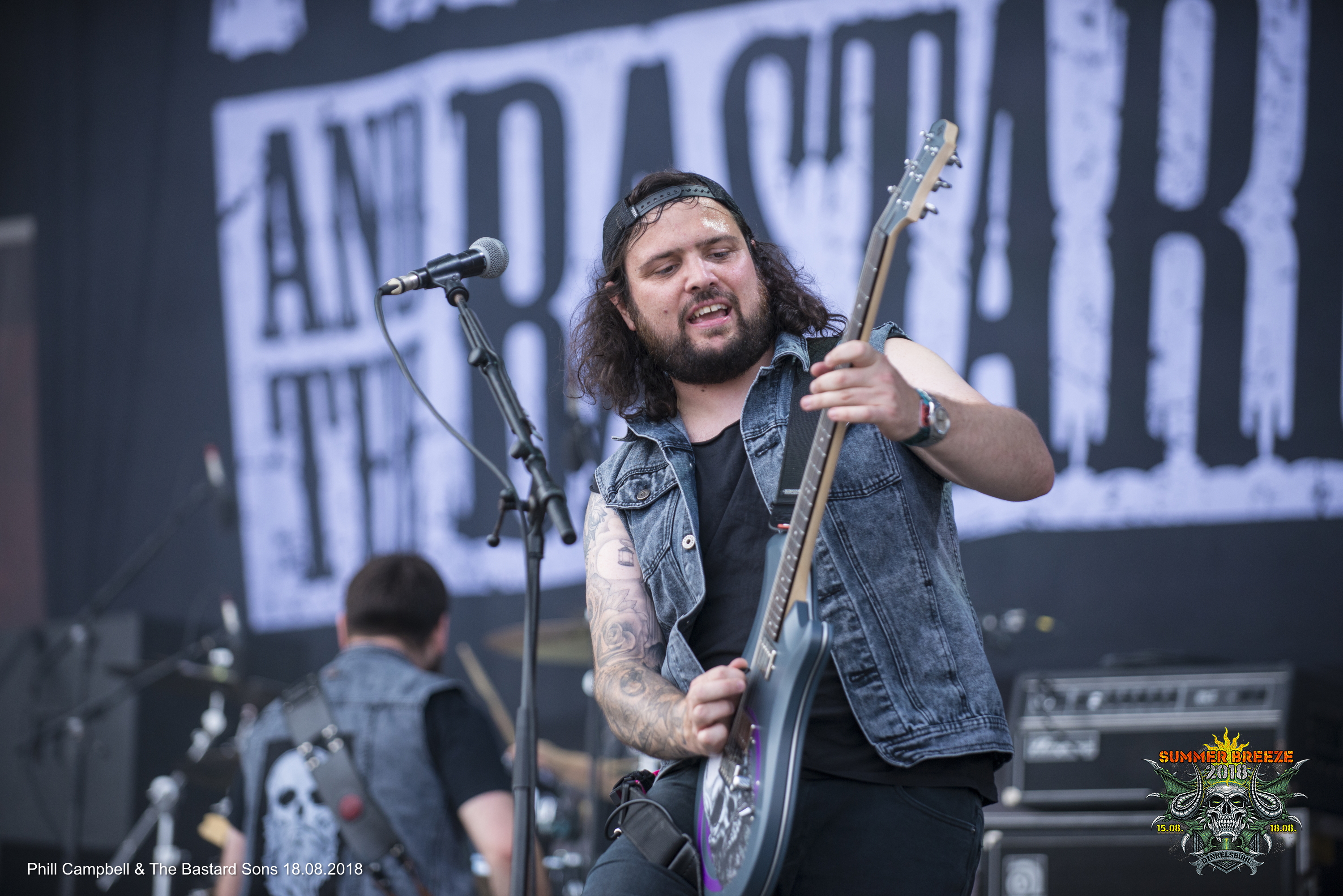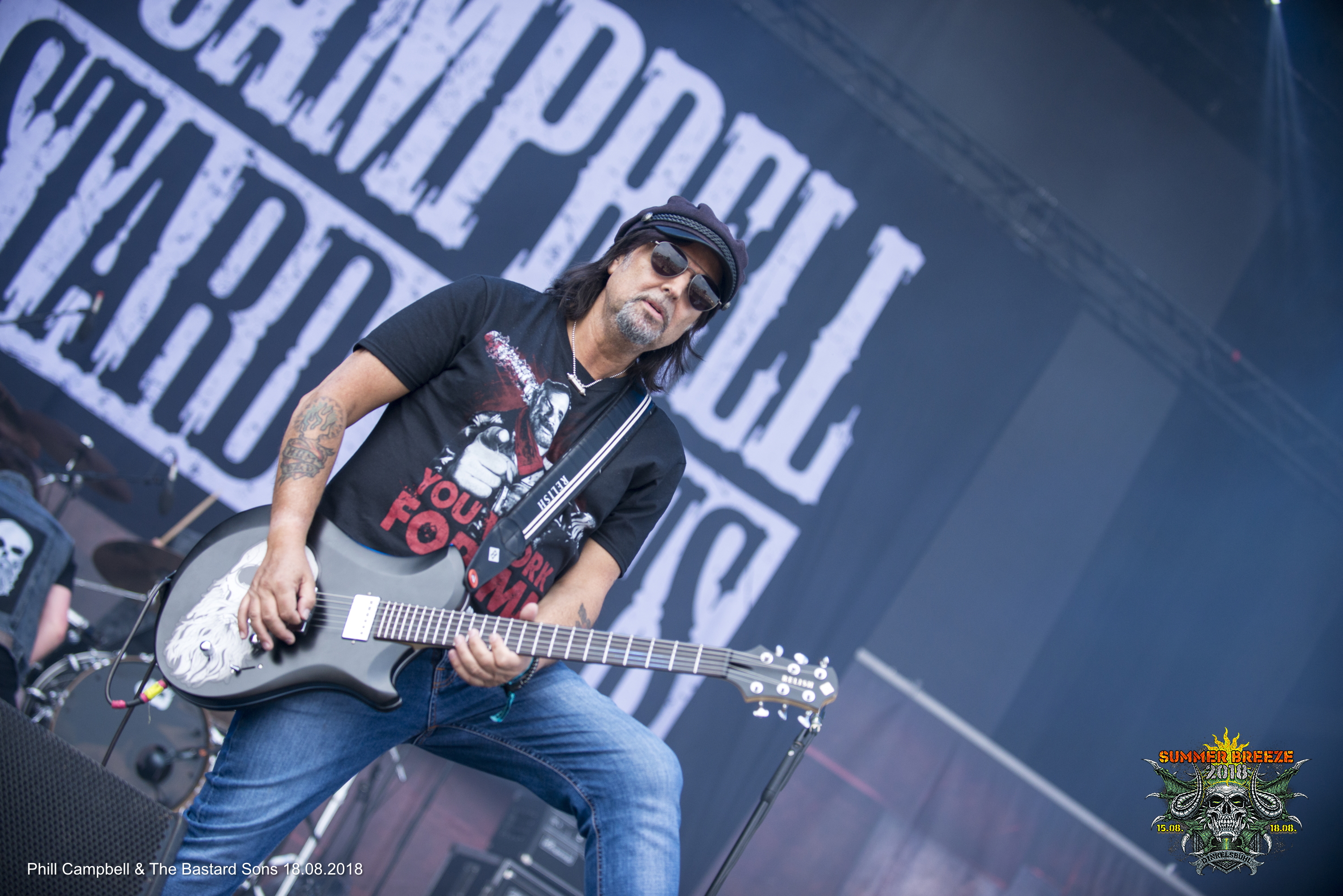 Erst Deep Purples „Highway Star“ und anschließend noch das Main Theme aus Monty Pythons „Ritter der Kokosnuss“. Das ausgiebige Intro versprach großes, als PHIL CAMPBELL AND THE BASTARD SONS die Bühne betraten. Der ehemalige Motörhead-Gitarrist und seine Jungs ließen sich auch nicht lange bitten, sondern legten mit „Big Mouth“ und „Welcome To Hell“ energiegeladen los. Danach folgten gleich zwei Motörhead-Songs, was die Stimmung im Publikum ordentlich zum Brodeln brachte. Doch nicht nur Material von Campbells ex-Band kam zum Zuge. Auch der Klassiker „Silver Machine“ von Lemmys erster Combo Hawkwind wurde als Tribut an alle verstorbenen Motörhead-Mitglieder gespielt. Damit der Auftritt überhaupt möglich war, mussten sich PHIL CAMPBELL AND THE BASTARD SONS allerdings den Bass von FRACTURED INSANITY ausleihen. Die British Airways hatten den bandeigenen Viersaiter nämlich leider verlegt. Sänger Neil Starr bat das Publikum darum, einmal den Mittelfinger Richtung Handykamera auszustrecken und „Fuck British Airways“ zu skandieren. Die Fans kamen dem gerne nach. Unangefochtener Höhepunkt der Show war selbstverständlich „Ace Of Spades“. Da konnte sich auch so mancher Security-Mann eine kleine Handyaufnahme nicht verkneifen.