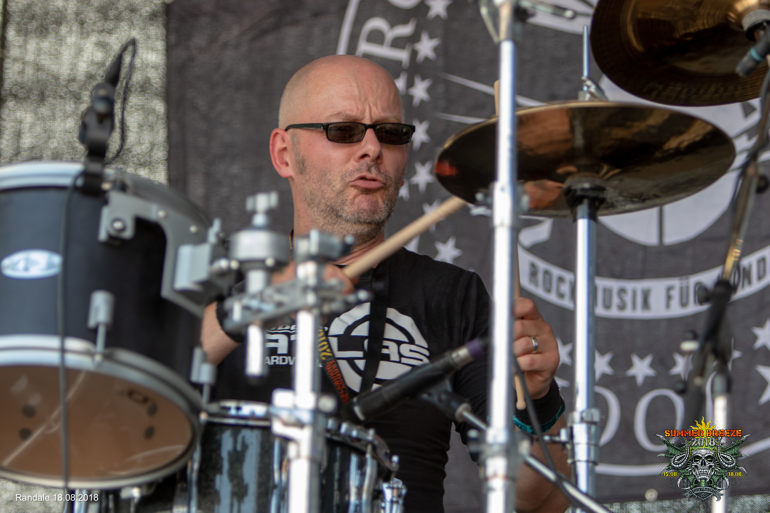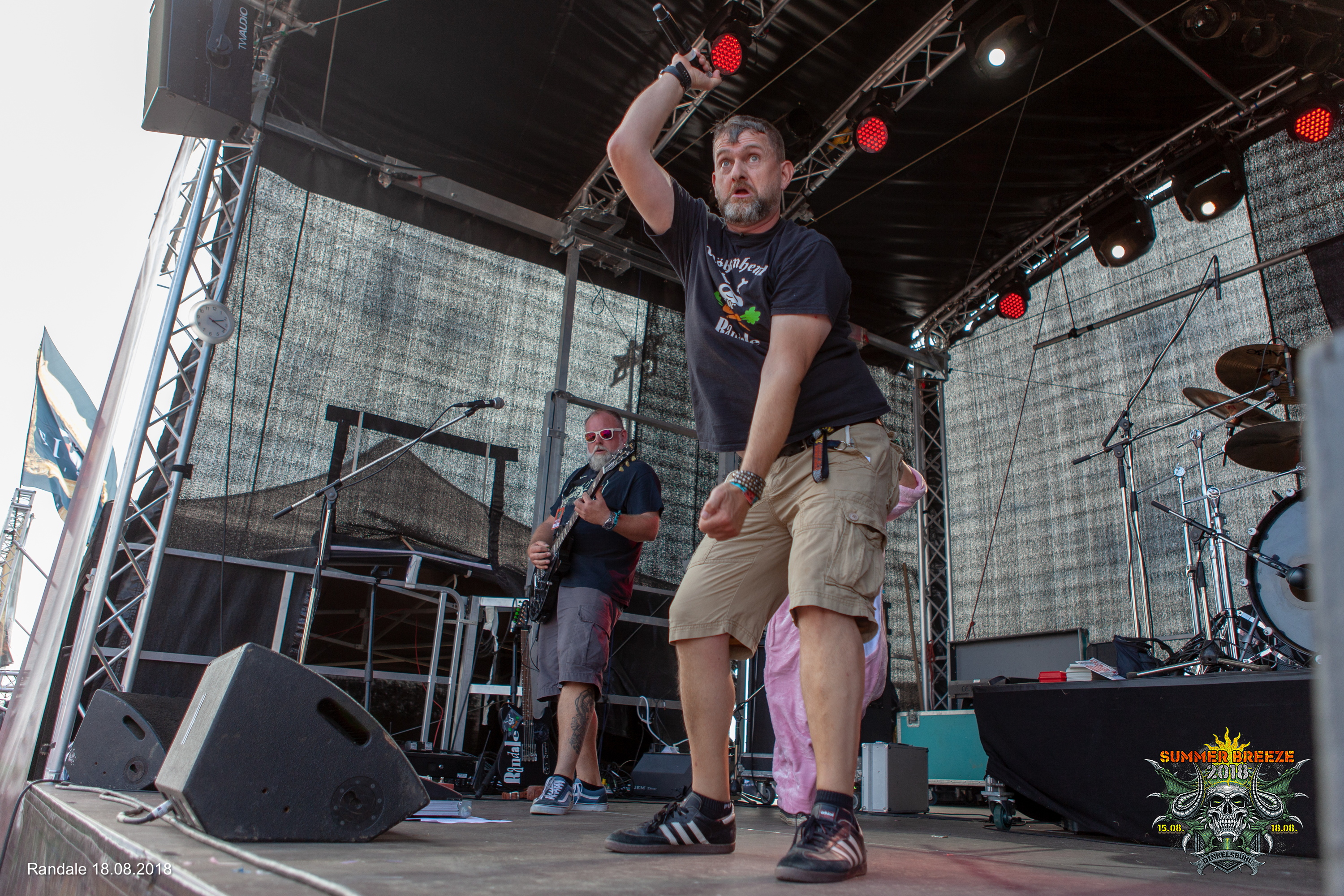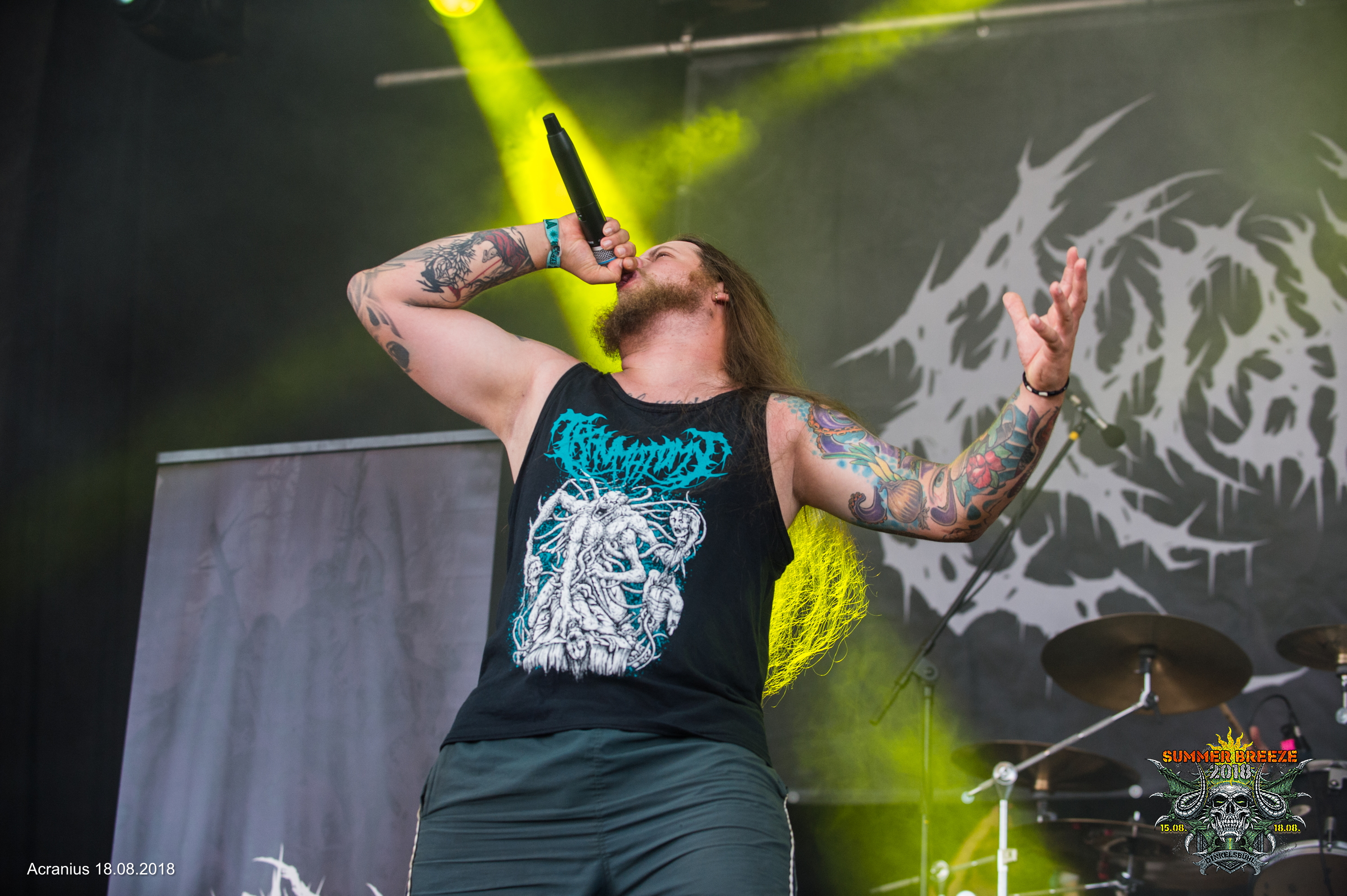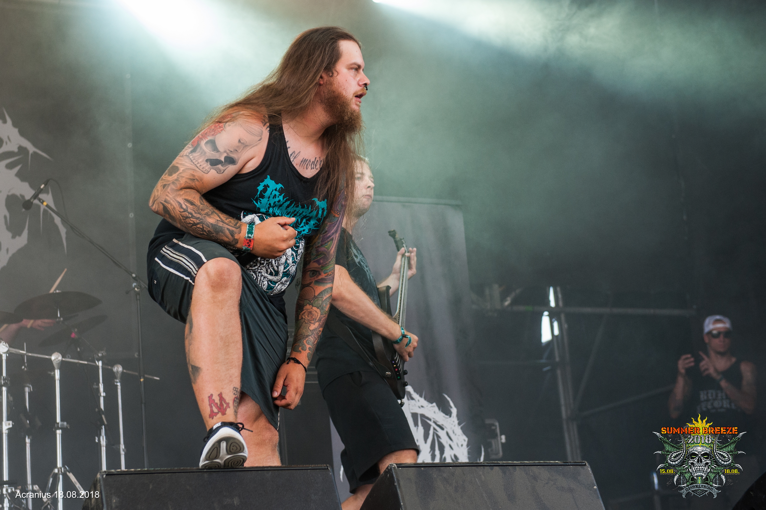 Brutal wurde es mit ACRANIUS auf der Camel Stage. Die Truppe aus Rostock schweifte schon fast in Grindcore-Gefilde ab und begeisterte daher vor allem diejenigen, die sich gerne die volle Breitseite geben. Vocals im Corpsegrinder-Stil und drumlastiges Gebolze animierten das Publikum zum Moshen, was vor der überdachten Bühne, die vom Regen am Vortag nicht sehr viel abbekommen hatte, direkt wieder zu Staubentwicklung führte. Nach einem Shoutout an NECROTTED spielten ACRANIUS „Kingmaker“ von ihrem Album „Reign Of Terror“. Synchron wurden hierzu auf und vor der Bühne die Mähnen geschwungen. Sänger Björn Frommberger gesellte sich wenig später zu den Zuschauern und gab den Fans in den ersten Reihen, die ihm schon zuvor die Lyrics entgegengeschrien hatten, noch mal einen extra Kick. Dass die Chemie zwischen Band und Besuchern stimmte, ließ sich allgemein an den Reaktionen beider Seiten ablesen. So dürften auch nach den nur 30 Minuten Spielzeit alle reichlich fertig gewesen sein.