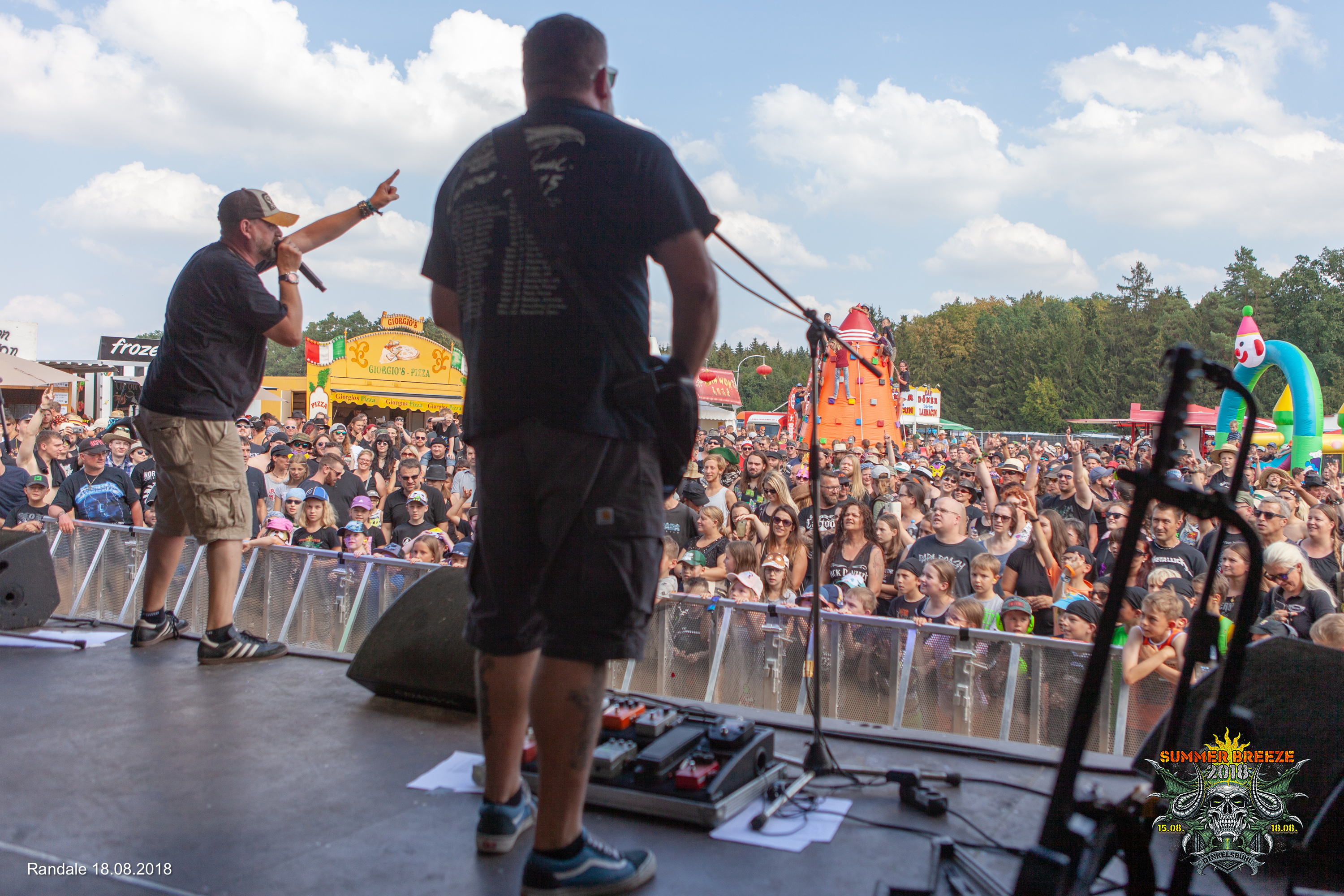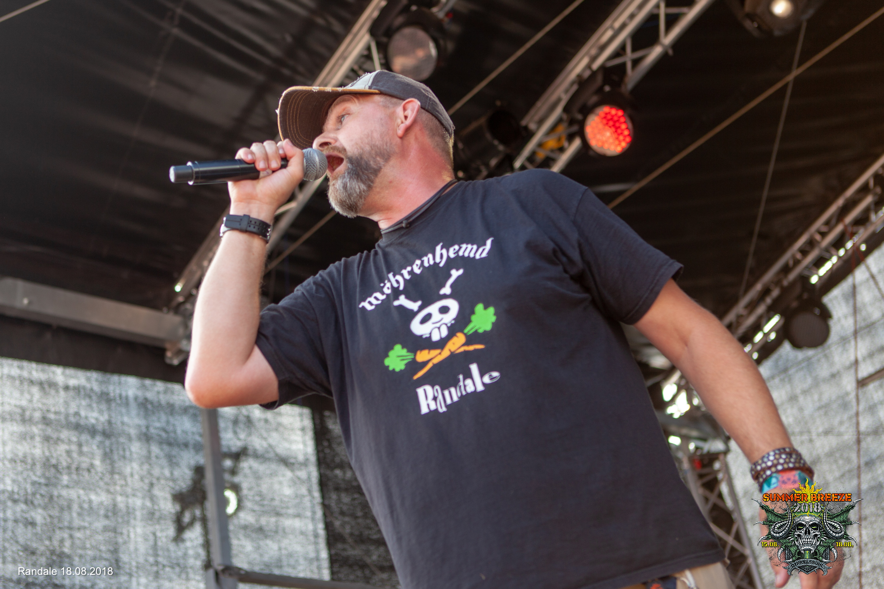 Fast schon zu einer Tradition sind in den letzten Jahren die Auftritte von RANDALE geworden. Die Bielefelder Band begeistert besonders die ganz kleinen Zuhörer und so ist auch ihre diesjährige Show kostenlos für alle Kinder der Region – samt ihrer erwachsenen Begleiter und unabhängig vom Festivalbesuch. Und man sah auch wieder massig textsichere Erwachsene ohne Kinderbegleitung in der Menge! Der Platz vor der Bühne hatte sich dank mehrerer Hüpfburgen erneut verändert und auch der Name der Bühne wurde – aus Gründen – kindgerechter gestaltet – auch wenn am benachbarten Partyschnaps-Stand natürlich noch riesige entsprechende Banner prangten. Frontsympath Jochen Vahle hatte den proppenvollen Platz vor der Bühne schon nach den ersten Takten des eröffnenden „Randale Rock n Roll“ fest im Griff und in der Folge fraßen ihm alle willig aus der Hand – egal ob jung oder alt! Wechselseitige Mitsing-Spielchen gelangen ebenso mühelos wie beispielsweise die wohl längste Polonaise des Festivals bei „Omma Oppa“, die der Sänger höchstselbst mit seinem Motorradlenker-Mikrohalter anführte. Und mit „Commando Ampel“ und „Polizei“ gabs sogar zwei neue Lieder als Weltpremiere! Ein klarer Start-Ziel-Sieg für RANDALE!