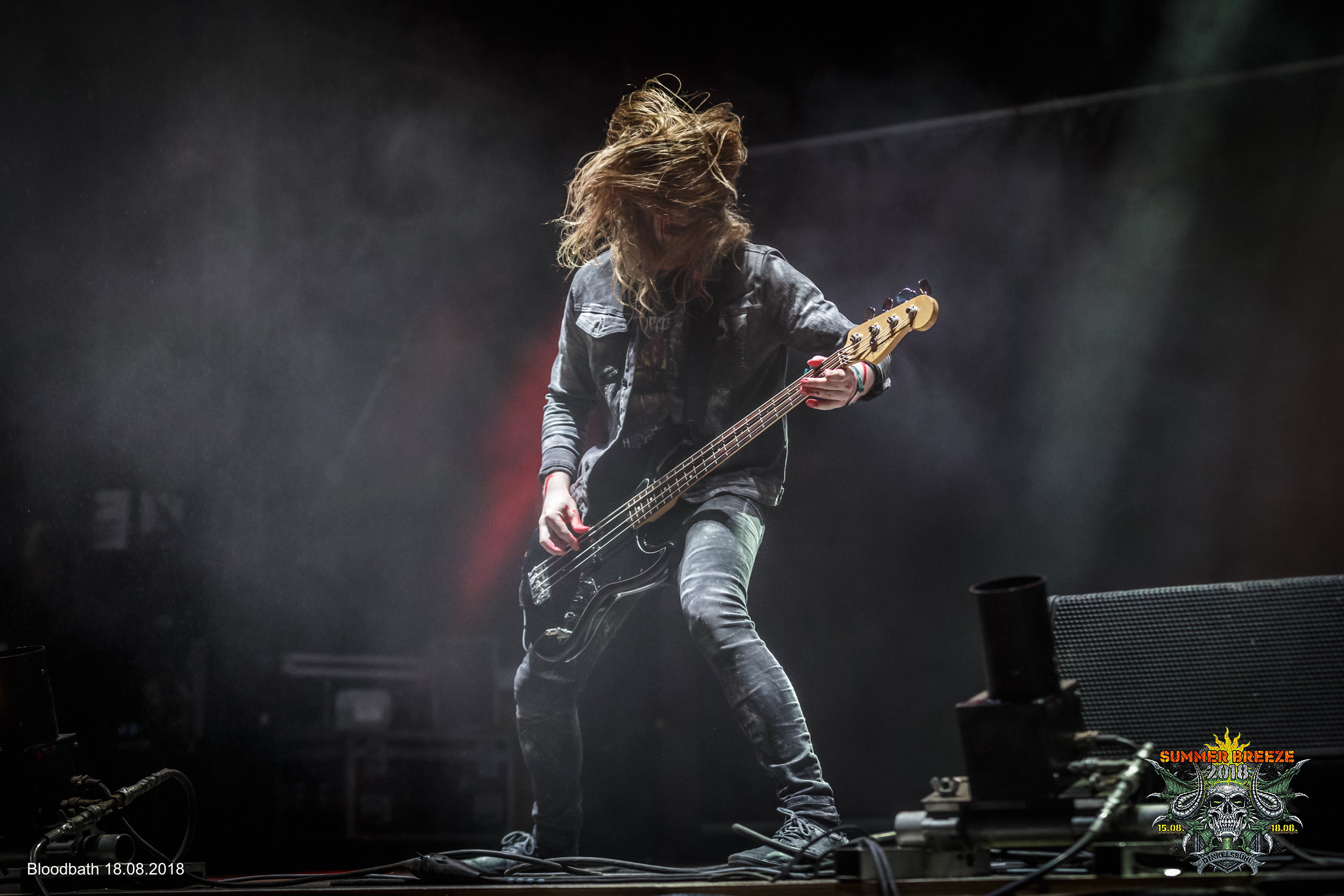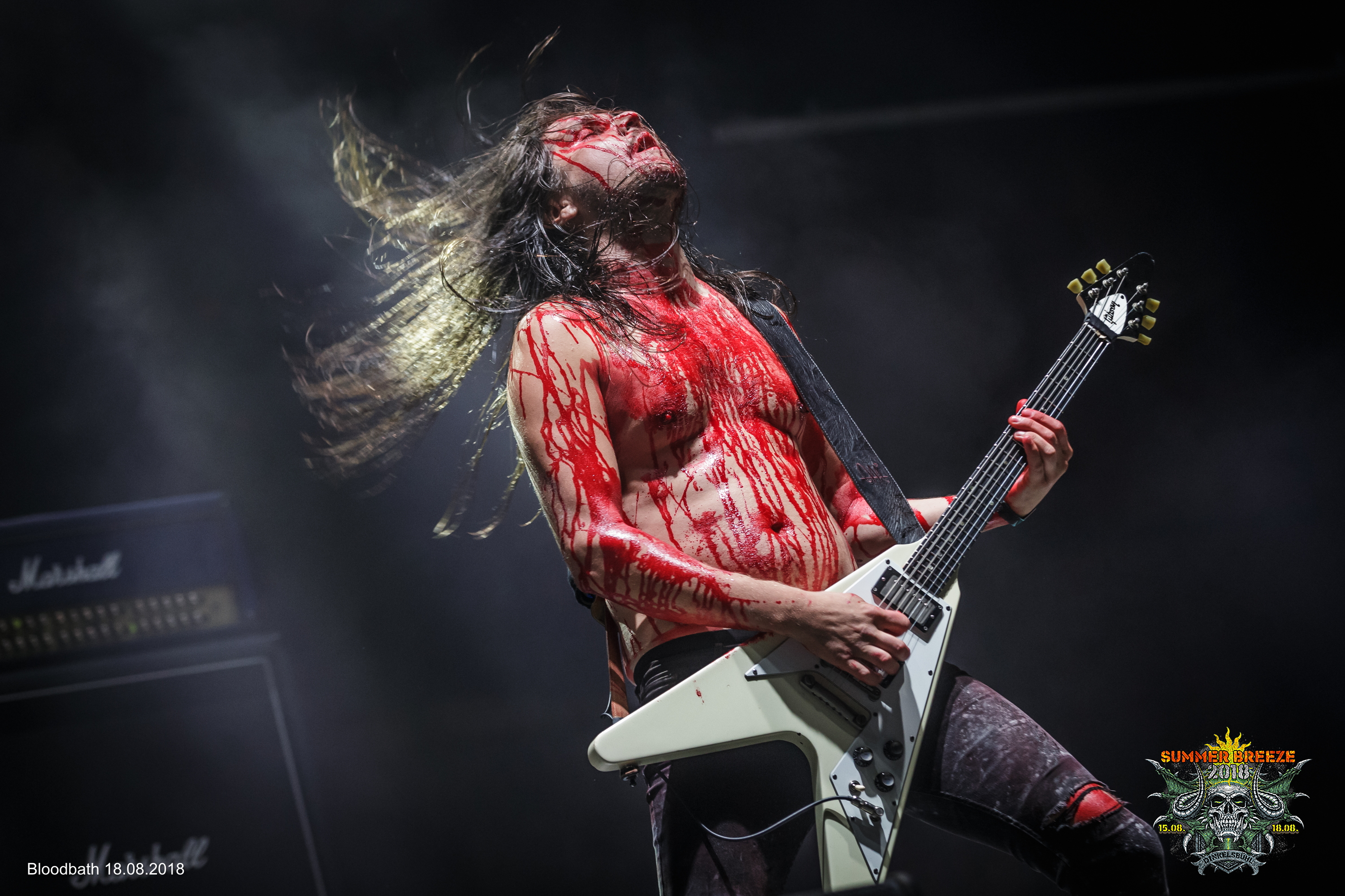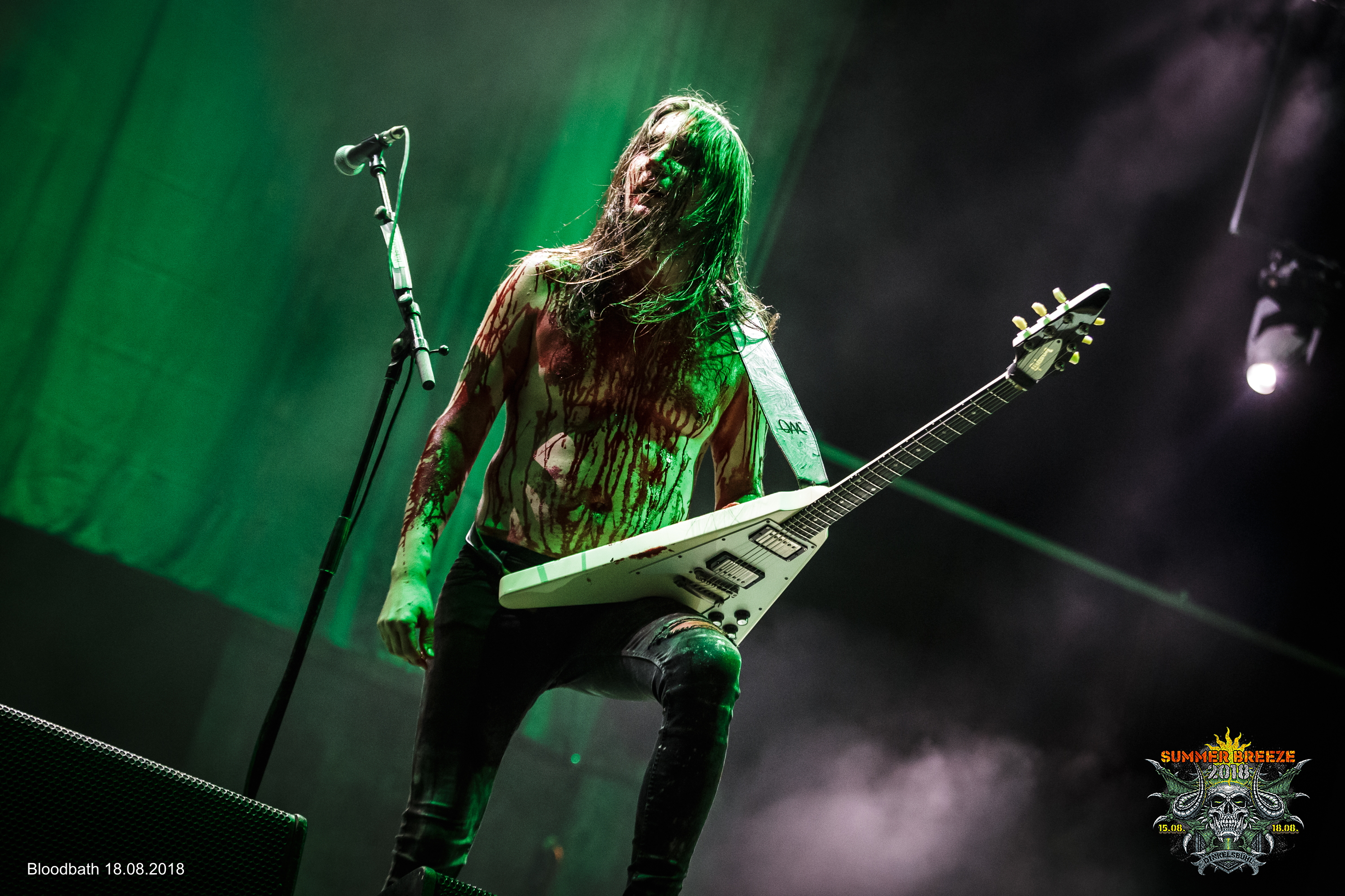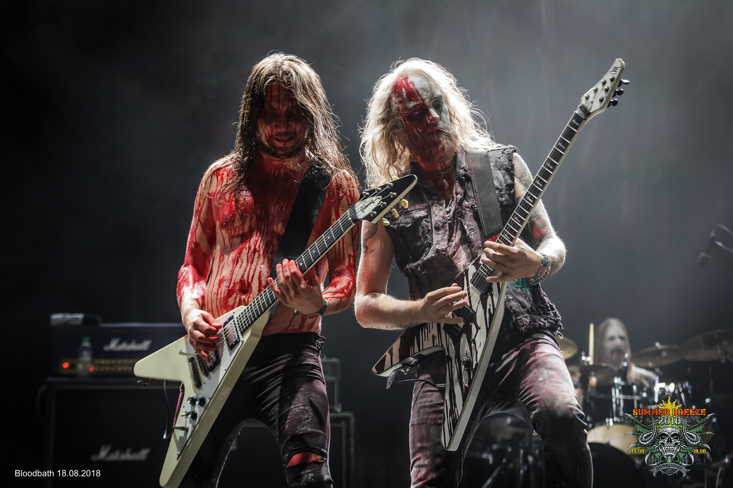 Als BLOODBATH vor drei Jahren das erste und bisher einzige Mal das SUMMER BREEZE beehrt haben, traten sie noch auf der Pain Stage auf. Heute ist die kleinere der damaligen beiden Hauptbühnen Geschichte und auch bei BLOODBATH hat sich in der Zwischenzeit einiges getan. Per „Sodomizer“ Eriksson ist mittlerweile ausgestiegen, für ihn badet ab sofort Joakim Karlsson im Blut, seines Zeichens Gitarrist der schwedischen Black Metaller CRAFT, auch schon beim anstehenden, neuen Album „The Arrow Of Satan Is Drawn“ an Bord, heute aber noch nicht mit im Tross. Bis auf Nick Holmes bleiben BLOODBATH also eine rein schwedische Angelegenheit. Nicht verändert hat sich hingegen das Versprechen, bei einer BLOODBATH-Show Death Metal par excellence serviert zu bekommen. Als um zwanzig vor Zwölf die Lichter ausgingen und die Bühne in blutrotes Licht getaucht wurde, war das abermals der Auftakt zu einer wahren Demonstration düstersten Todesbleis. Im Vergleich zum Auftritt 2015 fanden nur zehn statt dreizehn Songs ihren Weg auf die Setlist und leider bot das Quintett auch keinen neuen Track des anstehenden Albums auf. Die die gesamte Diskographie umspannende Auswahl enthielt dennoch nur Hits, welche dreckig und absolut brutal in hämmerndem HM-2-Sound in die Nacht geballert wurden. Im mittlerweile klassischen Kunstblut-Corpsepaint und mit einem noch etwas kalkweißer als sonst geschminkten Nick Holmes zeigten BLOODBTAH den zu später Stunde doch noch zahlreich angetretenen Anwesenden, dass sie auf der Hauptbühne zu Recht so hoch im Billing standen: ein kurzer Wink mit der Hand und schon ging der Circle Pit bei „So You Die“ los. Ansonsten hieß es aber natürlich eher Mattenschwingen und Hörner in die Luft, immerhin sprechen wir ja hier von Old School Death Metal! Falls es BLOODBATH übrigens mit einer Karriere als regelmäßig aktive und nicht nur als All-Star-Band Ernst sein sollte (und danach sieht es momentan mehr und mehr aus): Das BLOODBATH-Merch war bereits am Donnerstag 2 Tage vor dem eigentlichen Auftritt ausverkauft. Und das mit Recht. Erneut ein imposant starker Auftritt!