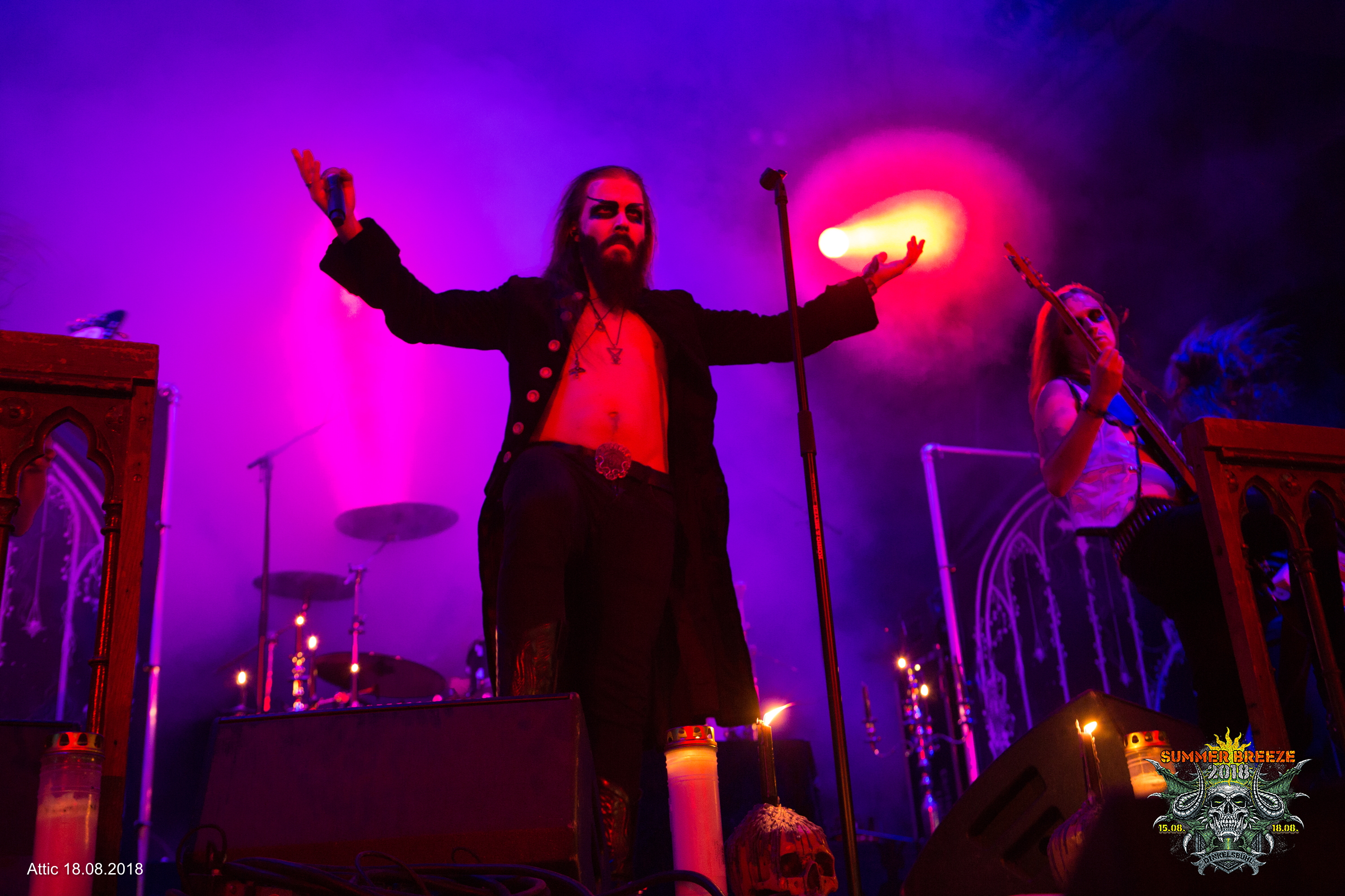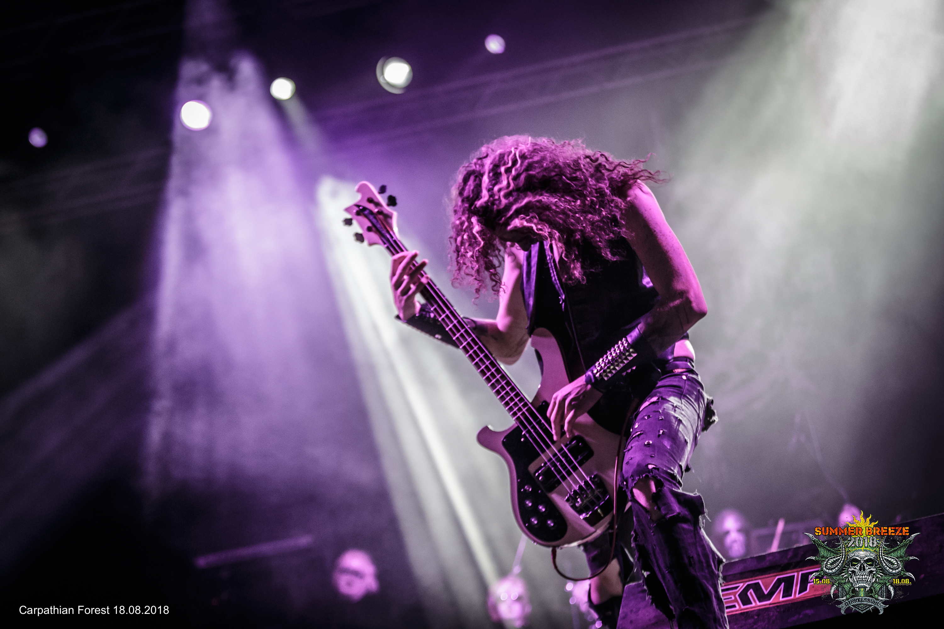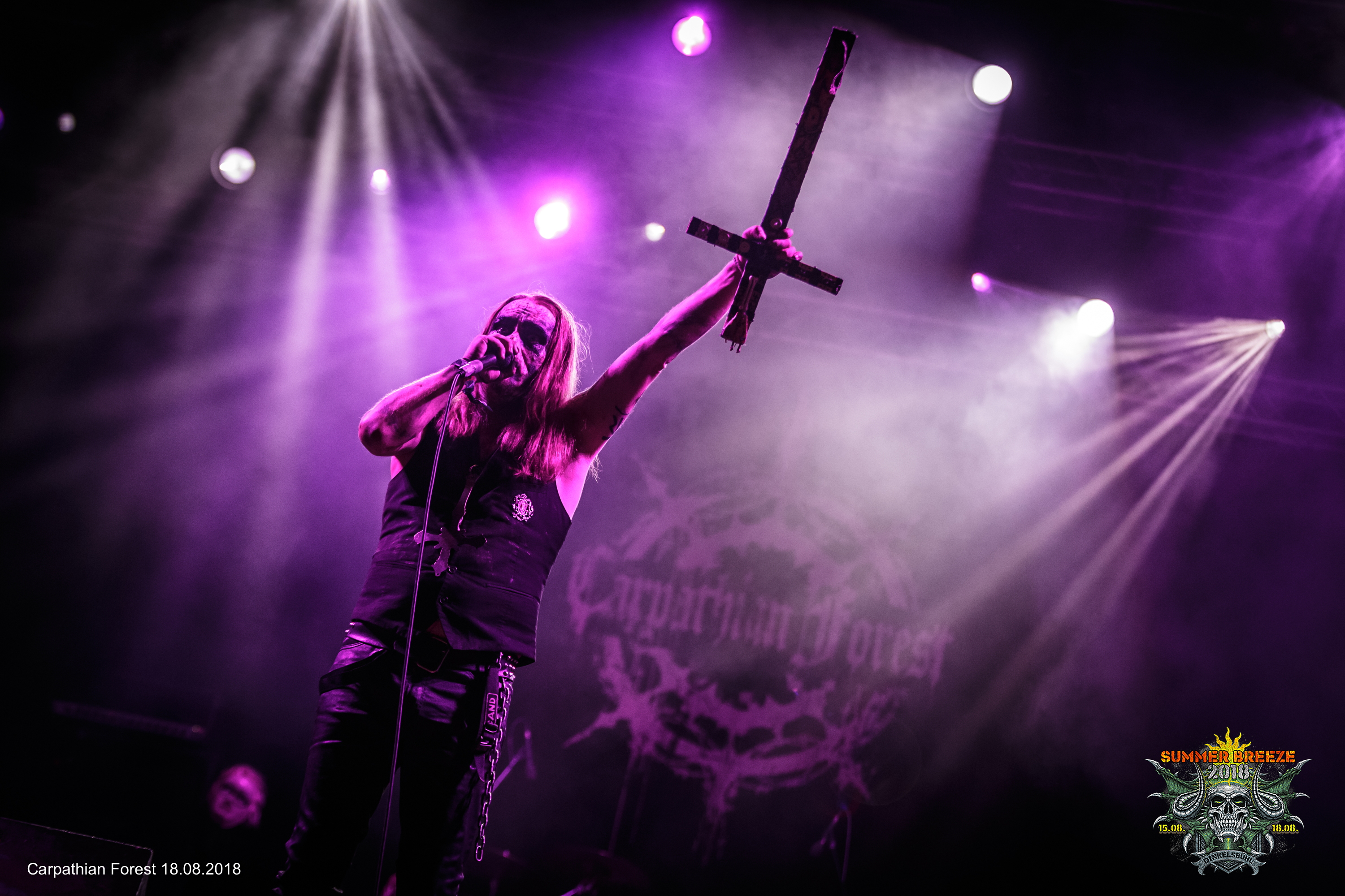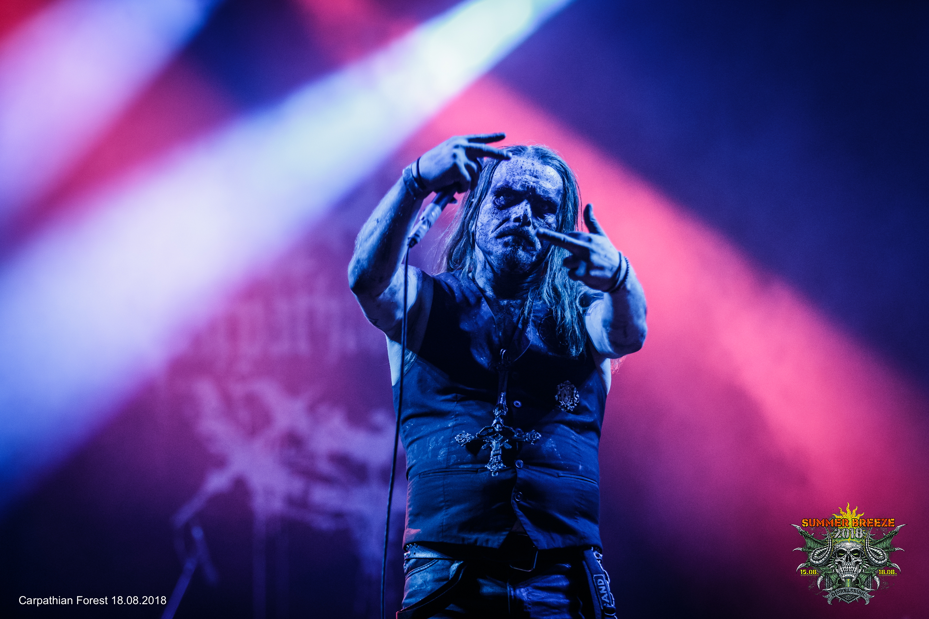 Die Fahne des Black Metals durften am Samstag CARPATHIAN FOREST hochhalten – immerhin passend unter dem dunklen Nachthimmel und bei (verglichen mit der Gluthitze der Mittagsstunden) ‚eisigen‘ Temperaturen. Doch die nicht kleine Zuschauerschar war bei den morbiden Schwarzmetallsongs schon bald auf Betriebstemperatur: „Through Self-Mutilation“, „One With The Earth“ oder „Knokkelmann“ rocken einfach. Genauso wie „Likeim“, der erste Song, den Frontmann Nattefrost und seine neue Backingband im April veröffentlicht hatte. Die Songs hielten das Publikum also in Bewegung, die mit schriller Stimme vorgetragenen Ansagen von Nattefrost waren zumindest unterhaltsam: „Alles gut? SUMMER BREEZE! Alles gut?“ Eher kauzig war die Nummer, als der mit einem dicken umgedrehten Holzkreuz um den Hals über die Bühne tigernde Nattefrost eine Voodoo-Puppe hervorholte, sie herzte und den Turbonegro-Coversong „All My Friends Are Dead“ ankündigte. Ansonsten boten die fünf Norweger aber eine überzeugende Show, bei der weder grimmige Songs noch böse Maschinengewehr-Posen des Bassisten fehlten.