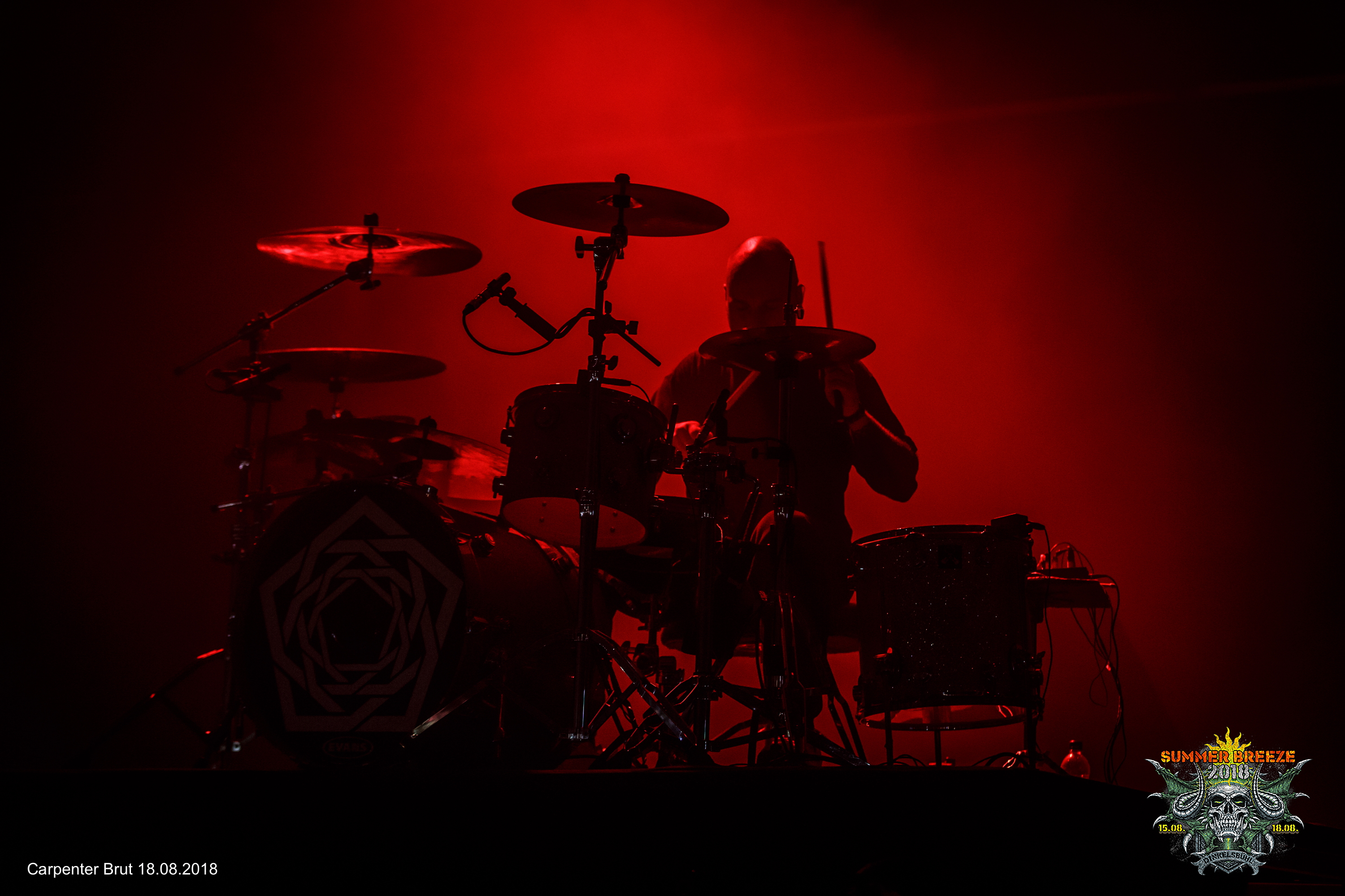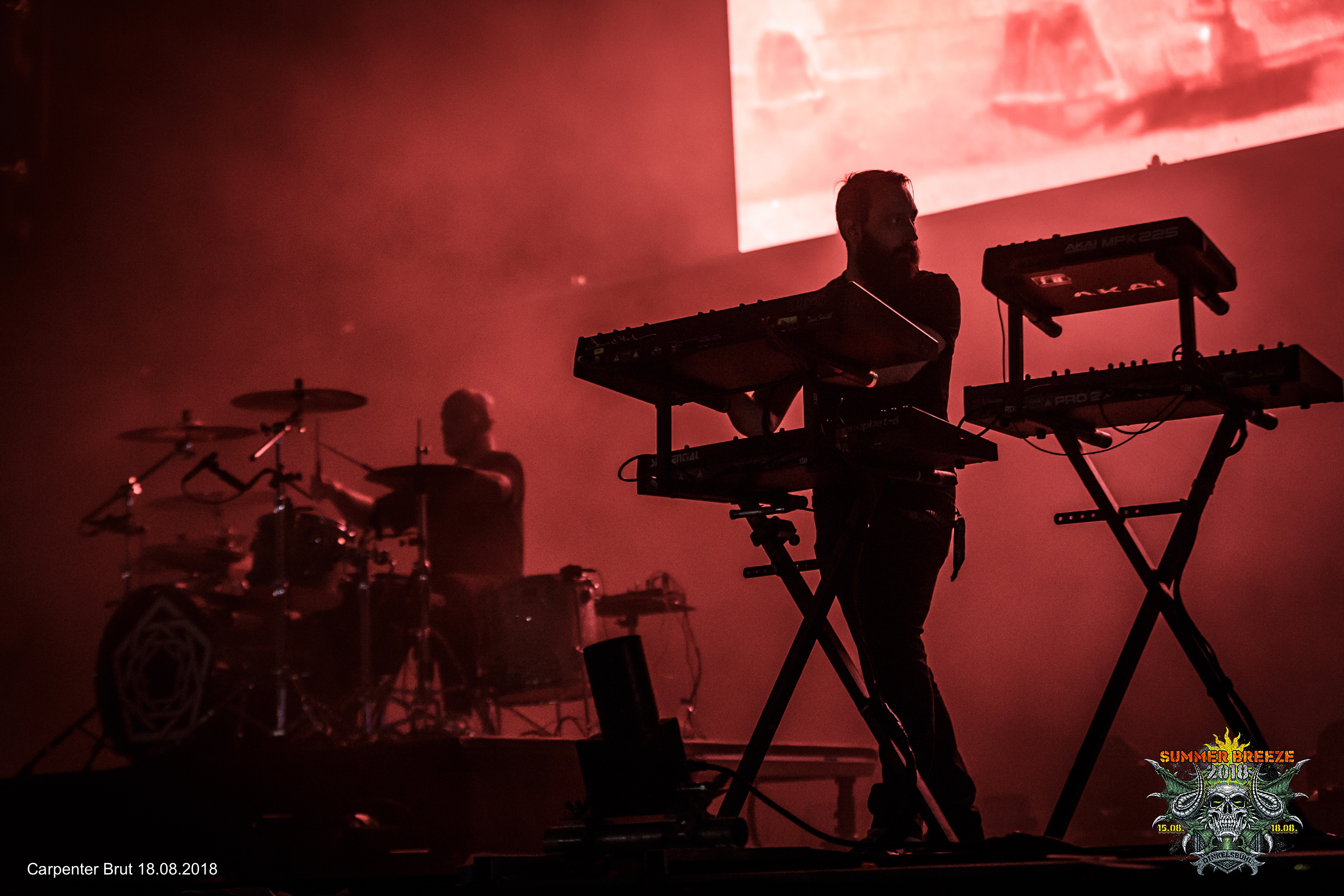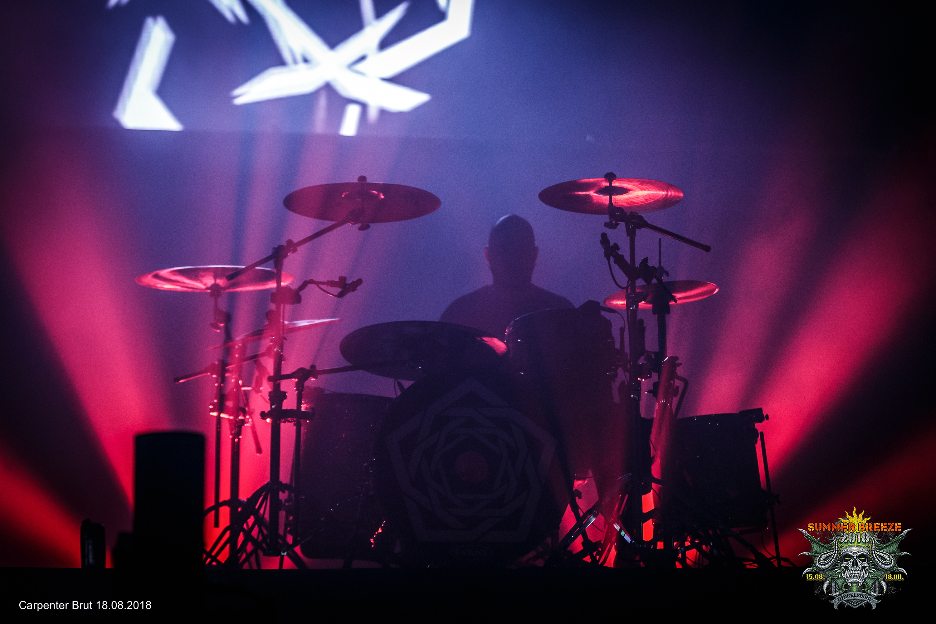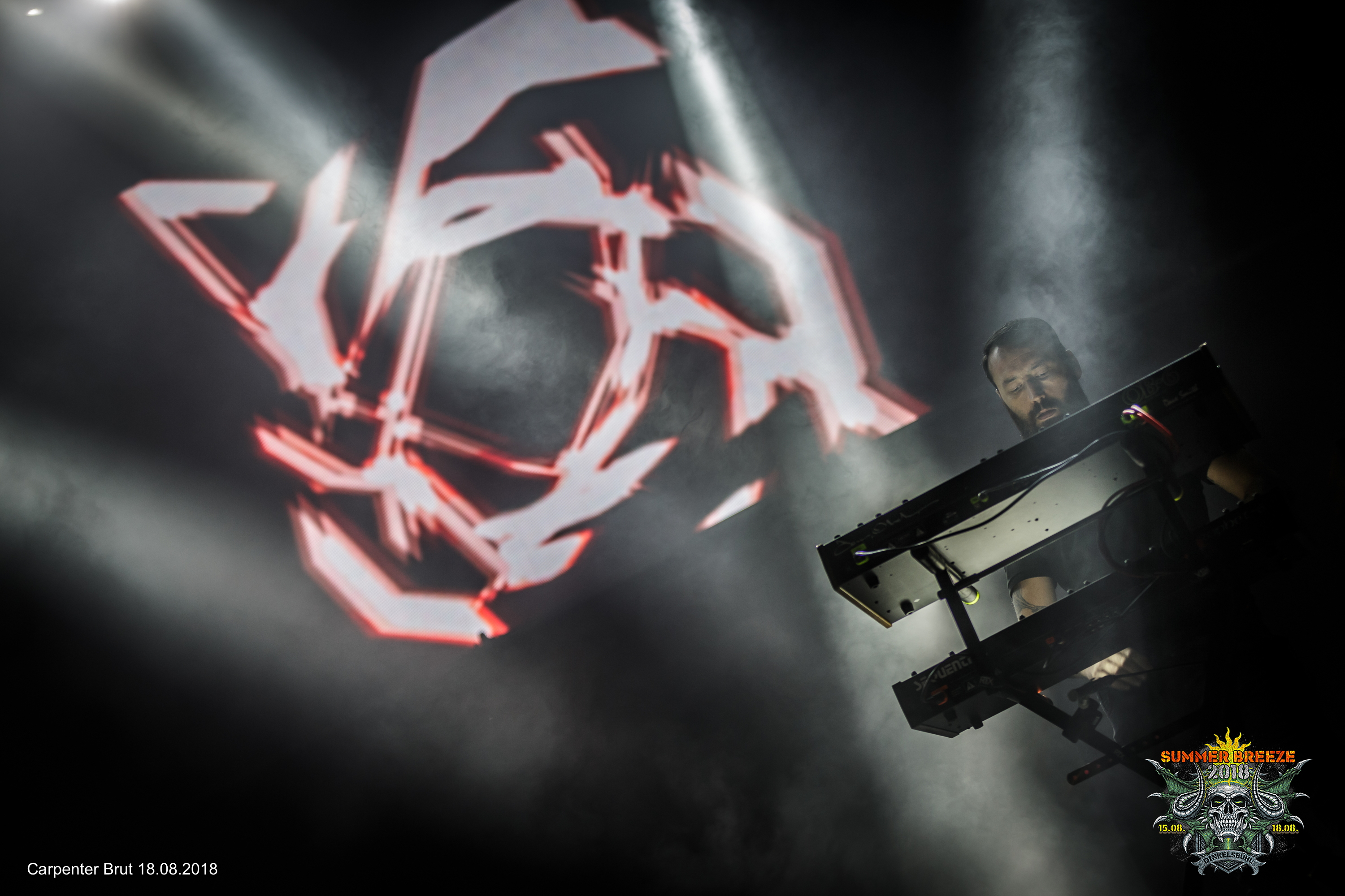 Eines der ungewöhnlicheren Highlights dieser Ausgabe des SUMMER BREEZE Festivals hatte die Ehre, als letzter Act auf der Hauptbühne noch einmal ordentlich Lärm zu machen. Und das mit Stil: CARPENTER BRUT, das Synthwave-Projekt des Franzosen Franck Hueso, hielten sich vor, nach und während ihres Auftrittes nicht mit Ansprachen auf und ließen stattdessen die Bilder sprechen, die auf dem Screen im Hintergrund zu sehen waren. Dabei handelte es sich um zum Teil groteske Splatter-Szenen mit Achtziger-Flair und mit jeder Menge nackter Haut, also praktisch ein Overkill an Gewalt und Brüsten. Sex Sells, Violence beim Metal ebenfalls, aber CARPENTER BRUT überzeugten eher mit ihrem metallischen Synthwave, der die Menge noch einmal gehörig zum Tanzen brachte und tatsächlich zu später Stunde noch einmal eine ganze Menge Leute vor die Hauptbühne lockte. Hinzu kam eine mehr als imposante Lightshow – das Gesamtpaket CARPENTER BRUT ließ sich eigentlich nur mit gehörigem Abstand zur Bühne erleben. Und mit dem Cover des Michael Sembello-Klassikers „Maniac“ verabschiedeten sich die drei Musiker, die dank in rot gehaltener Bühnenbeleuchtung nur als vage Silhouetten in Erscheinung traten, ebenso wortlos von der Bühne, wie sie erschienen sind – wahrhaftig ein pompöser, theatralischer und auch ungewöhnlicher Abschluss für das diesjährige Programm auf der Main Stage.