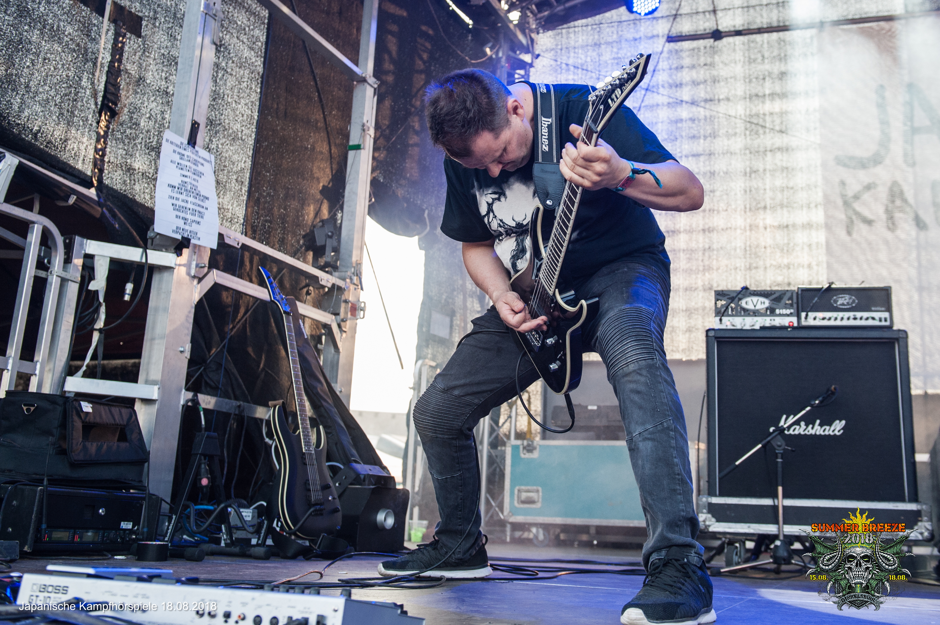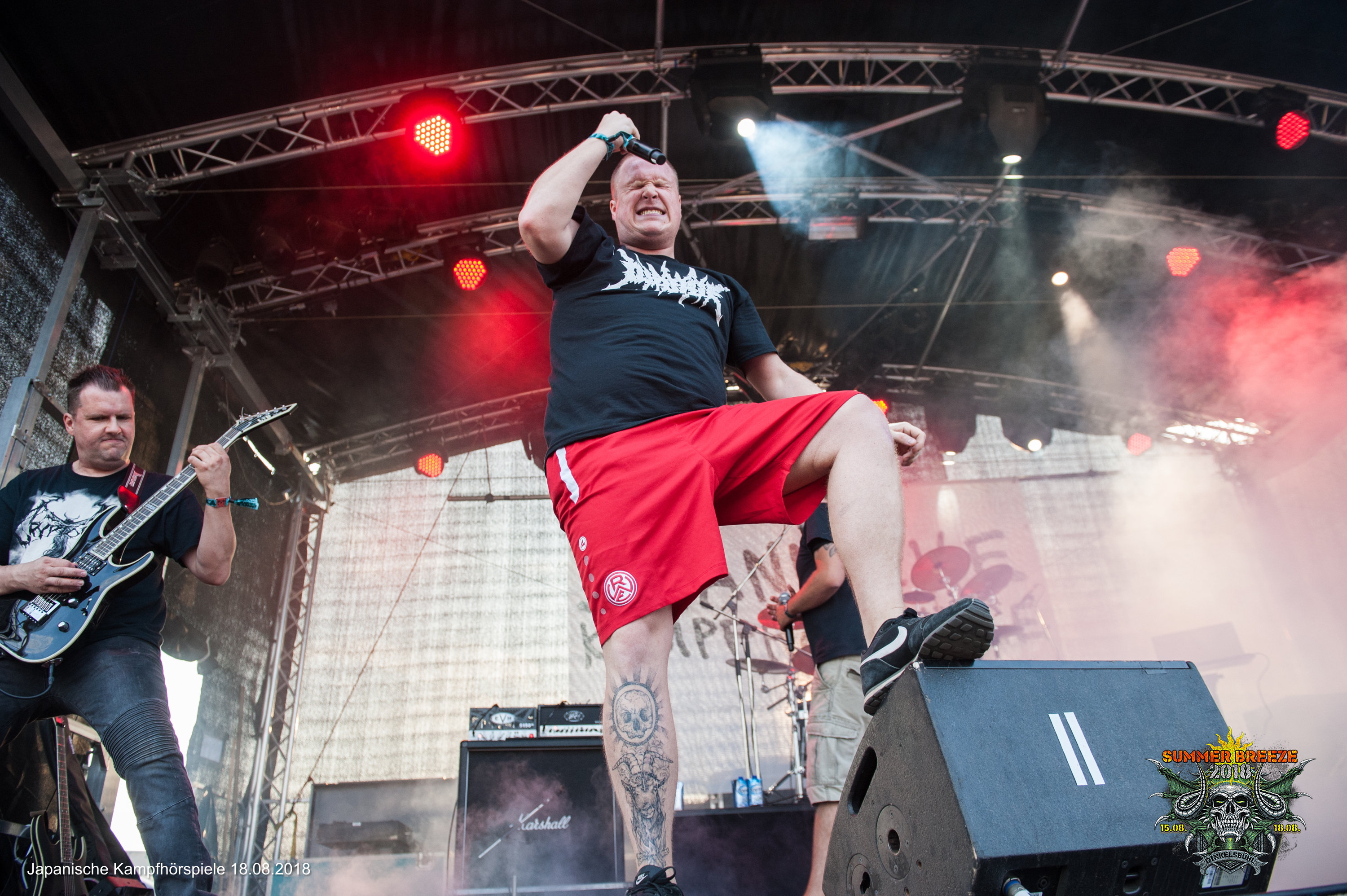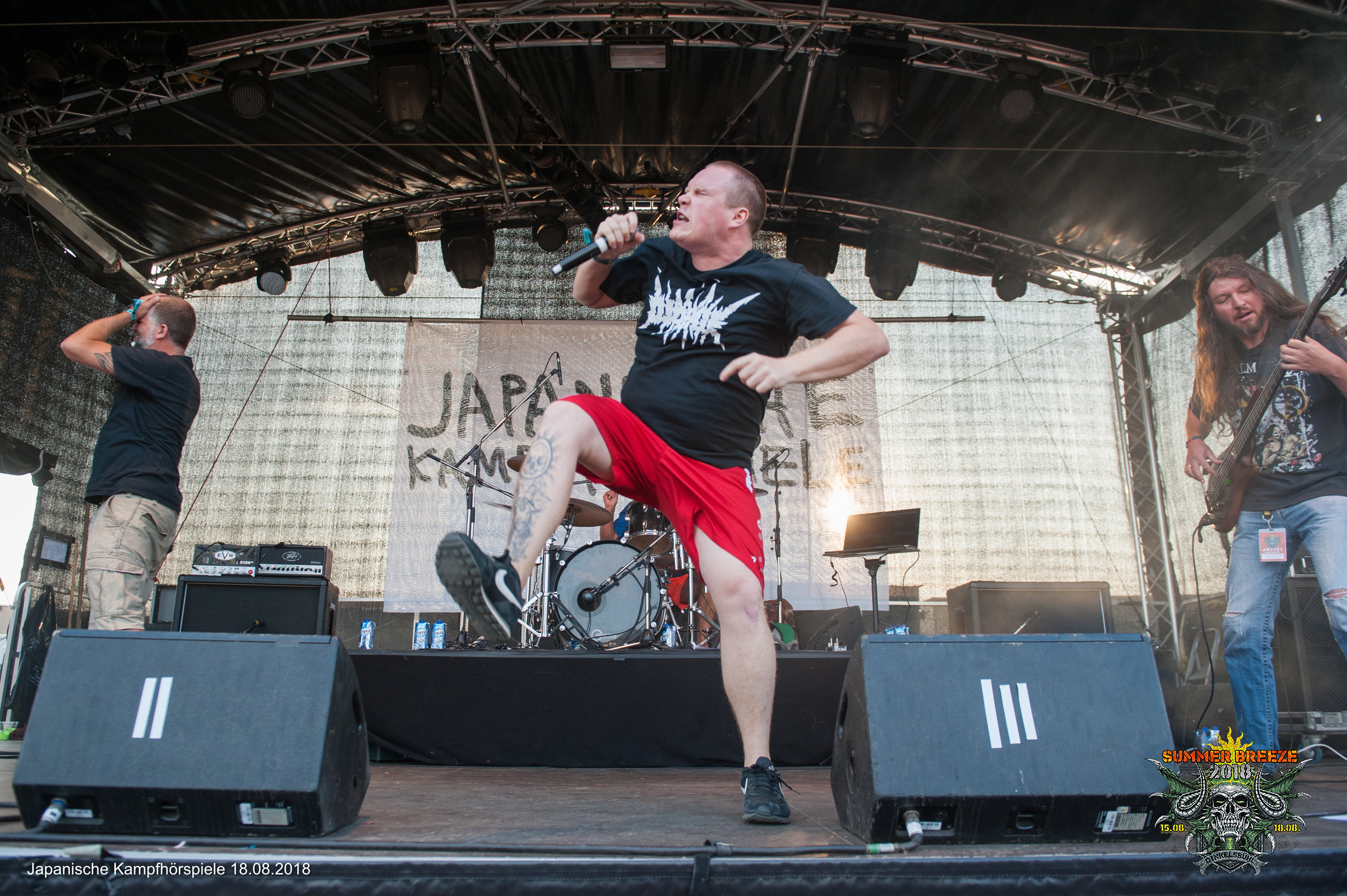 Holla, was war das denn für ein Abriss? JAPANISCHE KAMPFHÖRSPIELE sorgten für einen gelungenen Abschluss auf der Ficken Party Stage und heizten der Meute ordentlich ein – mit ihren Deathgrind-Salven, die mal hyperschnell, mal stampfend langsam auf die feierwilligen Anwesenden niederprasselten. Sänger Christian Markwald sorgte zudem zwischen den neunzehn Songs immer wieder für die richtigen Aufforderungen: „Schweinepogo!“ – „Tanzen!“ – „Moshpit! Bewegt eure Ärsche!“ – „Da geht noch mehr – Circle Pit!“ Als er dann zum langsamsten Circle Pit des SUMMER BREEZE aufrief, war klar, dass der Auftritt ein Siegeszug werden würde. Sogar eine Zugabe durften JAKA spielen – und stellten die Jungs aus Krefeld vor spontane Probleme: „Wir suchen unseren Gitarristen – der ist backstage, um sich einen runterzuholen, weil es hier so geil war.“ Pause. „Das Gute ist: Er ist schon fertig!“ Sonst noch Fragen?