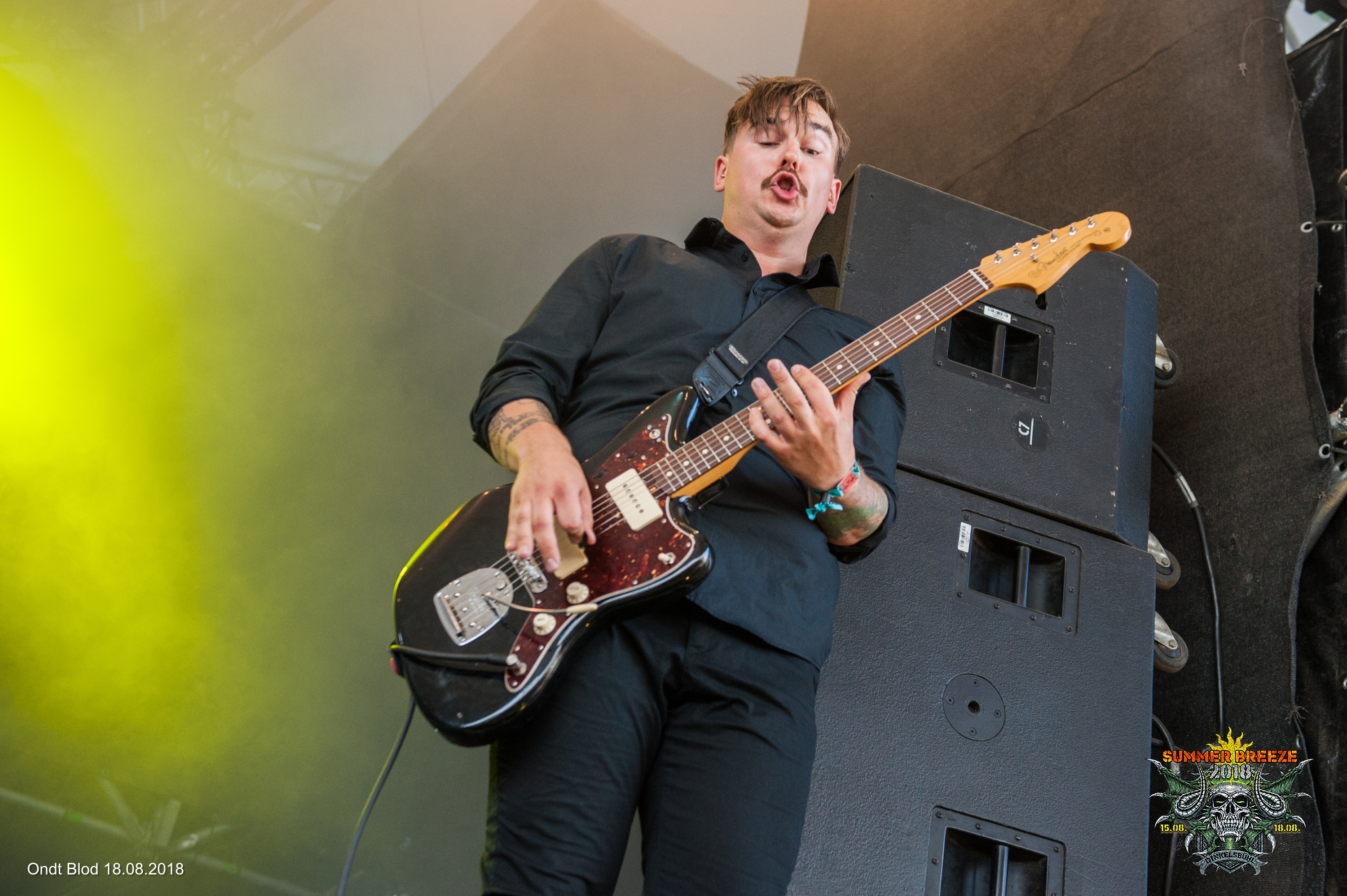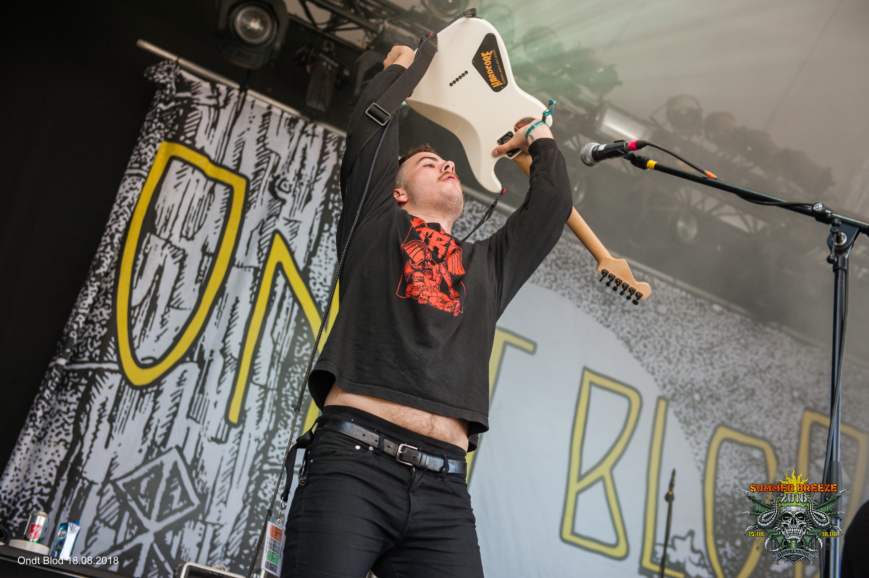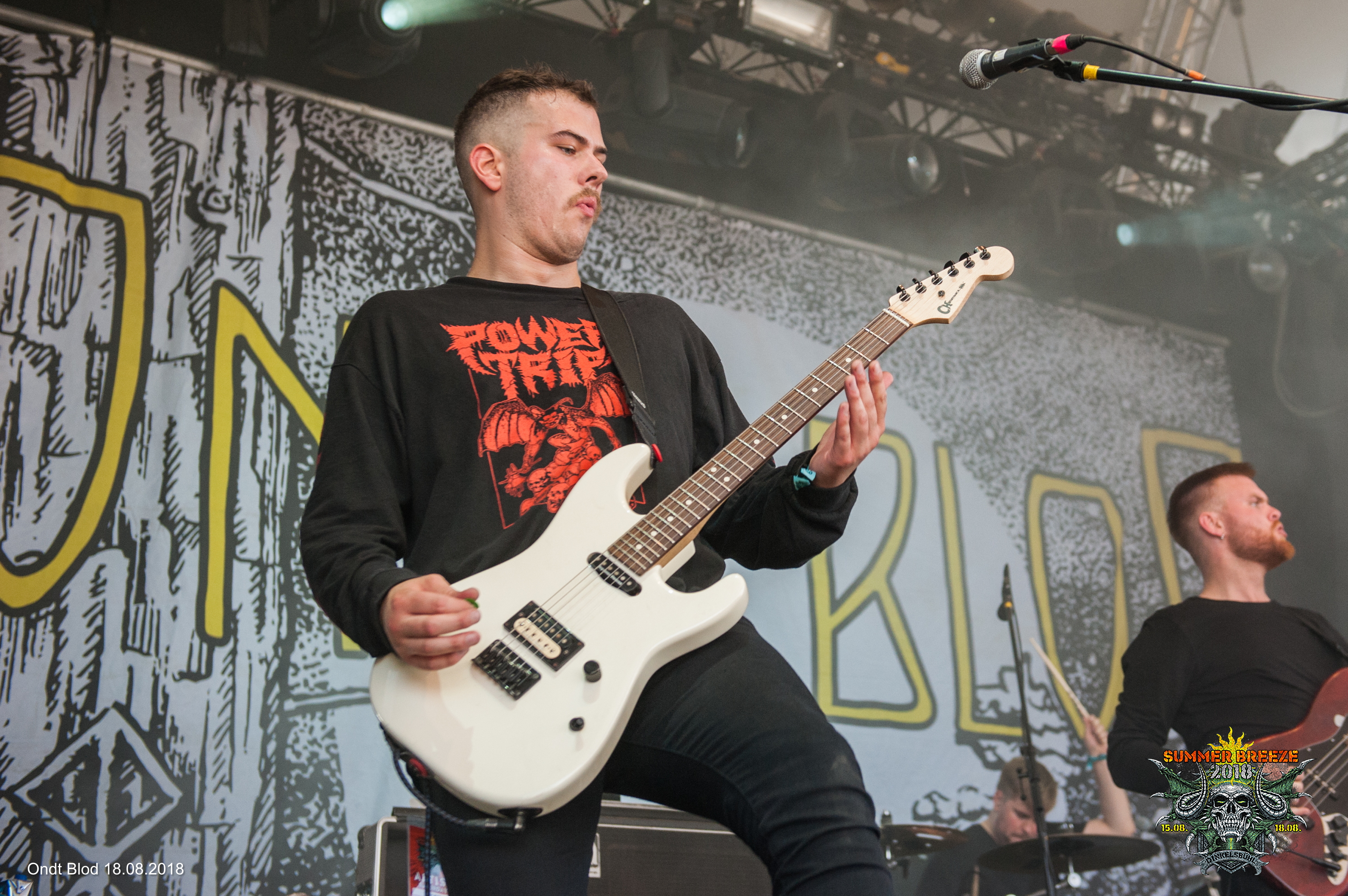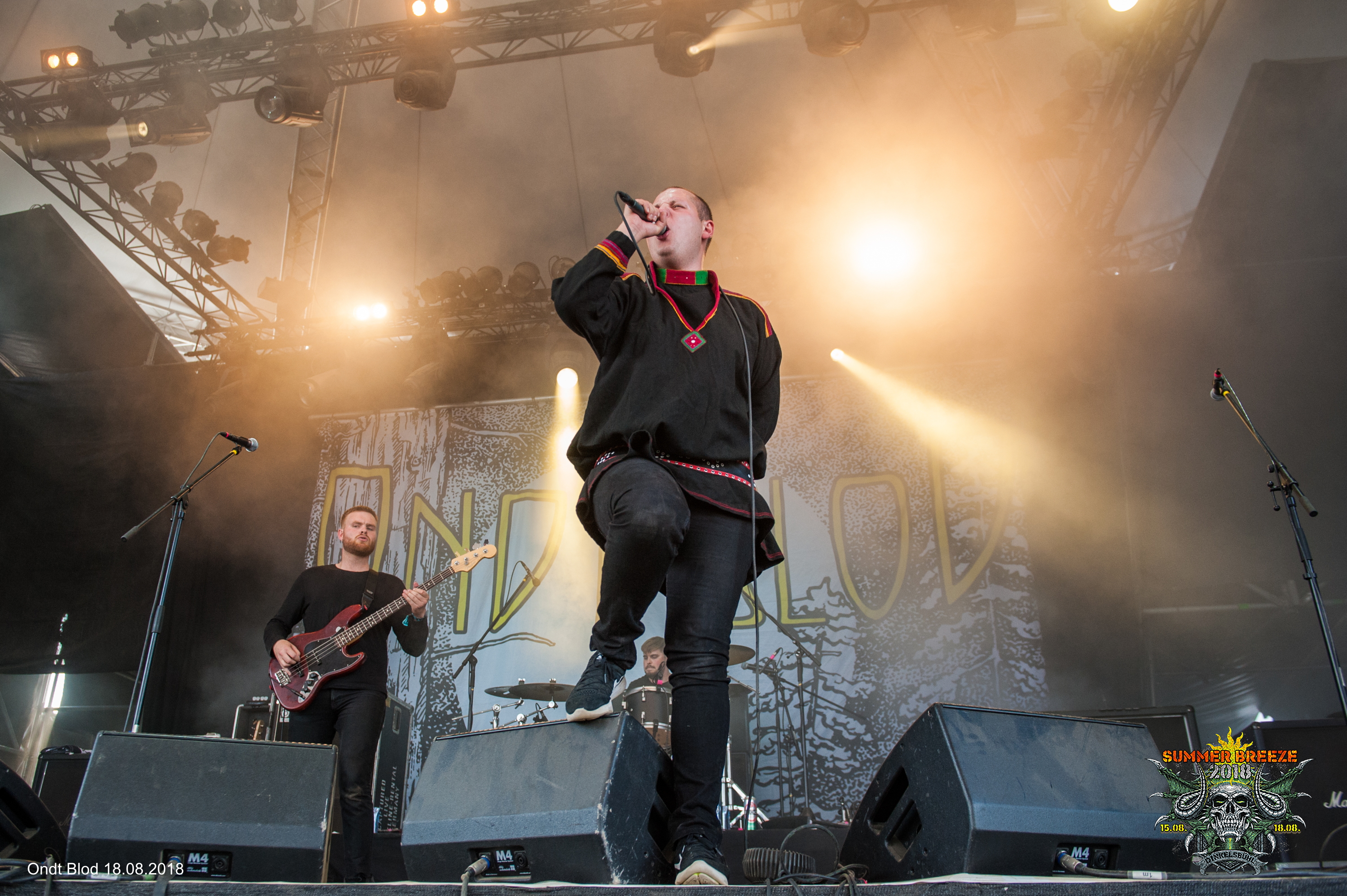 Als ONDT BLOD loslegten, war vor der der Bühne nicht sonderlich viel los. Könnte daran gelegen haben, dass WOLFHEART auf der T-STAGE gerade noch in den letzten Zügen lagen. An der Performance der Norweger lag es auf jeden Fall nicht. Die war nämlich vom Start weg verdammt energiegeladen. Frontmann Aslak Heika Hætta Bjørn sprang bereits beim ersten Song ins Publikum und moshte fleißig mit. Seine Bandkollegen schüttelten derweil ihre Schädel ordentlich durch. Musikalisch lieferten ONDT BLOD melodischen Hardcore ab, der nicht selten an A Day To Remember erinnerte. Hier und da überraschte die Band allerdings auch mit leicht schwarzmetallischen Riffs. Je länger ONDT BLOD spielten, desto voller wurde es dann auch vor der CAMEL STAGE. Das abwechslungsreiche Songmaterial fand beim SUMMER BREEZE-Publikum offensichtlich eine Menge Anklang. Am Ende machte die Band noch ein Erinnerungsfoto, während „Rhythm Of The Night“ aus den Boxen tönte. Humor haben ONDT BLOD also auch.