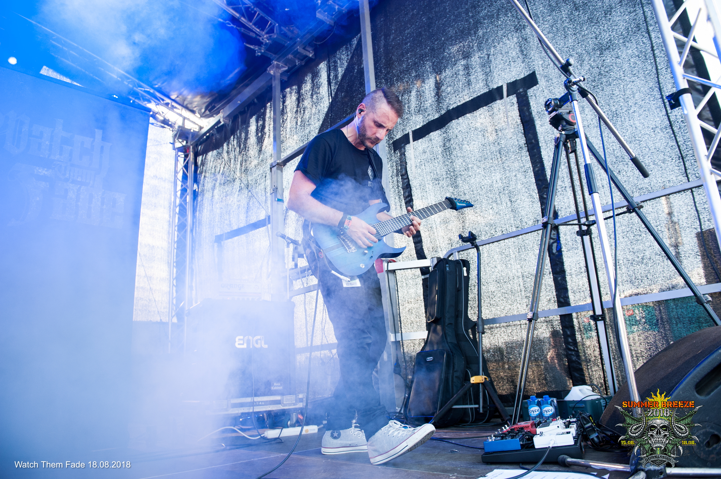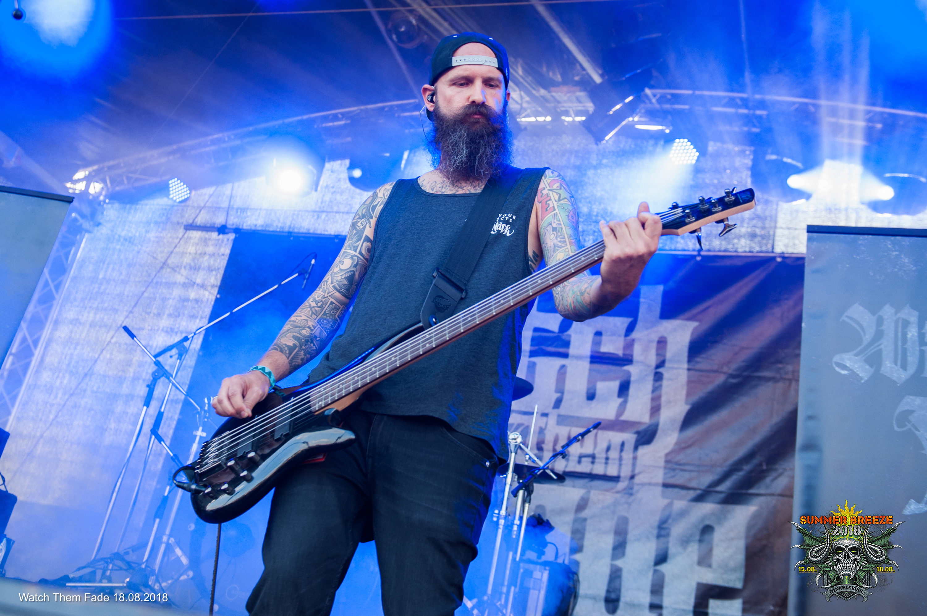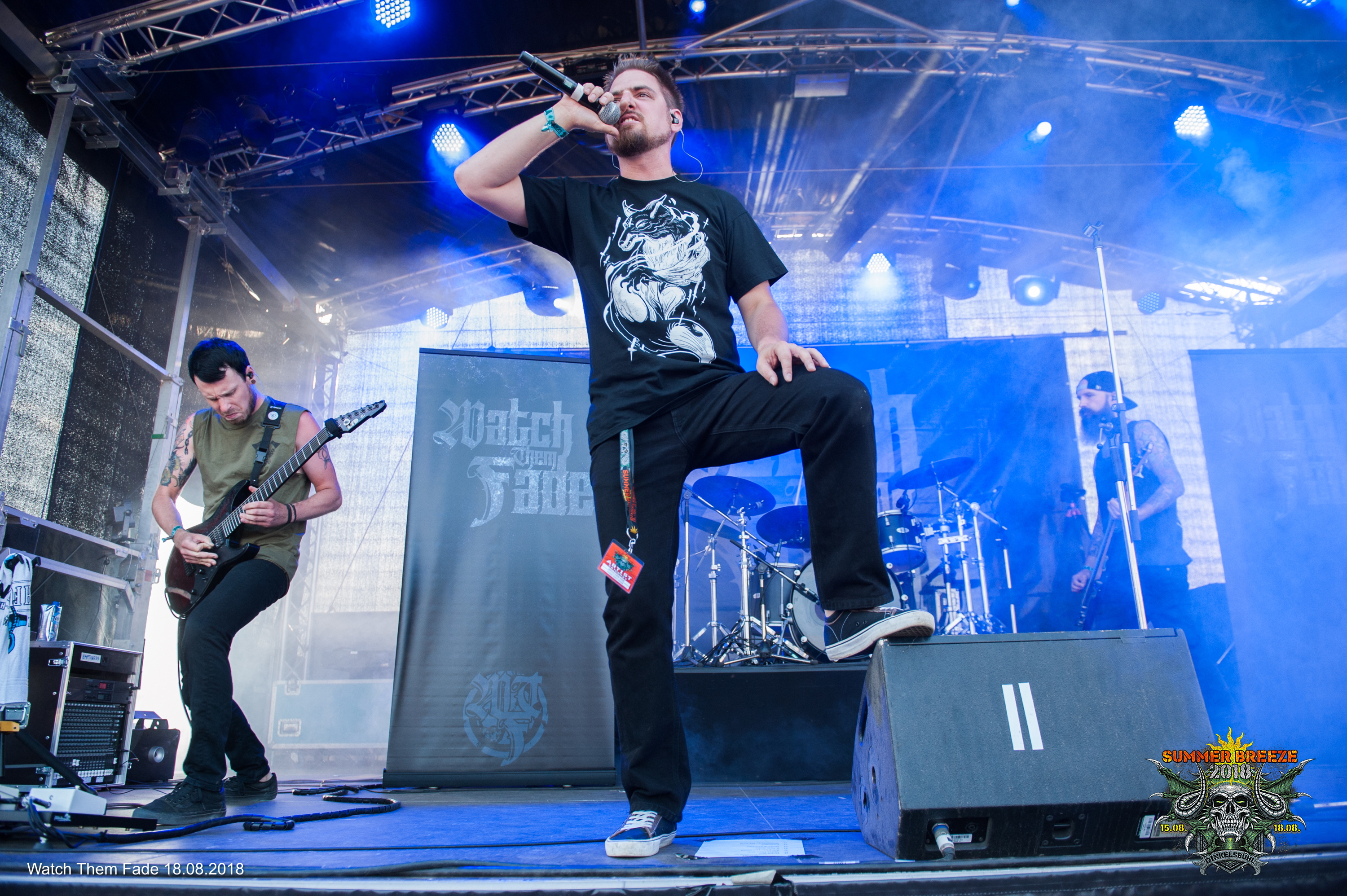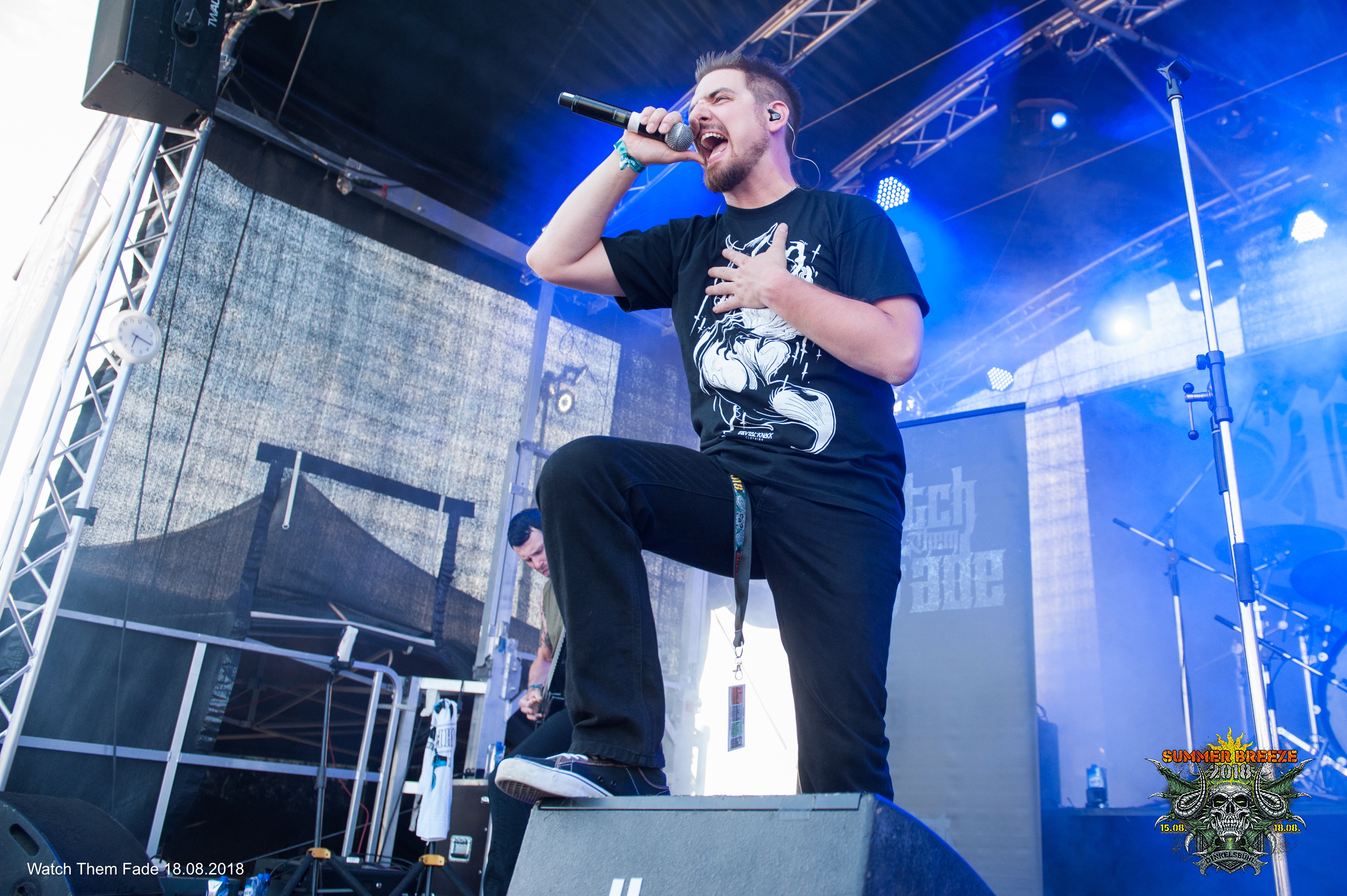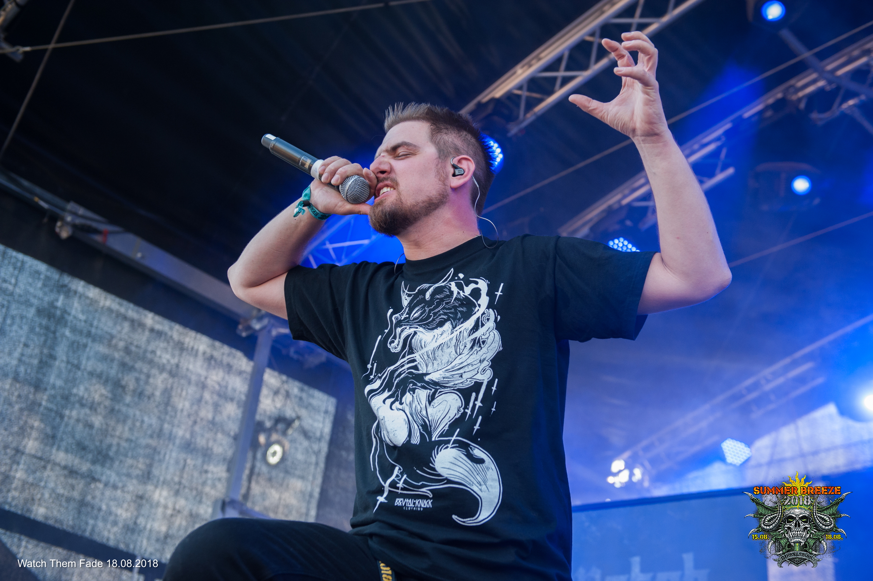 Nachdem A SECRET REVEALED eine Stunde vorher das Feld schon entsprechend bestellt hatten, hatten auch WATCH THEM FADE mehr oder weniger leichtes Spiel. Im April haben sie ihr letztes Album „Emptiness“ veröffentlicht, jede Menge Applaus im Blätterwald dafür eingeheimst und so begannen sie auch ihren Auftritt auf dem SUMMER BREEZE mit dem Titeltrack und Opener ihres aktuellen Longplayers. Ohne große Pause hängten sie direkt „Other Than That“ dran und hielten somit das Energielevel konstant. Fronter Christoph Aggou war der unbestrittene Mittelpunkt der Show und mit ihrem melodischen Metalcore hatten die Würzburger offensichtlich einen Nerv beim Publikum getroffen und entsprechend leichtes Spiel. Marc Görtz, der Produzent ihres Albums und außerdem Leadgitarrist bei CALIBAN, gab sich nur ein paar Stunden später auf der benachbarten T-Stage die Ehre. Und auf einer größeren Bühne, kann man sich auch WATCH THEM FADE nach dieser Show bestens vorstellen…