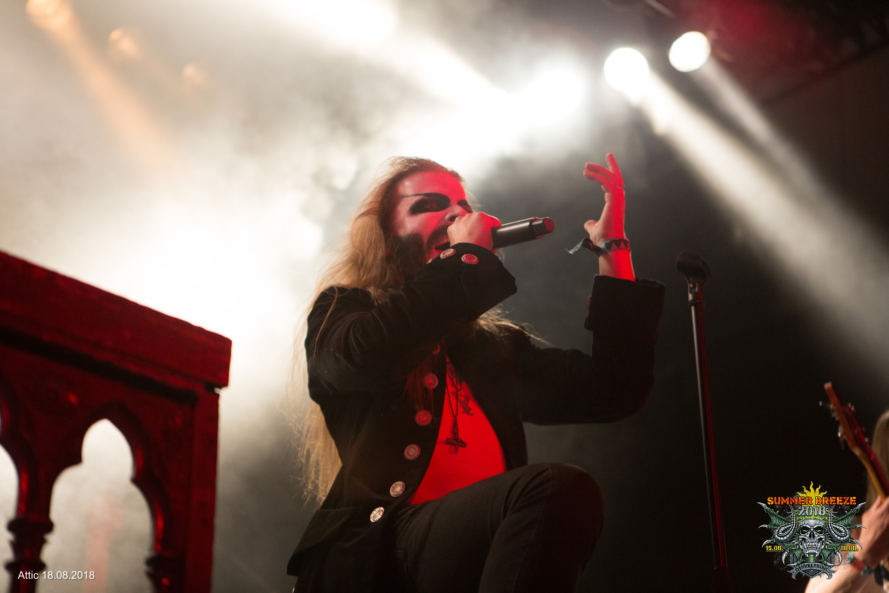 Weihrauch-Duft umwaberte die von zahlreichen Kerzenleuchtern illuminierte Camel Stage: Die King Diamond-Enthusiasten ATTIC hatten für ihre Show ein ganzes Arsenal an Requisiten mitgebracht, mit dem man eigentlich eine mittelgroße Kirche hätte füllen können. Nicht zuletzt die Kirchenbankeinfassungen schränkten den Aktionsradius der Westfalen aber ein wenig ein: Zwei mit Flying-V-Gitarren bewehrte Sechssaiter, ein Bassist sowie der Sänger mussten sich den knappen Platz teilen. Das machte aber nichts, denn bei ihren sorgsam komponierten Metal-Songs gingen die Jungs keine Kompromisse ein, und insbesondere der charismatische, ganz im Stile des Kings vorgetragene Gesang von Meister Cagliostro überzeugte. So war es kein Wunder, dass die Meute von Beginn an mitging und nicht zuletzt den Rausschmeißer „The Headless Horseman“ mit frenetischem Jubel bedachte.