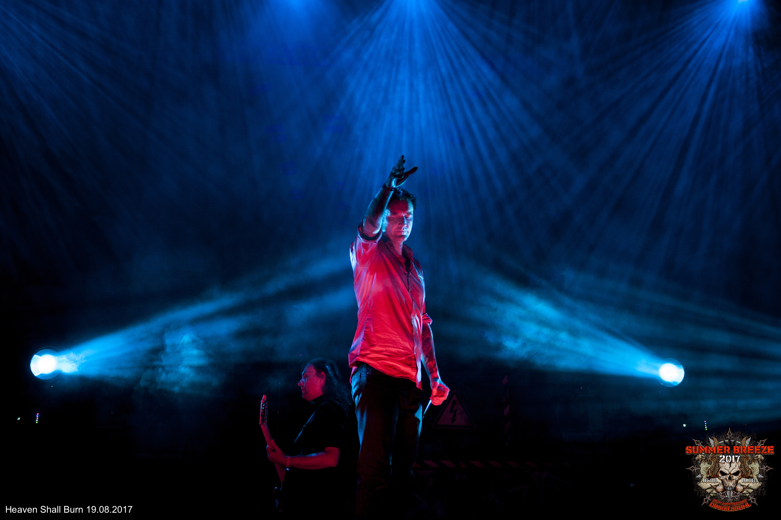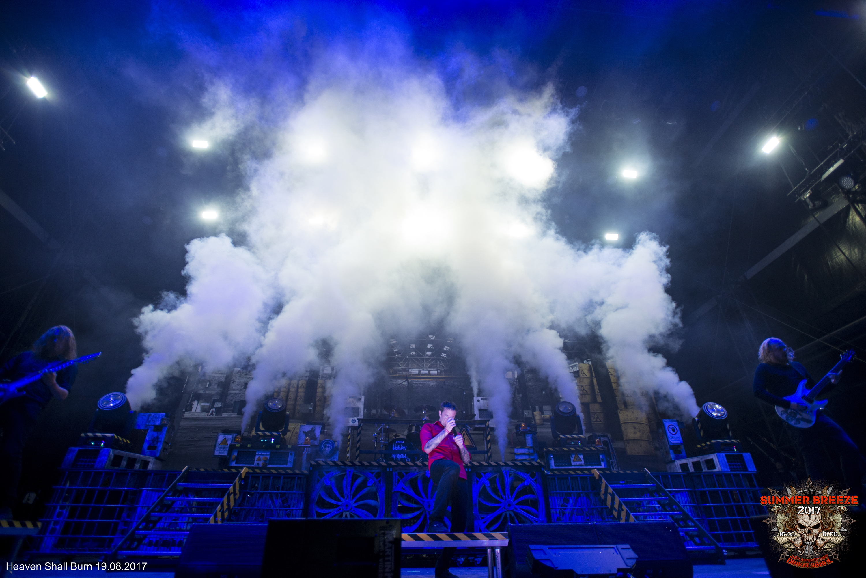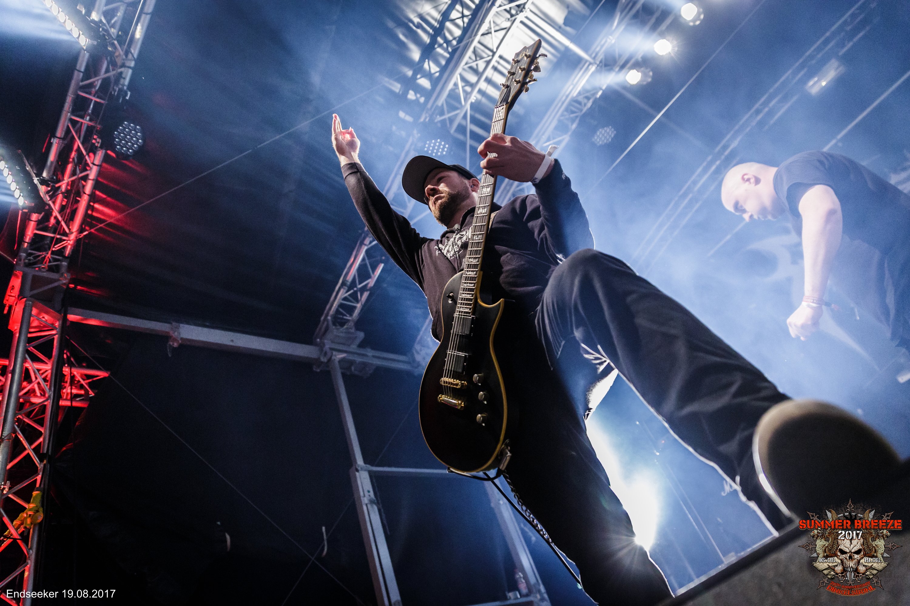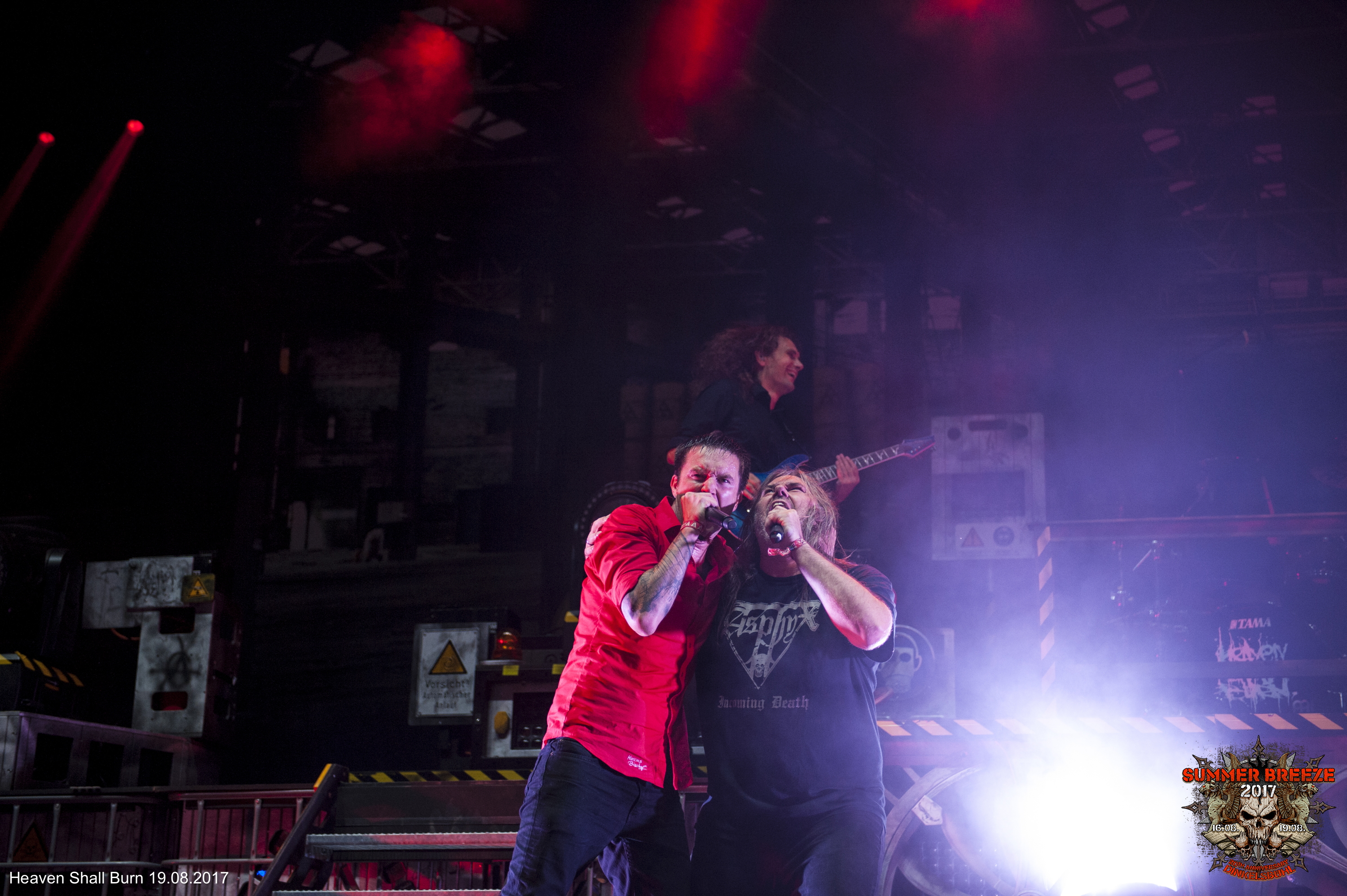 Die Geschichte des SUMMER BREEZE und die von HEAVEN SHALL BURN sind eng verwoben. Die Thüringer Wiederholungstäter mit der Abrissgarantie war schließlich nicht zum ersten Mal dabei. So war es nur konsequent, dass die Band sich auch zum 20-jährigen Festivaljubiläum die Ehre gab und am letzten Festivalabend den Boden für den Headliner KORN bereitete. HEAVEN SHALL BURN eröffneten ihr Set mit der Groove-Walze „The Loss Of Fury“ vom aktuellen Album „Wanderer“ und hatten das Publikum direkt auf ihrer Seite. Trotz deutlichem Augenmerk auf den Songs der letzten Scheibe, mangelte es dem Set auch keineswegs an Klassikern. „Voice Of the Voiceless“, „Forlorn Skies“ und „Counterweight“ wurden frenetisch gefeiert – wobei der Bühnenvorplatz überhaupt von Beginn an einem Schlachtfeld glich. Bekannt für legendäre Circle Pits und Walls Of Death schienen HEAVEN SHALL BURN sich an diesem Abend selbst noch toppen zu wollen. Mehrfach betonte Sänger Marcus Bischoff die Sonderstellung, die das SUMMER BREEZE für die Band einnimmt, und erinnerte an denkwürdige Auftritte der Vergangenheit. Ziemlich früh zeigte sich, dass das Jahr 2017 sich problemlos in die Reihe ihrer Live-Großtaten der letzten Jahre einreihen würde. Die Krone für die meisten Crowdsurfer konnten sich HEAVEN SHALL BURN zumindest sehr schnell sichern. Was nicht zuletzt daran lag, dass Bischoff den starken Jungs im Graben partout keine Langeweile zumuten wollte. Spätestens zu „Endzeit“ war eben jene auch für so manchen Pit-Spartaner gekommen. Als letzten Song stimmten HEAVEN SHALL BURN schließlich ihre Cover-Version von „Black Tears“ von Edge Of Sanity an und holten dazu den Urheber des Songs, Dan Swanö, persönlich auf die Bretter. Man merkte der Band die Begeisterung an – plötzlich standen da einfach nur noch Metal-Fans auf der Bühne. Ein weiterer sympathischer Abriss voller Hingabe ging vorbei. Und für KORN war der schlammige Boden mehr als festgestampft.