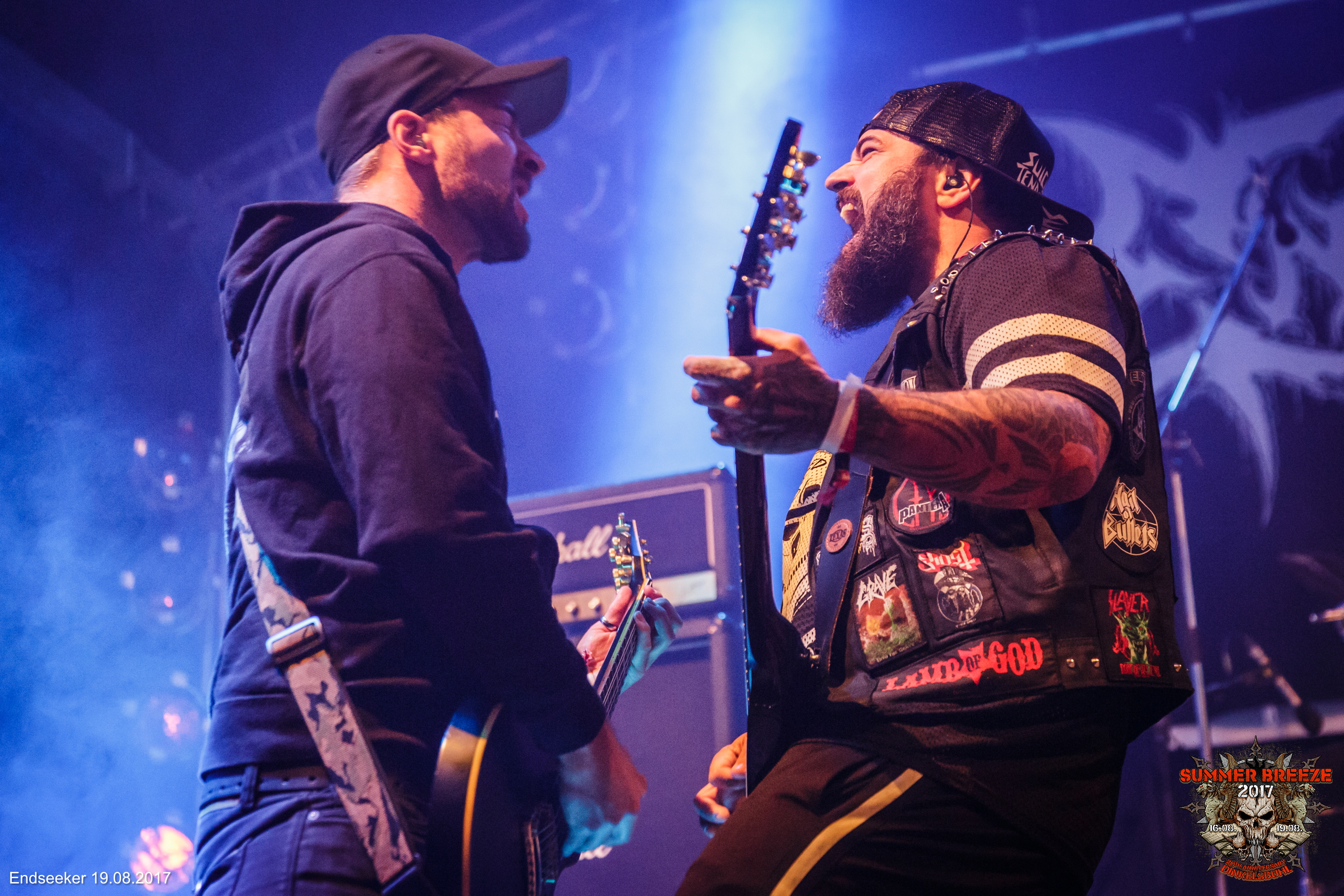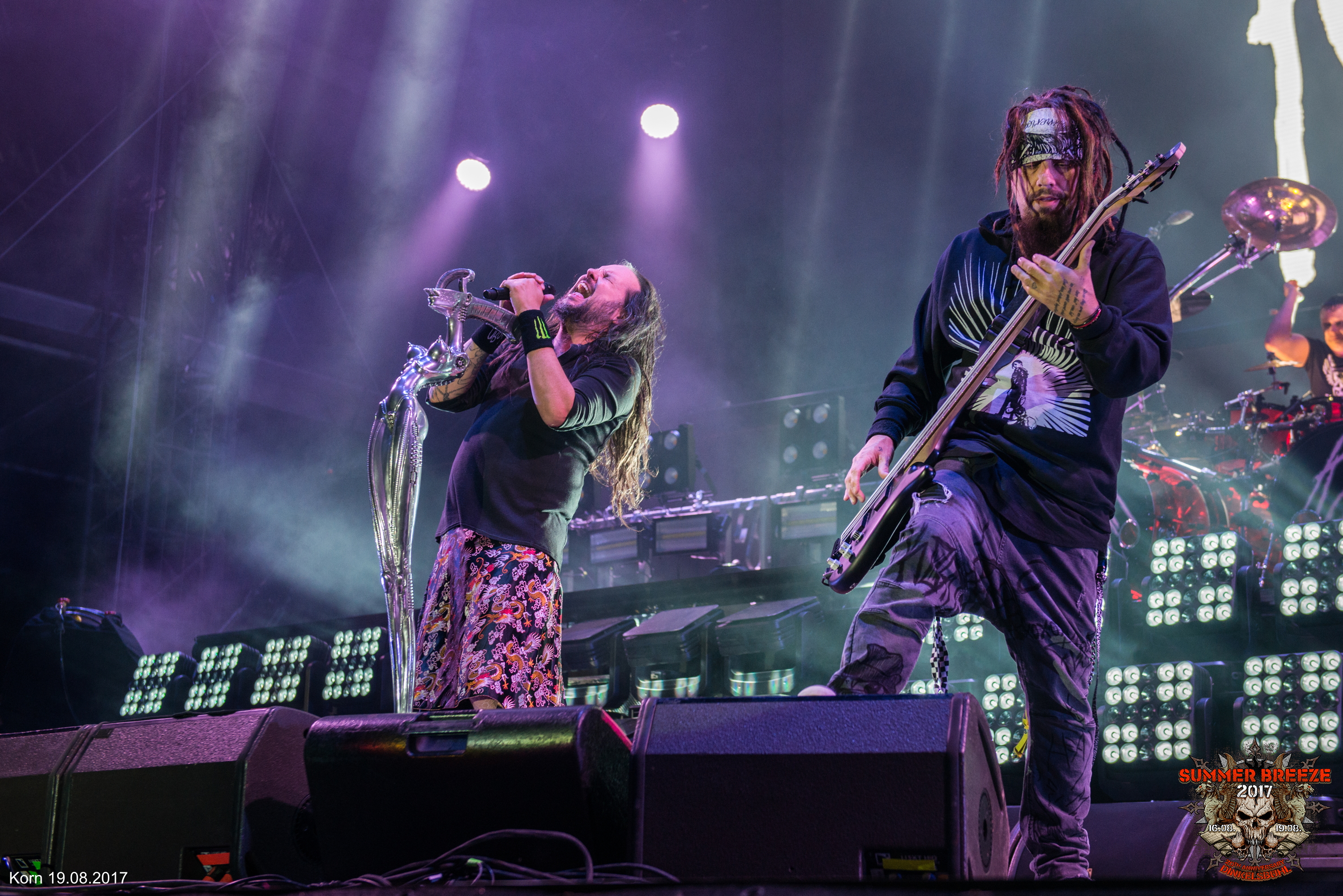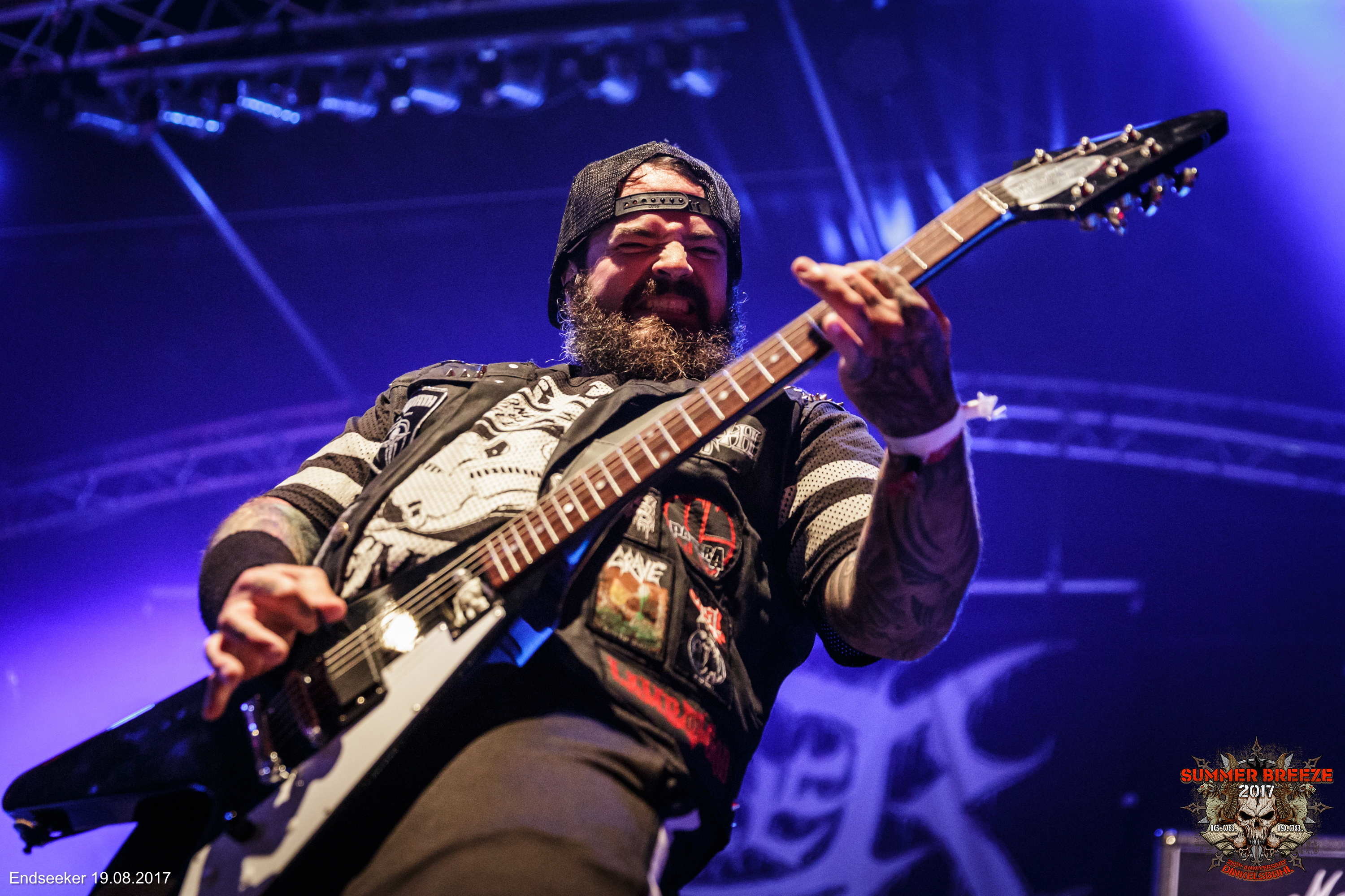 Die Geschichte des SUMMER BREEZE und die von HEAVEN SHALL BURN sind eng verwoben. Die Thüringer Wiederholungstäter mit der Abrissgarantie war schließlich nicht zum ersten Mal dabei. So war es nur konsequent, dass die Band sich auch zum 20-jährigen Festivaljubiläum die Ehre gab und am letzten Festivalabend den Boden für den Headliner KORN bereitete. HEAVEN SHALL BURN eröffneten ihr Set mit der Groove-Walze „The Loss Of Fury“ vom aktuellen Album „Wanderer“ und hatten das Publikum direkt auf ihrer Seite. Trotz deutlichem Augenmerk auf den Songs der letzten Scheibe, mangelte es dem Set auch keineswegs an Klassikern. „Voice Of the Voiceless“, „Forlorn Skies“ und „Counterweight“ wurden frenetisch gefeiert – wobei der Bühnenvorplatz überhaupt von Beginn an einem Schlachtfeld glich. Bekannt für legendäre Circle Pits und Walls Of Death schienen HEAVEN SHALL BURN sich an diesem Abend selbst noch toppen zu wollen. Mehrfach betonte Sänger Marcus Bischoff die Sonderstellung, die das SUMMER BREEZE für die Band einnimmt, und erinnerte an denkwürdige Auftritte der Vergangenheit. Ziemlich früh zeigte sich, dass das Jahr 2017 sich problemlos in die Reihe ihrer Live-Großtaten der letzten Jahre einreihen würde. Die Krone für die meisten Crowdsurfer konnten sich HEAVEN SHALL BURN zumindest sehr schnell sichern. Was nicht zuletzt daran lag, dass Bischoff den starken Jungs im Graben partout keine Langeweile zumuten wollte. Spätestens zu „Endzeit“ war eben jene auch für so manchen Pit-Spartaner gekommen. Als letzten Song stimmten HEAVEN SHALL BURN schließlich ihre Cover-Version von „Black Tears“ von Edge Of Sanity an und holten dazu den Urheber des Songs, Dan Swanö, persönlich auf die Bretter. Man merkte der Band die Begeisterung an – plötzlich standen da einfach nur noch Metal-Fans auf der Bühne. Ein weiterer sympathischer Abriss voller Hingabe ging vorbei. Und für KORN war der schlammige Boden mehr als festgestampft.