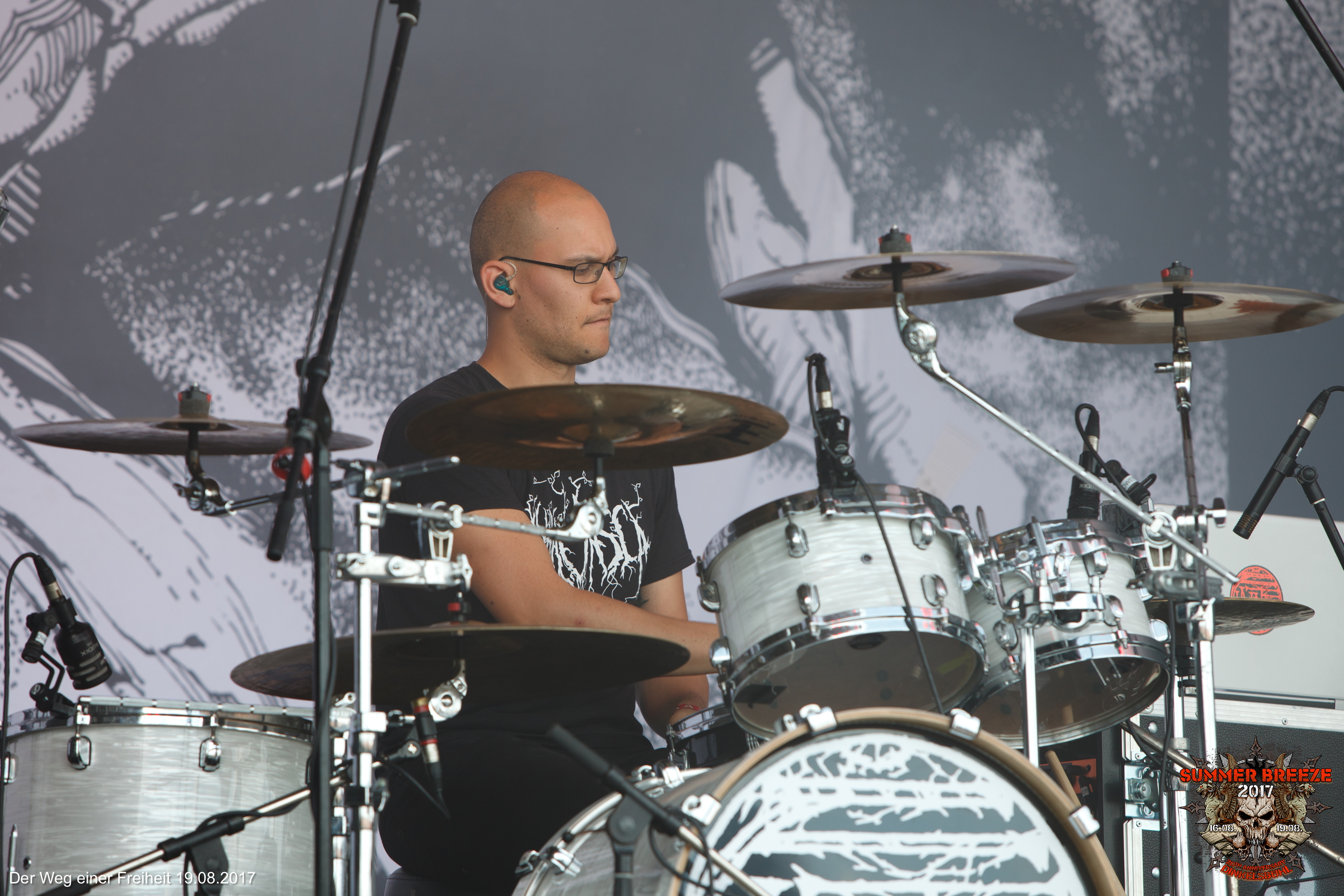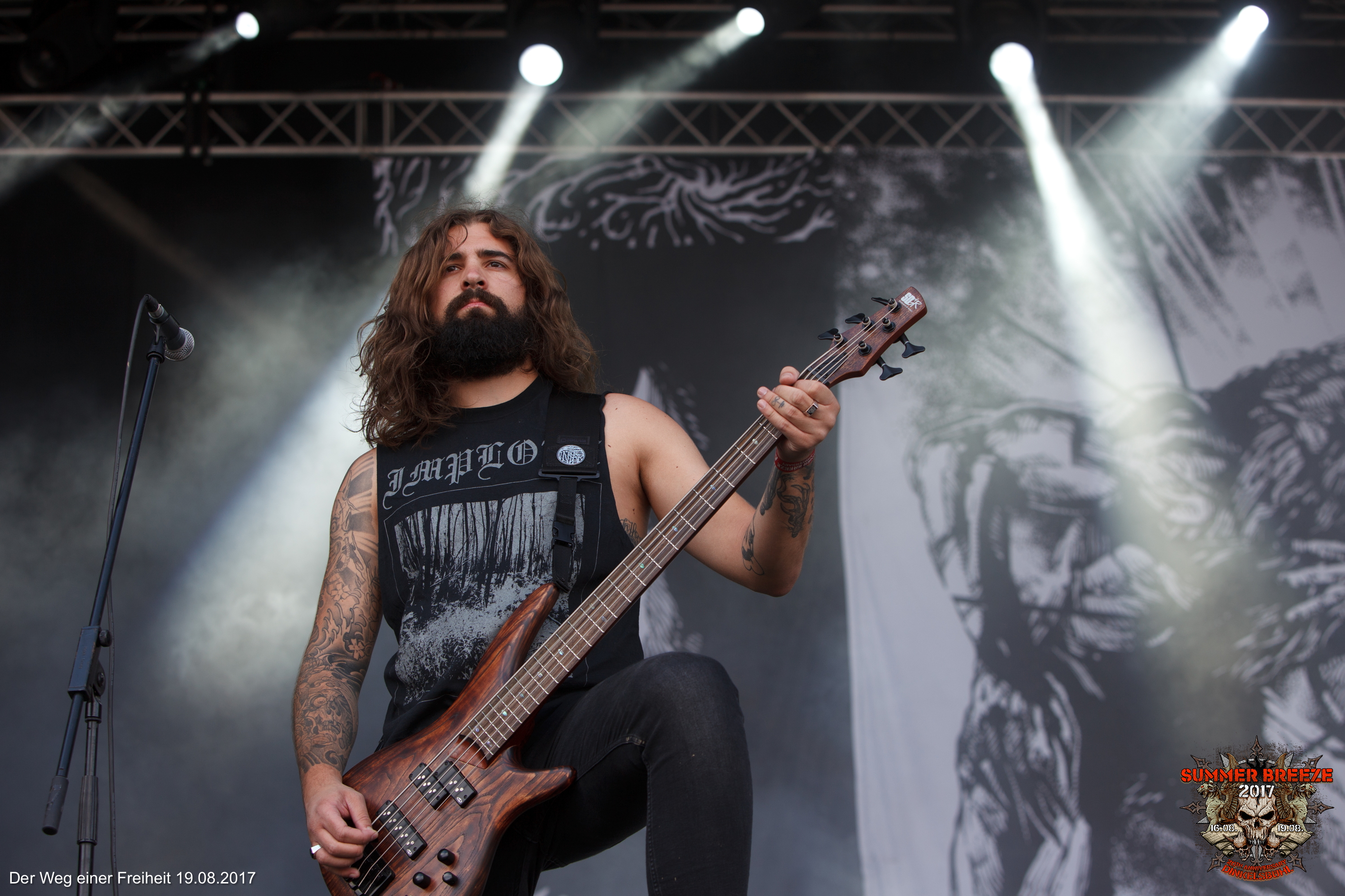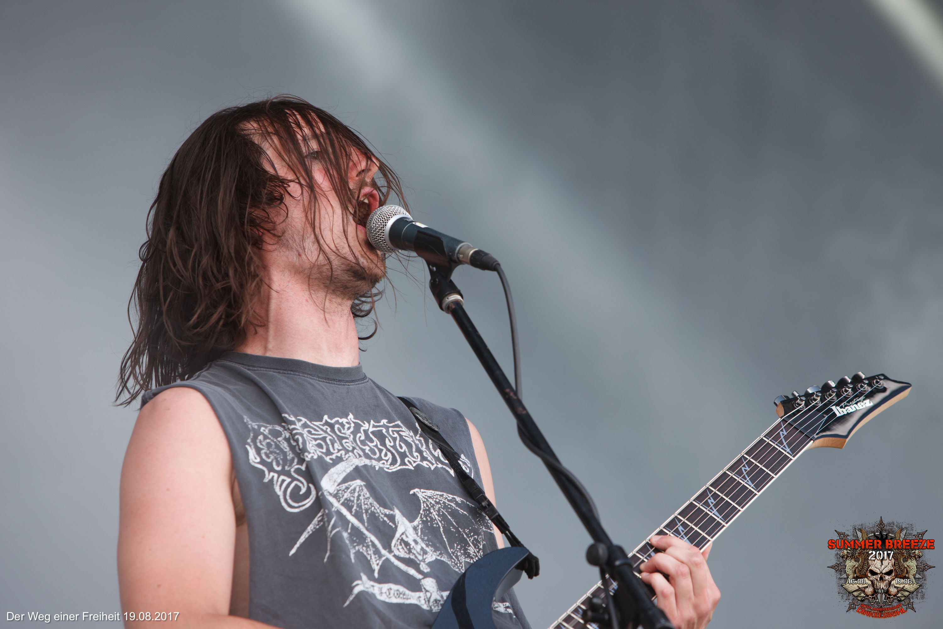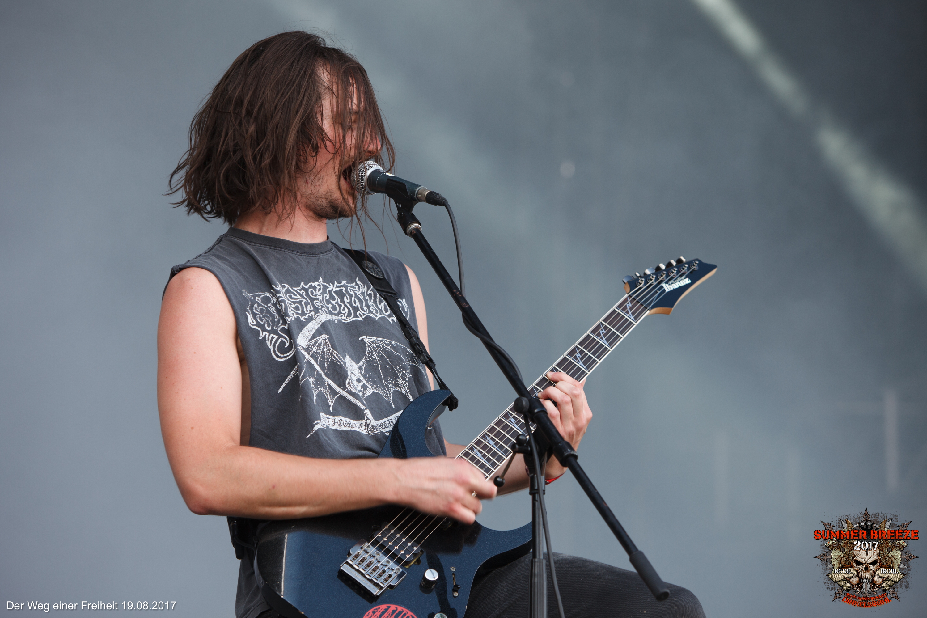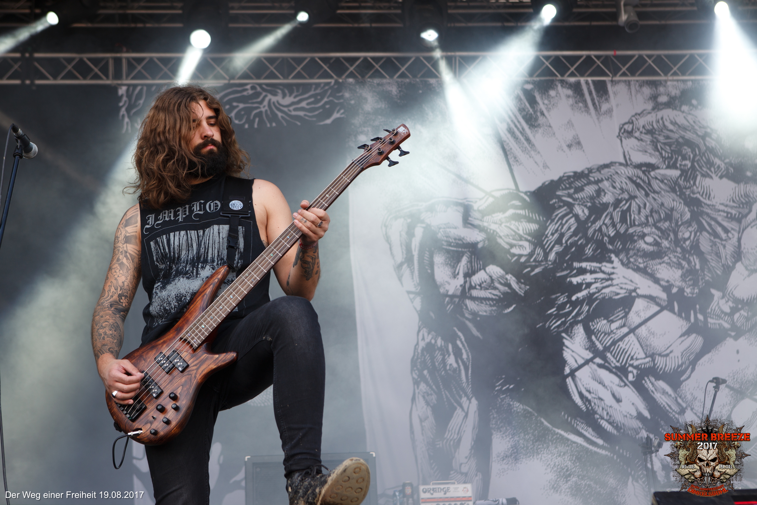 Wer ob des fehlenden Logos auf dem Backdrop ratlos war, wer da eigentlich am Samstagnachmittag den melodischen Black Metal-Reigen auf den Platz vor der T-Stage herniederregnen ließ, dem wurde von einem vorausschauenden Fan geholfen. „Der Weg Vong 1 Freiheit“ prangte da in Eddinglettern geschrieben auf einem aus der Menge gereckten Pilskarton in Anlehnung an die berühmten Memes. Verständlicher und grammatikalisch korrekter ging es dagegen auf der Bühne zu, als DER WEG EINER FREIHEIT in die offizielle Releaseshow ihres neues Albums „Finisterre“ einstiegen. Bei drückendem Sound mit vielen herrlich trümmernden Double-Bass-Passagen, perlenden Leadbögen und schön atmosphärisch schrammelnden Riffs standen die Würzburger trotz Licht-und-Schatten-Show des Wetters definitiv auf der Sonnenseite. Auf Stage Acting legten die vier Herren dabei nicht besonders viel wert, die Ansagen kamen sogar fast ein wenig mürrisch daher. Aber solcher Art Ablenkung brauchte es auch gar nicht, der variantenreiche Black Metal hielt mit häufigen Wechseln zwischen verträumten Clean- und feisten Blast-Passagen schon genügend bei der Stange. Das in ordentlicher Stärke angetretene Publikum schien mit mittlerweile drei Tagen Festival in den Knochen und den erneut warmen Temperaturen ein wenig gelähmt aber wer sagt denn, dass das zwischen den Songs aufbrandende Meer aus emporgereckten Hörnern kein guter Zuspruch ist. Vor dem letzten Song „Zeichen“ sprach Fronter Nikita Kamprad noch den bereits erfolgten Wechsel am Bass von Sascha zu Nico an, natürlich nicht ohne sich unter dem Jubel der Fans bei Sascha, der mittlerweile hinter den Kulissen für die Band tätig ist, für die bisherige Zeit zu bedanken. Nach diesem Auftritt kann auch für die neue Besetzung nur gelten: auf die nächsten mindestens acht Jahre DER WEG EINER FREIHEIT! So vong Erfolg her.