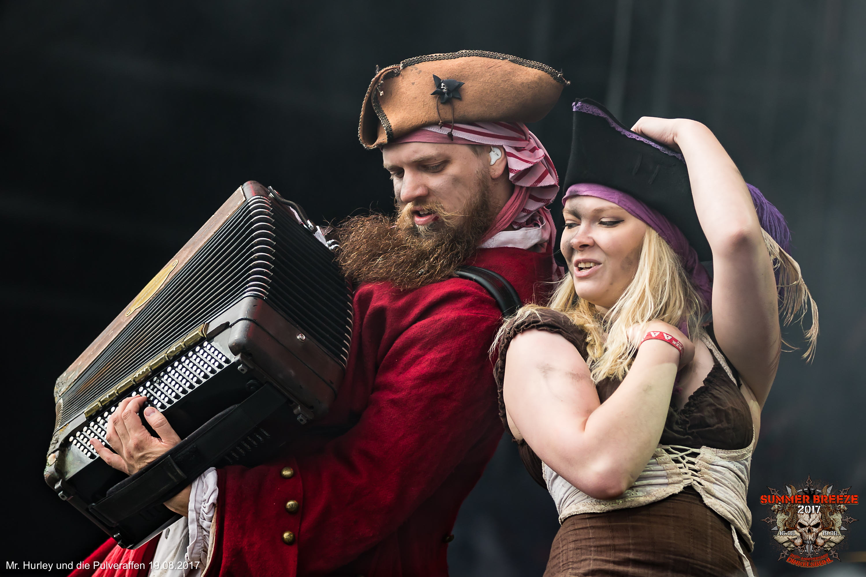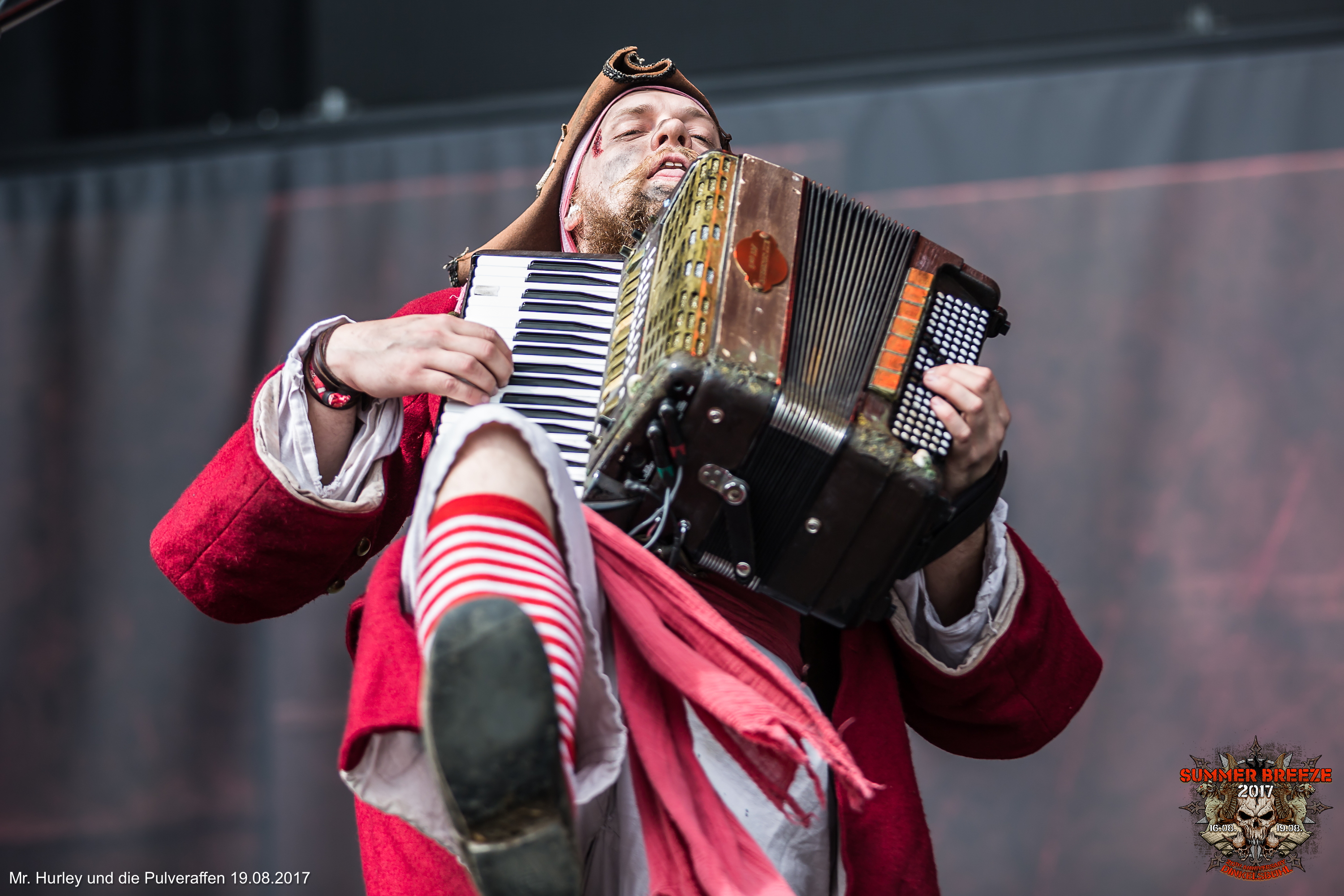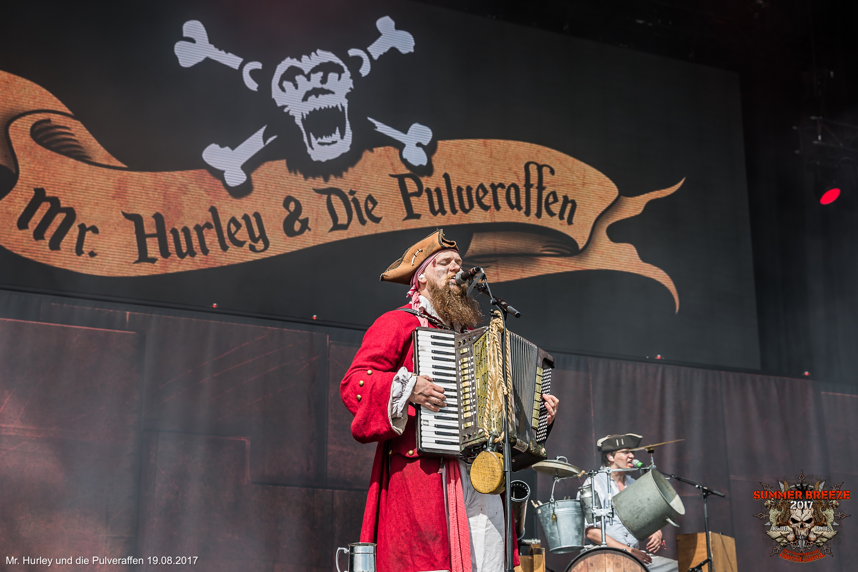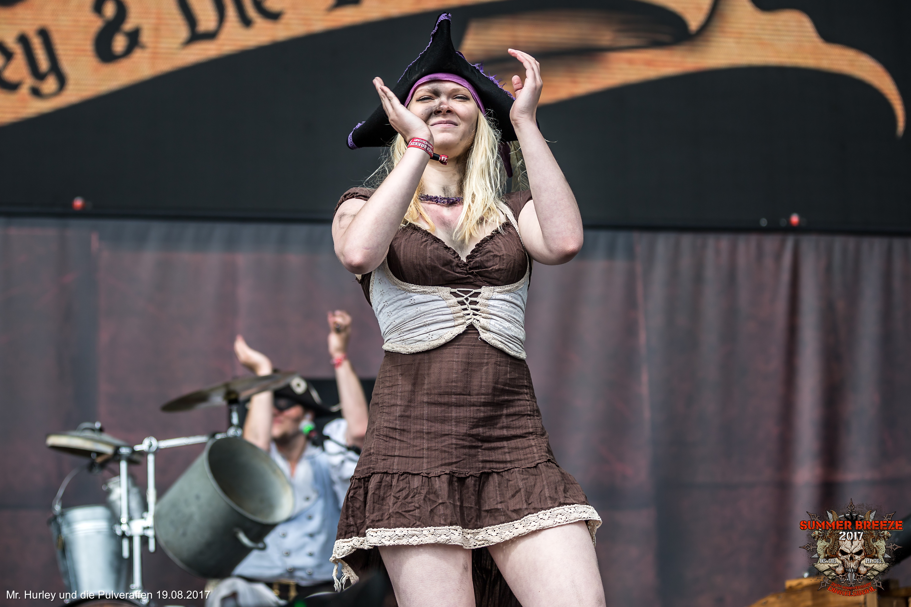 Von der karibischen Insel Osnabrück kamen MR. HURLEY & DIE PULVERAFFEN direkt auf die Main Stage gesegelt und ließen mit ihrem Aggro-Shanty so manch ein Tanzbein im Publikum schwingen. Nicht nur kam dieses in beeindruckender Anzahl vor die SUMMER BREEZE Stage, es feierte eine rauschende Party zu den akustischen Klängen und ließ dabei nicht nur im übertragenden Sinne so manch eine Sonne aufgehen. Tatsächlich lachte diese über dem vom Wetter des vorangegangenen Tages gezeichnete Infield und hob so die ohnehin ausgelassene Stimmung in ungeahnte Höhen. Das Publikum zeigte eine für die Uhrzeit beispielhafte Dynamik, inklusive Polonaise, Ringelpietz und obligatorischem Crowdsurfing mit gezücktem Plastiksäbel im Anschlag. Der „Plankentanz“ animierte zur allgemeinen Morgengymnastik, welche die werte Pegleg Peggy auf der Bühne vortanzte. Und auch sonst herrschte eine rege Beteiligung beim textsicheren Publikum, das einen Großteil des Sets im Schlaf mitbeten konnte. Höhepunkt des Auftrittes war, wie üblich bei MR. HURLEY & DIE PULVERAFFEN, das Pöbel-Solo von Buckteeth Bannock bei „Ach ja!?“ Auch ließ sich das Publikum die Bitte abnehmen, die Veröffentlichung des kommenden Albums mit dem Hashtag #HurleyindieCharts zu unterstützen, währenddessen die Band auch zur großen Danksagung an alle Beteiligten auf, vor und hinter der Bühne ausholte. Entsprechend euphorisch und laut waren die „Zugabe“-Rufe, die dem Rausschmeißer „Blau wie das Meer“ folgten, die jedoch leider unerfüllt bleiben mussten.