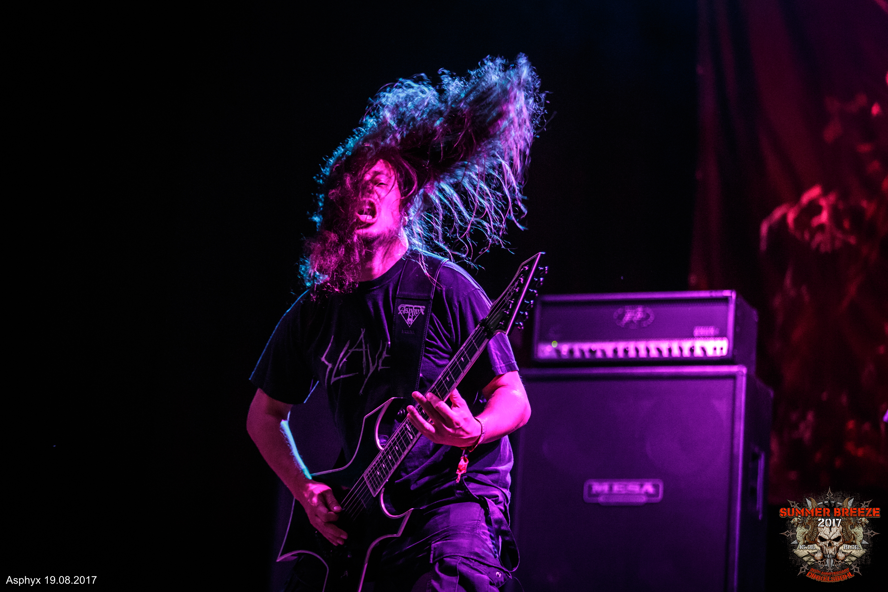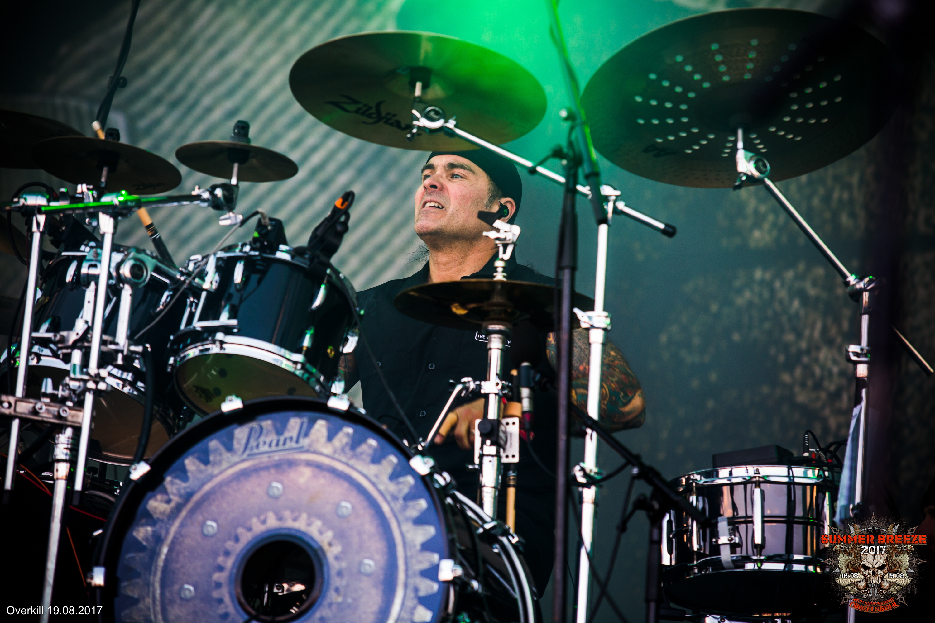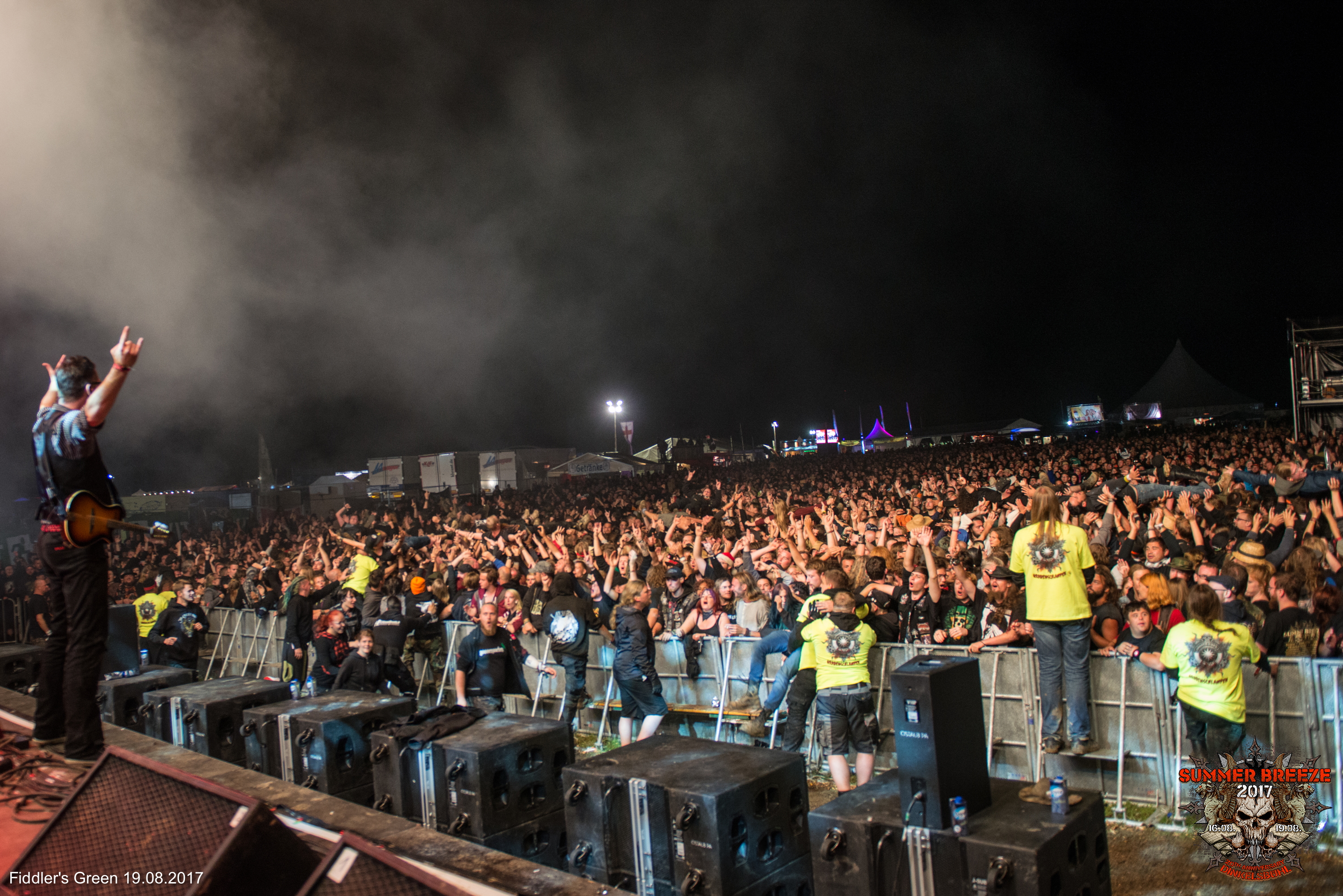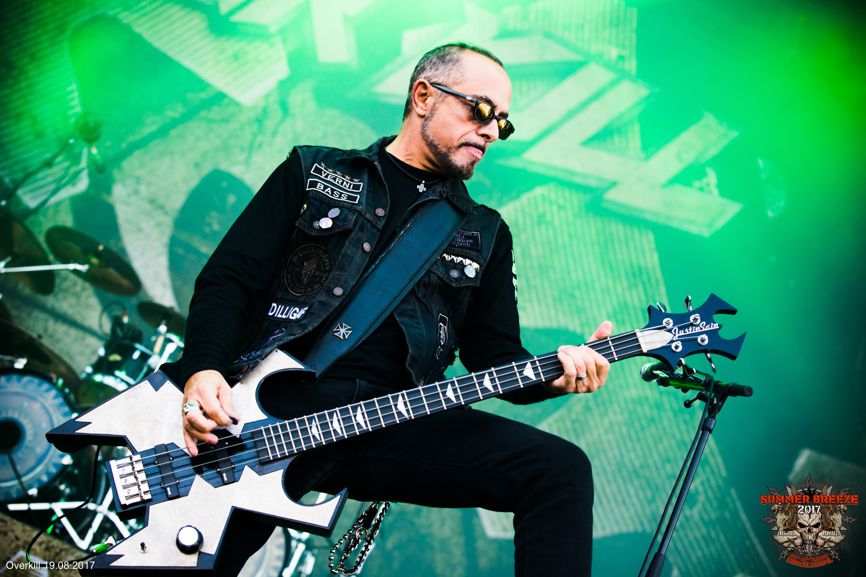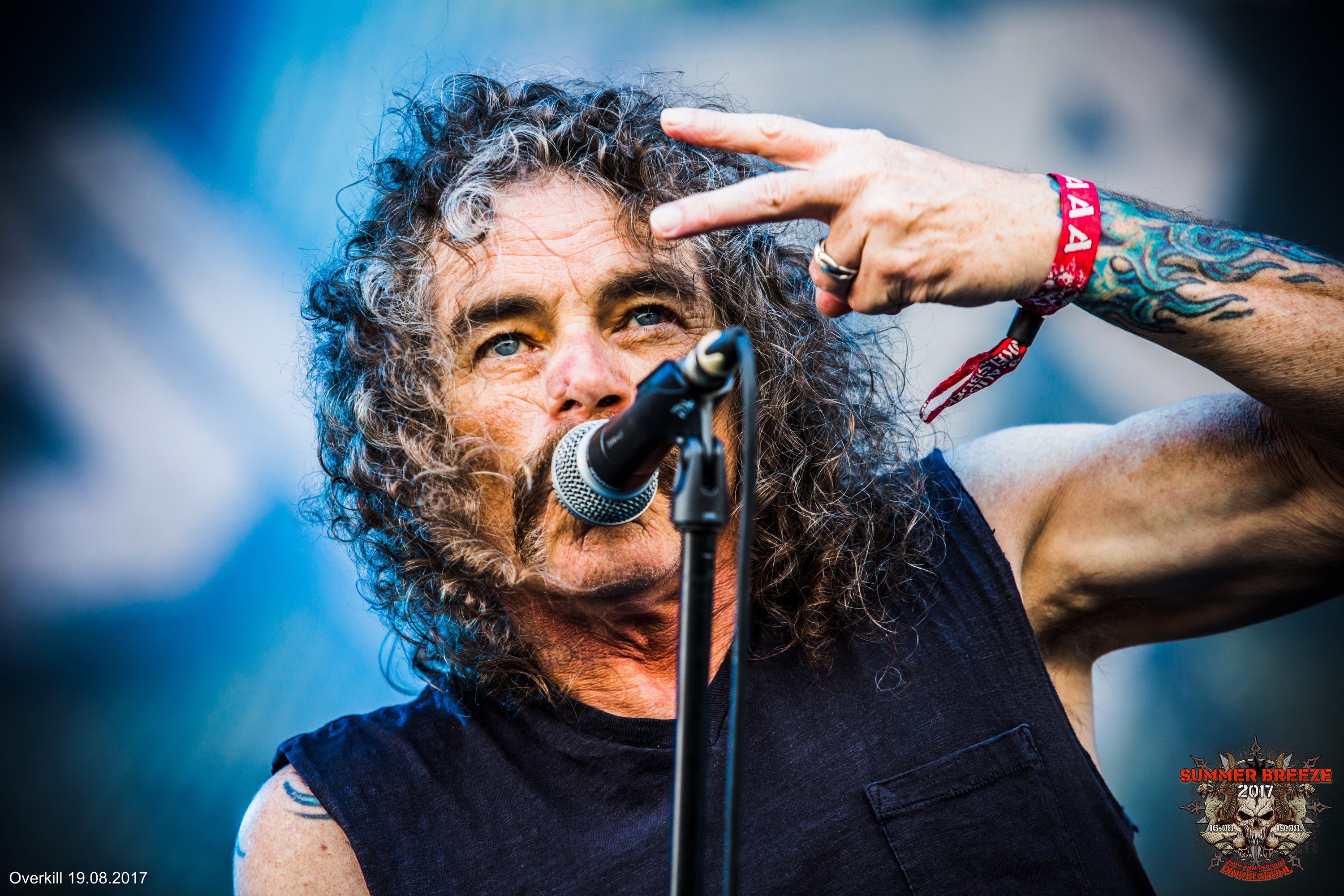 Für die nächste Stunde stand auf der Hautbühne eine veritable Lehrstunde in Sachen Thrash Metal auf dem Plan. OVERKILL gaben ihr SUMMER BREEZE-Debut. Den Einstieg lieferte die „Mean Green Killing Machine“ vom aktuellen Album „The Grinding Wheel“. Wobei die Band auf das ausufernde Intro der Studioversion verzichtete und direkt in die Vollen ging. Bereits als zweiten Song bescherten sie ihren Fans die Mitgröl-Nummer „Rotten To The Core“. Einen der größten Hits so früh zu verbraten, zeugte von gesundem Selbstbewusstsein. Die restliche Setlist brauchte sich aber nicht zu verstecken. OVERKILL kredenzten ihren Fans einen gelungenen Mix aus Klassikern und Stücken neueren Datums. Und das Publikum ging mit. Egal ob es „In Union We Stand“ oder „Together! Forever! Ironbound!“ hieß, jeder einzelne Song wurde mit großem Applaus belohnt. Auf „We Don’t Care What You Say!“ antworteten die Fans ohne Aufforderung mit dem obligatorischen „Fuck You!“. Das The-Subhumans-Cover bildete den traditionellen Abschluss einer – wie immer – fantastischen OVERKILL-Show.