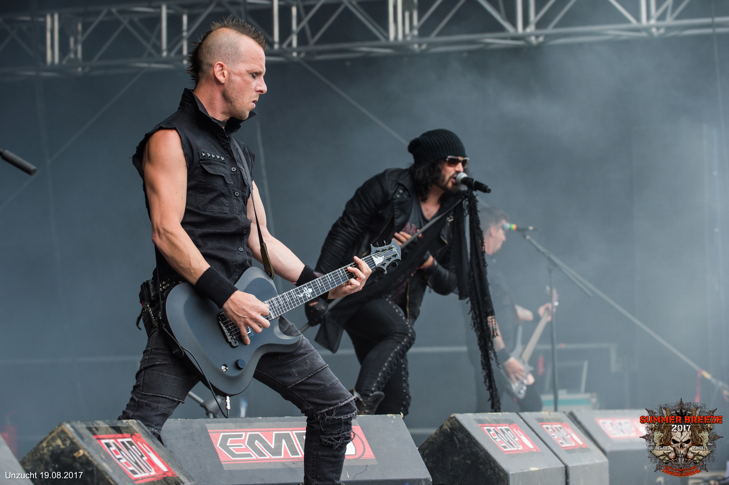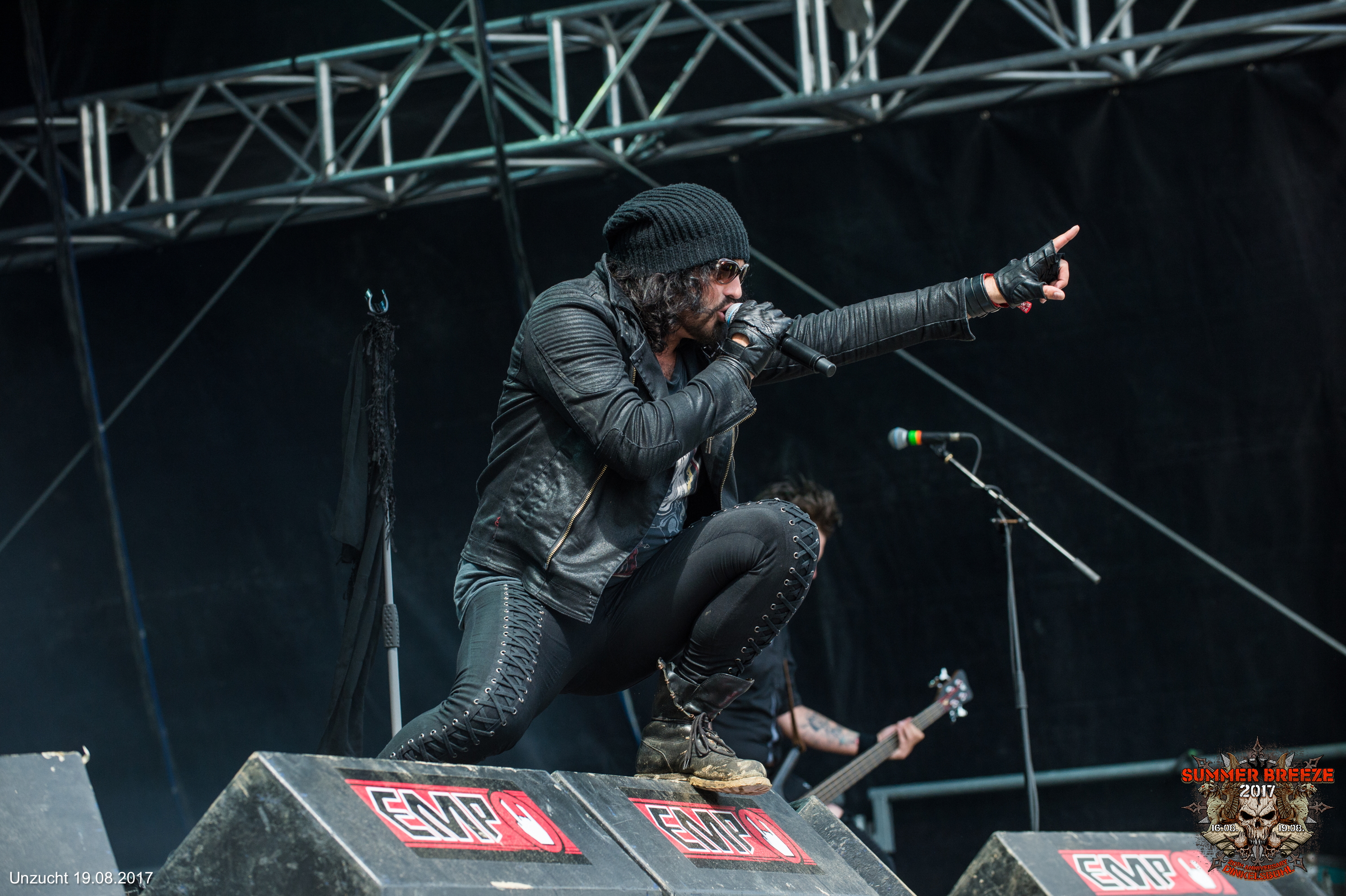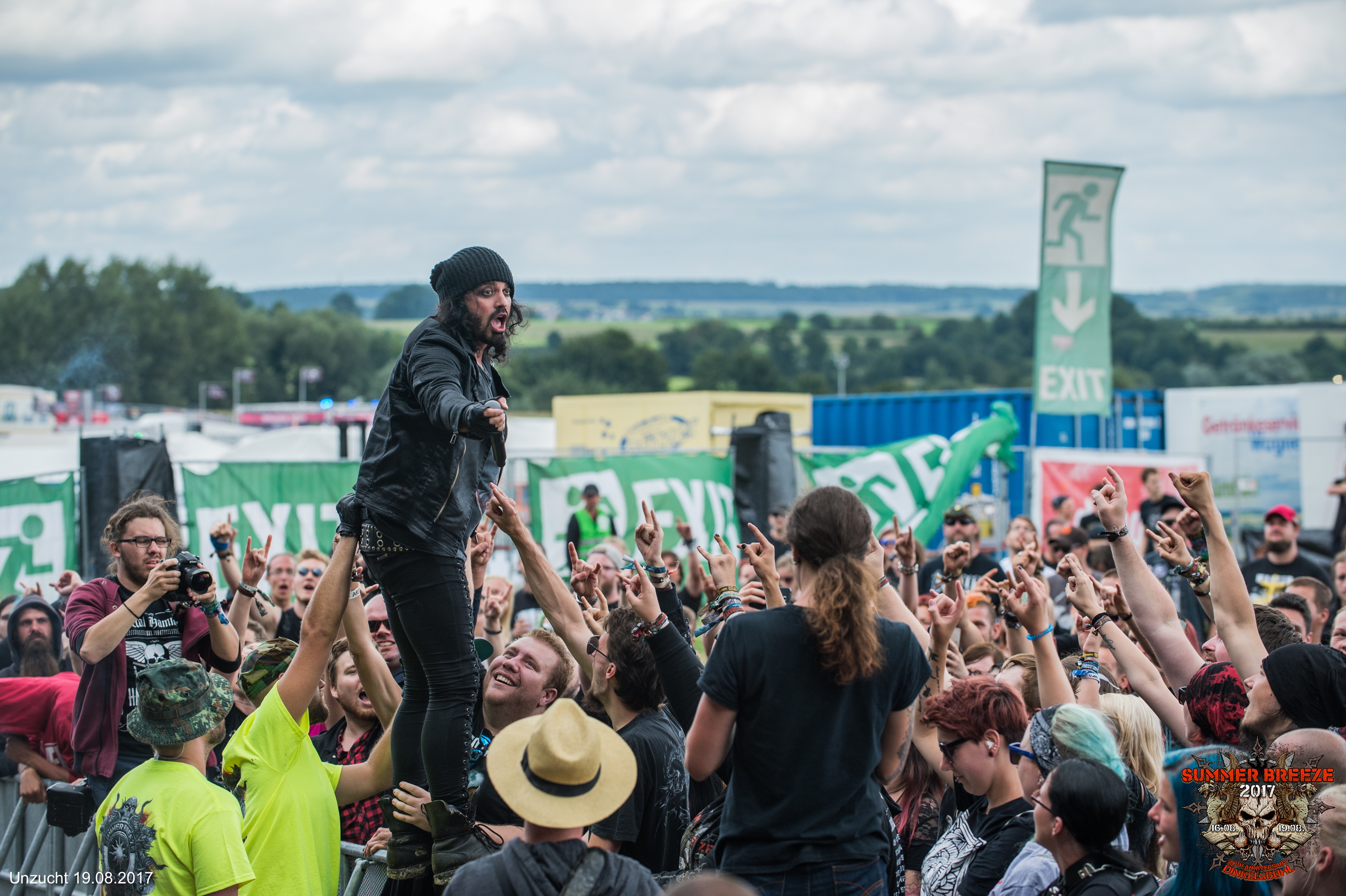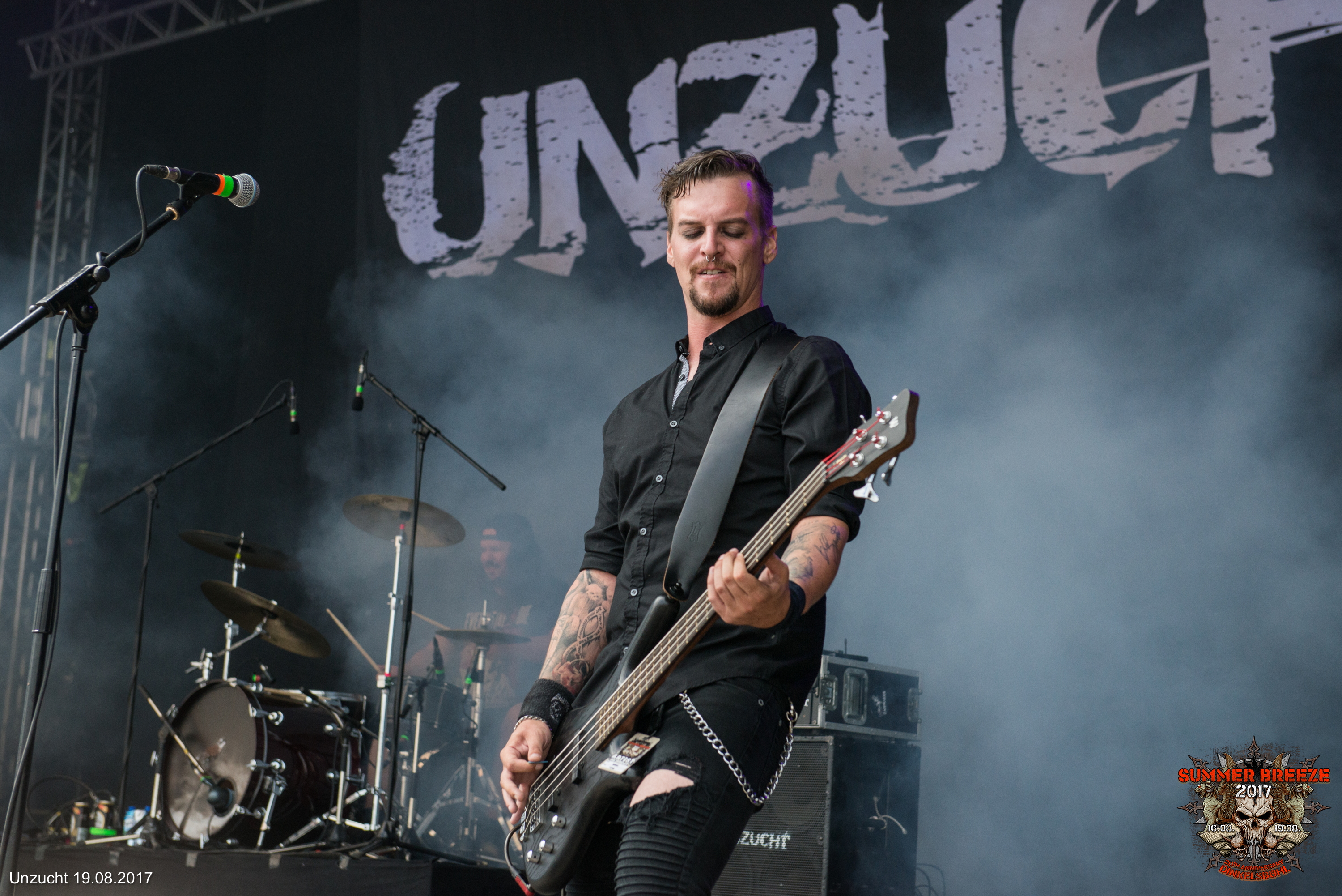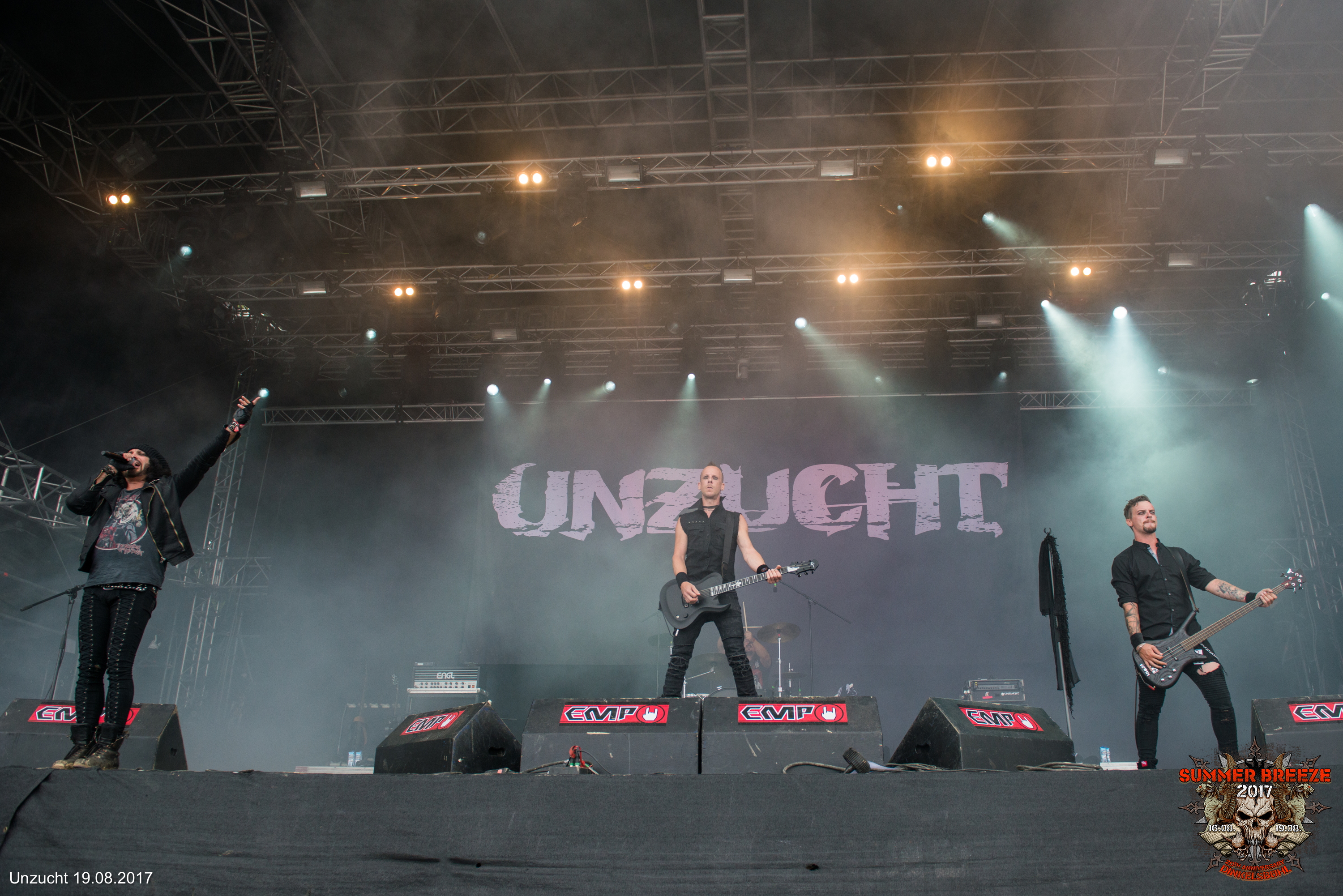 Guten Morgen SUMMER BREEZE! UNZUCHT aus Hannover waren für diesen Tag als Wecktrupp für die T-Stage gebucht. Während die meisten Zuschauer offensichtlich noch recht verpennt und müde vor der T-Stage standen, hatten UNZUCHT sich, trotz angenehmen Temperaturen, auf einen einheitlichen schwarzen Dresscode festgelegt und ganz offensichtlich so richtig Lust, die müden Geister wiederzubeleben. Die Band erfüllte ihren Auftrag hervorragend. Sänger „Der Schulz“ sprang schon beim zweiten Song „Lava“ nach vorne zur Menge und mobilisierte die Besucher höchstpersönlich. Das Publikum ließ sich nicht lange bitten und demonstrierte eindrucksvoll, wie man mit Headbangen, Tanzen, Gothic-Moves und EBM-Gymnastik wach werden kann – UNZUCHT boten musikalische Untermalung, passend für jedes dieser Rituale. „Geile Scheiße, hier kann man es aushalten!“ rief „Der Schulz“ sichtlich erfreut in die Menge. Zum emotionalen Song „Zeit“ gab es dann ein beispielloses schwingendes Händemeer. Die obligatorische Frage „Habt ihr Bock auf UNZUCHT?“ durfte also mit einem eindeutigen „Ja“ beantwortet werden. Eine Band, die richtig Bock hatte und genau im richtigen Moment kam, um mit ihrer guten Laune anzustecken.
