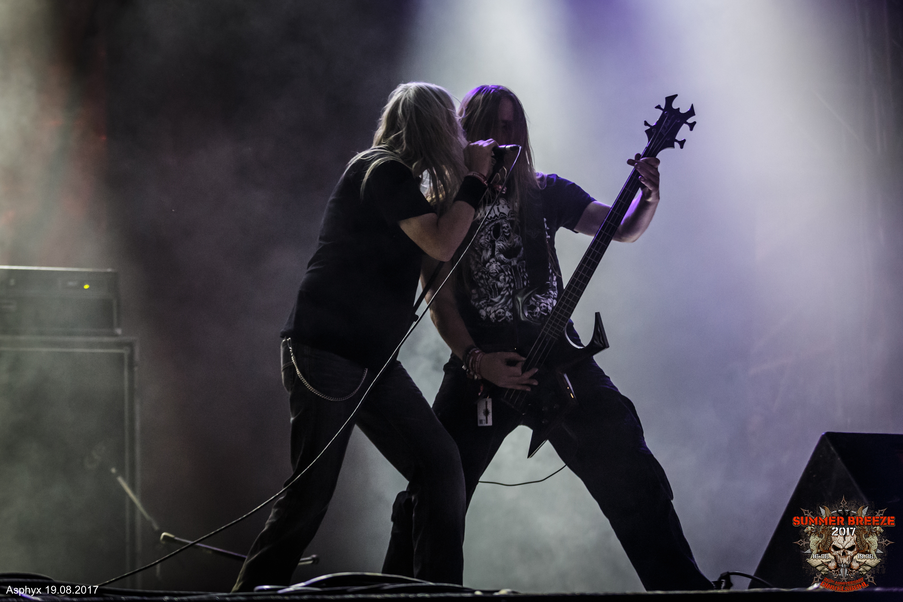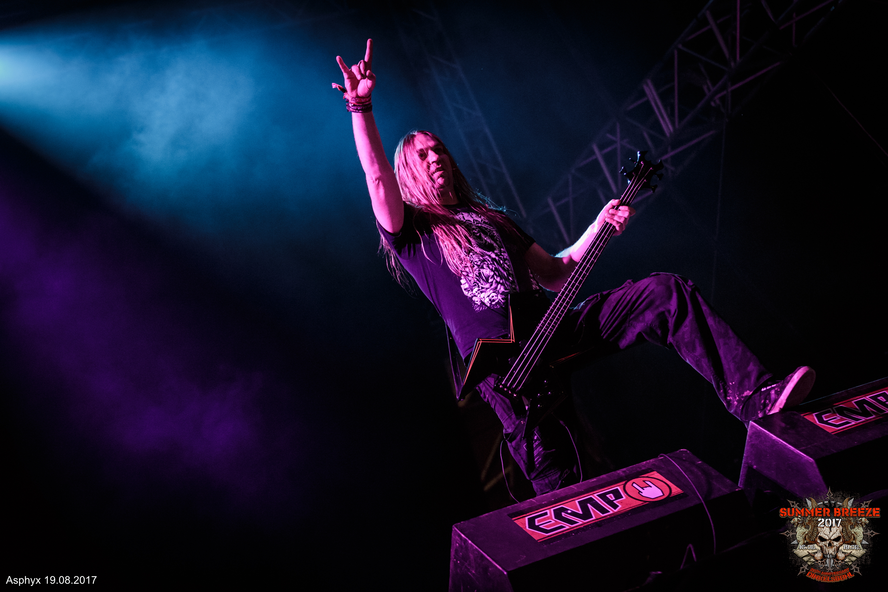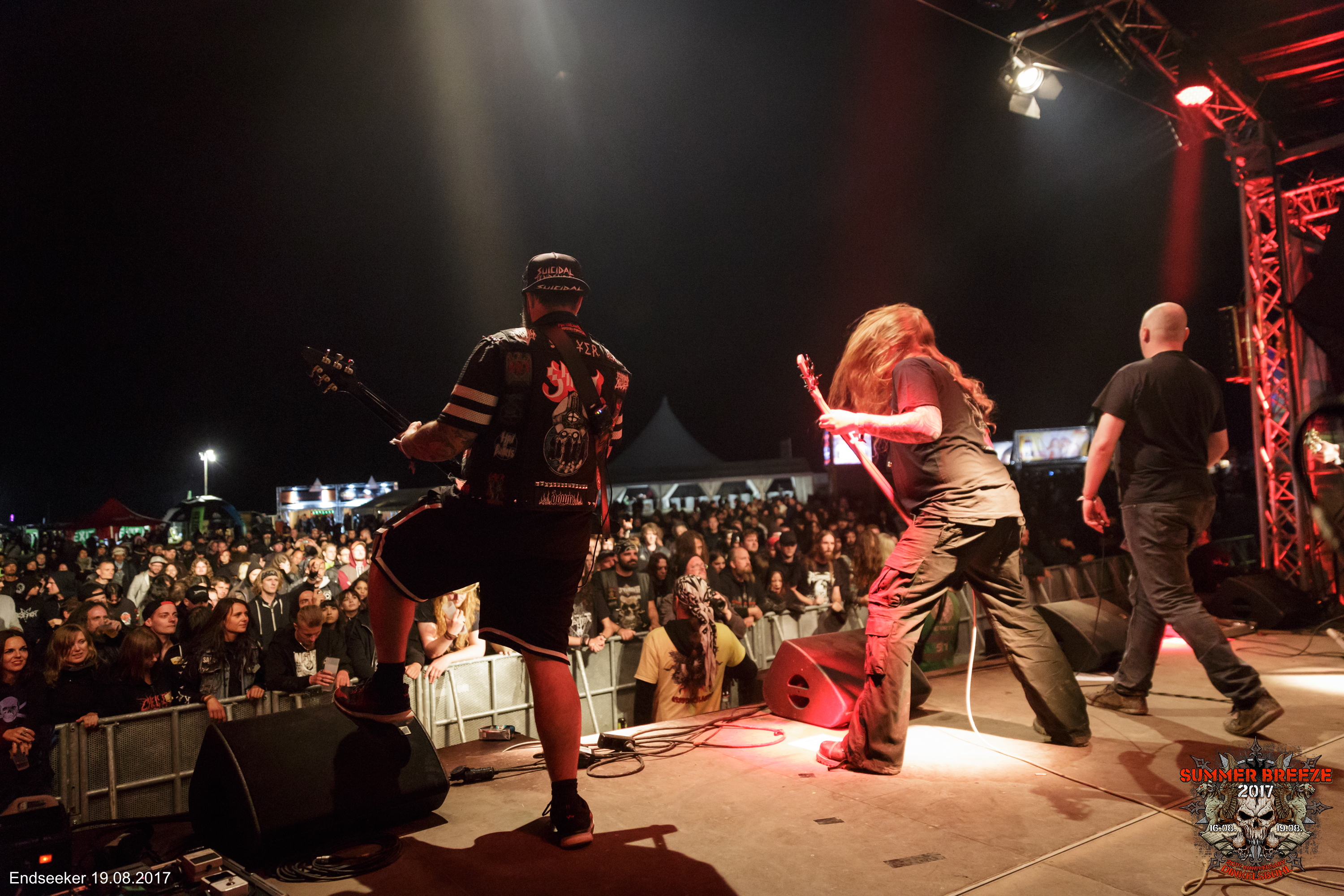 Bereits eine halbe Stunde vor Konzertbeginn trieb eine rauchige Stimme beim Bühnenumbau Schabernack mit dem Publikum, während Heaven Shall Burns Echo zu vernehmen war. Martin van Drunen war redselig und zu Späßen aufgelegt, beste Voraussetzungen also für einen folglich hammermäßigen Auftritt. Und der folgte bei der (vorwiegend) holländischen Dampfwalze unausweichlich und unerbittlich! Ab dem ersten Takt, den Stephan „Tormentor“ Hüskens angab, rotierten die Propeller – auch bis in die letzten Ecken irgendwo beim Cocktailstand. Der Sound war umwerfend gut, so dass die sägenden Gitarren schnörkellos von schnell auf langsam schalten und die ersten fünf Reihen mit unbarmherziger Intensität umwalzen konnten. Dabei haben sie sich an diesem Abend für eine eher schnellere Gangart entschieden und die Teilnehmer der kleinen Circle Pits hörten sicherlich nur zwischendurch kurz auf, um den Drehwurm zu bekämpfen. Spätestens als dem Platz der „Deathhammer“ um die Ohren flog, wurde es in den vorderen Reihen nochmal kuscheliger, da immer mehr Zuschauer zur T-Stage pilgerten und das nicht ohne Grund: Zu guter Letzt waren bei „Last One On Earth“ wirklich alle Fäuste in der Luft. Die Jungs haben wieder einmal alles richtig gemacht!