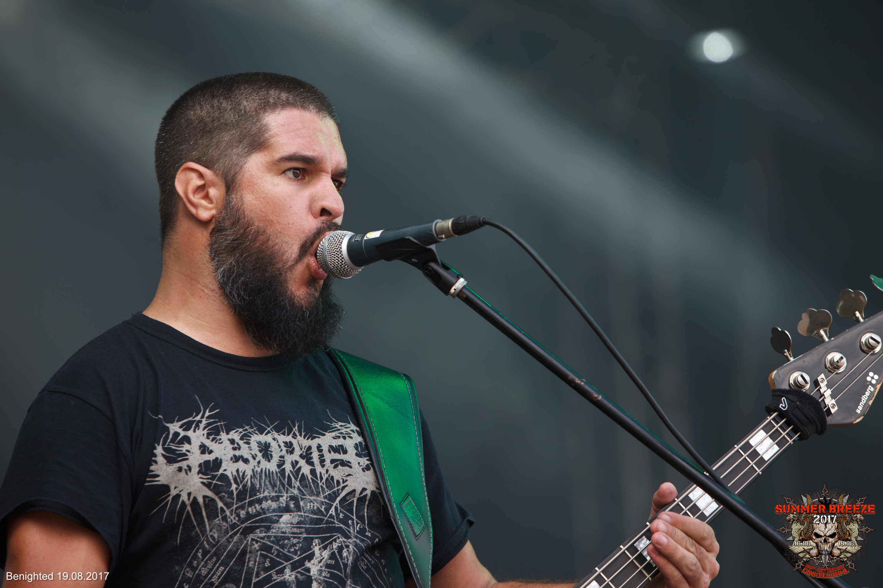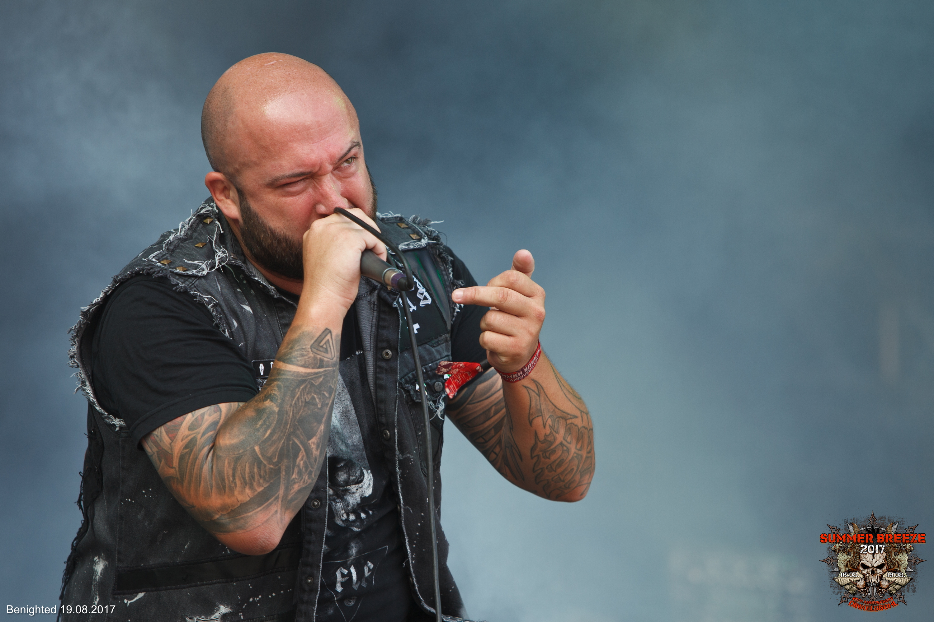 Wer jetzt immernoch nicht wach war, konnte mit den französischen Knüpplern von BENIGHTED einen zweiten Versuch wagen. Das Intro „Hush Little Baby“ ließ schon erahnen, dass es jetzt sehr sehr derbe werden würde. Sänger Julian Truchan schien zumindest äußerst wach und stürmte barfuß die T-Stage. Mit der Wucht eines Überfallkommandos legten die Herren amtlich mit „Reptilian“ los. Einige Anwesende schienen erst überfordert und aufgrund der ungebremsten Brutalität irritiert, allerdings bildet sich ziemlich schnell ein harter Kern, der BENIGHTED bedingungslos mit Pits abfeierte. Die hatten einen stolzen Anfahrtsweg von 12 Stunden hinter sich gebracht, was ganz offensichtlich nicht auf Kosten ihrer Energie gegangen war. Bei „Let The Blood Spill Between My Broken Teeth“ und „Noise“ wurde der Menge eindrucksvoll demonstriert, wie man tadellos zwischen Growls und Pig Squeals wechseln kann. Zu „Necrobreed“ wünschte sich die Band für die Dauer von 1:24 einen großen und heftigen Circlepit. Das Publikum ließ sich nicht lange bitten und tat, wie ihm befohlen wurde. „Dieser Auftritt ist für alle geeignet, die etwas Probleme mit dem wach werden haben“ fasste Sänger Julien passend zusammen. Wir legen noch einen obendrauf: wer danach immer noch nicht wach war, ist tot!