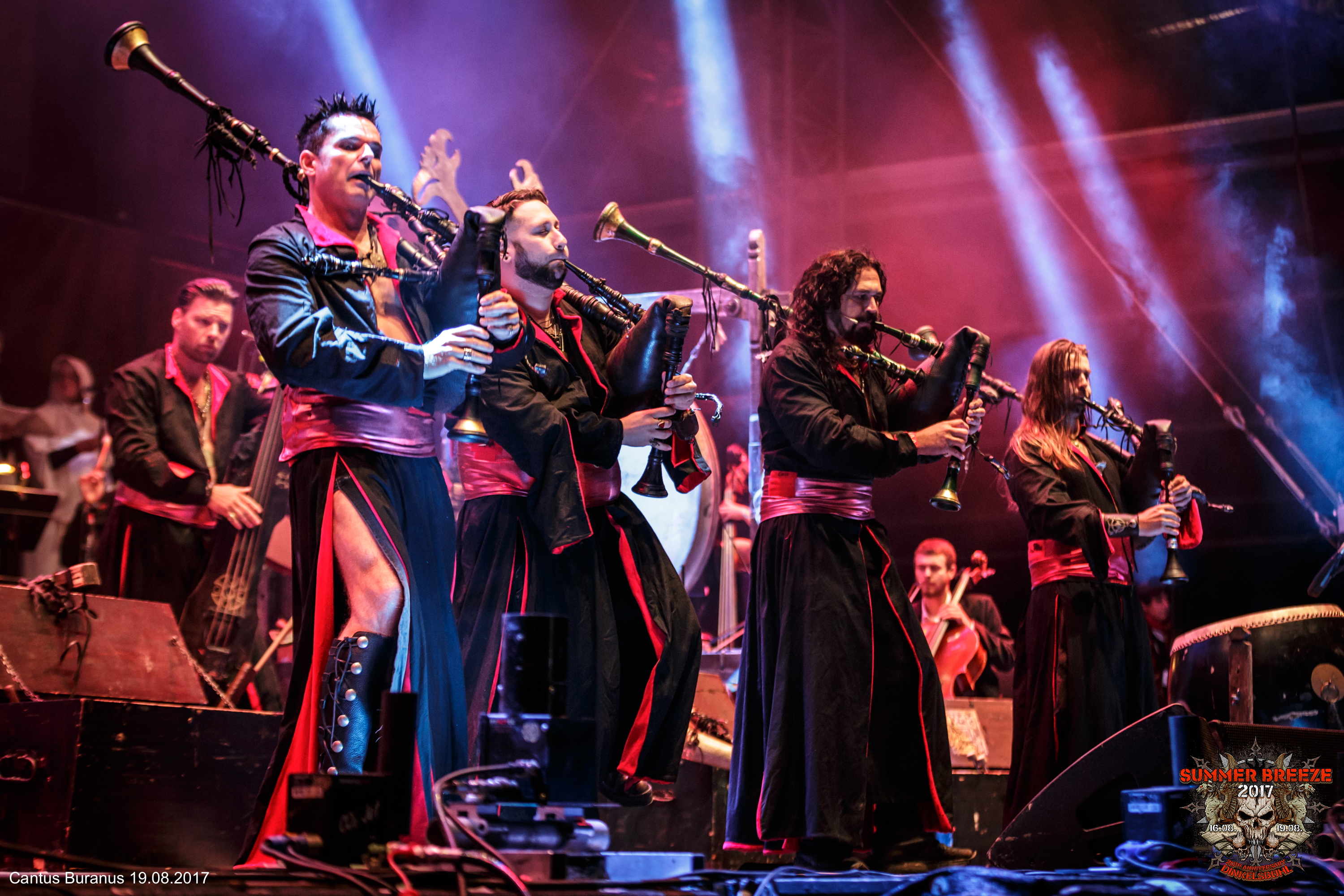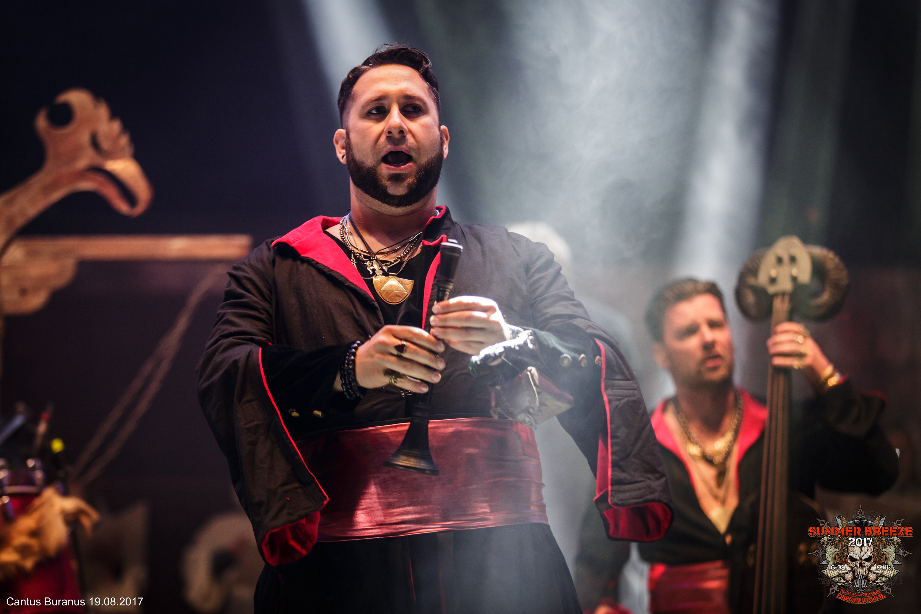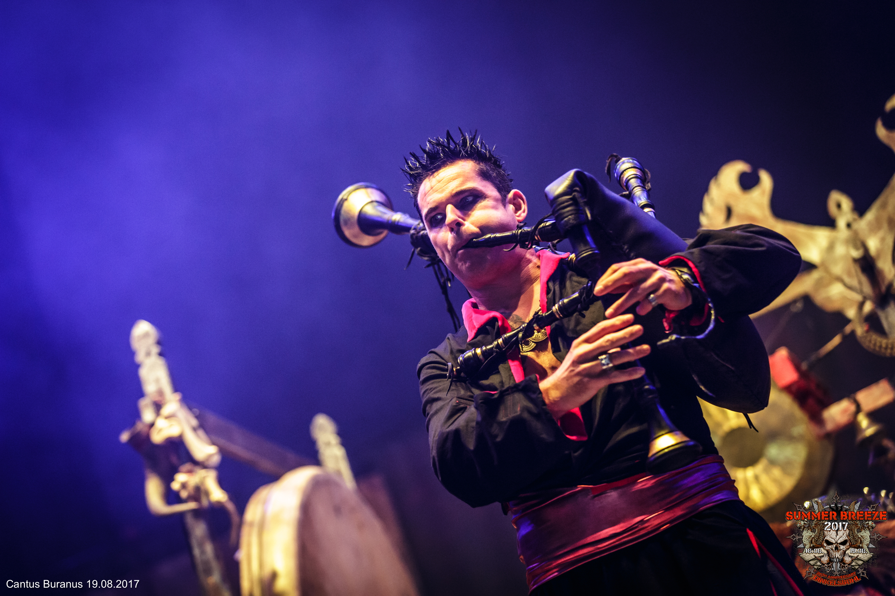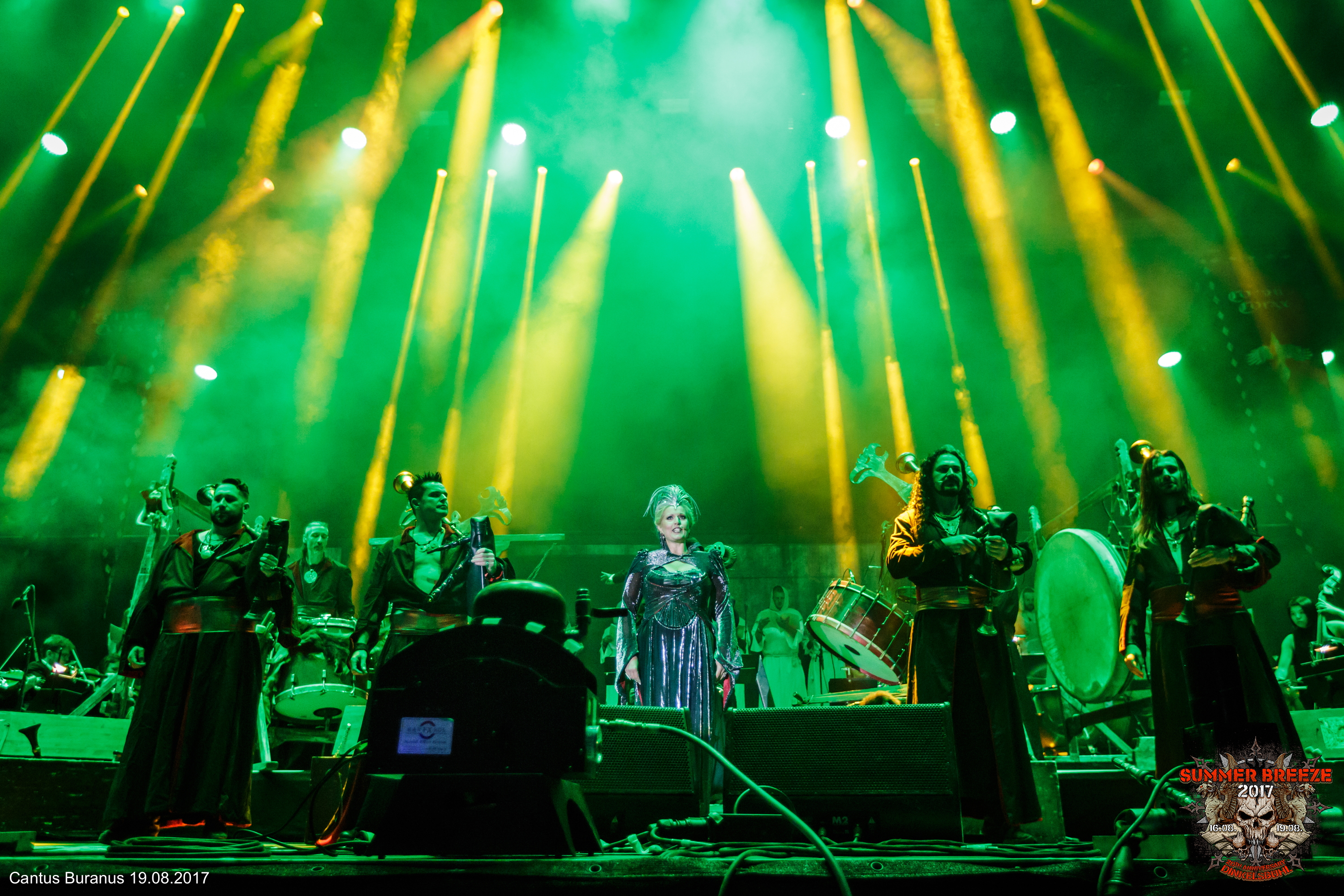 Besser konnte man die Vielfalt des SUMMER BREEZE nicht demonstrieren, denn nach Korn folgten CANTUS BURANUS mit ihrer musikalischen und äußerst ambitionierten Neuvertonung der mittelalterlichen Handschrift Carmina Burana. CANTUS BURANUS füllten die anfangs in blaues Licht getauchte Bühne im Anschluss bis zum Anschlag aus, der Aufmarsch der Akteure schien kein Ende zu nehmen und machte unmissverständlich klar, dass hier etwas Großes passieren würde. Mengenmäßig und auf die Instrumentenvielfalt bezogen, waren CANTUS BURANUS also ungekürte Sieger des Festivals und konnten die Möglichkeiten der großen Bühne komplett nutzen. Rund dreißig unterschiedliche und teilweise handgefertigte Instrumente kamen zum Einsatz, in Kombination mit dem gewaltigen Orchester entstand eine beeindruckende Klangwand. Erhaben legten sich die Mollklänge von Bläsern über den Platz und verbreiteten eine angenehm betäubende und gleichermaßen mystische Stimmung, während die mantrischen Trommelklänge die Besucher vitalisierten. So wechselten auch die Zuschauerreaktionen zwischen andächtigem Schweigen und euphorischem Klatschen im Takt der Dudelsäcke. Die Sopranistin Ingeborg Schöpf rechtfertigte ihren pompösen Einmarsch mit ihrem bezaubernden Gesang, der die Besucher in Staunen versetzte und durch imposante Feuereffekt noch zusätzlich intensiviert wurde. Mehr war hier definitiv auch mehr! Völlig ohne E-Gitarren bauten CANTUS BURANUS einen ganz eigenen Druck auf und zogen die Besucher damit zu später Stunde komplett in ihren Bann. Ein perfekt inszenierte Auftritt, der nicht nur mit Extravaganz sondern in erster Linie mit Klasse punktete und den kulturellen Horizont einiger ganz sicher erweiterte.