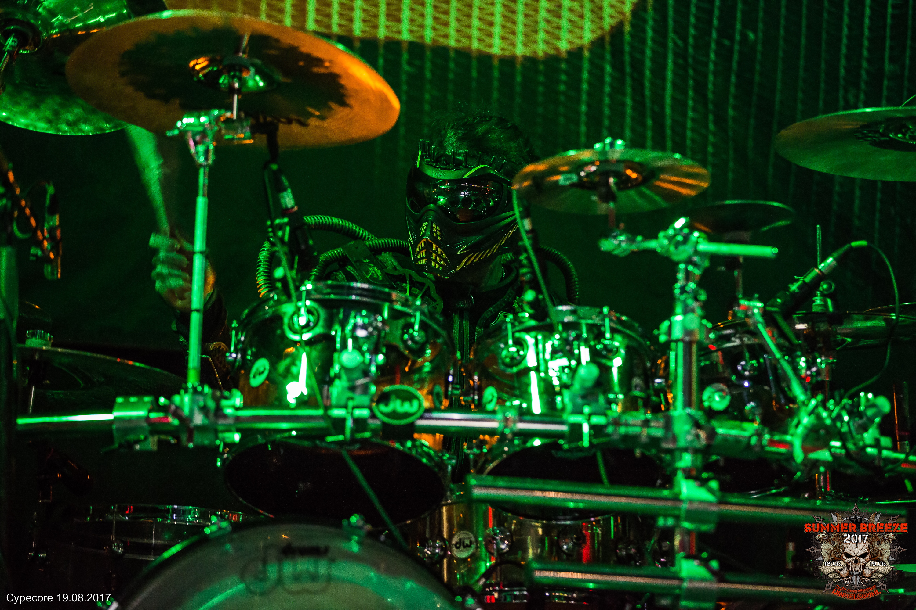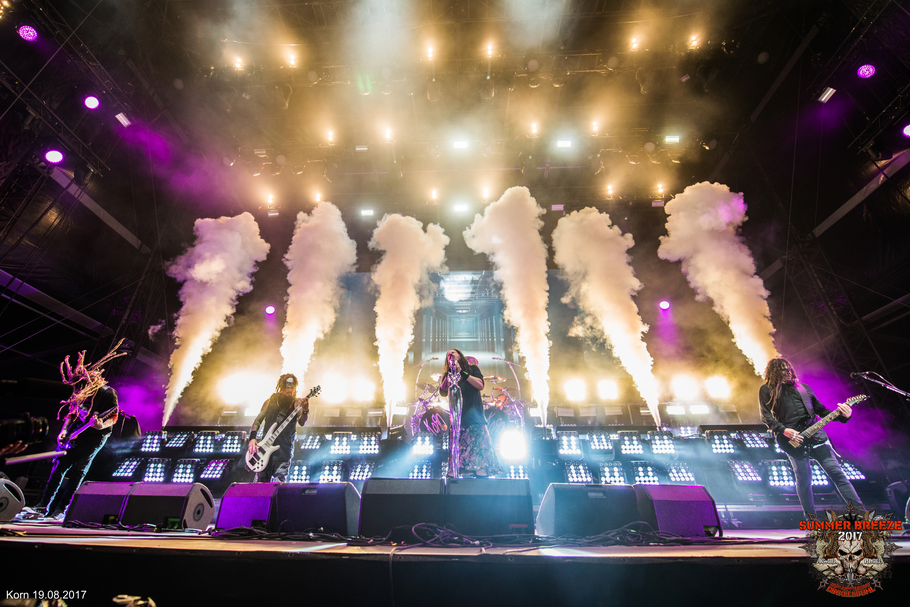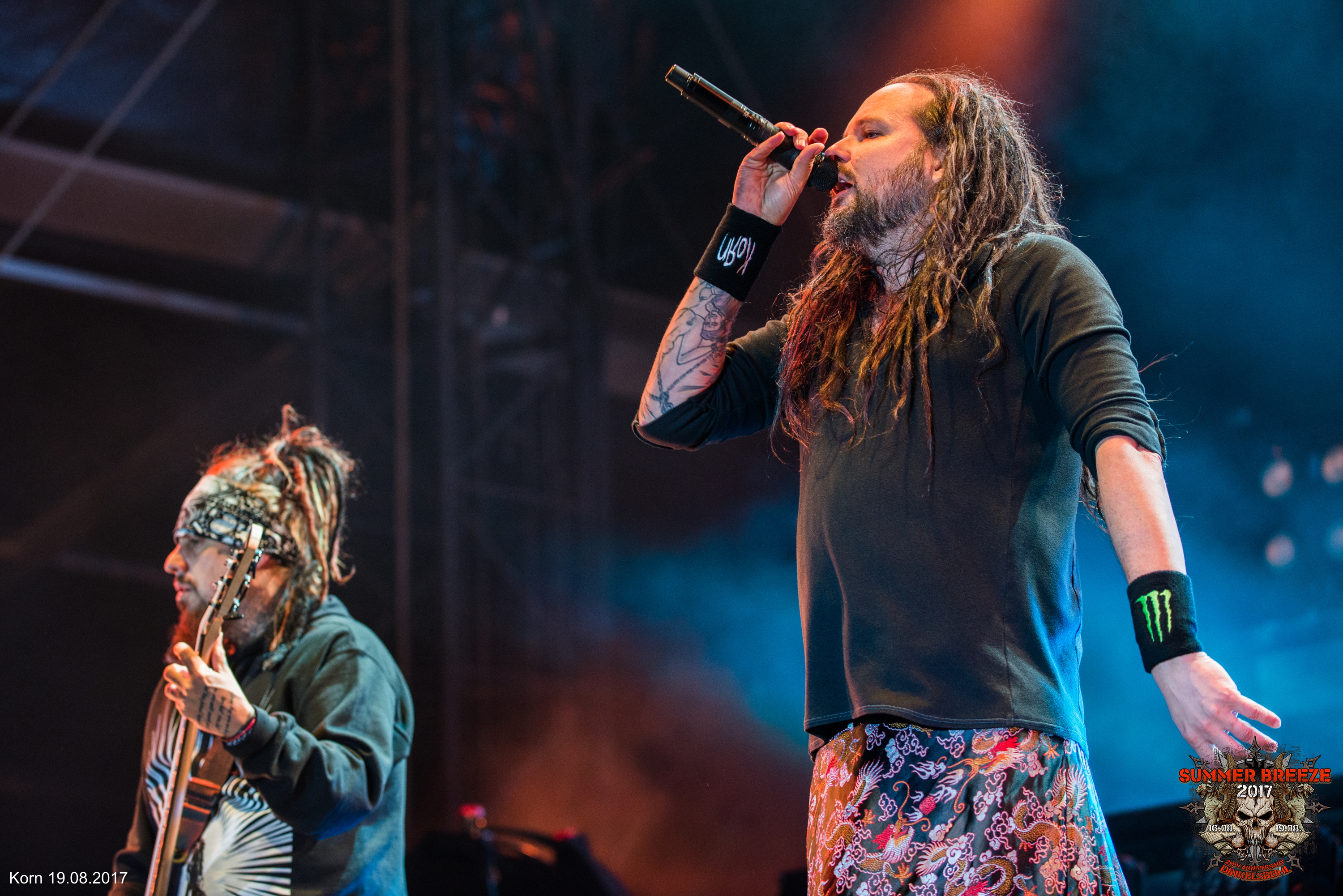 New Metal ist immer genau so lange tot, bis KORN auf den Plan treten. Untermalt von beeindruckenden Licht- und Bildeffekten, lieferten die Amerikaner eine Show der Extraklasse ab und untermauerten ihren Status als ungebrochene Szenegröße. Mit „Rotting In Vain“, vom aktuellen Album „The Serenity Of Suffering“, wurde die Sause eröffnet. KORN boten einen Querschnitt durch die komplette Diskografie, den die Zuschauer begeistert feierten und mit groß angelegten Pits würdigten. Die einzelnen Songs wurden mit atmosphärischen, passenden Intros verbunden, so dass die Show als nahtloses Gesamtkunstwerk wirken konnte. Jonathan Davis, stilecht im asiatisch gemusterten Schottenrock, trug die Lieder auf seine ganz eigene charmante und gleichzeitig irre Weise vor, während seine Kollegen ihm ein tadelloses musikalische Fundament lieferten. Nicht im Vordergrund, aber trotzdem erwähnenswert, waren die akrobatischen Einlagen von Drummer Ray Luzier. Abgesehen von einer brillianten musikalischen Leistung, krönte er seine Performance noch durch kunstvolles Drumstick hochwerfen und wieder auffangen. „SUMMER BREEZE get your motherfucking hands in the air“ oder „Everybody get the fuck up“ waren nur zwei der Aufforderungen, denen das Publikum freudig folgte. Getreu dem Motto „Zugabe muss sein, auch wenn niemand das Prinzip versteht“, verließen KORN nach einem heftig auf die Nacken drückenden „Somebody Someone“ die Bühne. Selbstredend kam die Band kurz darauf für eine Zugabe zurück und entließen die Menge erst nach einem emotionalen „4U“, dem fulminanten „Blind“ und einem wahnsinnigen „Freak On A Leash“ (O-Ton Davis: „Kick it Ray!“) in die kalte Nacht. Natürlich nicht, ohne vorher massig Plecs und signierte Drumsticks als Dankeschön in die begeisterte Menge zu werfen. Direkt im Anschluss gab es dann das beeindruckende Jubiläums-Feuerwerk.