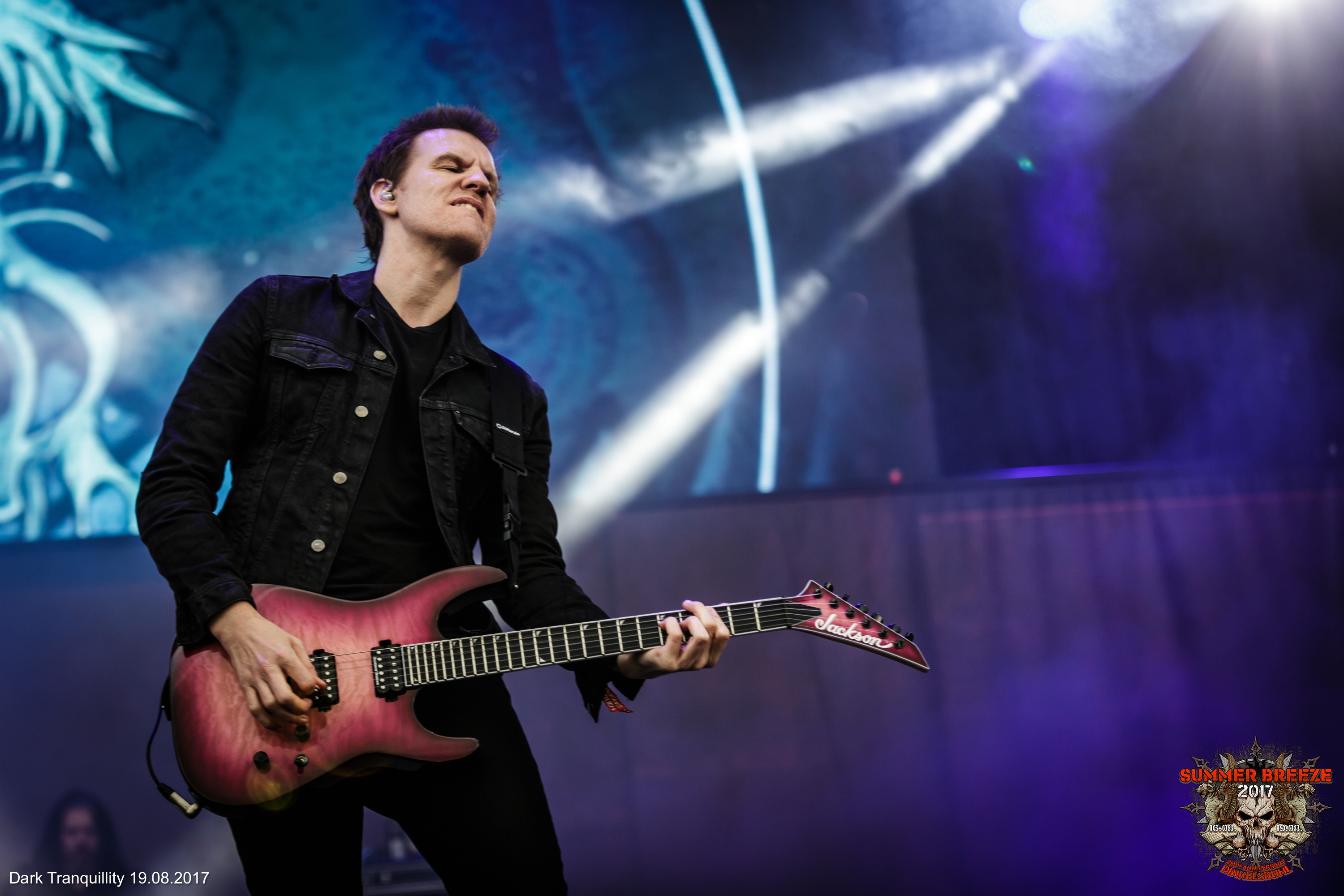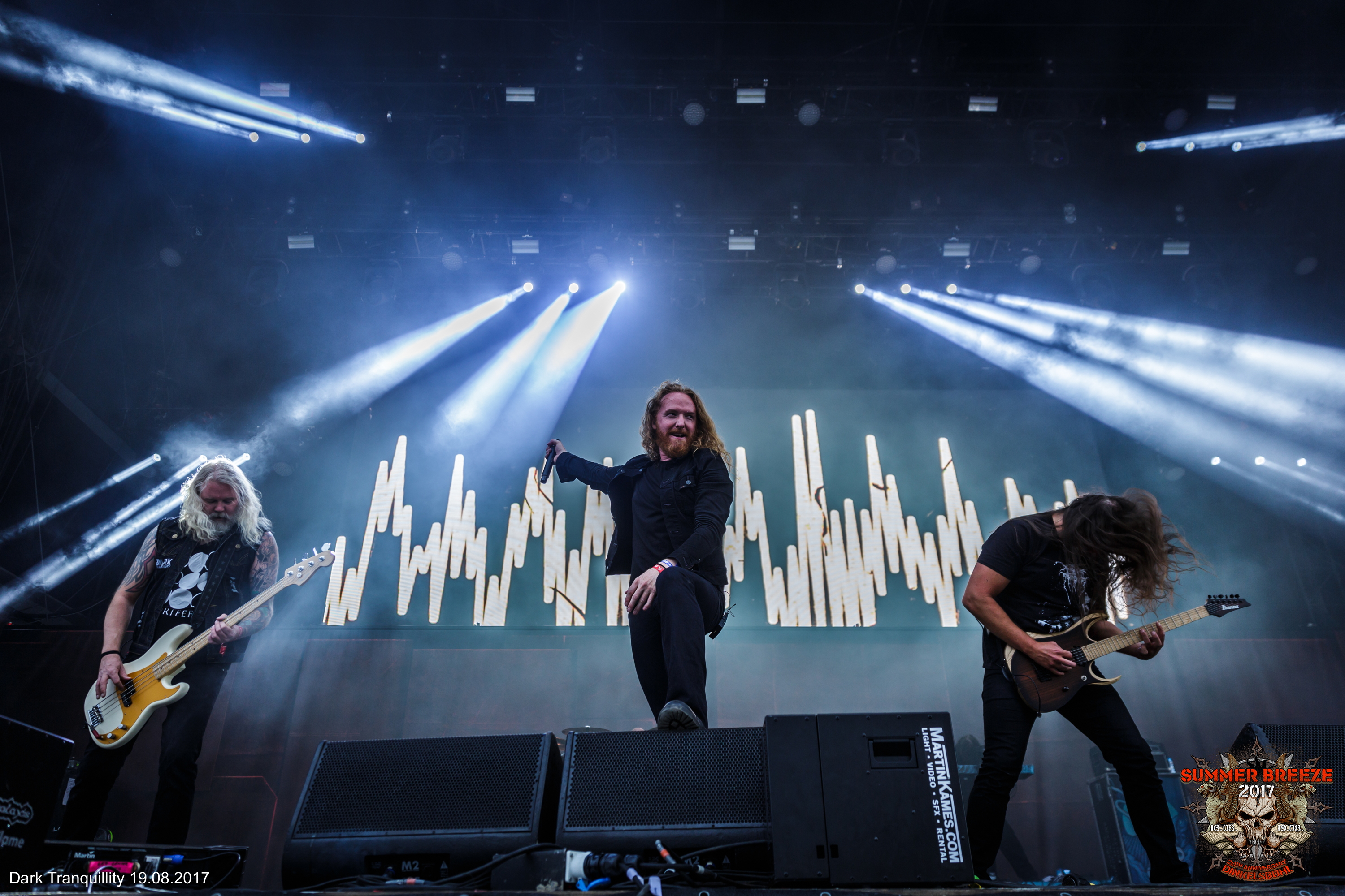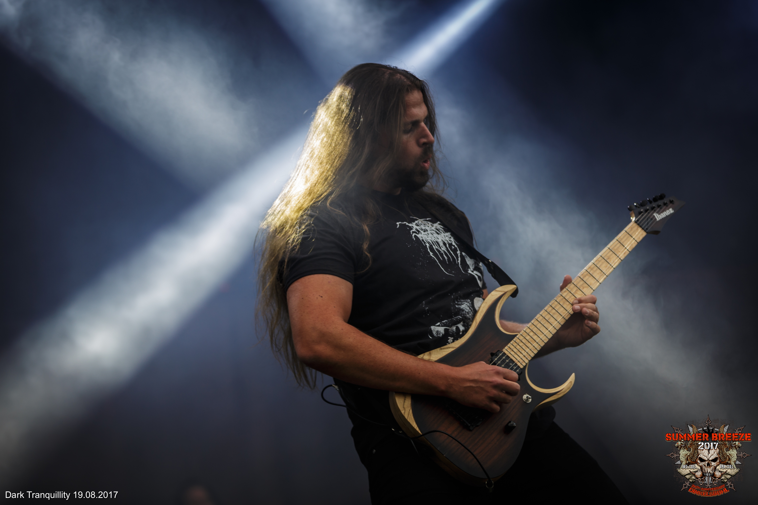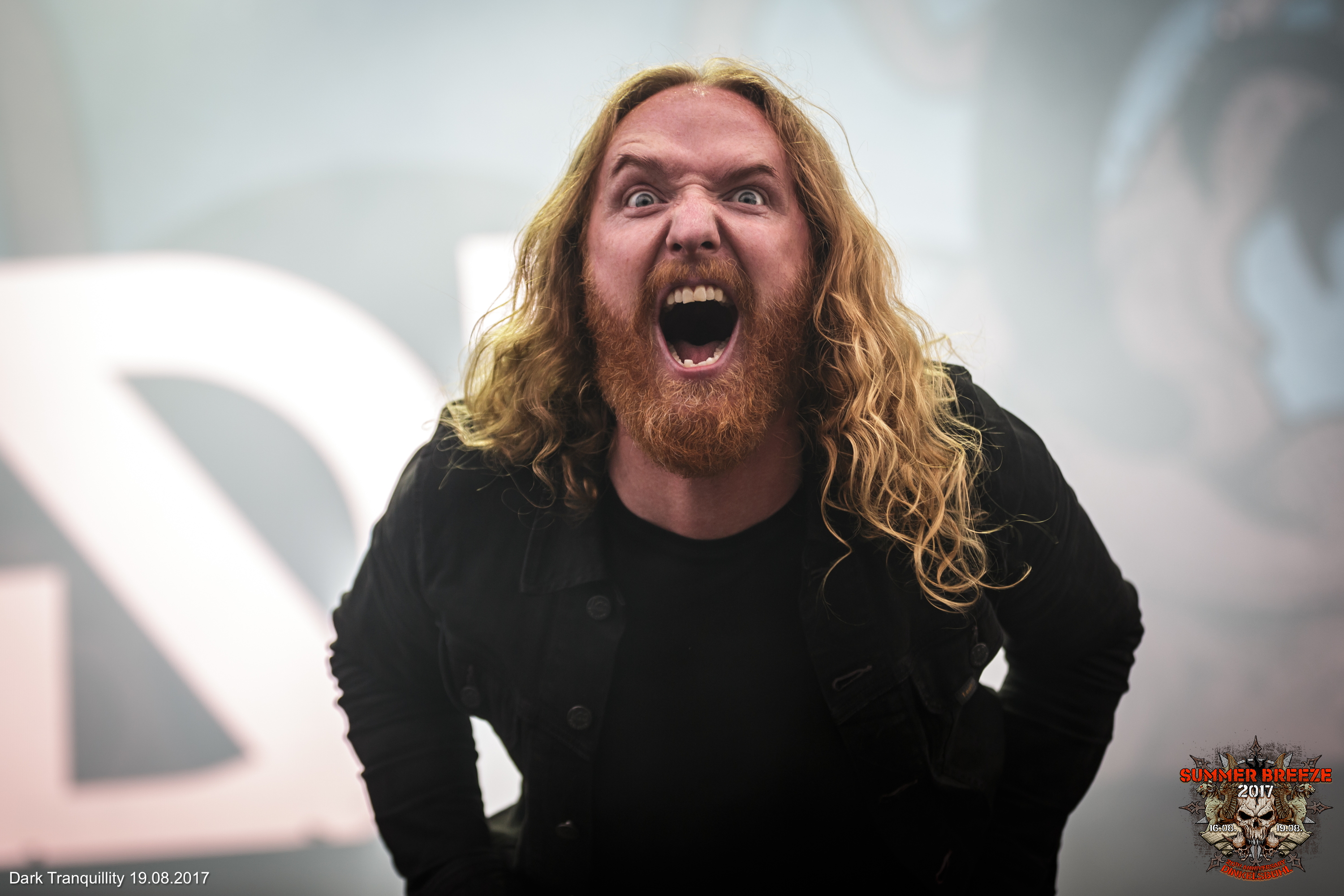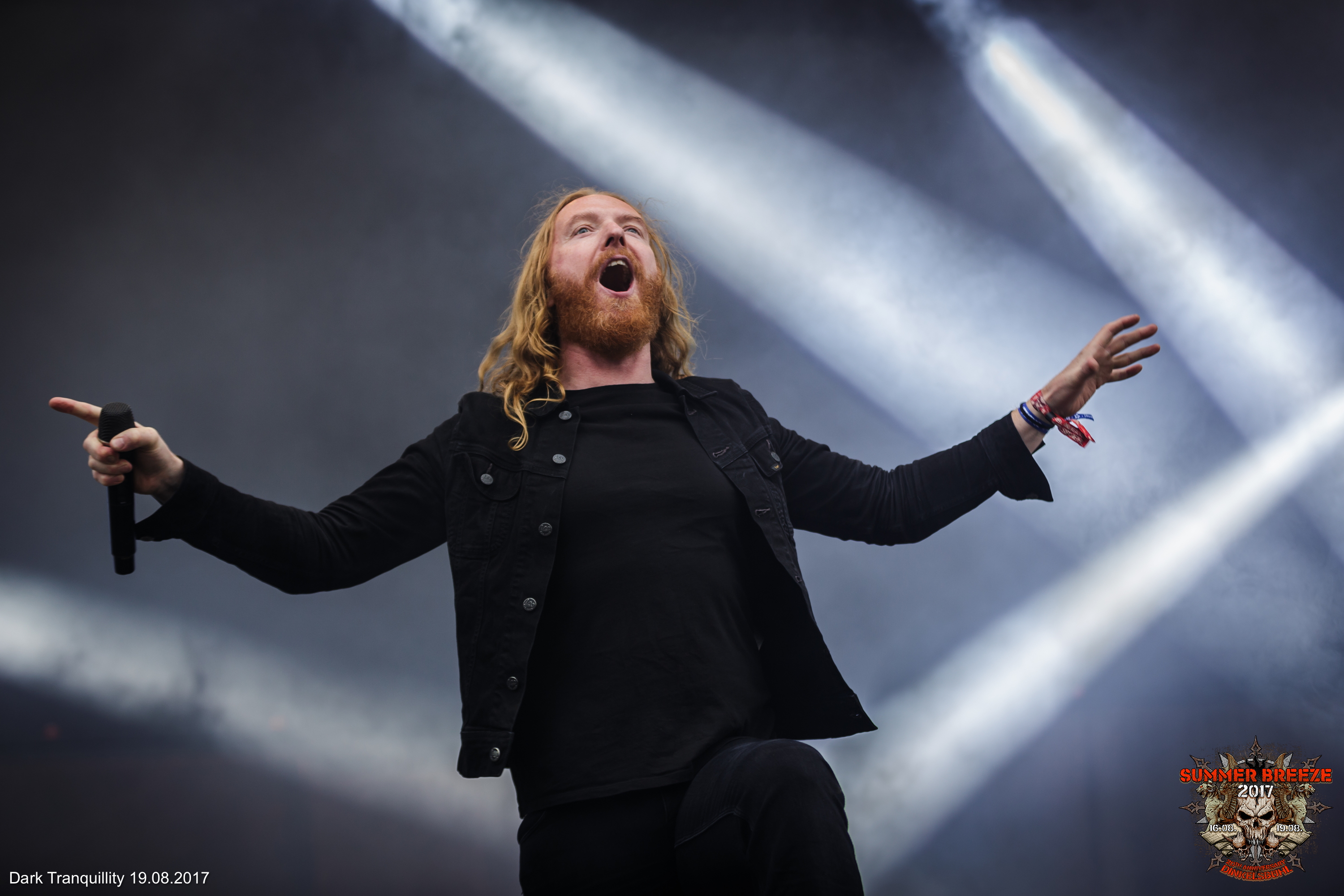 Auch vor den eigentlichen Headlinern des Samstags war keinesfalls Entspannung vor der Hauptbühne angesagt: DARK TRANQUILLITY standen mit einem Crowdpleaser-Lineup und maximaler Fannähe auf den Brettern. Die Fotografen dürften ihre liebe Not mit Sänger Mikael Stanne gehabt haben, der das Publikum in höchsten Tönen lobte und es für einen guten Teil der Show vorzog, im Graben herumzuspringen, Fanhände zu drücken und die Grabenschlampen beim Auffangen der Crowdsurfer zu unterstützen. Besondere Aufmerksamkeit widmete er dabei einem Fan, der im Rollstuhl angesurft kam und mit dem Stanne während eines Instrumentalparts noch ein ausgedehntes Pläuschchen hielt. Aber DARK TRANQUILLITY taten auch einiges für ihr Publikum jenseits der vorderen Reihen. Neben Highlights vom aktuellen Album „Atoma“ präsentierten die Melodic Death-Pioniere auch so manchen Kracher aus früheren Zeiten, darunter „Monocromatic“, das von der Menge begeistert gefeiert wurde. Auch fürs Auge war gesorgt, denn die Show wurde von einem aufwändigen digitalen Backdrop begleitet, das mal Animationen aus Cover Artworks, mal Videosequenzen zeigte. Als Tourgitarristen hatten die Schweden übrigens ex-Arch Enemy-Klampfer Christopher Amott dabei, der die Fanohren mit gelungenen Soli kraulte. Man könnte meinen, dass der bombastische Abschluss mit dem Abräumertitel „Therein“ ein ausreichend würdiges Ende des Konzerts gewesen wäre. Stattdessen packten DARK TRANQUILLITY noch „Misery‘s Crown“ obendrauf und Mikael Stanne nahm singend ein ausgedehntes Bad in der Menge, die ihn fast bis zu den Boxentürmen im Infield trug, während der Rest der Band sich nach ausgiebiger Verabschiedung zurückzog und längst der Aufbau für HEAVEN SHALL BURN begonnen hatte.