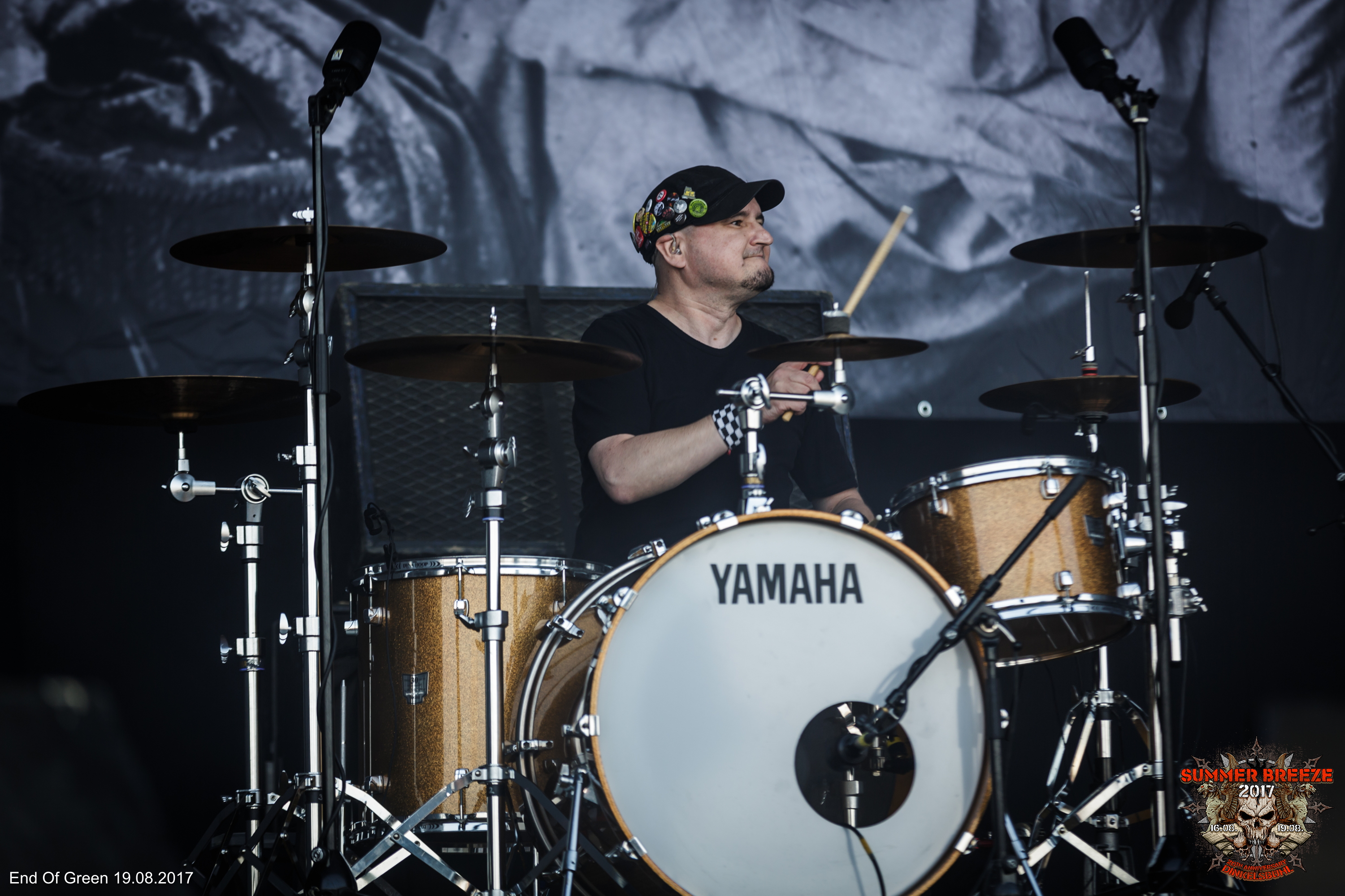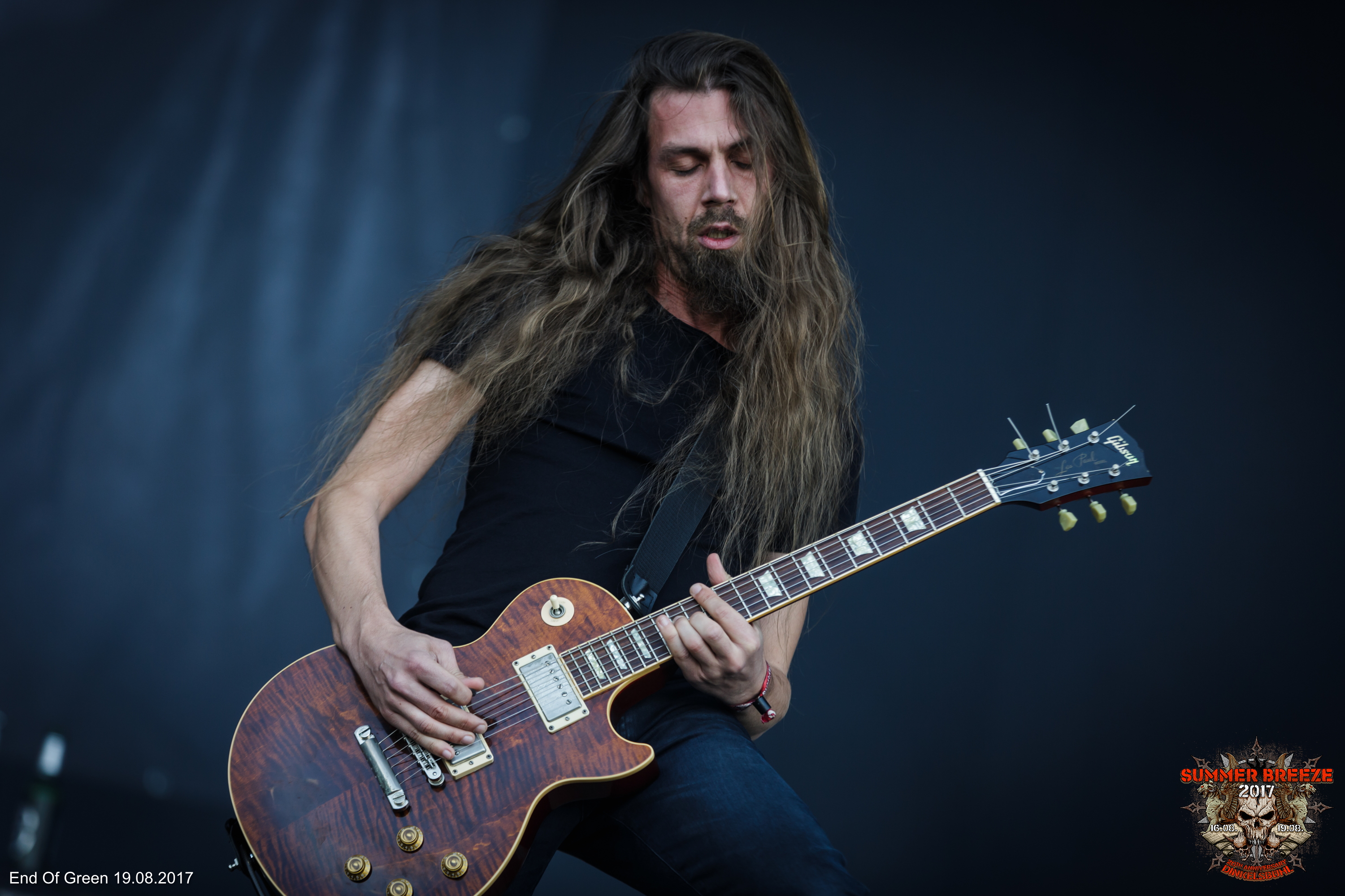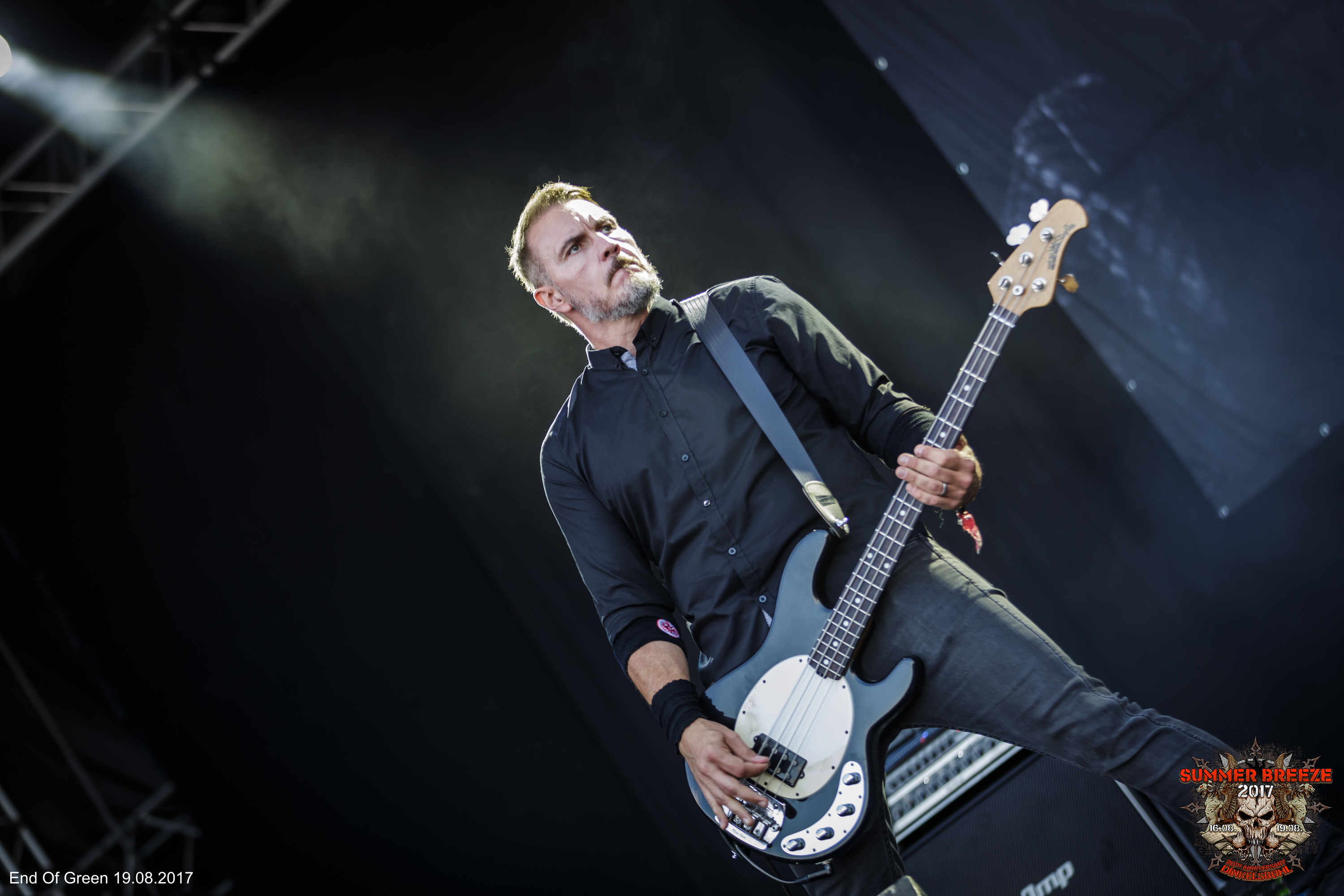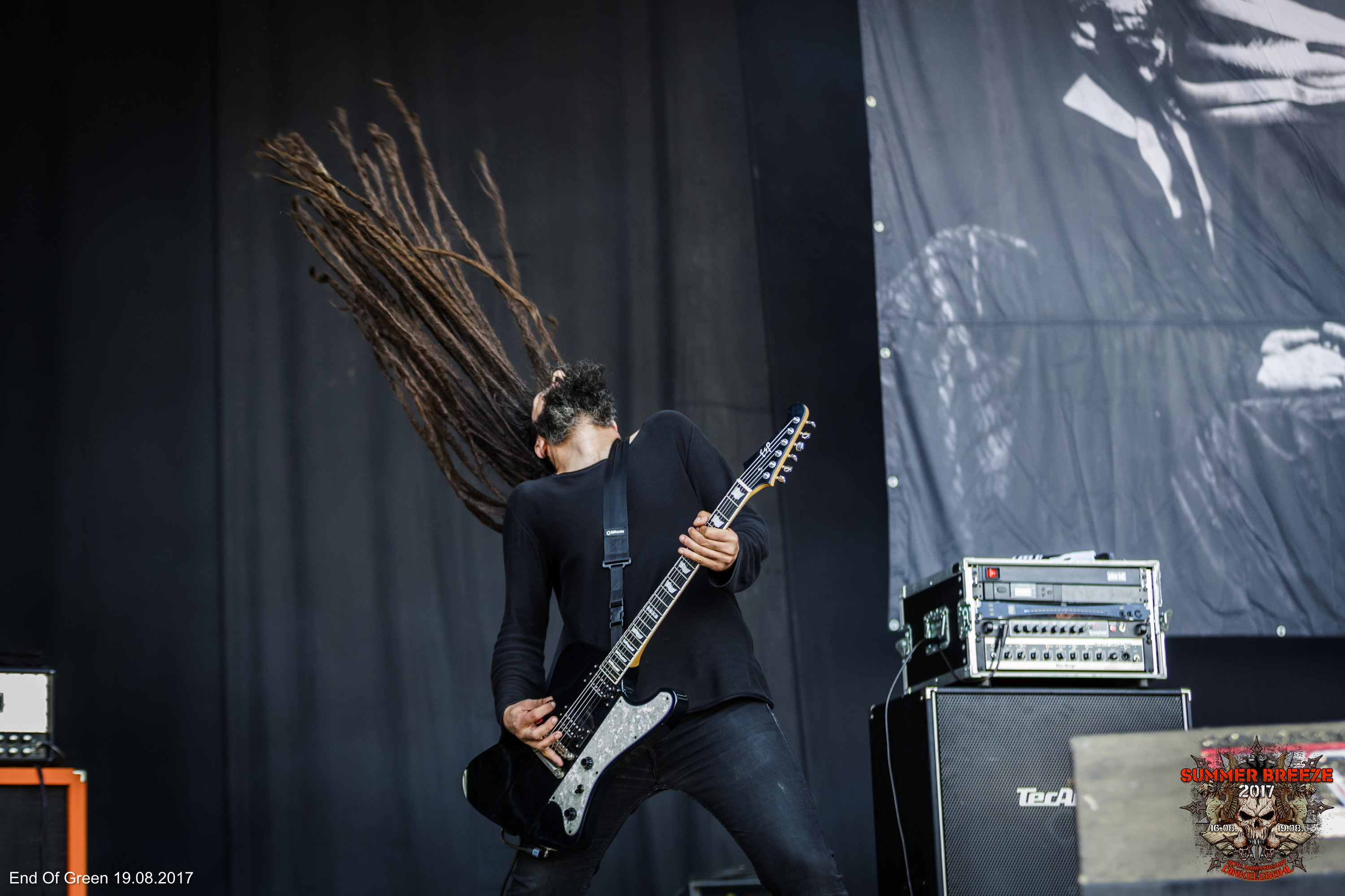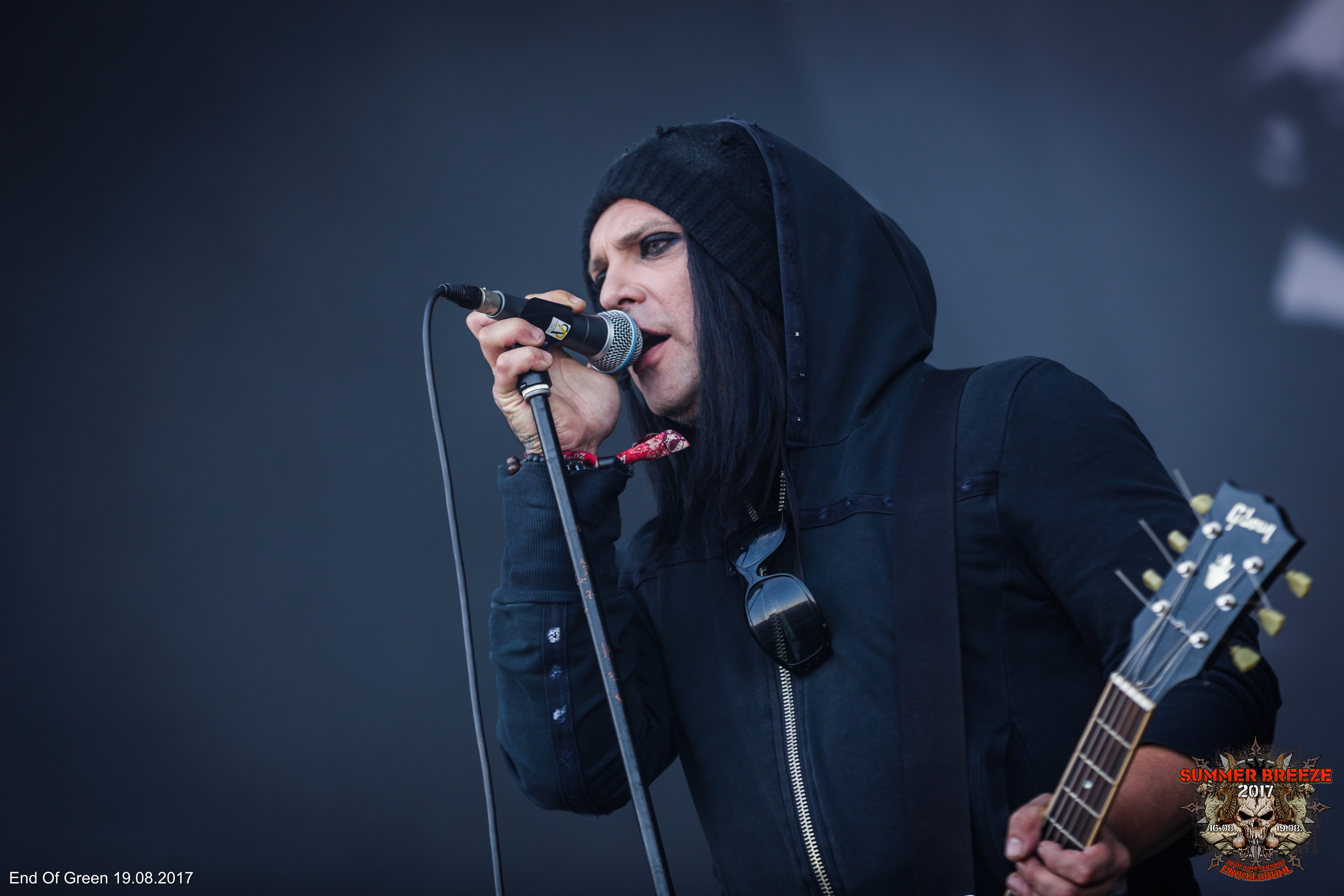 Für END OF GREEN gab es dieses Jahr einiges zu feiern. Nicht nur absolvierten sie ihren zehnten (!) Auftritt auf dem SUMMER BREEZE, die Stuttgarter zelebrierten gleichzeitig auch die Veröffentlichung ihres neuen Albums „Void Estate“. Doch zunächst fiel auf, dass nicht der etatmäßige Schlagzeuger Matthias Siffermann hinter den Kesseln saß, sondern ein für END OF GREEN-Fans unbekanntes Gesicht. Wie Sänger Michelle Darkness offenbarte, hatte sich Siffermann „während seiner Hochzeitsnacht ganz schlimm verletzt“ – später nahm er dann immerhin für zwei Songs noch seinen gewohnten Platz ein. Dieser kurzfristige Tausch wirkte sich aber in keinster Weise negativ auf das Set der Haus-und-Hof-Band des BREEZE aus. Gewohnt sympathisch führte Darkness durch eine mit alten und neuen Hits gespickte Songauswahl. Highlights gab es viele, zum Beispiel „Dead City Lights“, den Evergreen „Killhoney“ vom 2008er Album „The Sick’s Sense“ oder das ausladende „Death In Veins“. Selbst kleinere technische Probleme wurden von Darkness mit einem lockeren Spruch davon-gewitzelt. END OF GREEN sind und bleiben ein Phänomen und obendrein auch optisch eine Band mit hohem Wiedererkennungswert. Man sehe sich nur einmal die immer länger werdenden Dreadlocks von Gitarrist Sad Sir an. Erneut ein großartiger Auftritt der Düsterrocker bei dem sie das abschließende „Death In Veins“ ganz lässig in „Hurt“ von Johnny Cash bzw. Nine Inch Nails münden ließen.