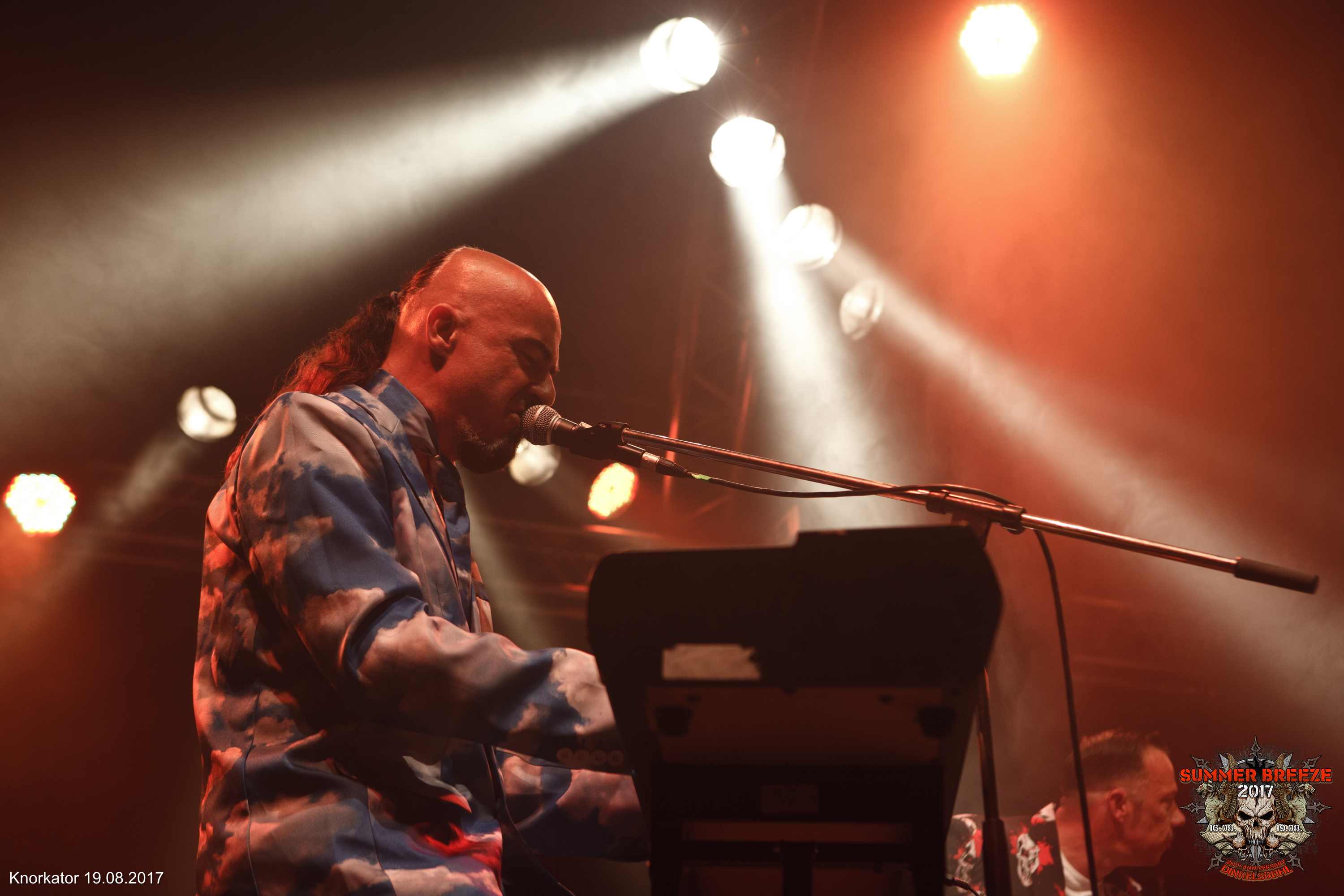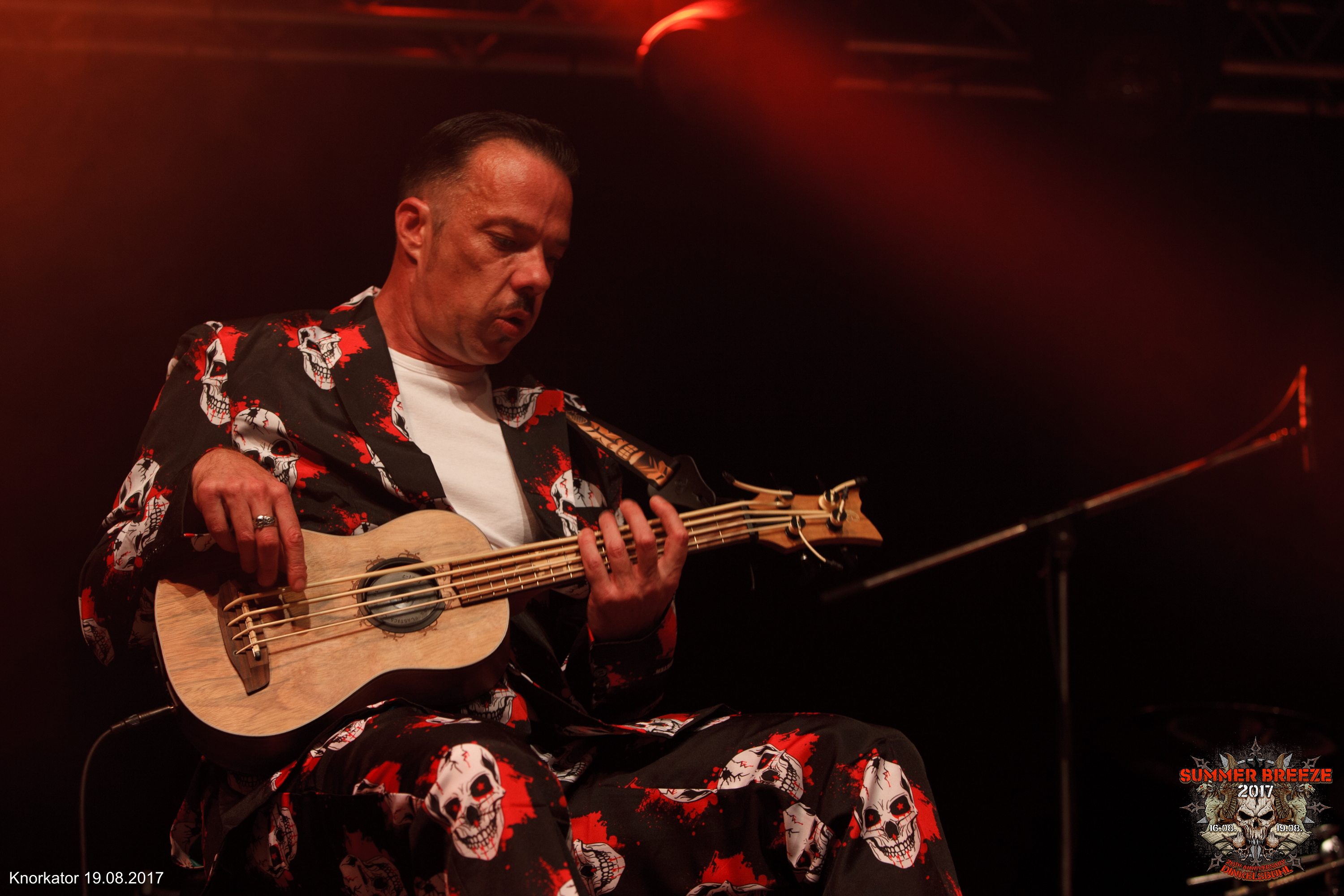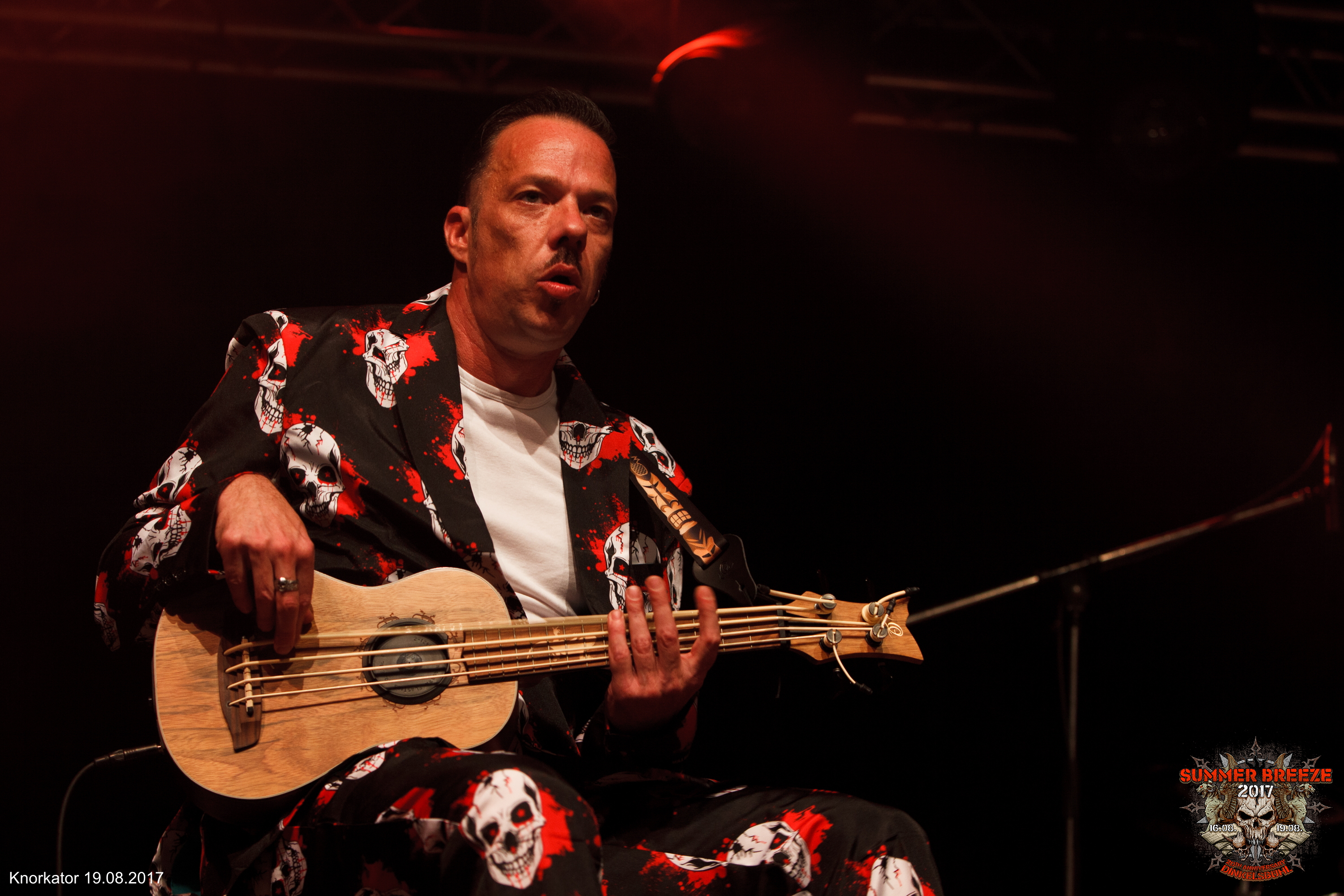 KNORKATOR sind live immer ein Fest und der diesjährige Auftritt auf der SUMMER BREEZE Stage machte da natürlich keine Ausnahme. Sänger Stumpen kam im Ghillie Suit auf die Bühne, aus dem er sich nach und nach bis auf die Unterhose schälte. Er gab sich exzentrisch wie immer, während seine Mitmusiker die Ruhe selbst waren. Von Ruhe auf der Bühne konnte aber keine Rede sein, denn spätestens als Stumpen die Kameraleute aus dem Fotograben für kurze Zeit auf die Bühne hoch orderte, war dort mächtig was los. Vor der Bühne ging es ohnehin ab, zumal die Band als erstes „Alter Mann“ in die dicht gedrängte Menge schickte und diese so im Sturm eroberte. Stumpen ließ es sich natürlich nicht nehmen, den Applaus immer durch Ausrufe wie „Jubel!“ einzufordern. Die eigentliche Überraschung war jedoch die Damenkapelle aus Berlin, die für „Der ultimative Mann“, „Geld“ und „Ich hasse Musik“ die Bühne enterte und das instrumentale Ruder übernahmen, was Stumpen gewohnt subtil mit „Viele Brüste auf der Bühne“ kommentierte. Sängerin Doro und Stumpen agierten sodann im Duett und sorgten für einige Gänsehautmomente. Und ja, tatsächlich haben die Damen dem Sound ein ordentliches Maß an Glamour und Klasse verliehen. Nicht, dass KNORKATOR nicht auch so klasse gewesen wären, aber wo sonst erlebt man einen Song namens „Ich hasse Musik“ glaubhaft in eine sexy Salsa umgewandelt? Oder „Der ultimative Mann“, der ein heißes Tango-Makeover erhalten hat. Für den Rest des Sets agierten die Damen weiterhin im Hintergrund, gaben Alf Ator und Co. jedoch wieder ihre Instrumente zurück und ließen sie einige der Bandklassiker wie „Buchstabe“, „Du nicht“, „Böse“ und „Wir werden alle sterben“ spielen. Und erwartungsgemäß entließ das Publikum die Band unter enormen Beifall vorerst in die Pause, bevor es später an anderer Stelle mit der Akustik-Show weitergehen sollte. Jubel!
