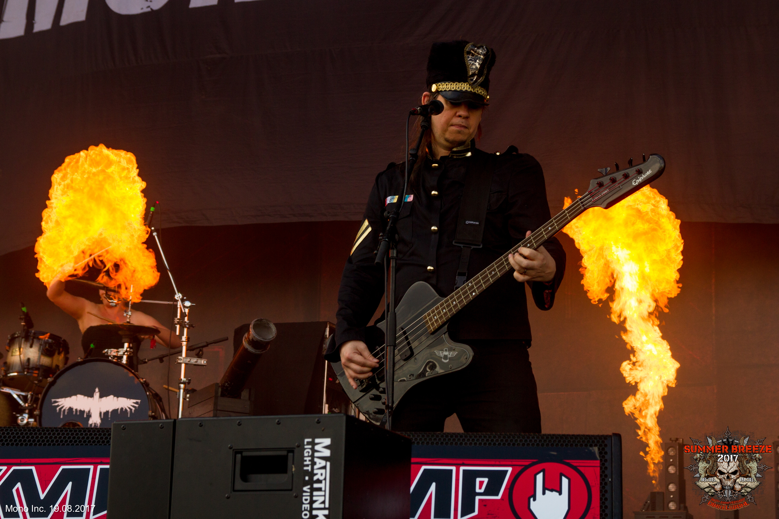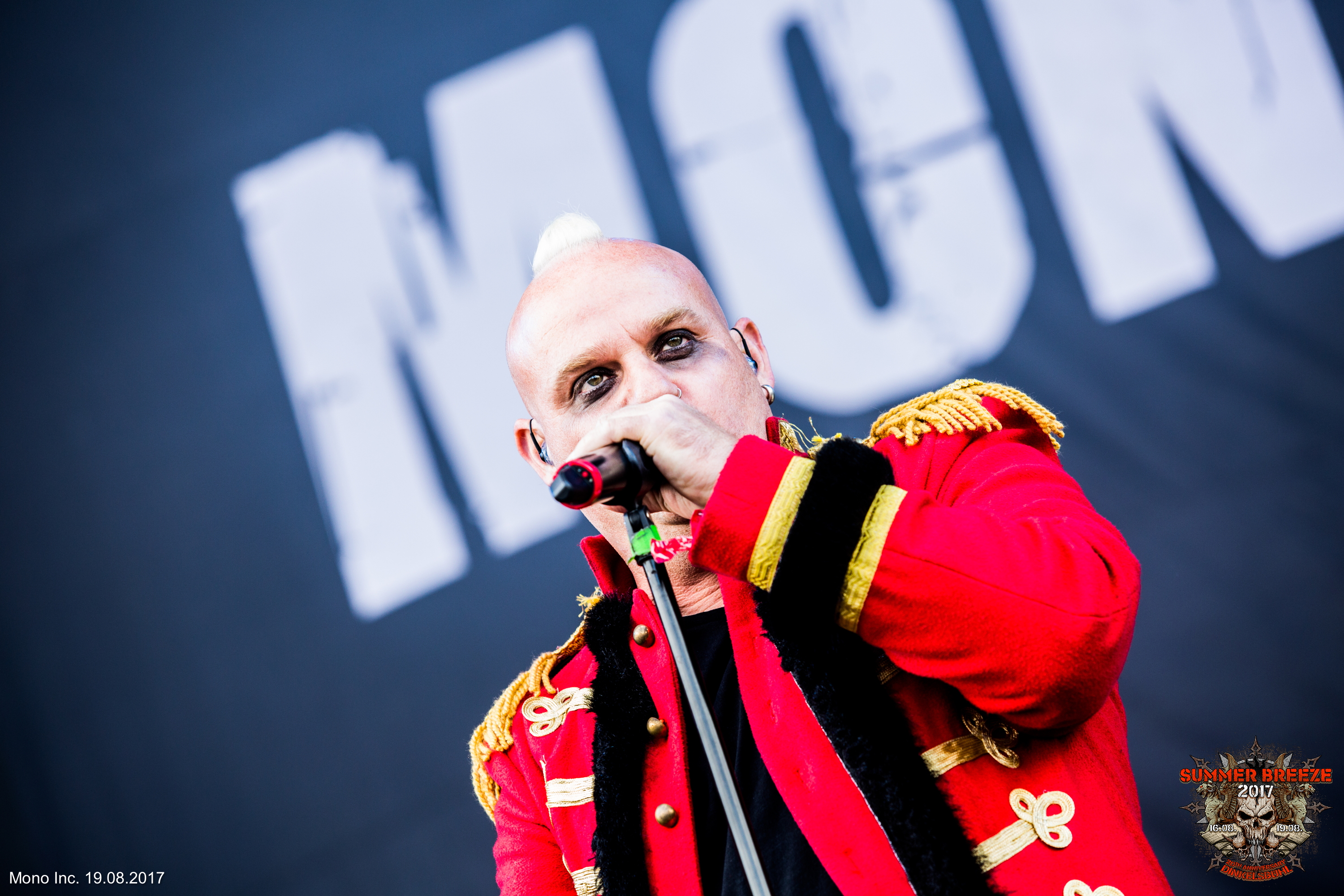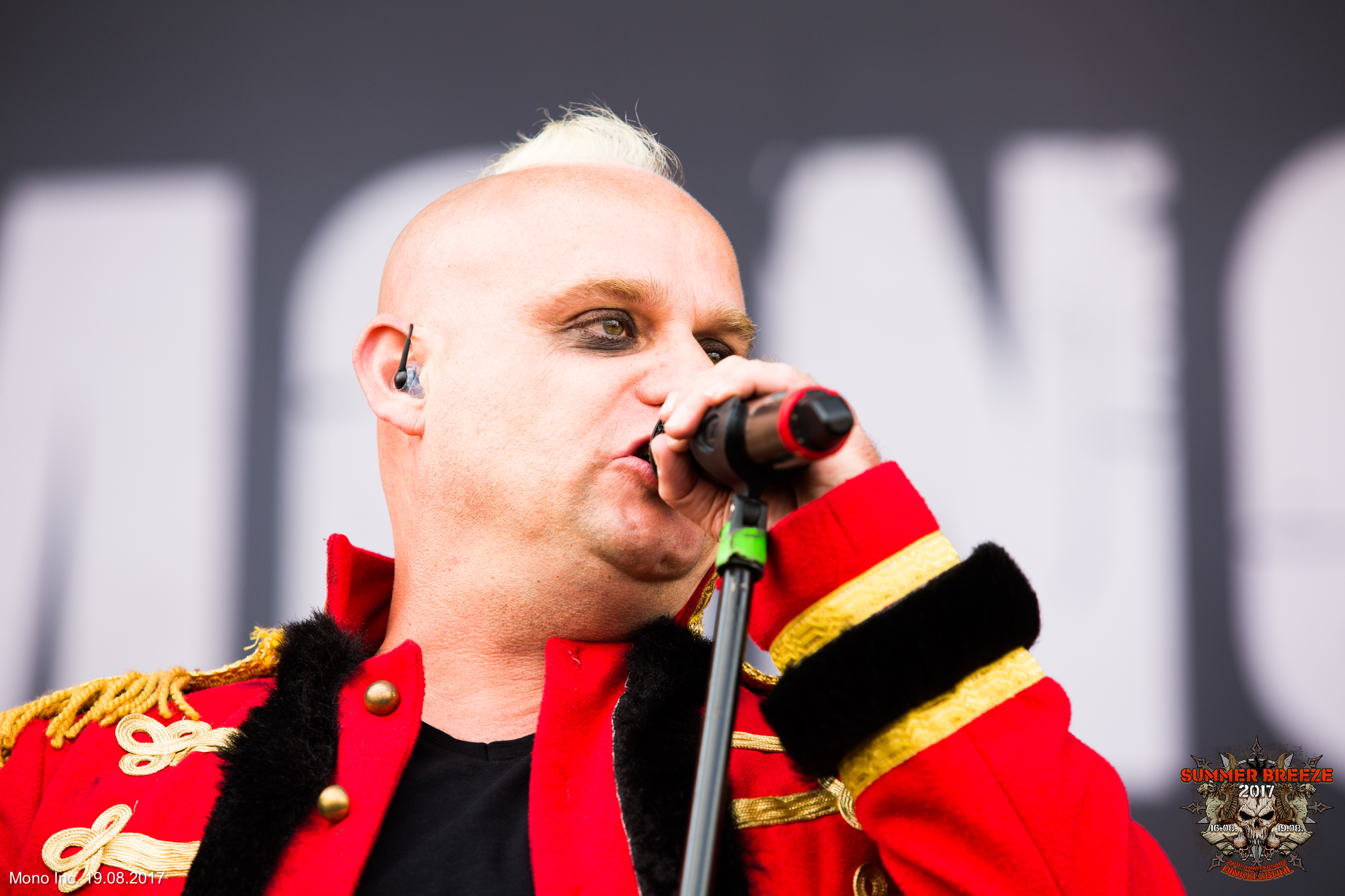 Vor der Hauptbühne hatte sich bereits vor Konzertbeginn eine große Menge an Fans eingefunden, um mit MONO INC. in die Finsternis zu reisen. Die Dark-Rocker traten für die Darbietung ihres Sets in konsequent düsteren Outfits an. Sänger Martin Engler wechselte seine Kleidung zudem mehrfach während des Konzerts, passend zu den gespielten Songs. Auf seine Forderung „Zeigt eure Hände! Ich will alle Hände sehen!“ reagierte das Publikum ohne Umschweife. Genauso euphorisch sprangen die Zuschauer auch mit der Band mit. Eine Überraschung hatten MONO INC. ebenfalls parat: Für die Songs „Potter’s Field“ und ein Cover von „Wonderful Life“ übernahm Major Voice den Lead-Gesang. Einen weiteren Gastsänger hätte derweil auch das Publikum abgeben können, denn die Fans waren verdammt textsicher, insbesondere bei „Children Of The Dark“. In Sachen Showeffekten hielten sich MONO INC. auch nicht zurück. Neben einschlägigen Pyros, die im Takt eingesetzt wurden, holte Martin Engler zum Abschluss auch noch die hauseigene Band-Flagge raus.