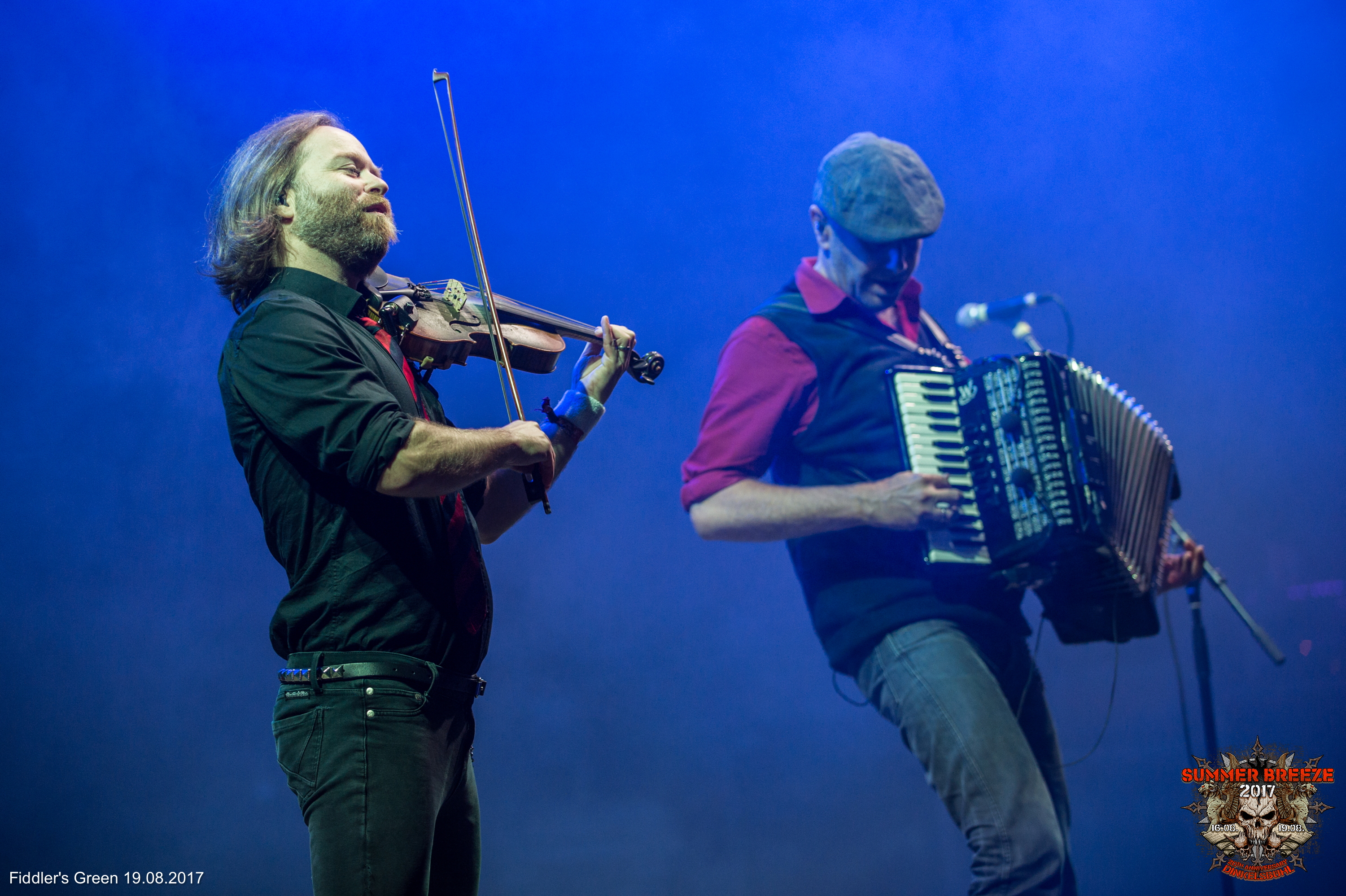 Nach ihrer Unplugged-Show am vorangegangenen Donnerstag durften FIDDLER’S GREEN nun die Bremsen komplett lösen und eine vollverstromte Gute-Nacht-Show zum Besten geben. Im Gegensatz zu den saunaartigen Bedingungen des Akustik-Gigs kroch eine unangenehme Kälte über den Platz vor der T-Stage, von der sich die fränkischen Irish-Speedfolker und ihre gewaltige Publikumsmenge jedoch nicht die Party-Laune verderben ließen. „Das beste ist Bewegung!“ gab Gitarrist Pat als Devise aus, der alle Anwesenden nur allzu gerne folgten. Damit auch die Jungs im Bühnengraben nicht untätig herumstehen mussten, forderte die Band bei „Perfect Band“ extraviele Crowdsurfer an und bekam sie prompt geliefert. Da blieb dann leider auch keine Zeit mehr, hübsche Crowdsurferinnen von einer Grabenschlampe zur nächsten weiterzureichen und im Takt herumzuwirbeln, wie es in ruhigeren Momenten gerne praktiziert wurde. Als brillante Live-Band ackerten sich FIDDLER’S GREEN durch ein mitreißendes Set mit Schwerpunkt auf dem aktuellen Album „Devil’s Dozen“. Im Anschluss an die Ballade „Blame It On Me“ wurde eine launige Solo-Einlage eingestreut, das Geiger Tobias Heindl mit perkussionistischer Unterstützung von Frank Jooss und Stefan Klug um seine Interpretation des Deep-Purple-Klassikers „Smoke On The Water“ herum arrangierte. Schlag auf Schlag näherte sich der Gig seinem Ende, nicht ohne jedoch auf den vom Publikum in dezenter Pappschild-Form eingestreunten Hinweis „Mina hat Geburtstag“ einzugehen. „Wir haben doch vorhin den Kuchen unterschrieben,“ erläuterte Frontmann Albi, woraufhin Pat augenzwinkernd hinzufügte: „Wir haben noch mehr mit dem Kuchen gemacht – die Zuckerglasur ist von uns!“ Wer sich da noch nicht pikiert abgewandt hatte, durfte beim abschließenden Hit-Triple „Old Dun Cow“, „The Night Pat Murphy Died“ und „Folk’s Not Dead“ noch einmal die letzten Kraftreserven mobilisieren.