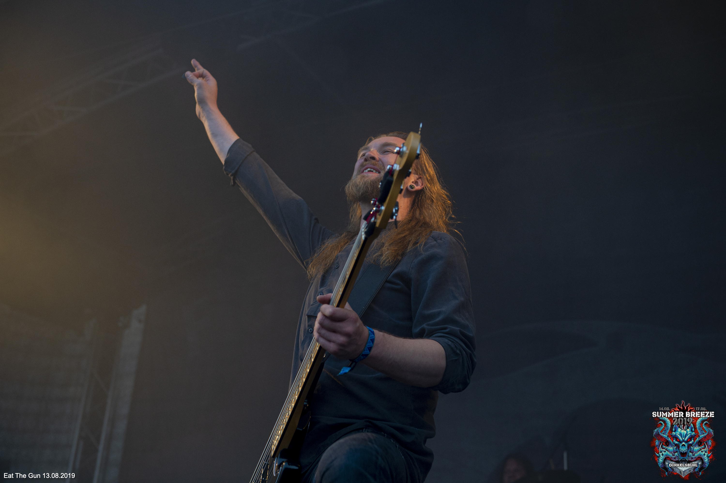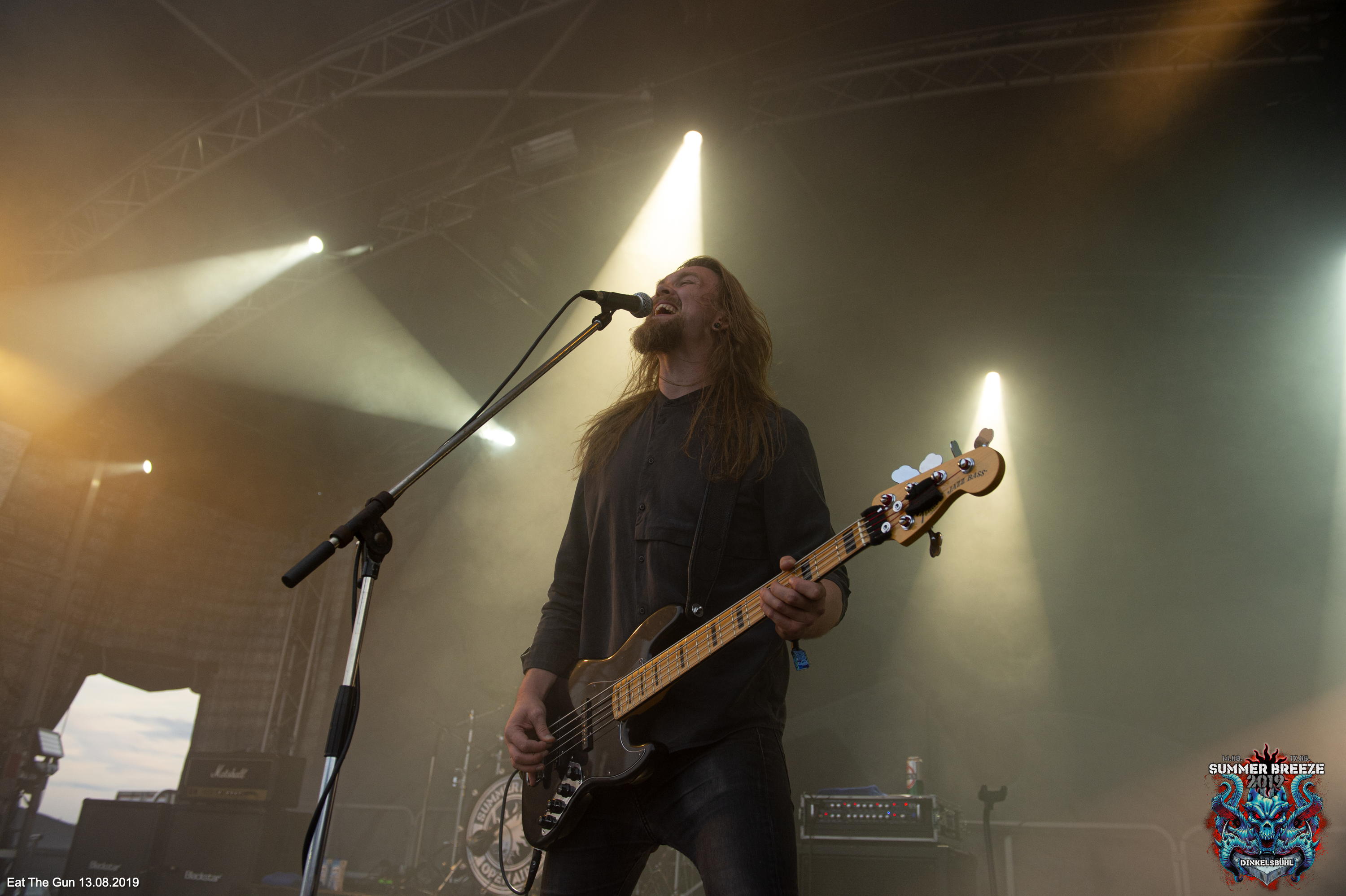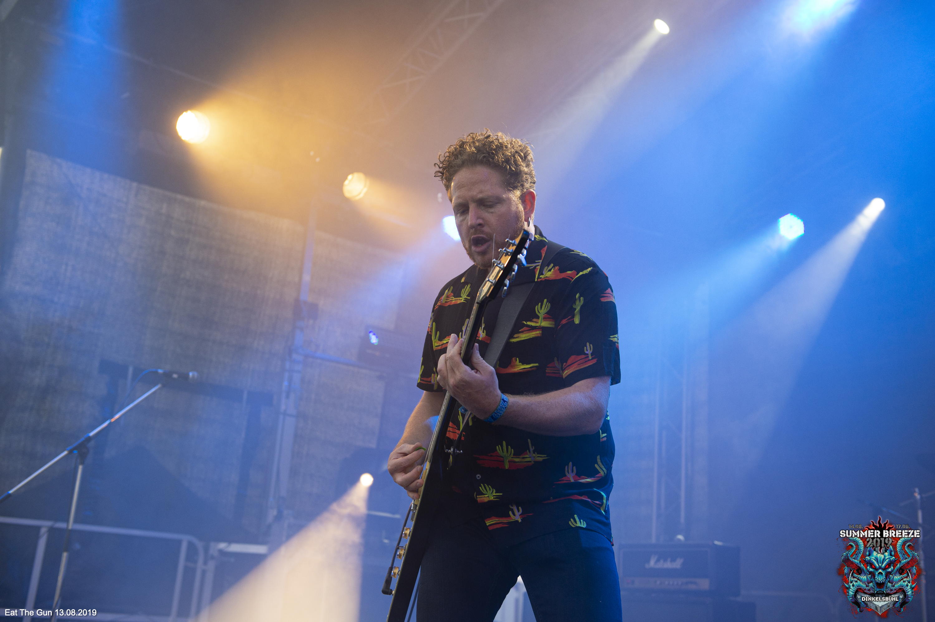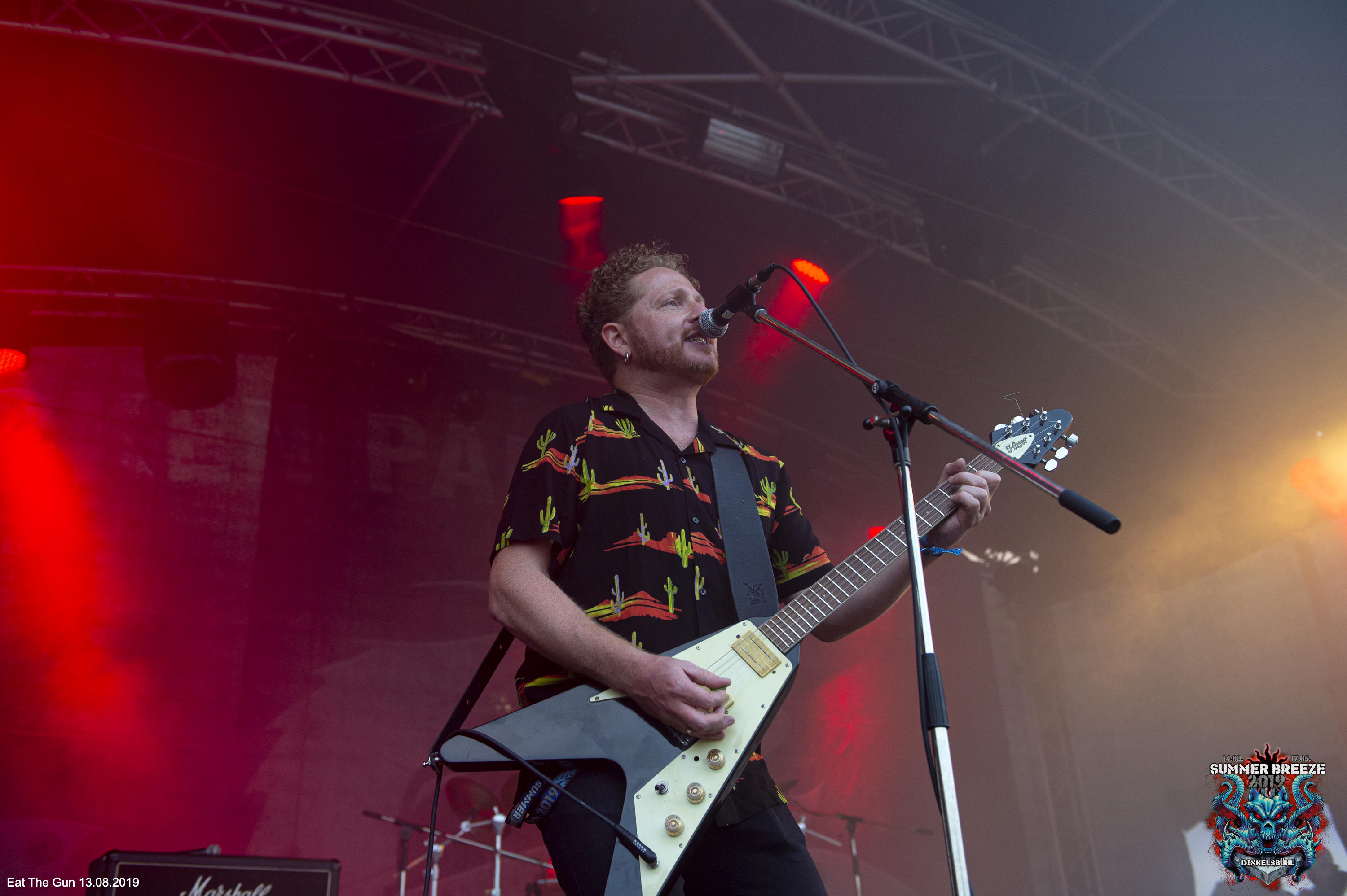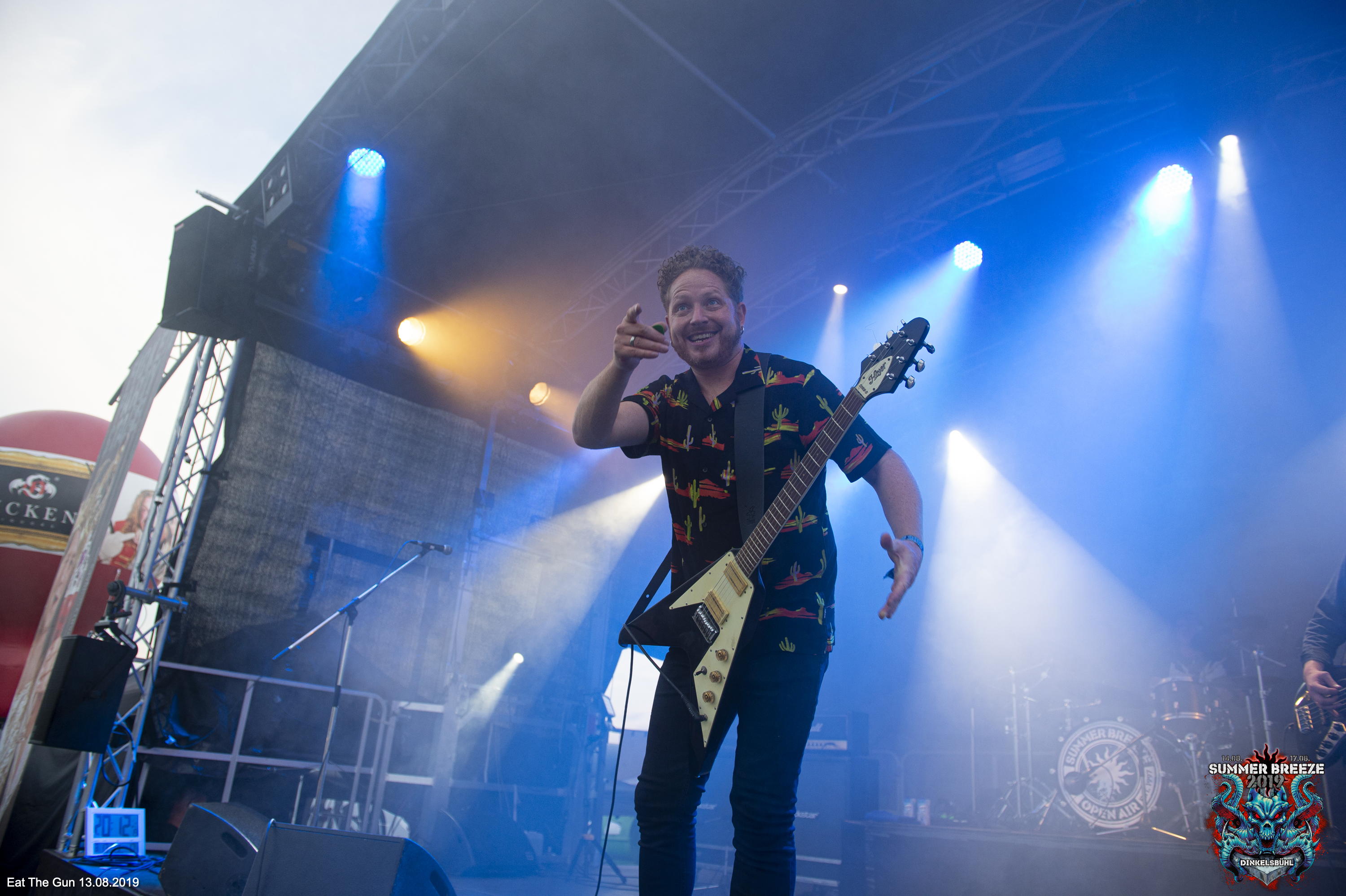 Als zweite Band des SUMMER BREEZE 2019 betraten am Dienstagabend gegen kurz vor acht Uhr die Münsteraner Hard Rock-Veteranen von EAT THE GUN die partyschnapsgetränkten Bretter der Ficken Party Stage. Aufgrund von leichtem Anpassungsbedarf beim Bühnensound begann das Trio sein Set mit fast zehn Minuten Verspätung – dafür aber umso beschwingter. Im Publikum führte eine gute Mischung aus Fanclub-Verehrung und der Motivation des ersten Festivaltages dazu, dass sich von Beginn an niemand lange zu Klatschen und Bewegung bitten lassen musste. Zum Song „Bad Memories“ gab es bereits eindrucksvolle Chöre und schon kurz darauf rollte die erste Wall of Death über das Party-Infield. Der lässige Rock-Sound von EAT THE GUN erwies sich dabei als genau der richtige Einstieg in fünf Tage kräftezehrende Schwermetall-Kost, die zu diesem Zeitpunkt noch anstanden. Mit Kakteenhemd und breitem Grinsen ausgestattet machte Sänger und Gitarrist Hendrik Wippermann zusammen mit seiner gut geölten Rhythmus-Maschine den Warm-up-Slot zum vollen Erfolg.