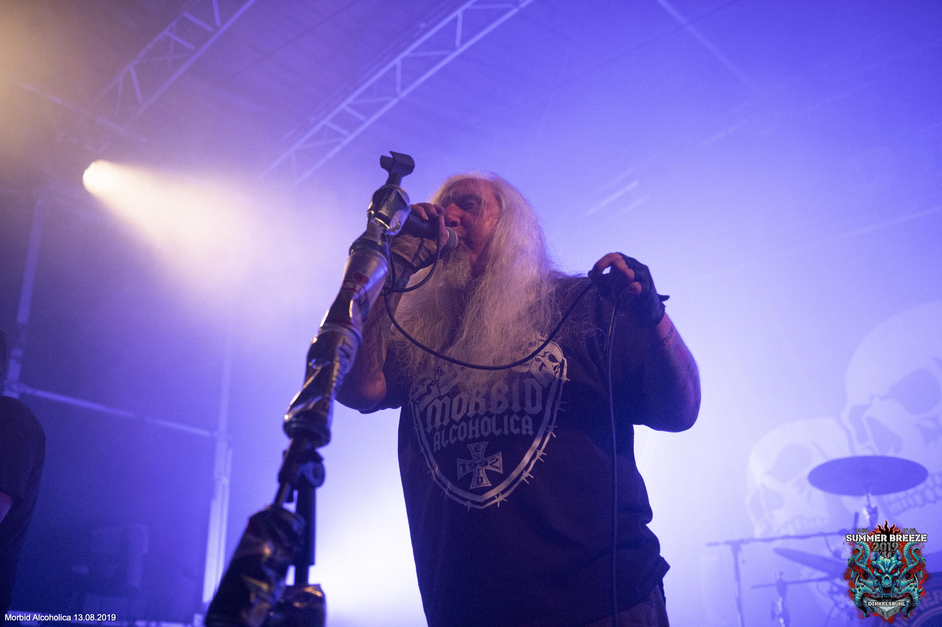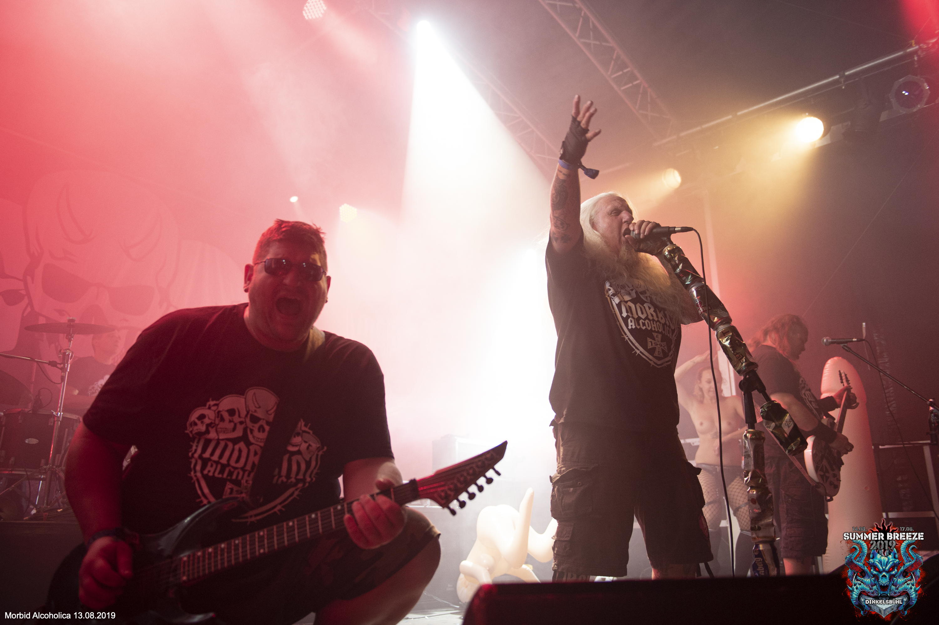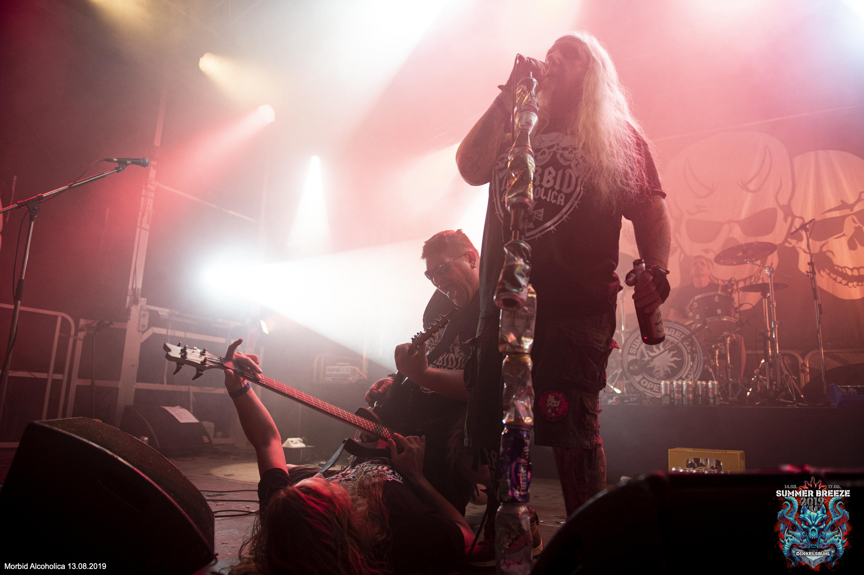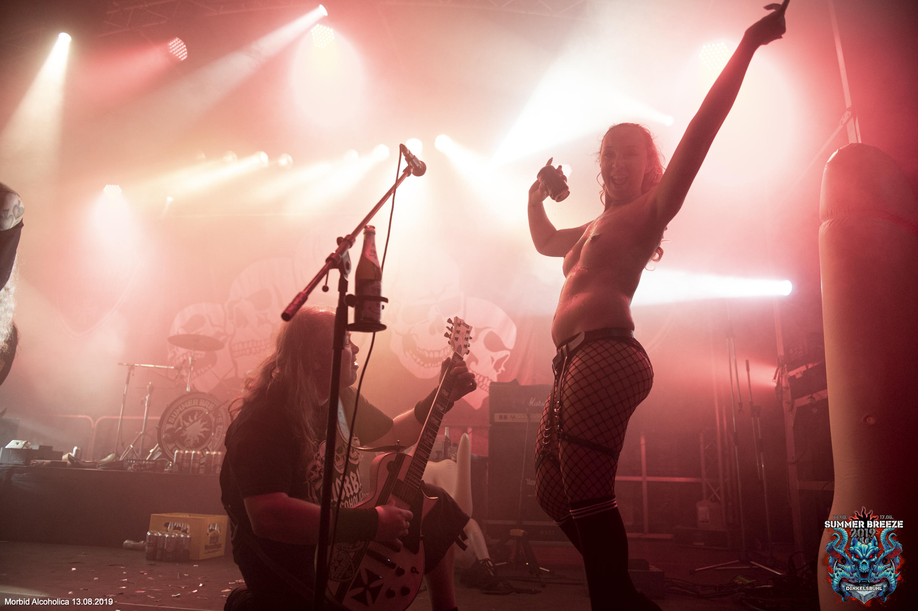 Schon Rammstein wussten: “Wer Ficken will, muss freundlich sein.“ Und so bereiteten die äußerst zahlreich vor der Ficken Party Stage versammelten Festivalgäste dem schwäbischen Quintett von MORBID ALCOHOLICA einen mehr als freundlichen Empfang auf dem SUMMER BREEZE. Von Minute eins an entfesselten die rumpelnden Gitarren und das schwer verständliche, heisere Gekeife ausufernde Moshpits und sorgten für zahlreiche geschwenkte Banner mit dem unverkennbaren Logo des beliebten Partyschnaps. Anstatt handwerklicher Finesse boten MORBID ALCOHOLICA in bewährter Manier Bierlyrik mit einem arg datierten Frauenbild (irgendwo zwischen Steinzeit und Jabba The Hut) und dem gewissen Etwas Mundart. Damit auch wirklich jeder die feinen textliche „Ergüsse“ der „Bierbomber“ verstehen konnte, illustrierten auf die Bühne gerufene Stripperinnen das Gebotene zusätzlich mit Reiteinheiten auf mehreren über die Bühne verteilten aufblasbaren Penissen. Der Menge gefiel es. Ebenso wie das abschließende Cover der Titelmelodie von „Spongebob Schwammkopf“.