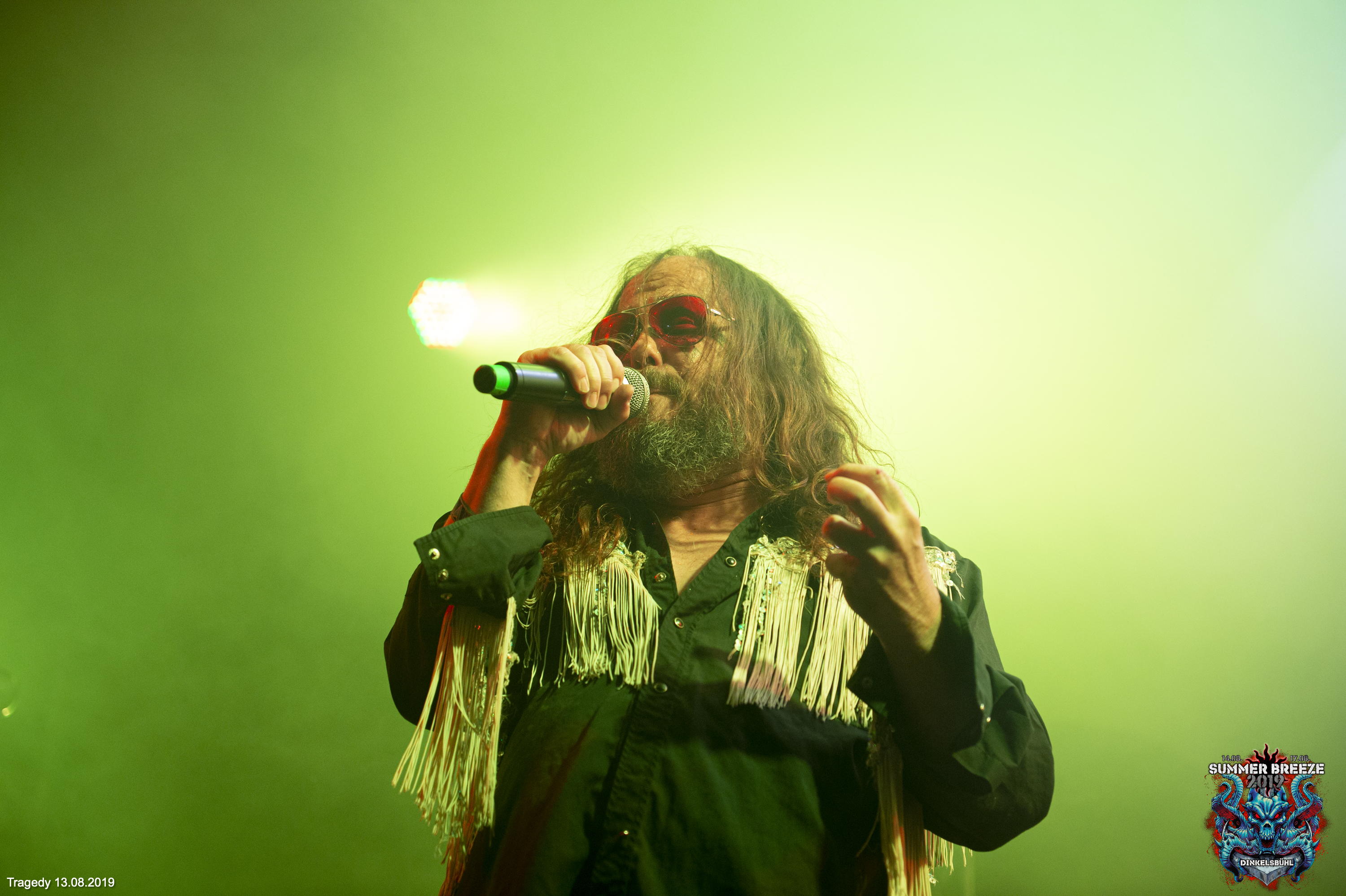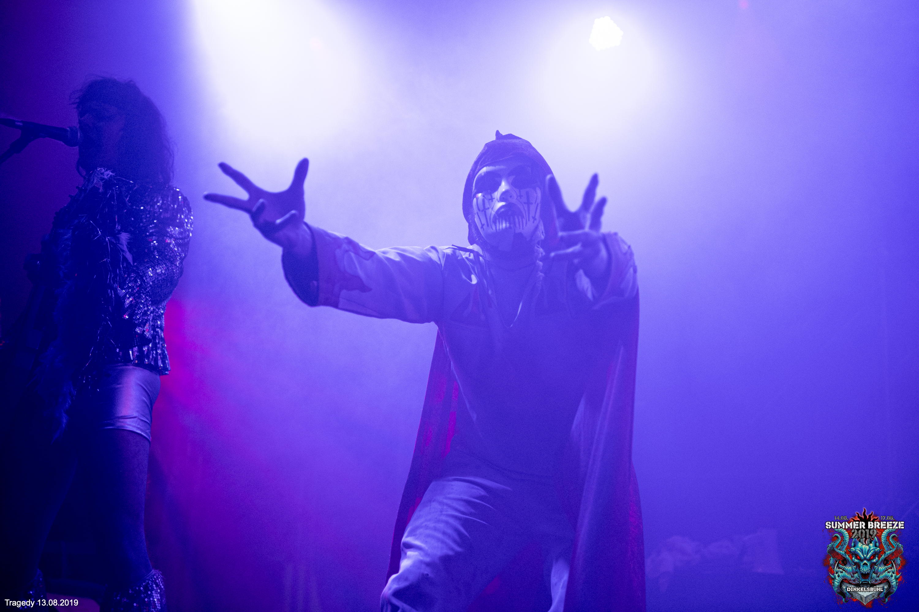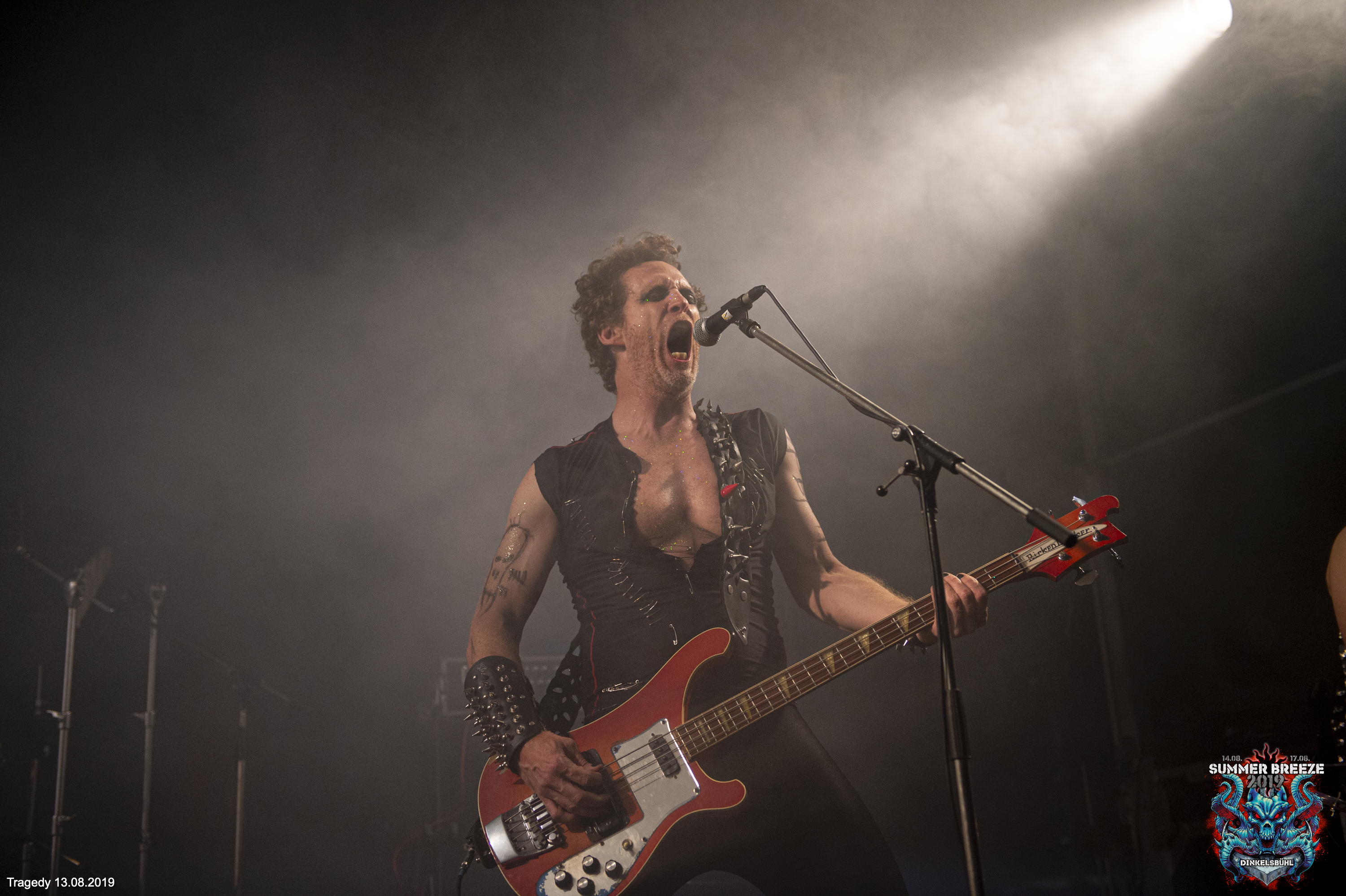 Perücken auf, Disco rein, Manege frei für die Festivalurgesteine TRAGEDY! Das Partysextett aus dem Land der unbegrenzten Möglichkeiten hatte sich auch dieses Jahr keine Grenzen auferlegt und präsentierte eine kurzweilige Mischung aus unverwüstlichen Pop- und Discohymnen im Metalgewand. Da wurde die Menge mit „Tragedy“ und „Funkytown“ schnell auf Betriebstemperatur gebracht und es gab wirklich niemanden, der die Melodien nicht irgendwo aus dem Hinterkopf kramen und schließlich mitsingen konnte. Die Band um Lead Vocalist Disco Mountain Man spielte aber nicht nur einen gediegenen Mashup aus Hits, sondern ulkte sich sehenswert durch das Programm. U.a. mit glitzerndem Discokugel-Outfit und leuchtenden Bünden an der Gitarre von Leadgitarrist Garry Bibb. Im Hintergrund immer mit dabei: Das sechste Bandmitglied Lance, der ständig mit einem Handtuch umherwuselte und damit den Musikern den Schweiß von der Stirn tupfte, später eine ganze Batterie von aufblasbaren Puppen auf die Bühne holte. Das Publikum hatte jedenfalls seinen Spaß und erbrachte den nunmehr finalen Beweis, dass auch ein Metalpublikum Disco kann.