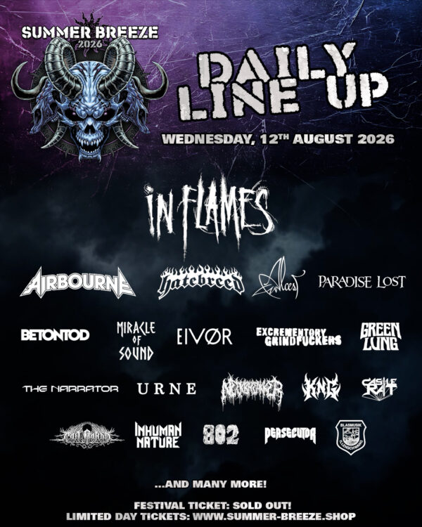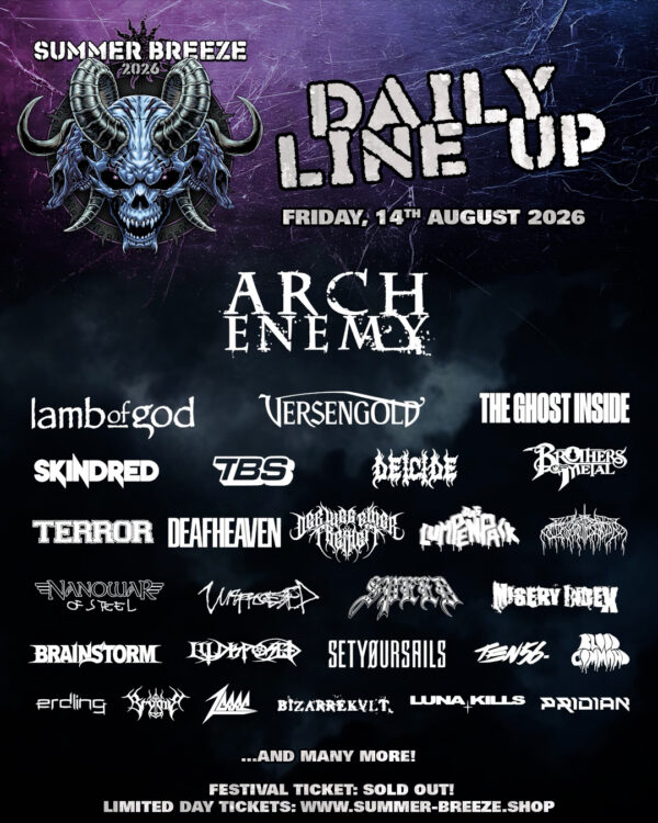 ARCH ENEMY, LAMB OF GOD, VERSENGOLD, THE GHOST INSIDE, SKINDRED, THE BUTCHER SISTERS, DEICIDE, BROTHERS OF METAL, TERROR, DEAFHEAVEN, DER WEG EINER FREIHEIT, DAS LUMPENPACK, WOLVES IN THE THRONE ROOM, NANOWAR OF STEEL, UNPROCESSED, SPEED, MISERY INDEX, BRAINSTORM, ILLDISPOSED, SETYØURSAILS, TEN56., BLOOD COMMAND, ERDLING, BRYMIR, ZERRE, BIZARREKULT, LUNA KILLS, PRIDIAN