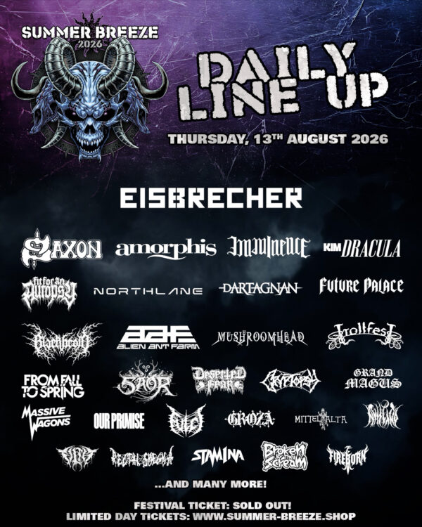 EISBRECHER, SAXON, AMORPHIS, IMMINENCE, KIM DRACULA, FIT FOR AN AUTOPSY, NORTHLANE, dARTAGNAN, FUTURE PALACE, BLACKBRAID, ALIEN ANT FARM, MUSHROOMHEAD, TROLLFEST, SAOR, FROM FALL TO SPRING, DESERTED FEAR, CRYPTOPSY, GRAND MAGUS, MASSIVE WAGONS, OUR PROMISE, FULCI, GROZA, MITTEL ALTA, NYTT LAND, FILTH, RECTAL SMEGMA, STAM1NA, BROKEN BY THE SCREAM, FIREBORN